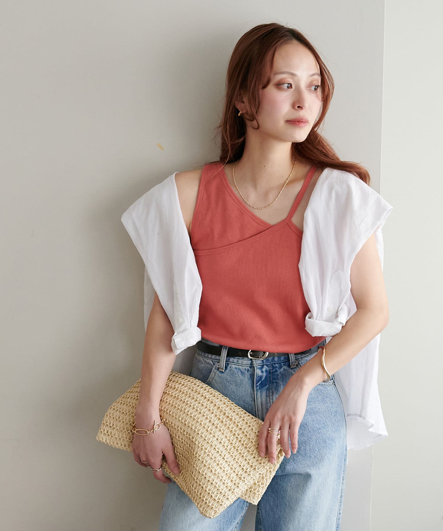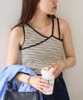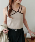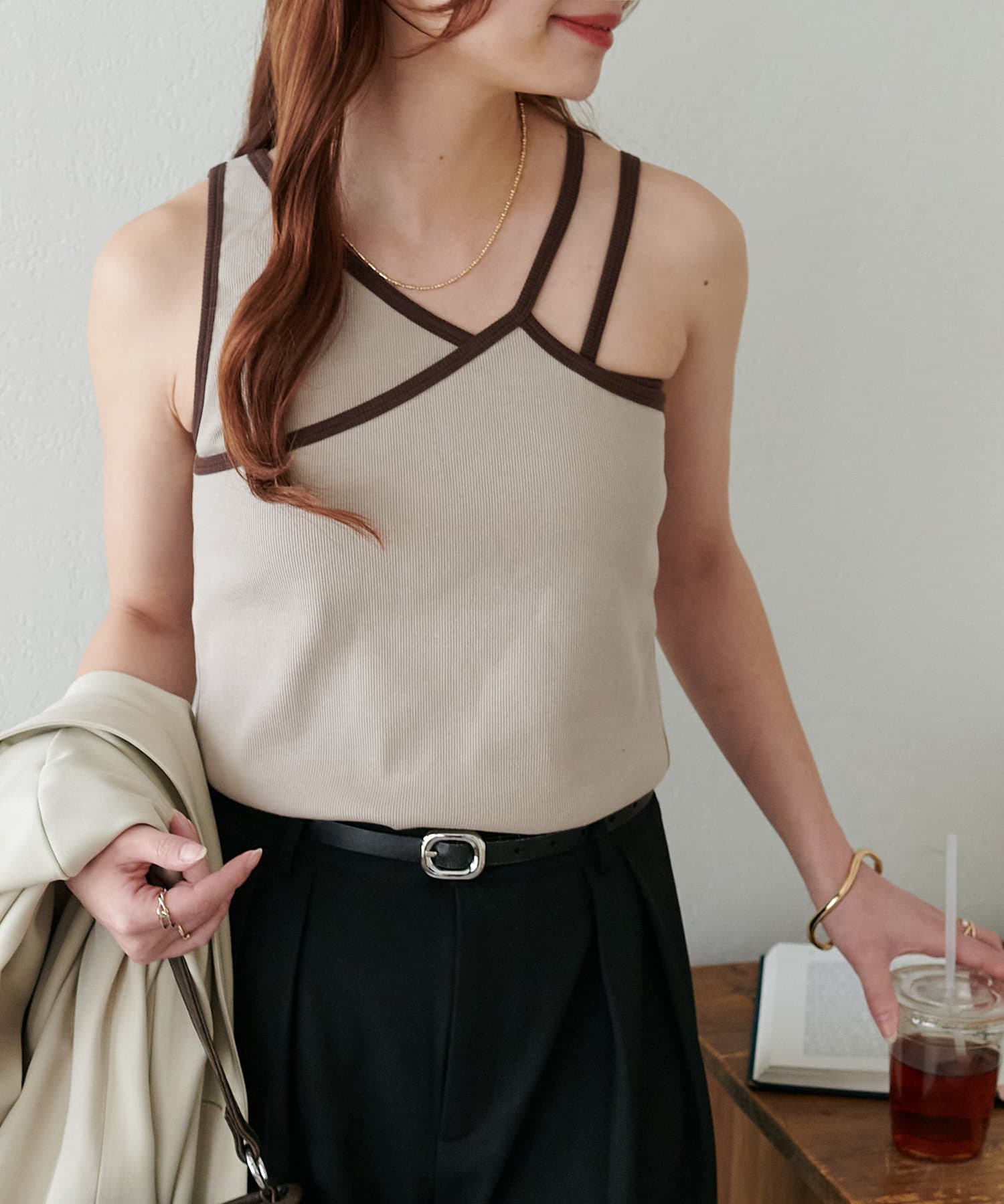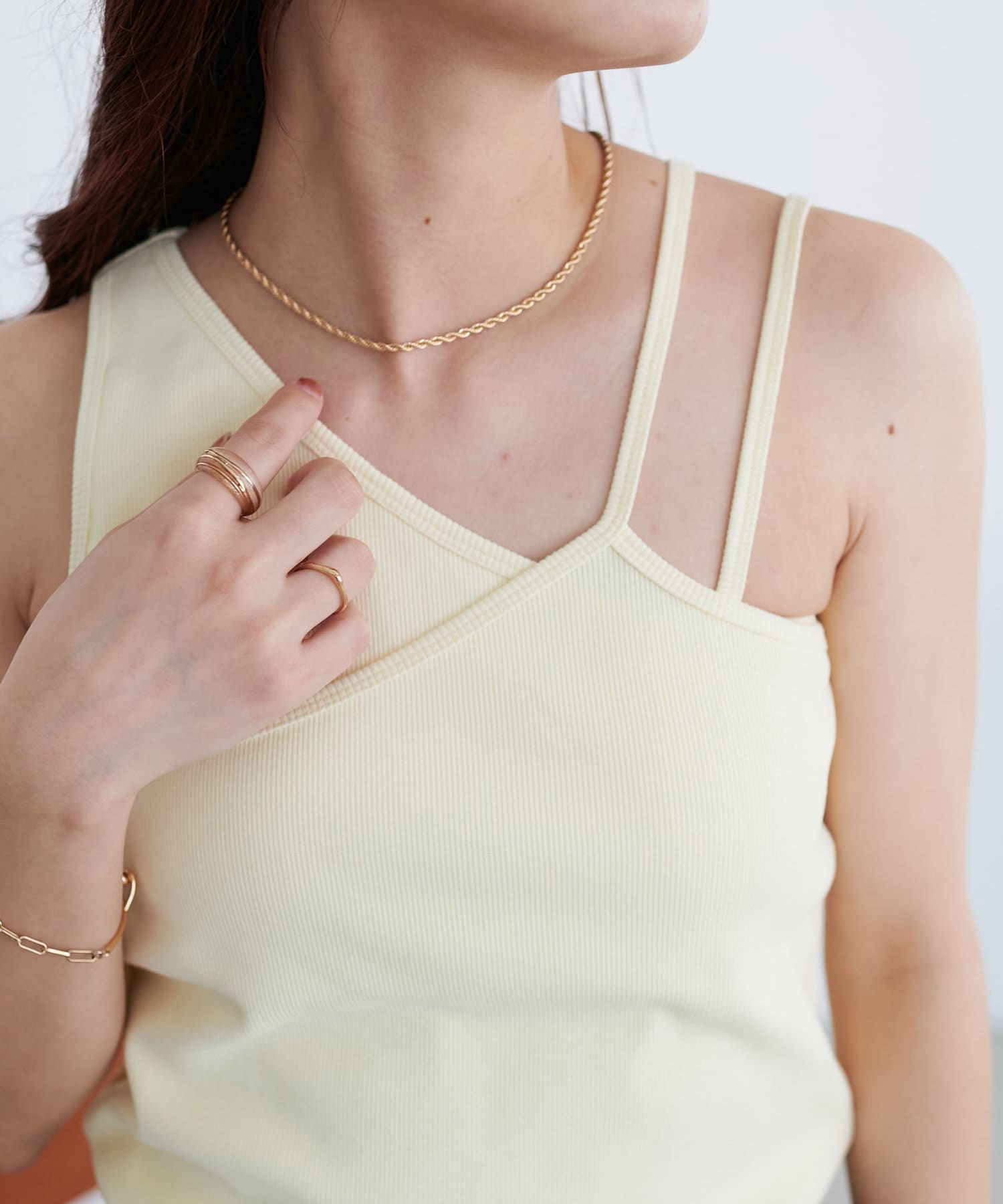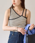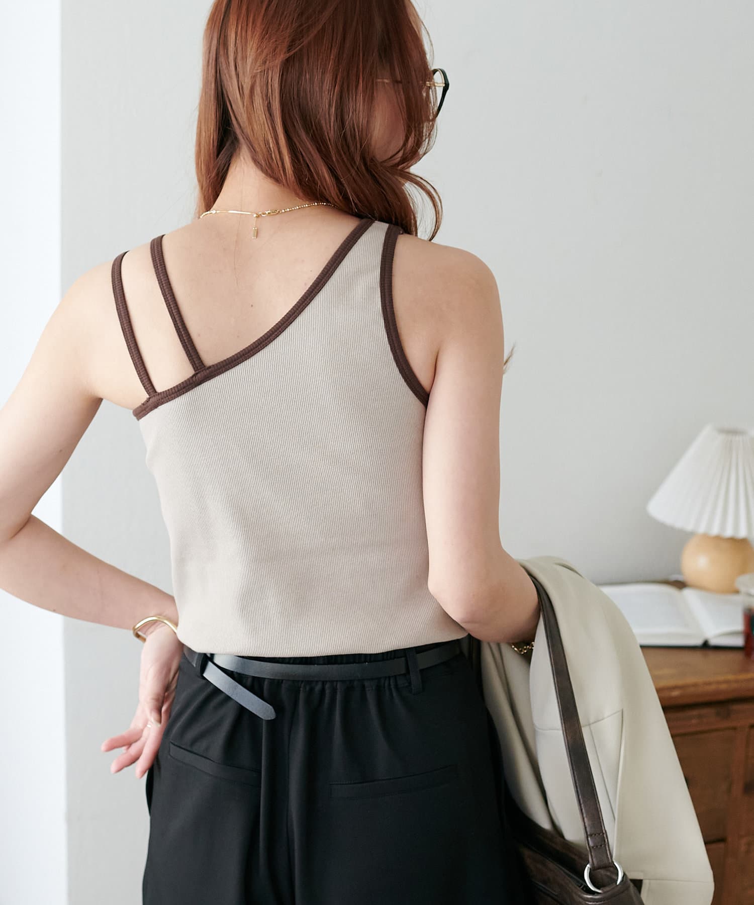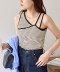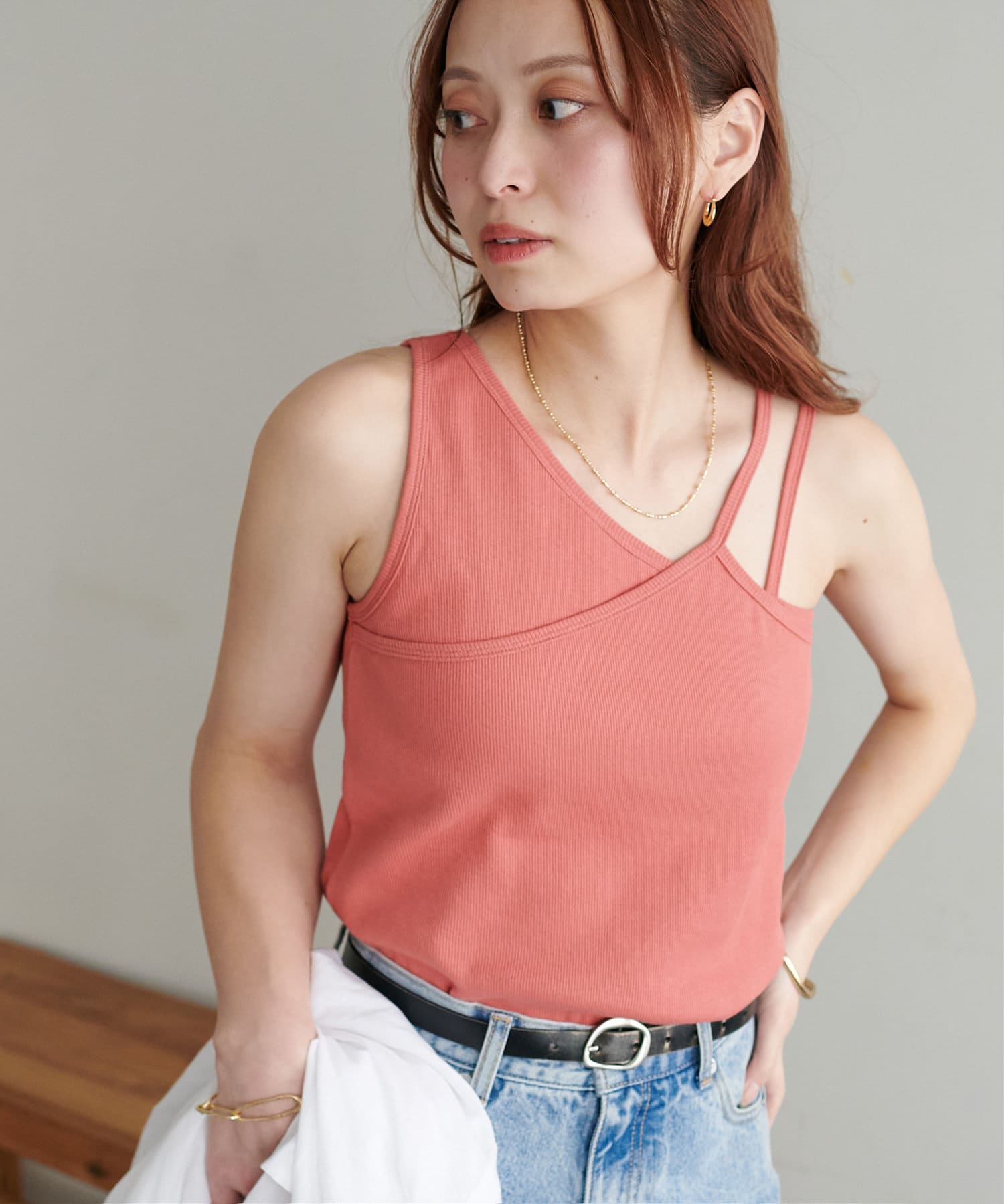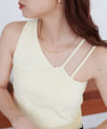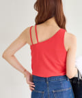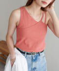 ・ワンショル×ダブルストラップのレイヤード風デザインが目を惹くカップ付きタンクトップ