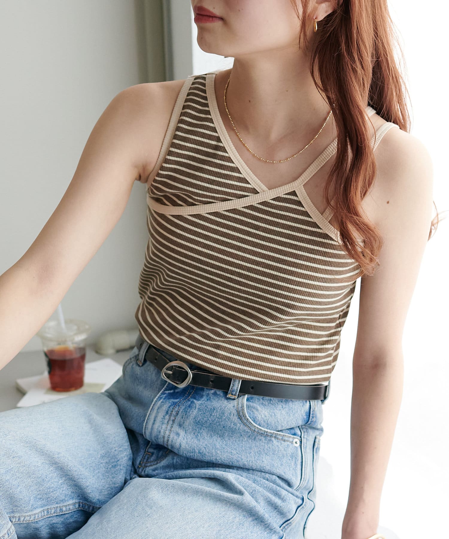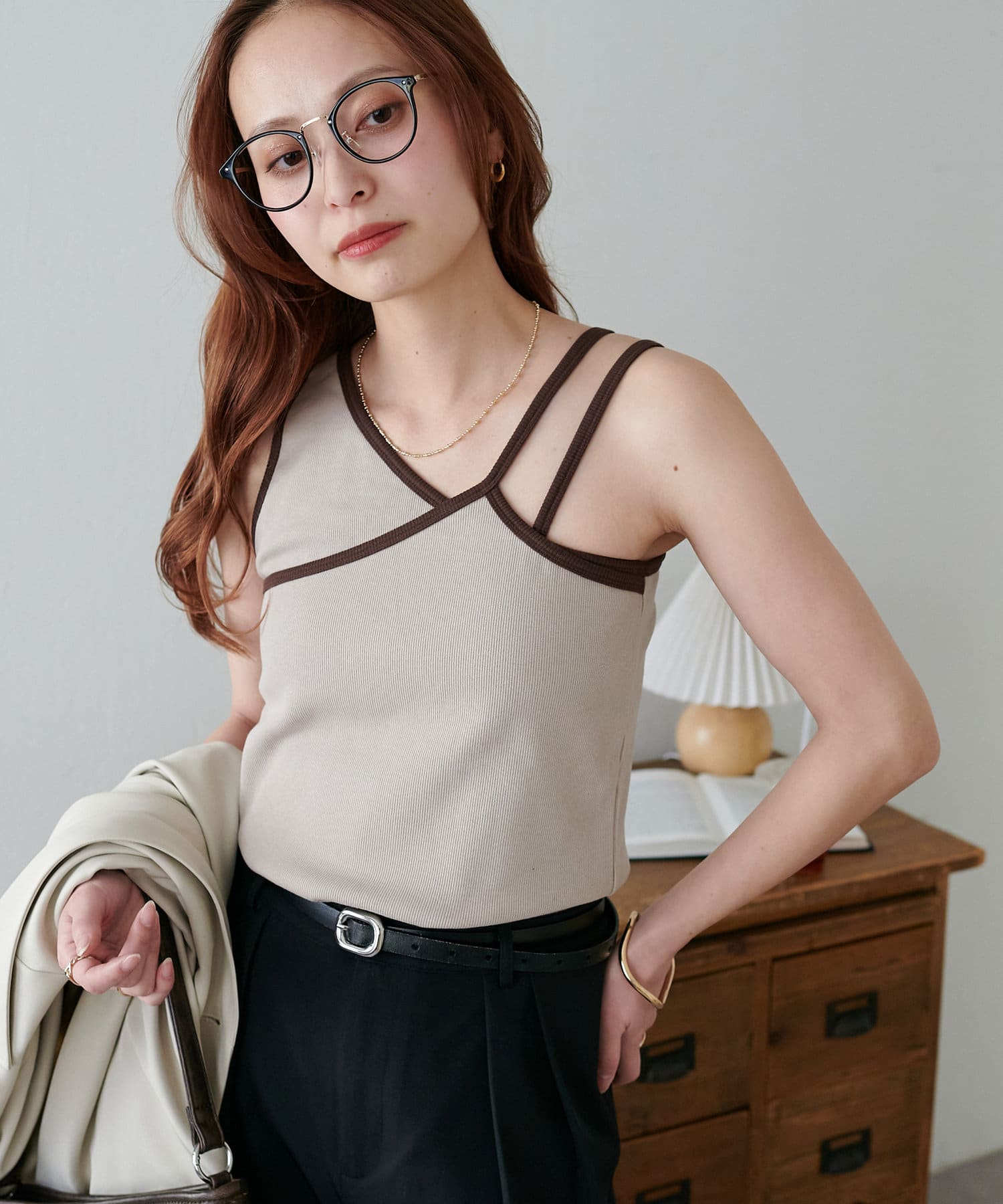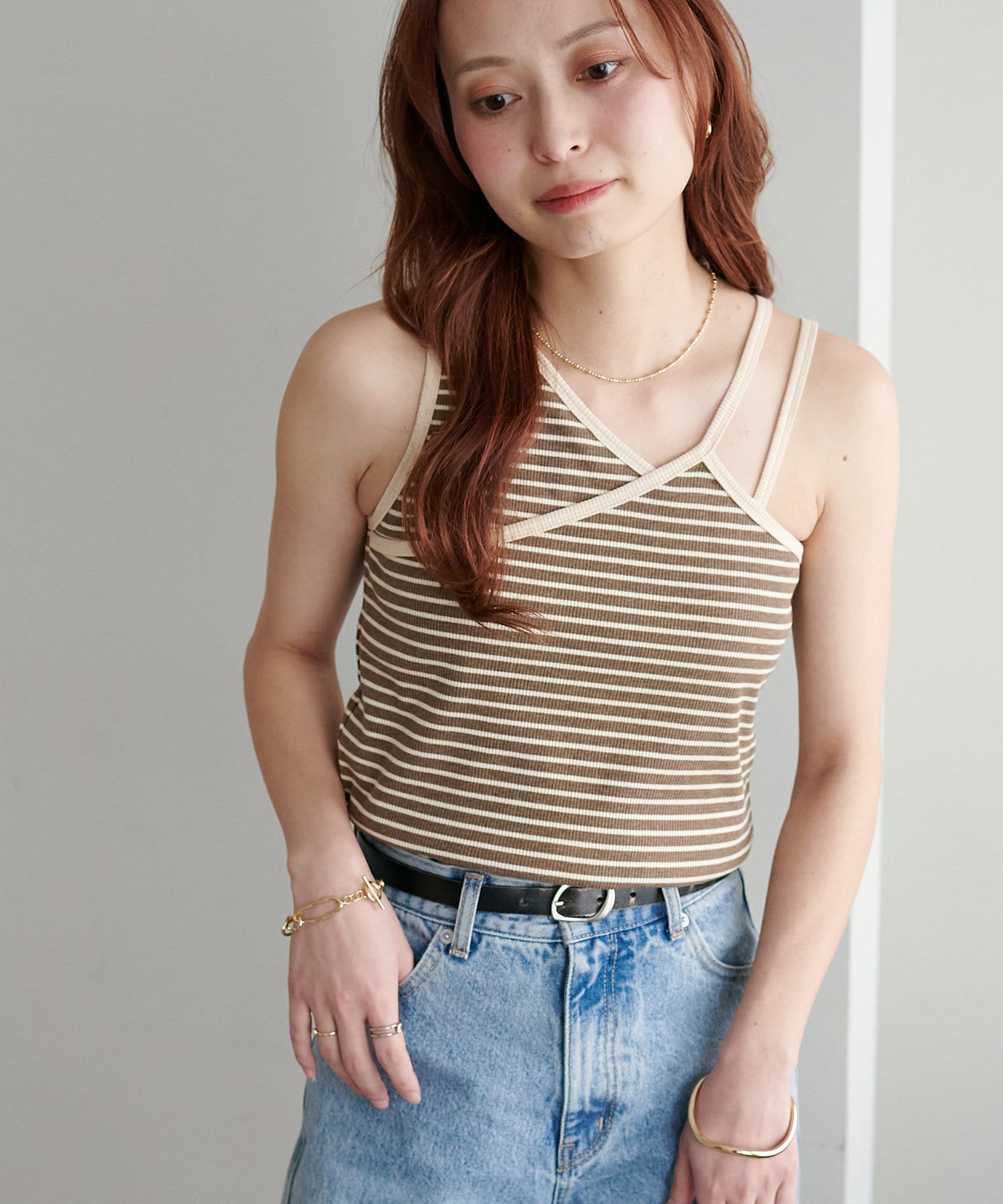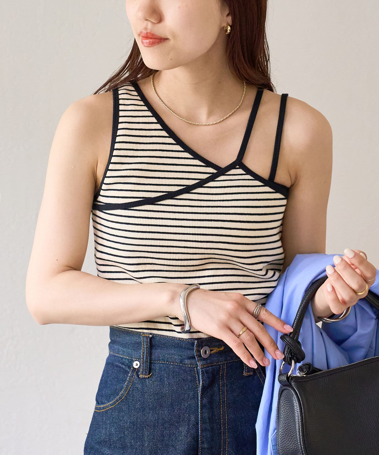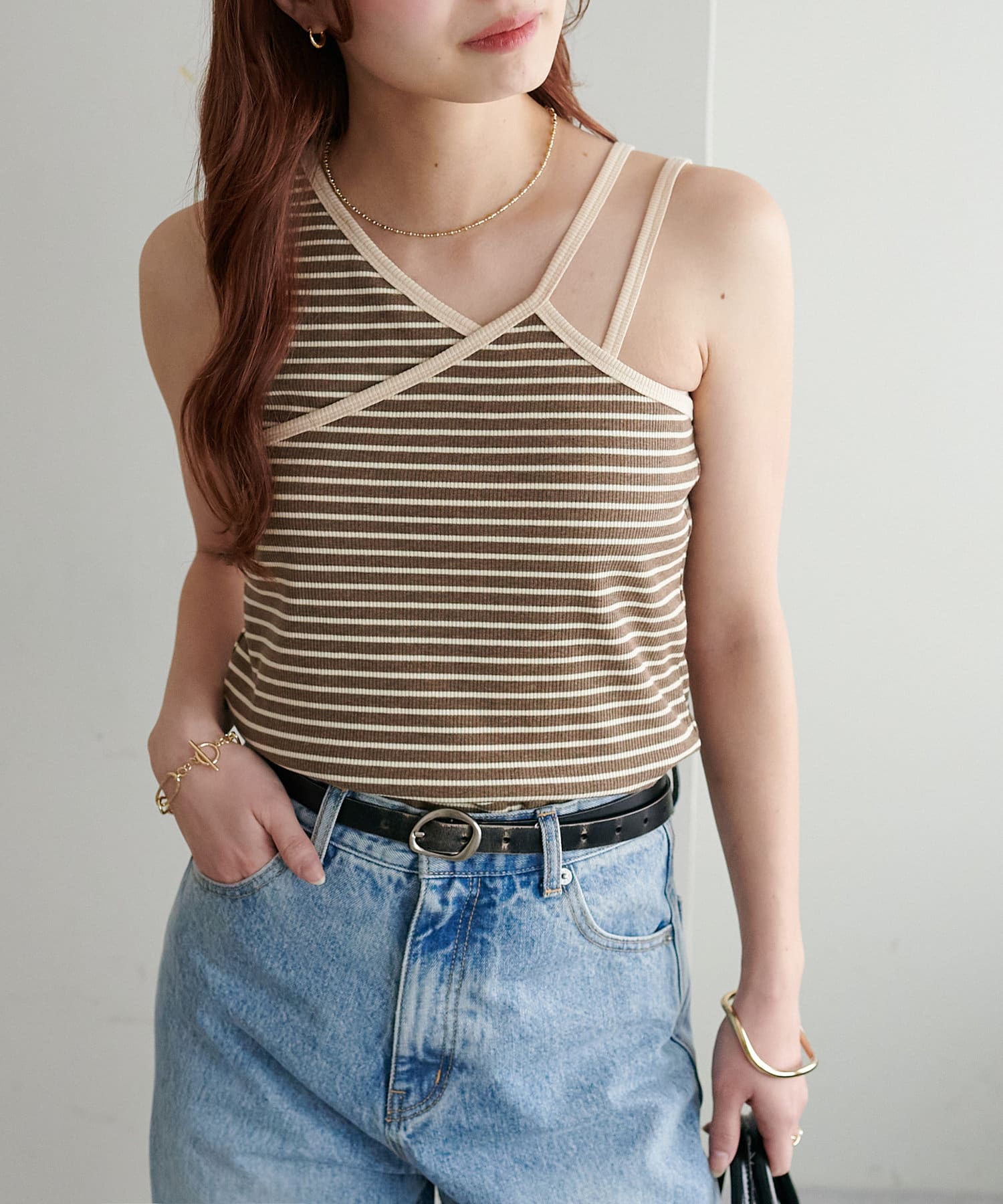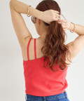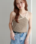 ・ワンショル×ダブルストラップのレイヤード風デザインが目を惹くカップ付きタンクトップ