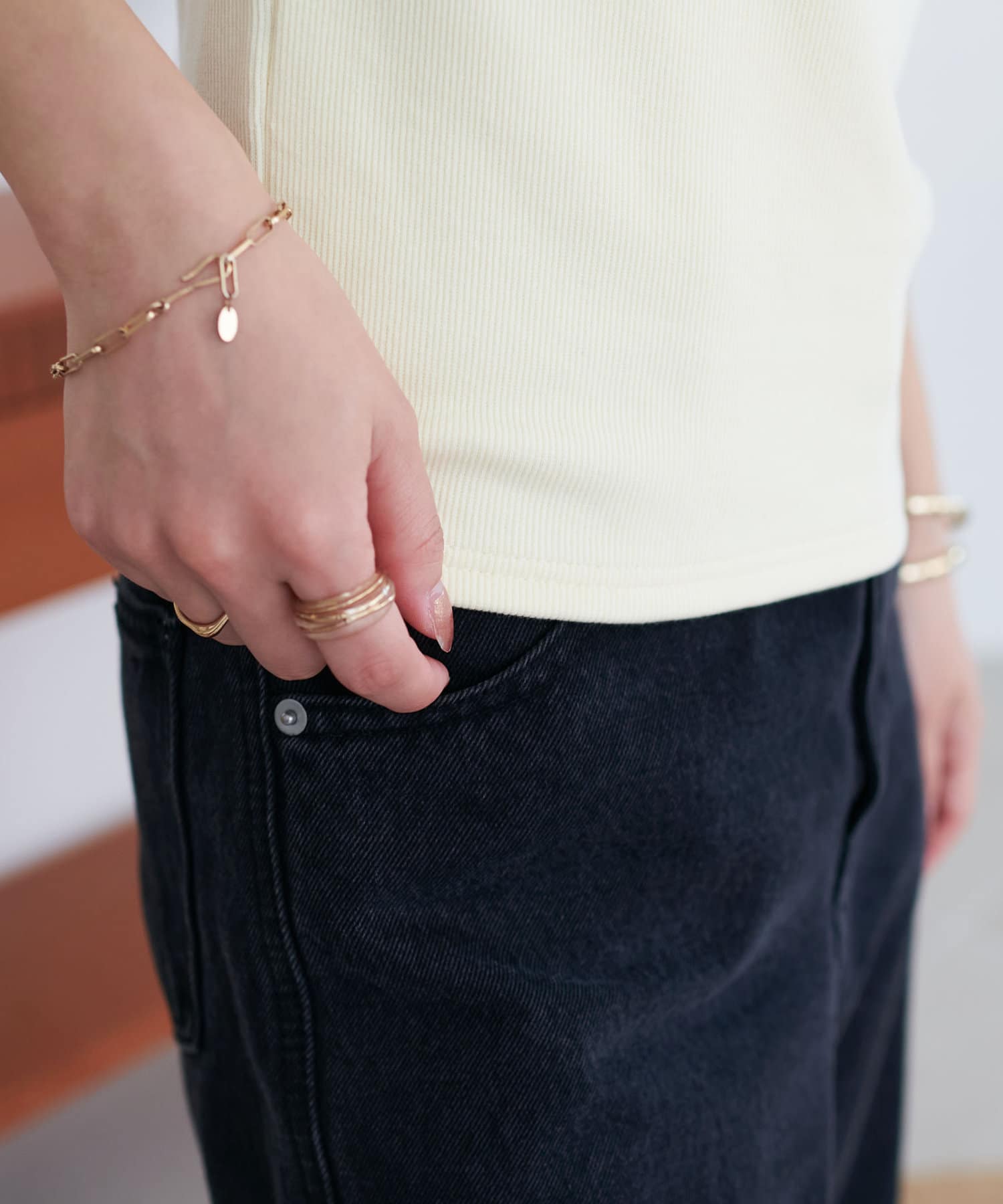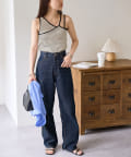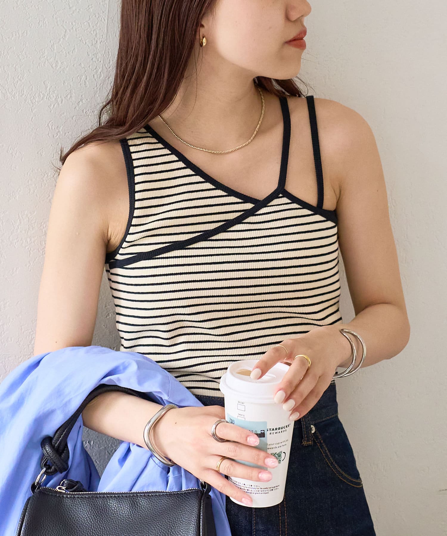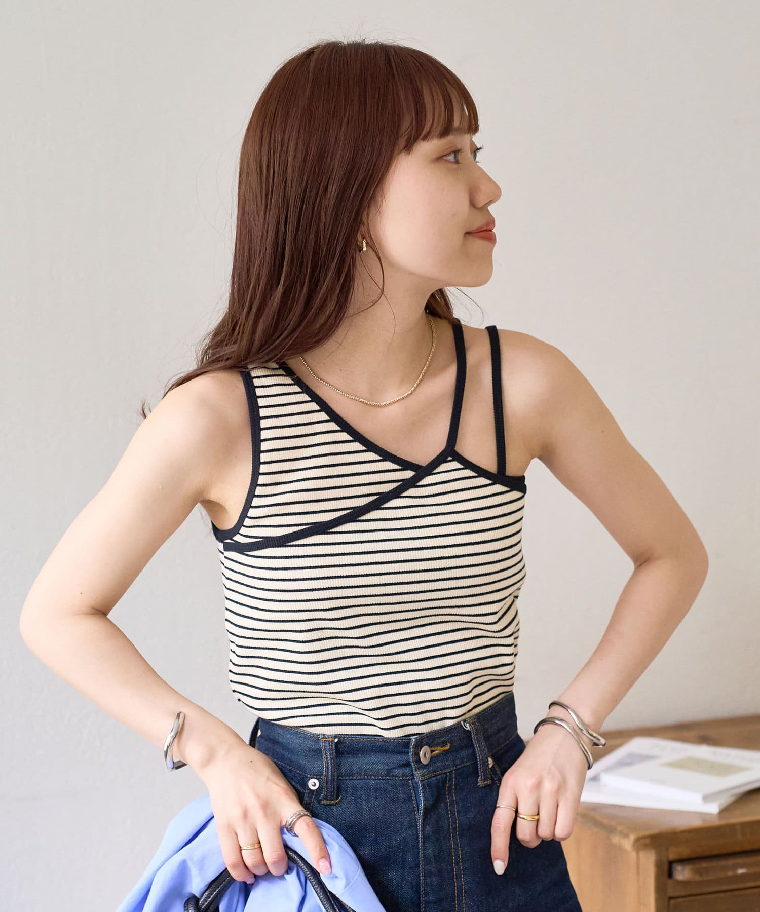 149cmスタッフ(Mサイズ着用):程よい厚みのあるリブ素材で体のラインを拾いすぎず、安心感のあるフィット感。アシンメトリーでもずれにくく、カップ付きで1枚でも快適です!