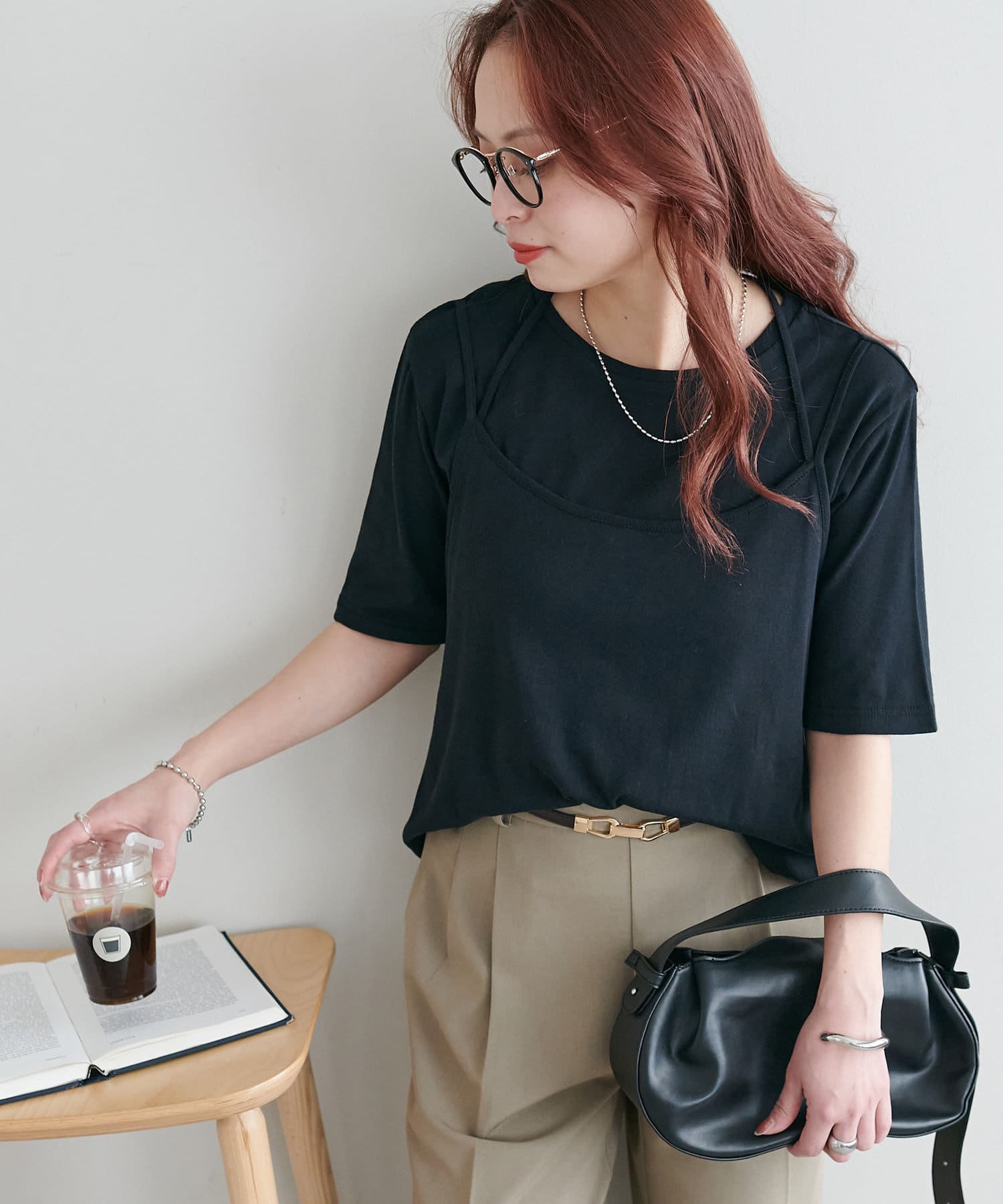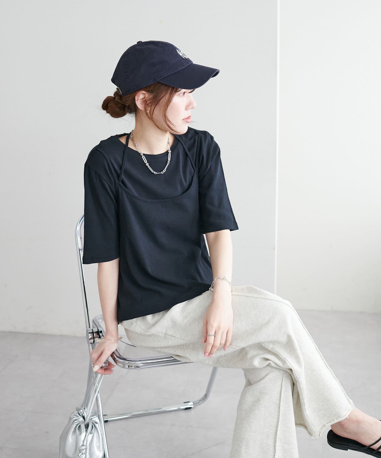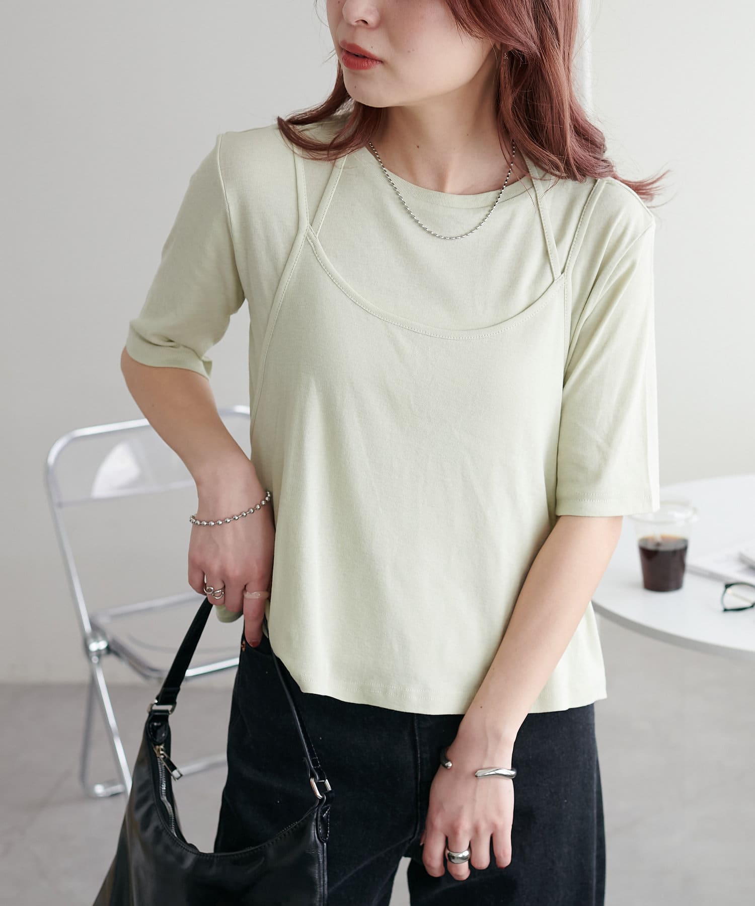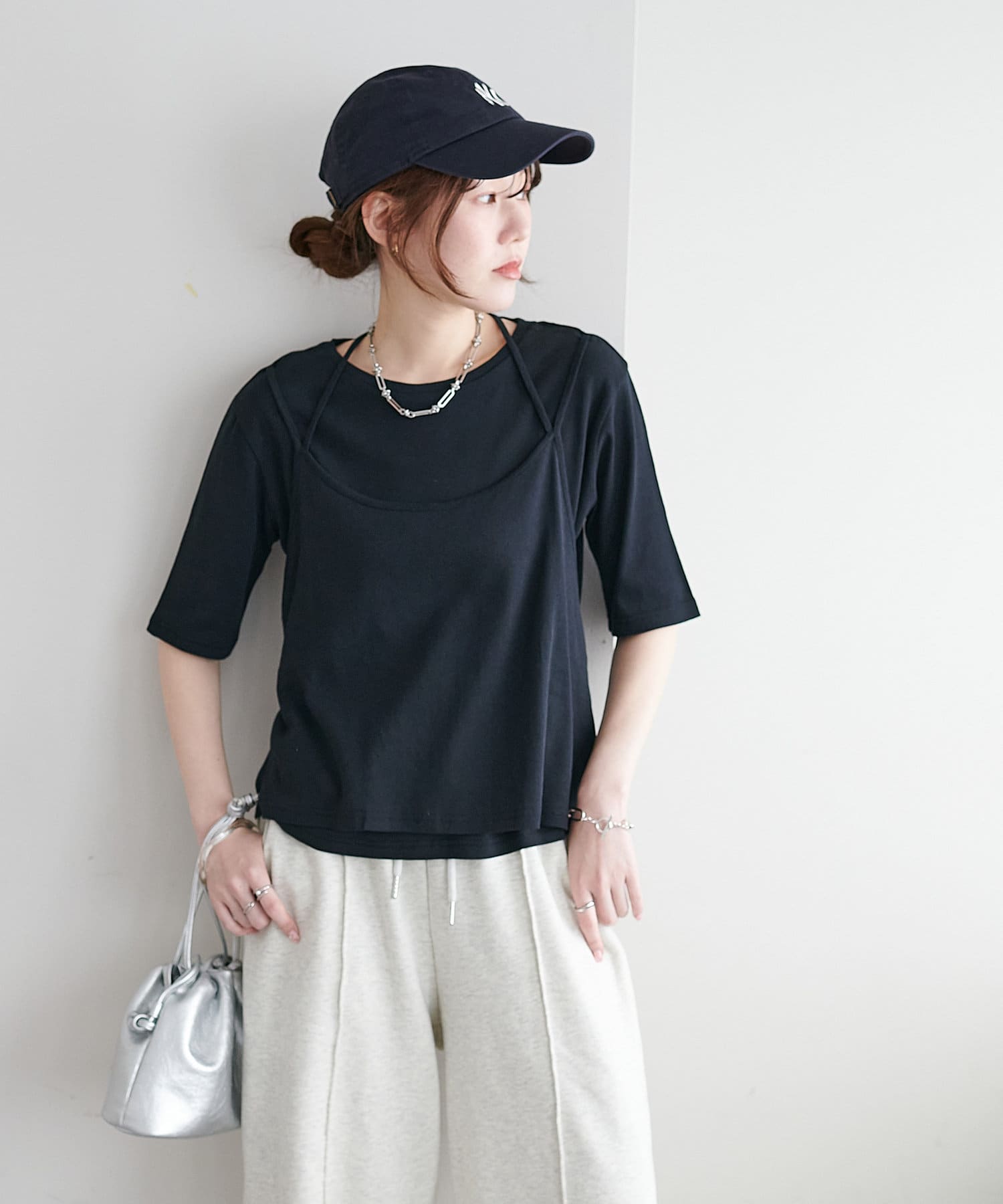 Tシャツとキャミソールをレイヤードしたようなデザインがこなれ感を演出。重ね着する手間なく、簡単にトレンドのレイヤードスタイルが完成します。程よくゆとりのあるシルエットは、体型をカバーしながらも、着ぶくれせずにすっきりとした印象に。カラーはベーシックなオフホワイト・ブラックと、春にぴったりなミントの3色をご用意いたしました♩
