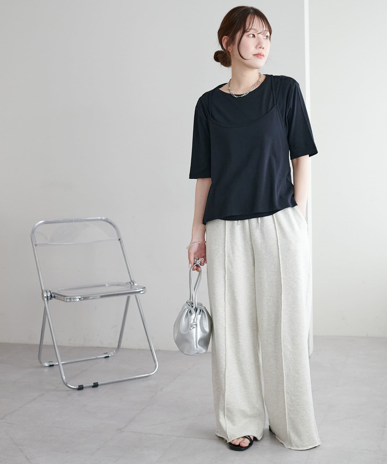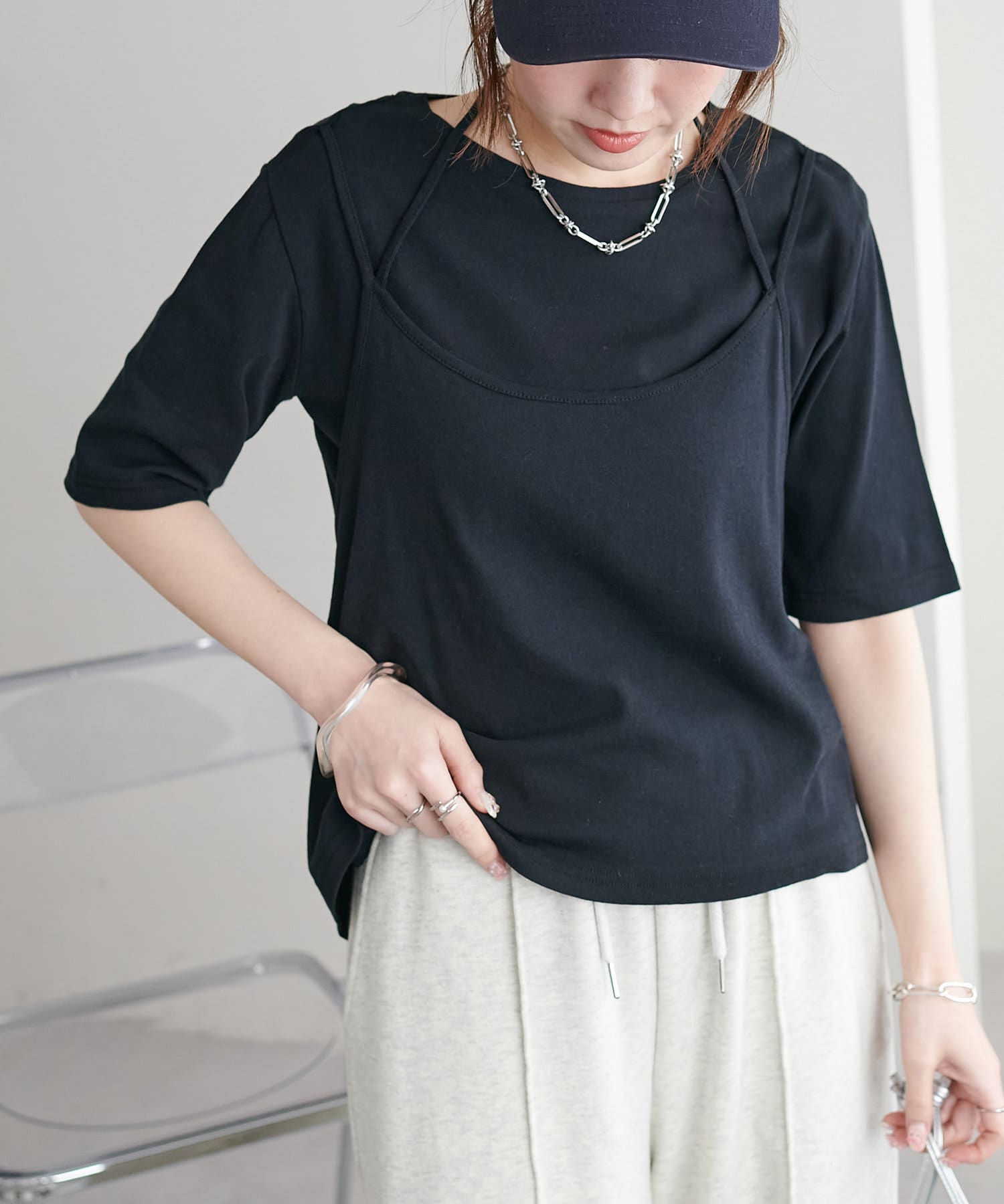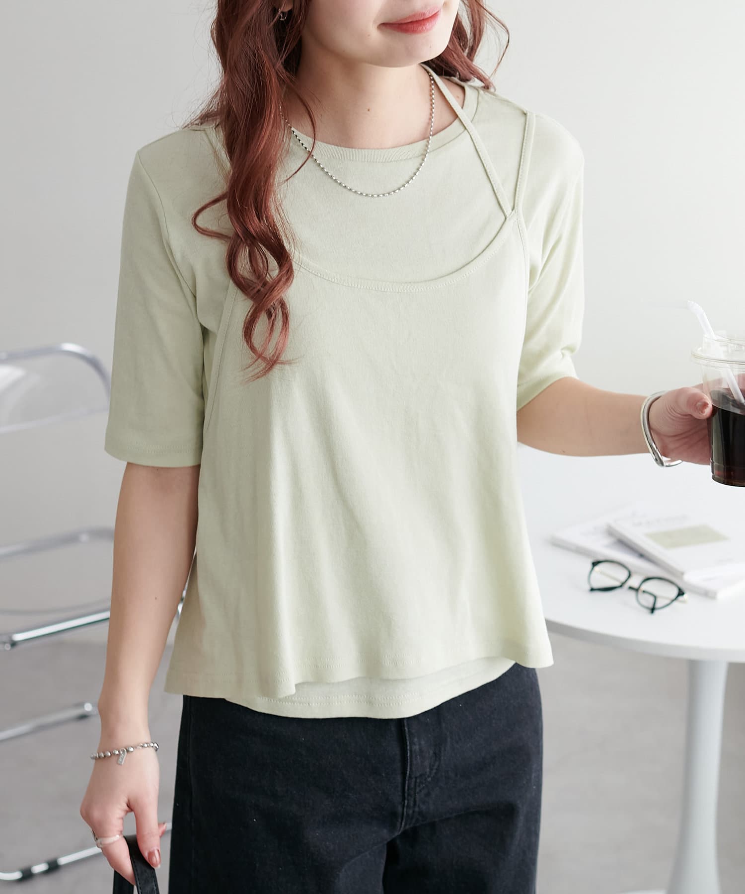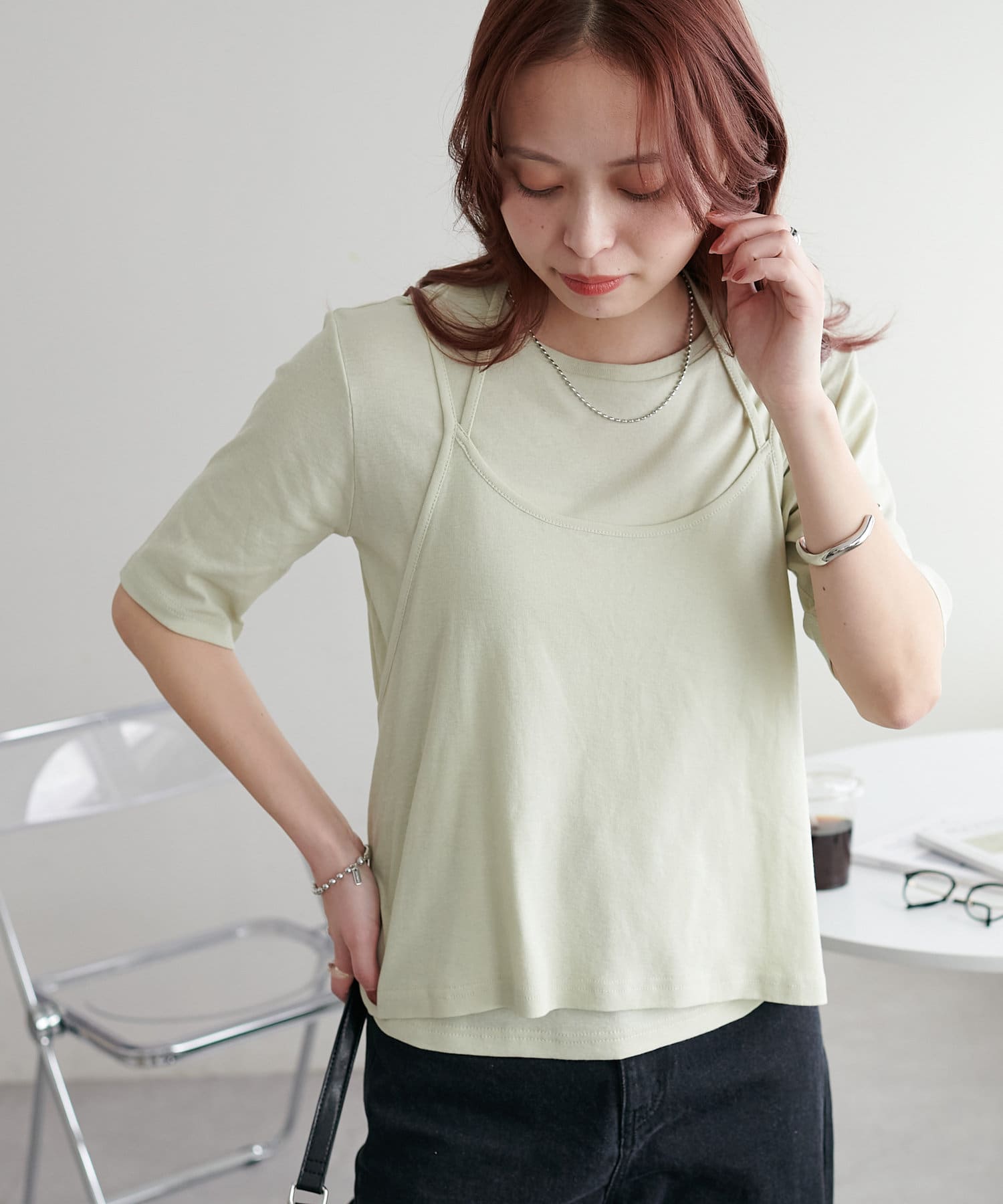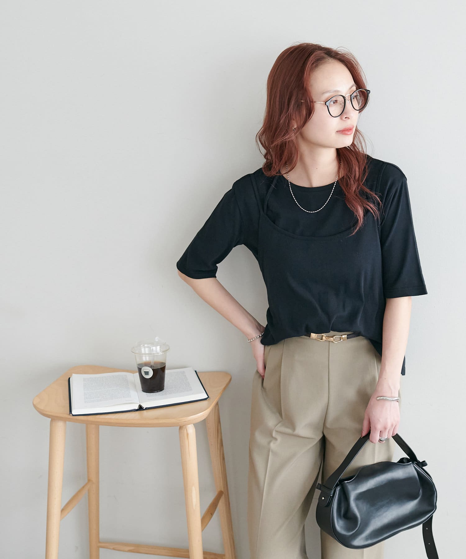 Tシャツとキャミソールをレイヤードしたようなデザインがこなれ感を演出。重ね着する手間なく、簡単にトレンドのレイヤードスタイルが完成します。程よくゆとりのあるシルエットは、体型をカバーしながらも、着ぶくれせずにすっきりとした印象に。カラーはベーシックなオフホワイト・ブラックと、春にぴったりなミントの3色をご用意いたしました♩