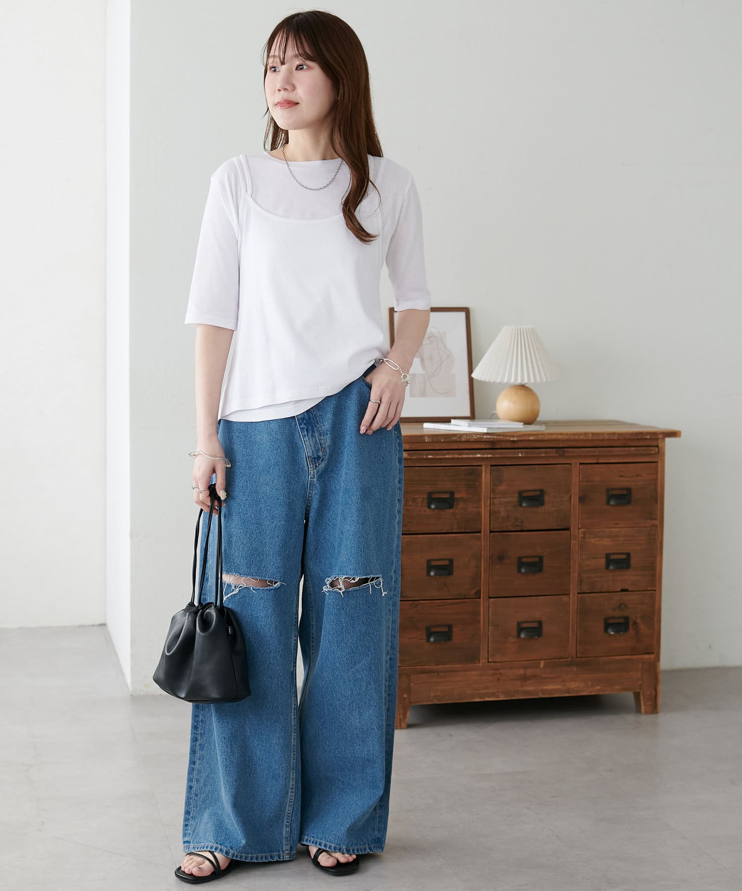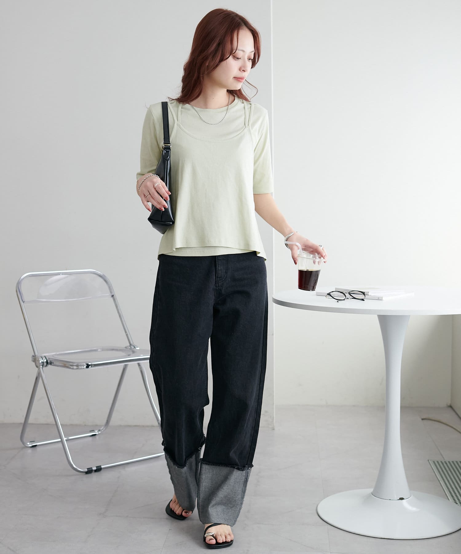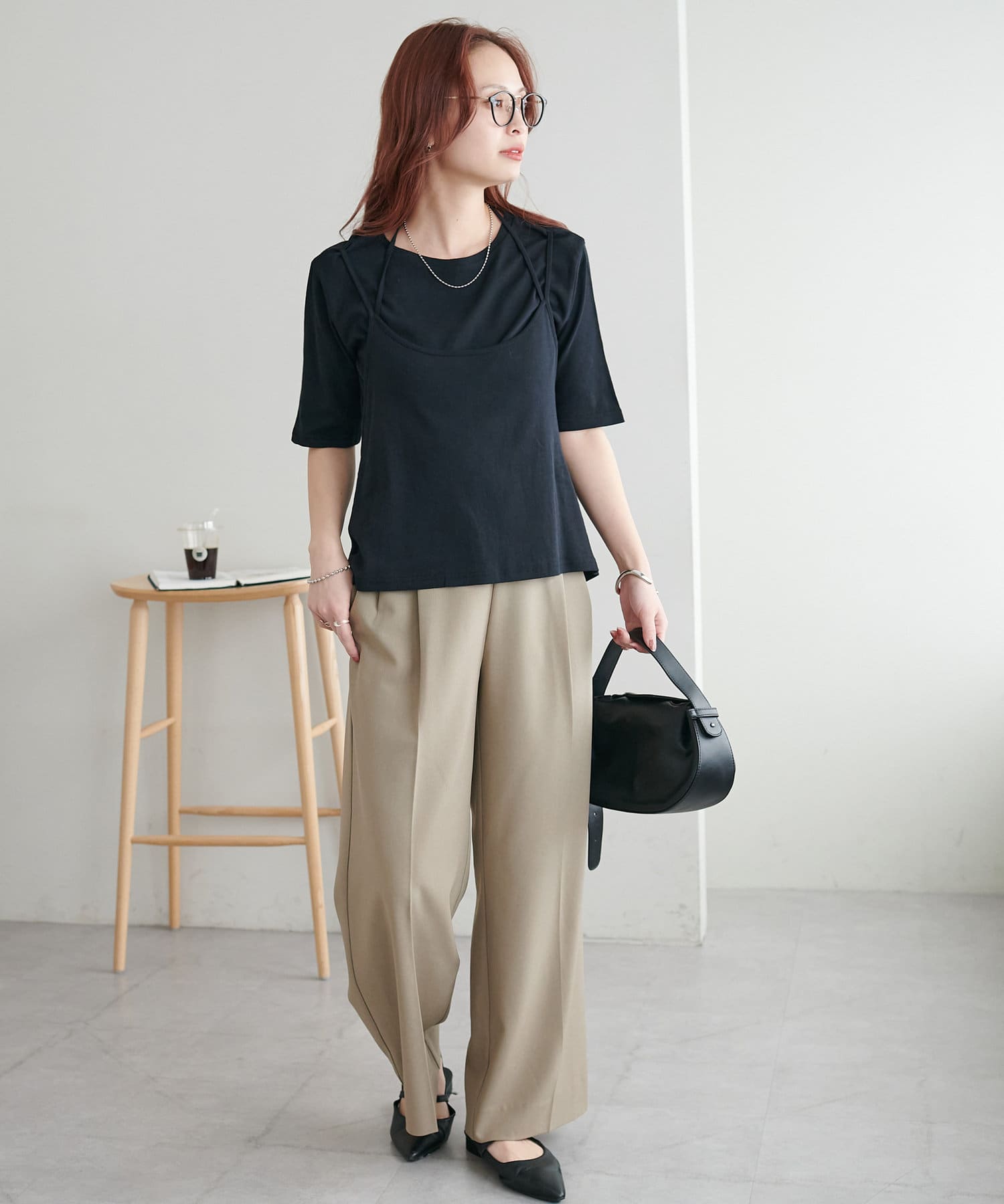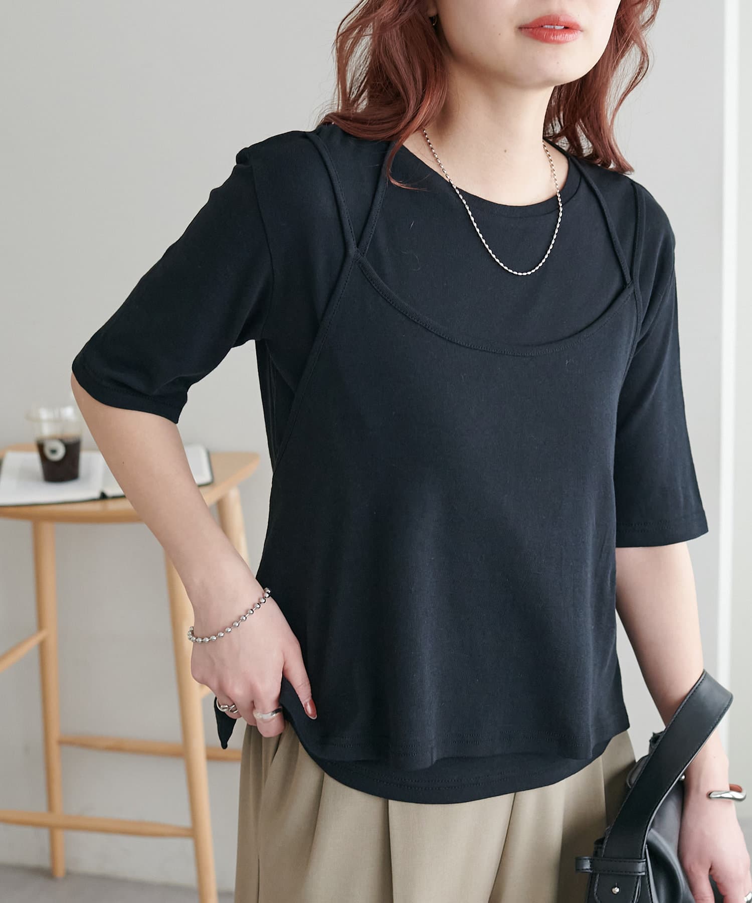 Tシャツとキャミソールをレイヤードしたようなデザインがこなれ感を演出。重ね着する手間なく、簡単にトレンドのレイヤードスタイルが完成します。程よくゆとりのあるシルエットは、体型をカバーしながらも、着ぶくれせずにすっきりとした印象に。カラーはベーシックなオフホワイト・ブラックと、春にぴったりなミントの3色をご用意いたしました♩