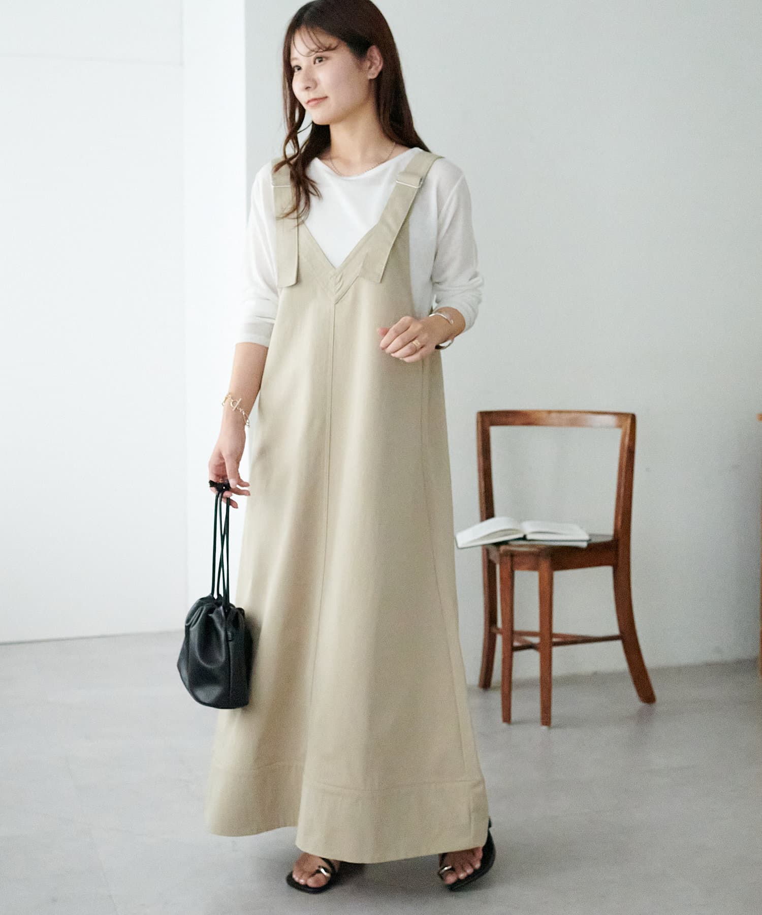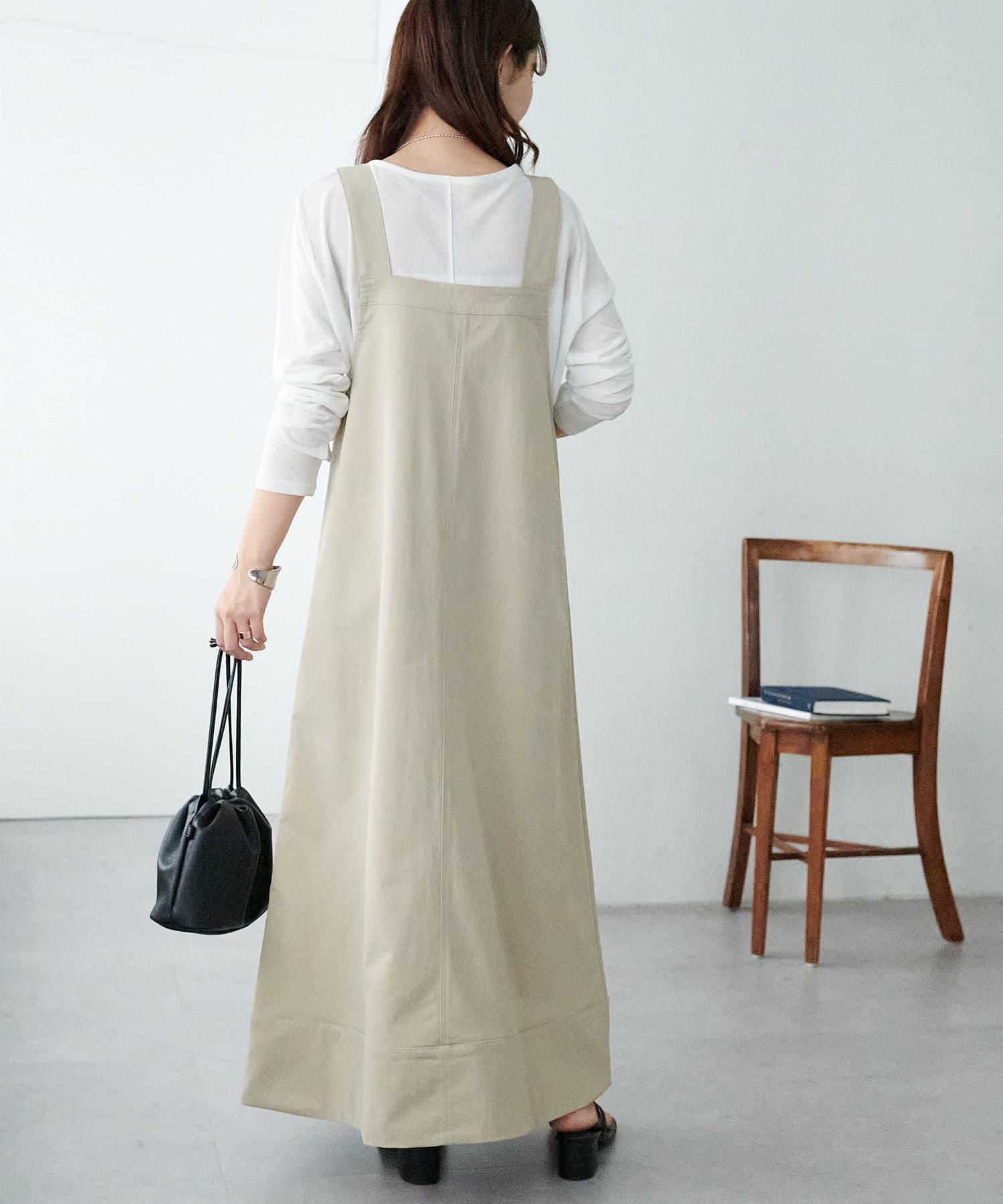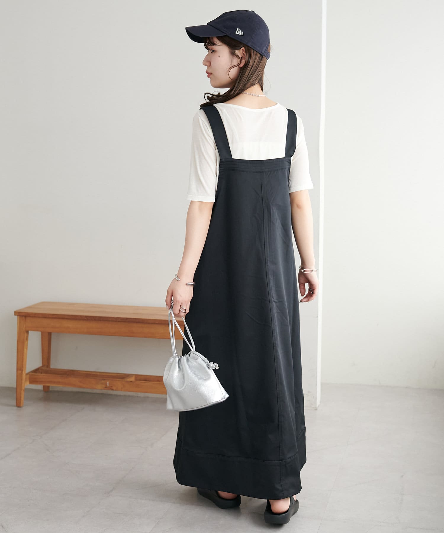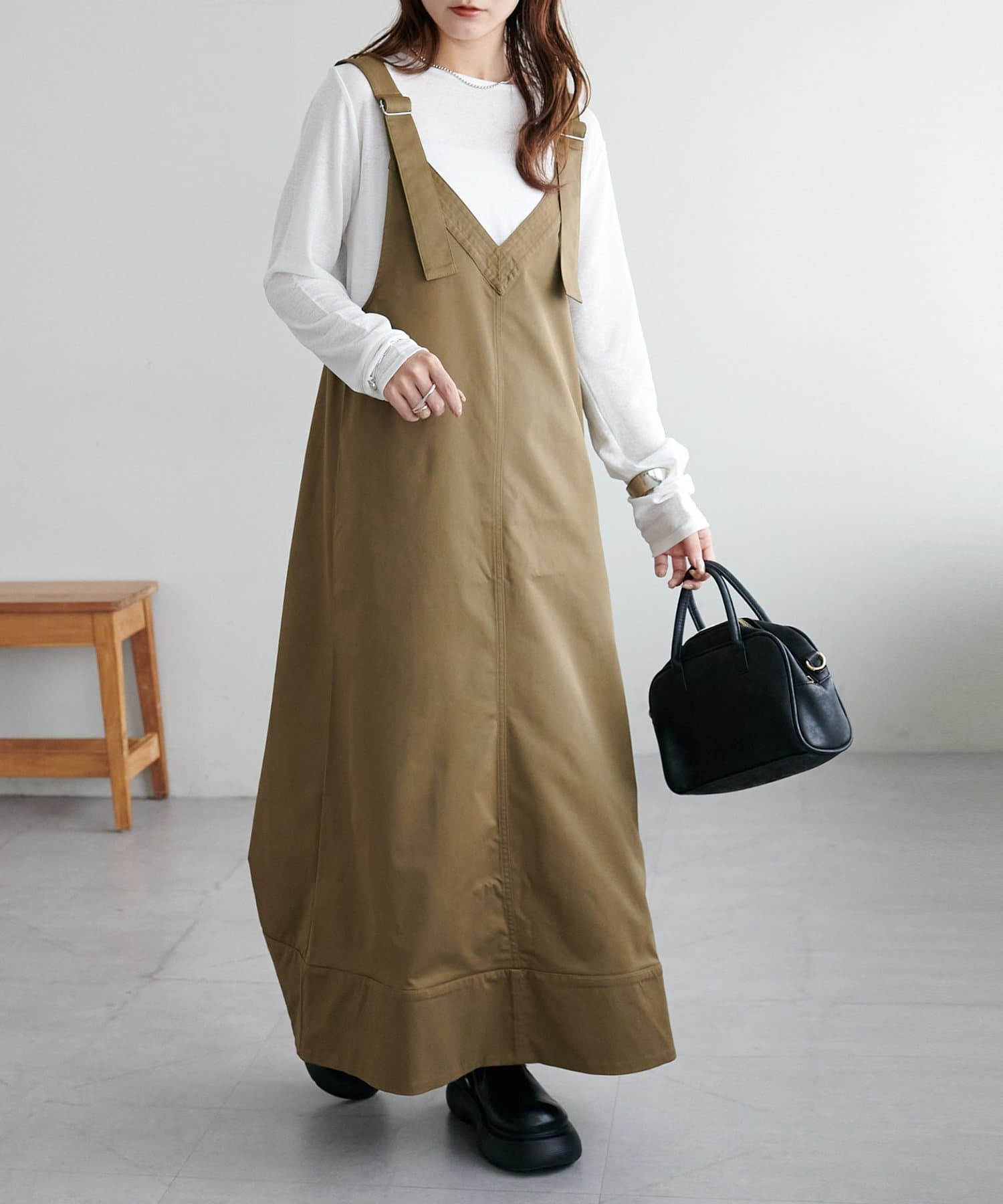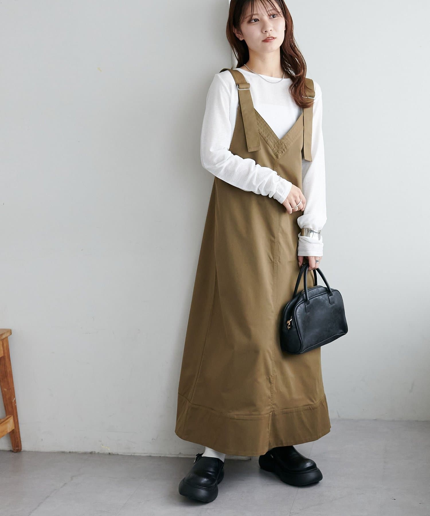 155cmスタッフ:肩紐のアジャスターで長さが調整できるので、小柄でもバランス良く着られました!裾が広がりすぎず、歩くとふわっと揺れる感じがかわいいです♡
