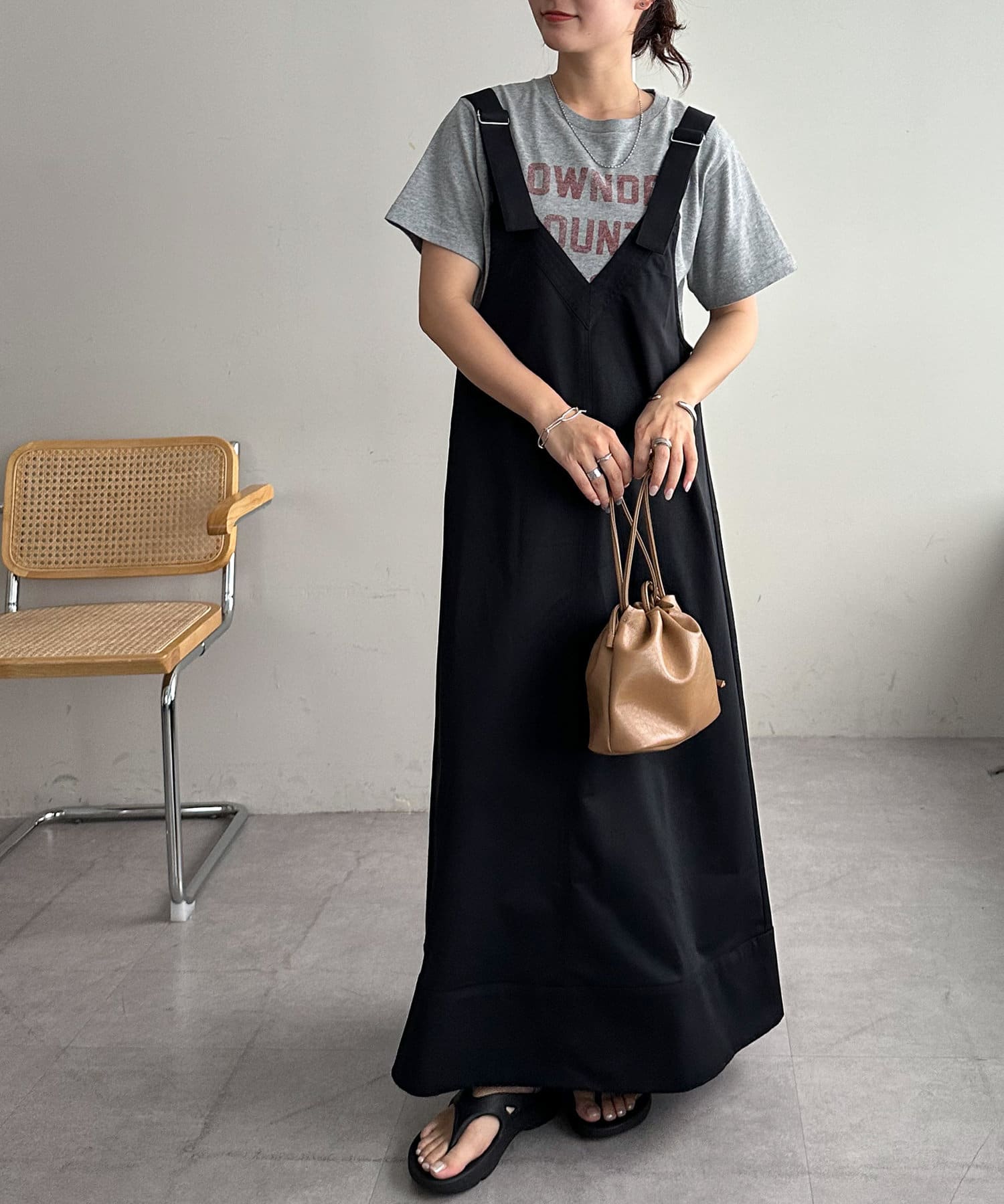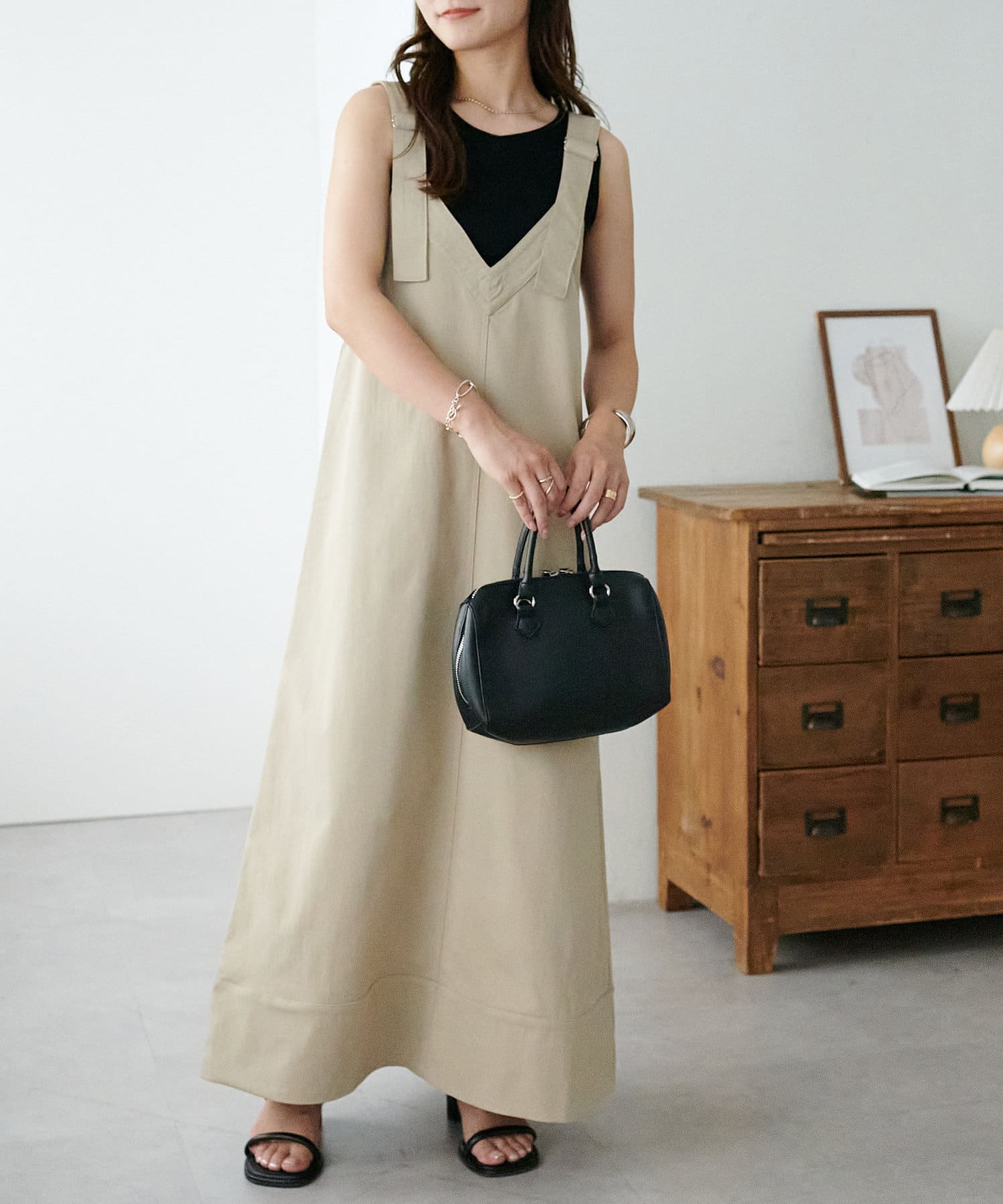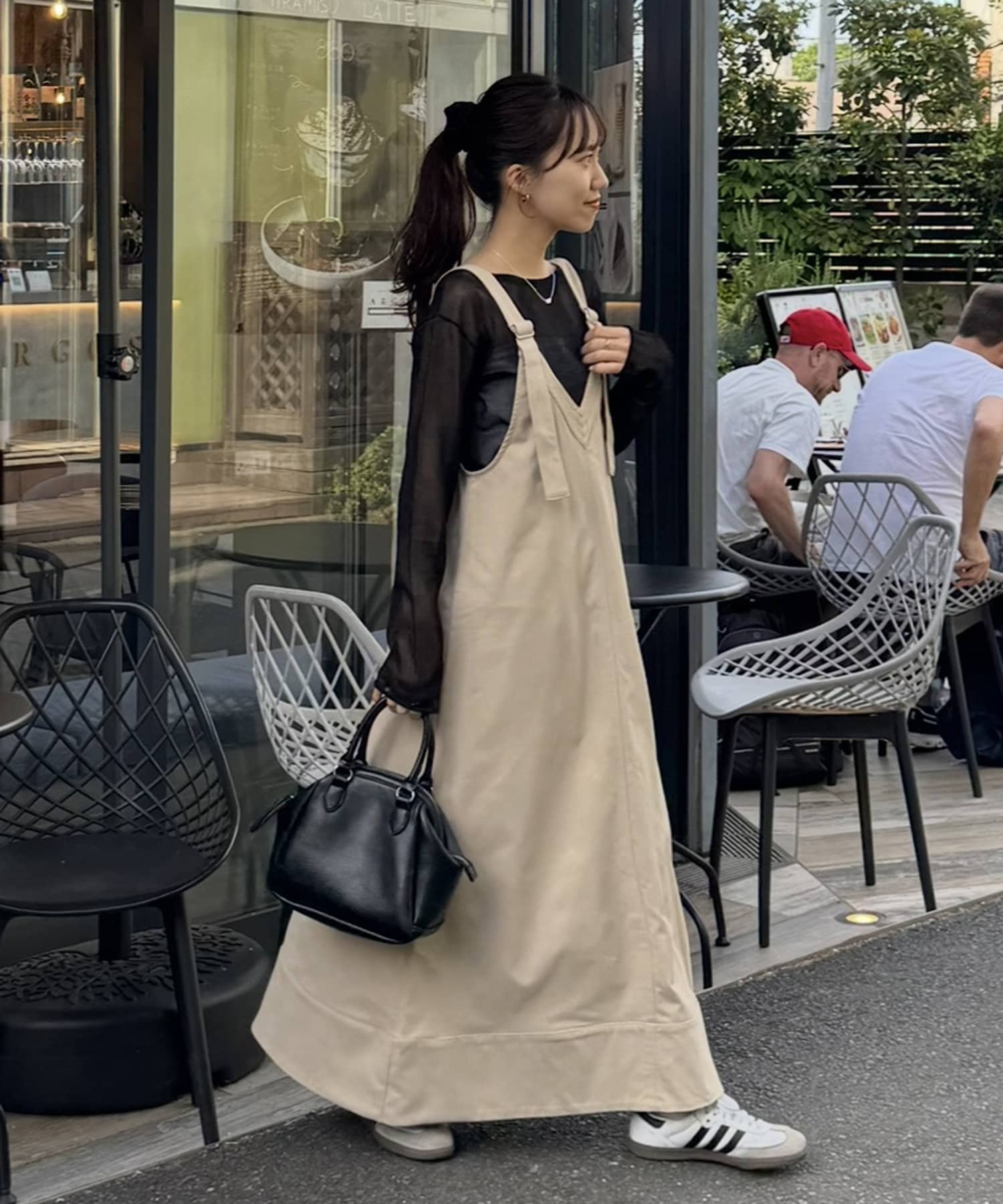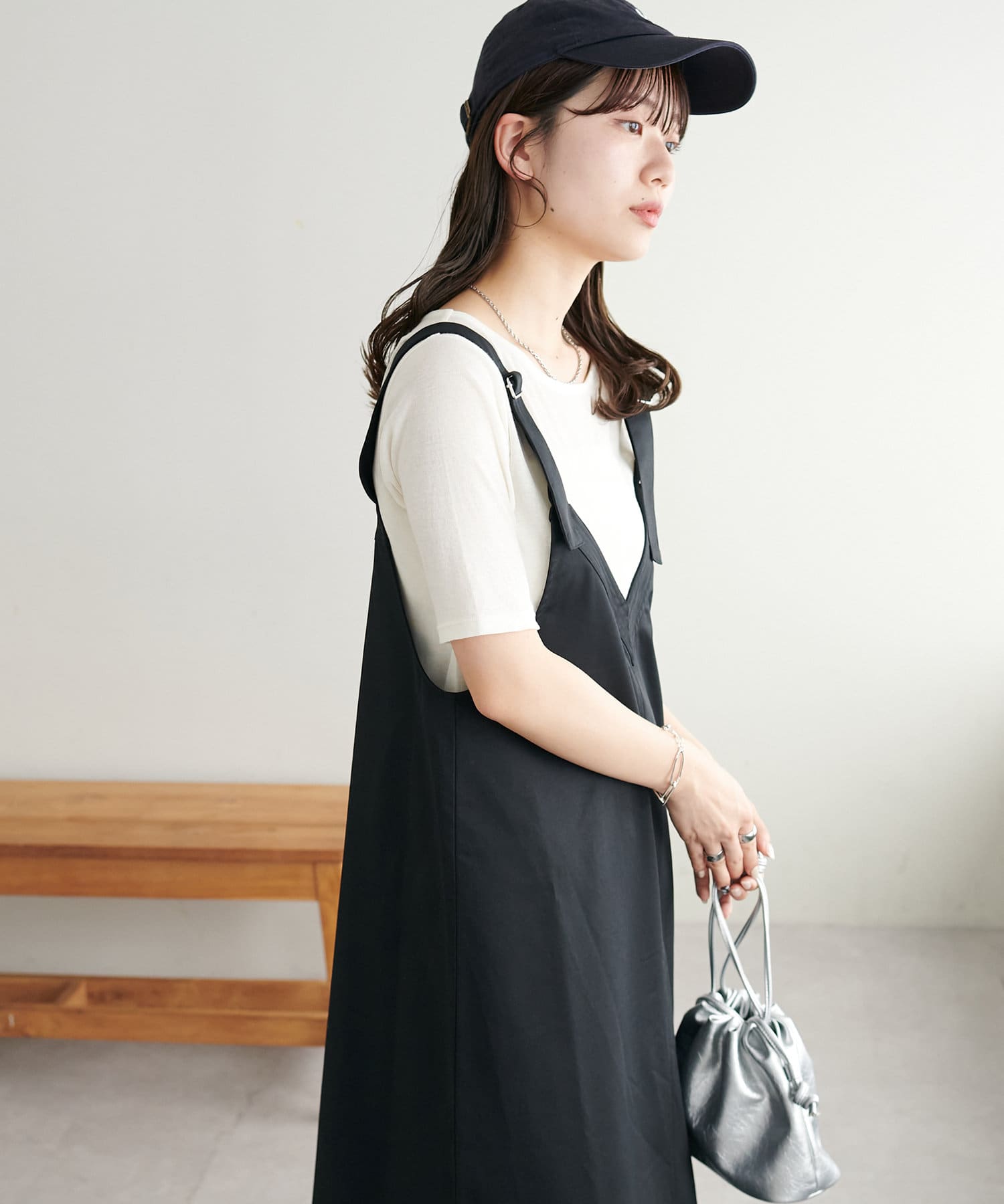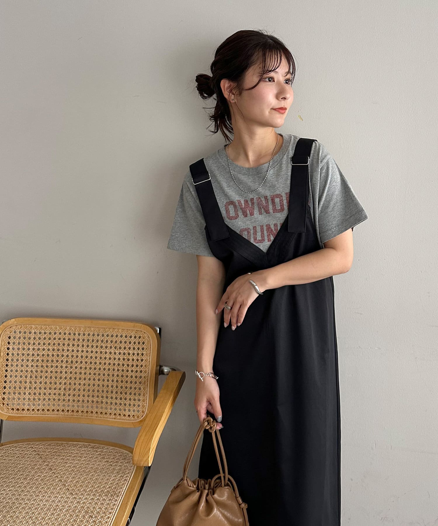 155cmスタッフ:肩紐のアジャスターで長さが調整できるので、小柄でもバランス良く着られました!裾が広がりすぎず、歩くとふわっと揺れる感じがかわいいです♡