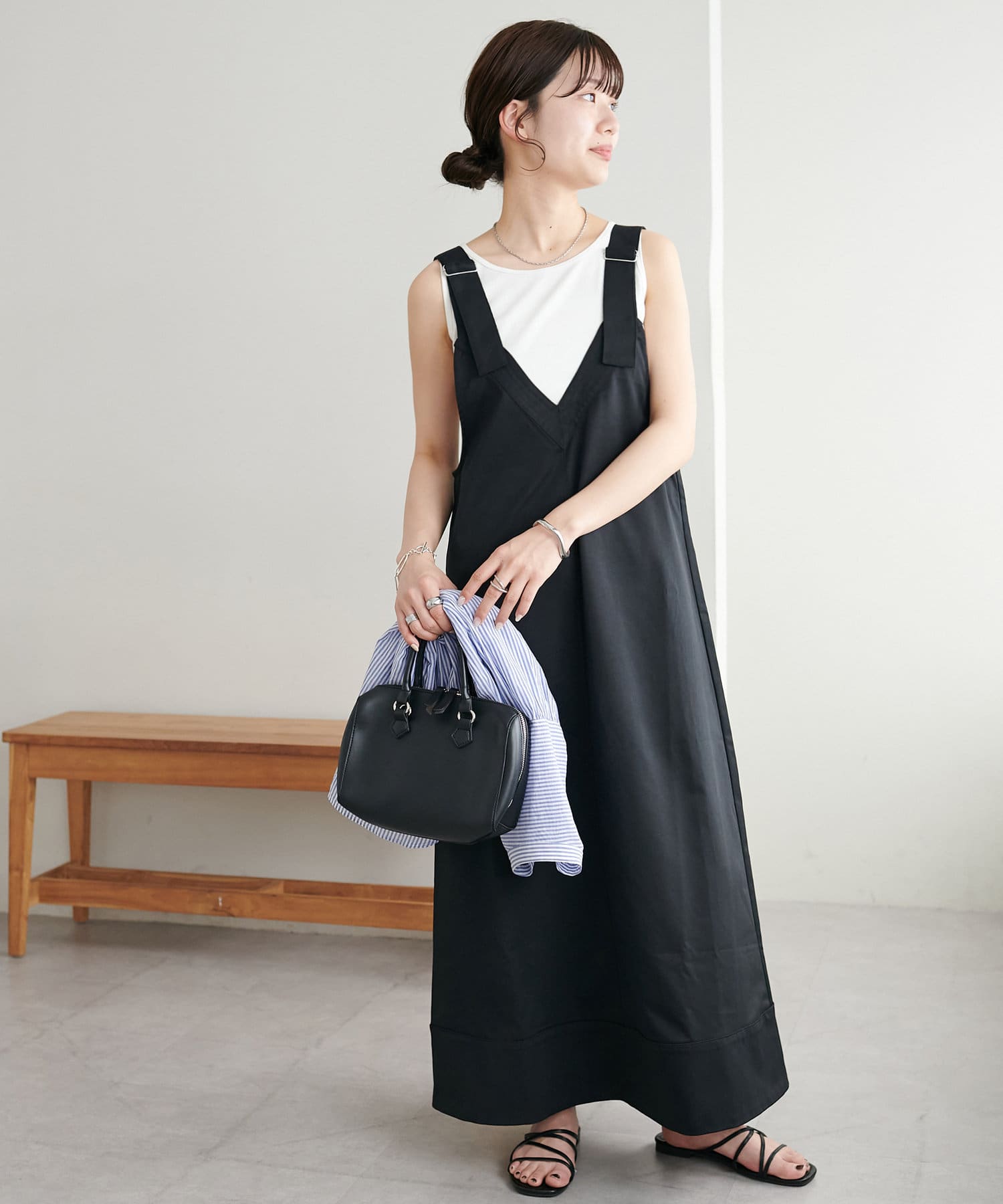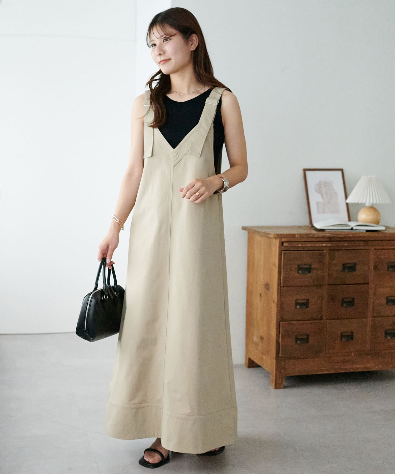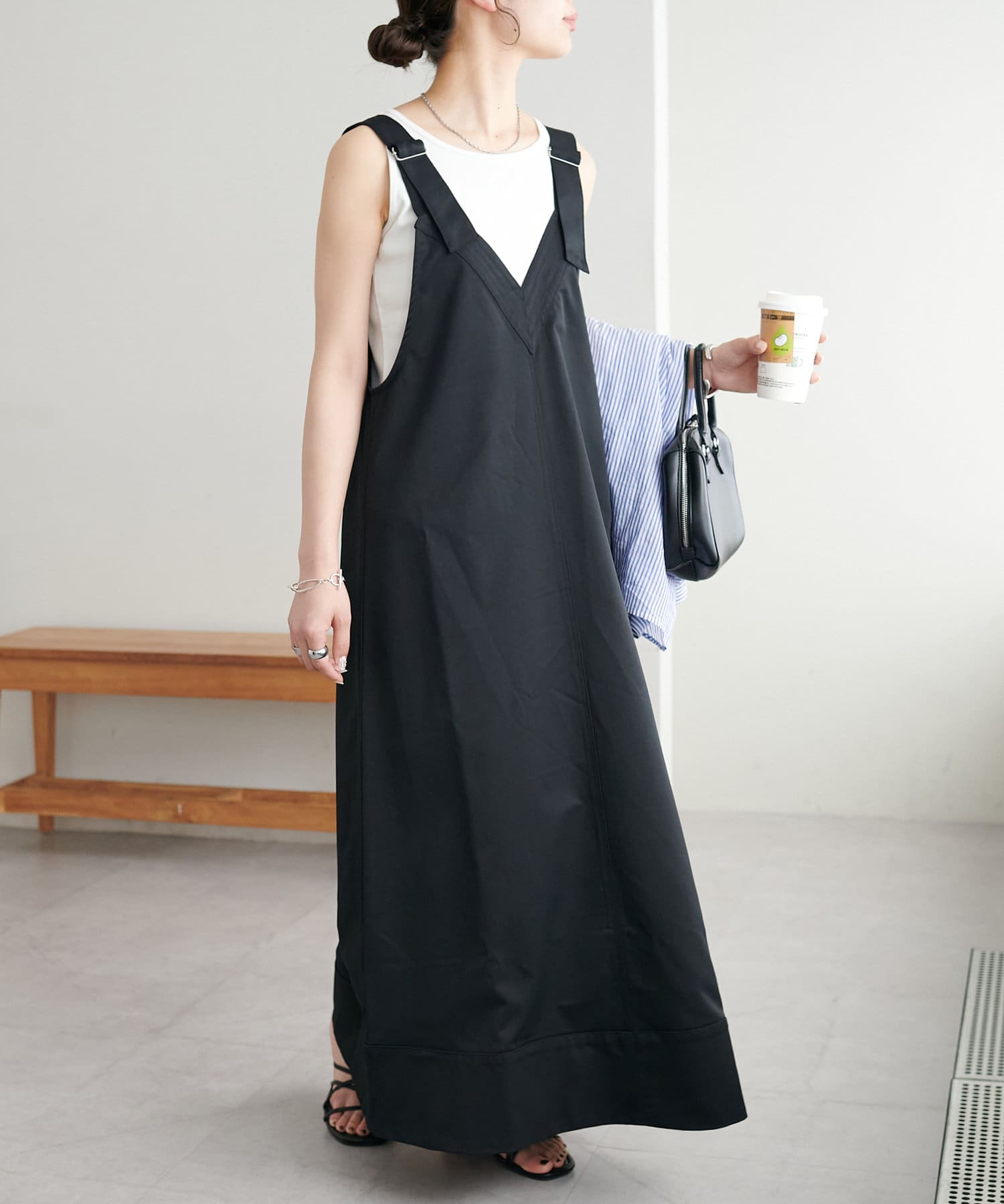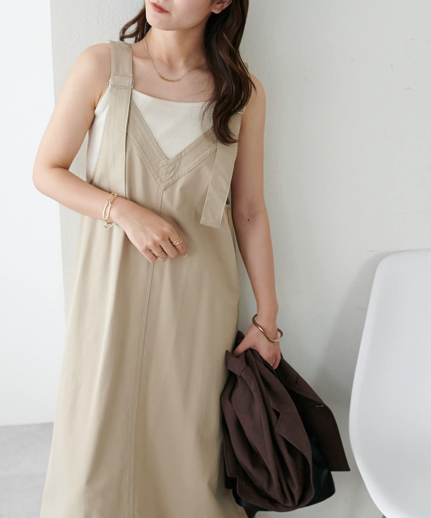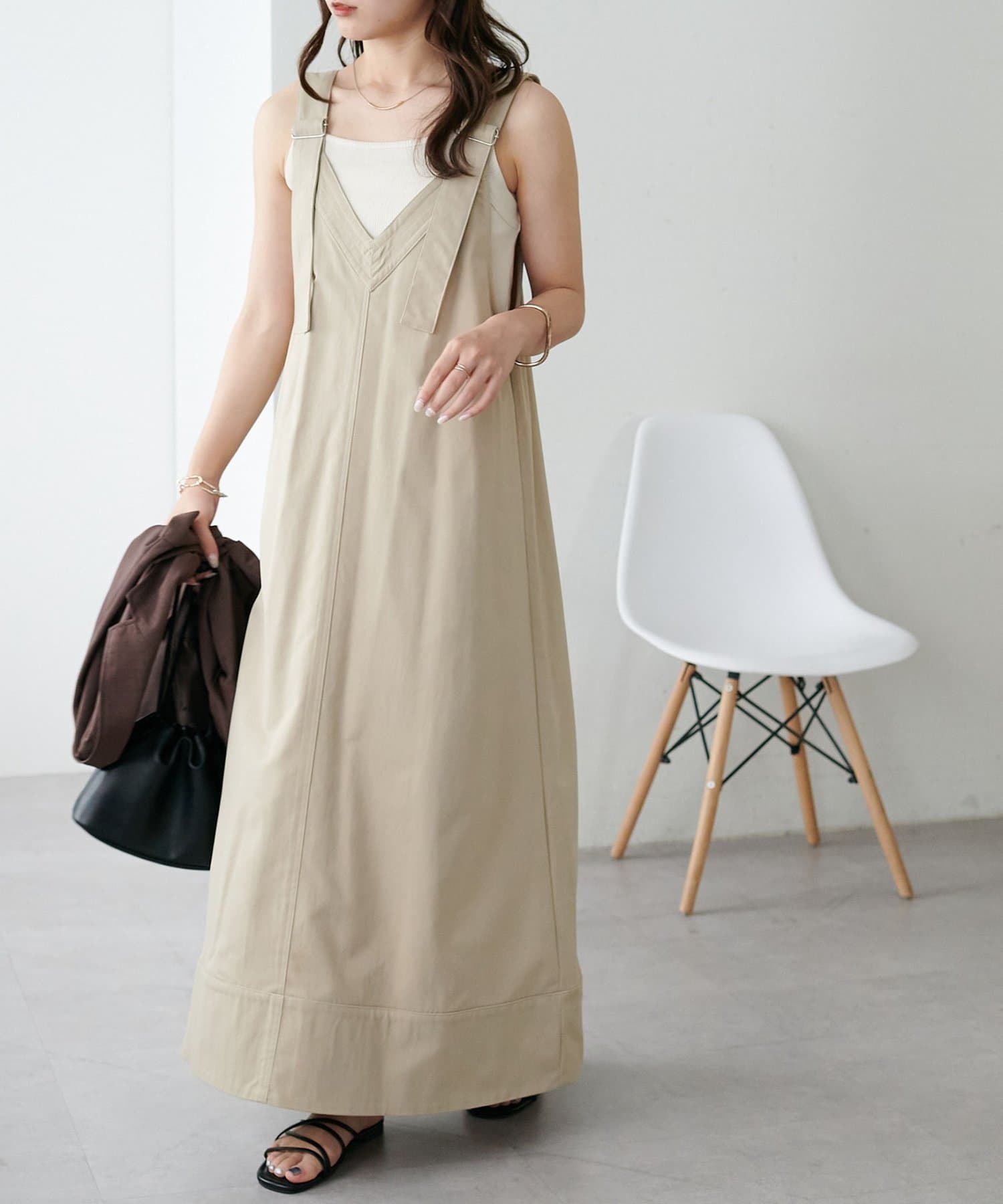155cmスタッフ:肩紐のアジャスターで長さが調整できるので、小柄でもバランス良く着られました!裾が広がりすぎず、歩くとふわっと揺れる感じがかわいいです♡