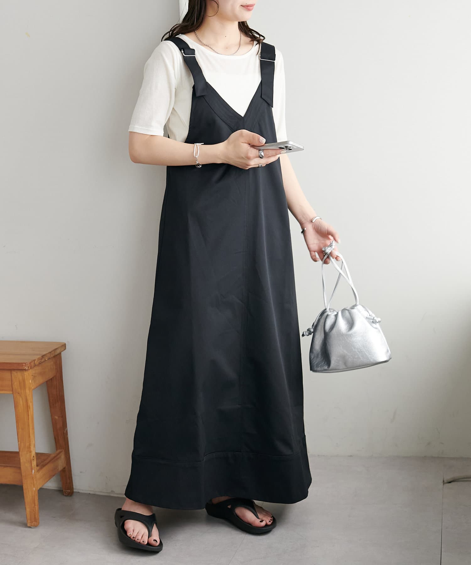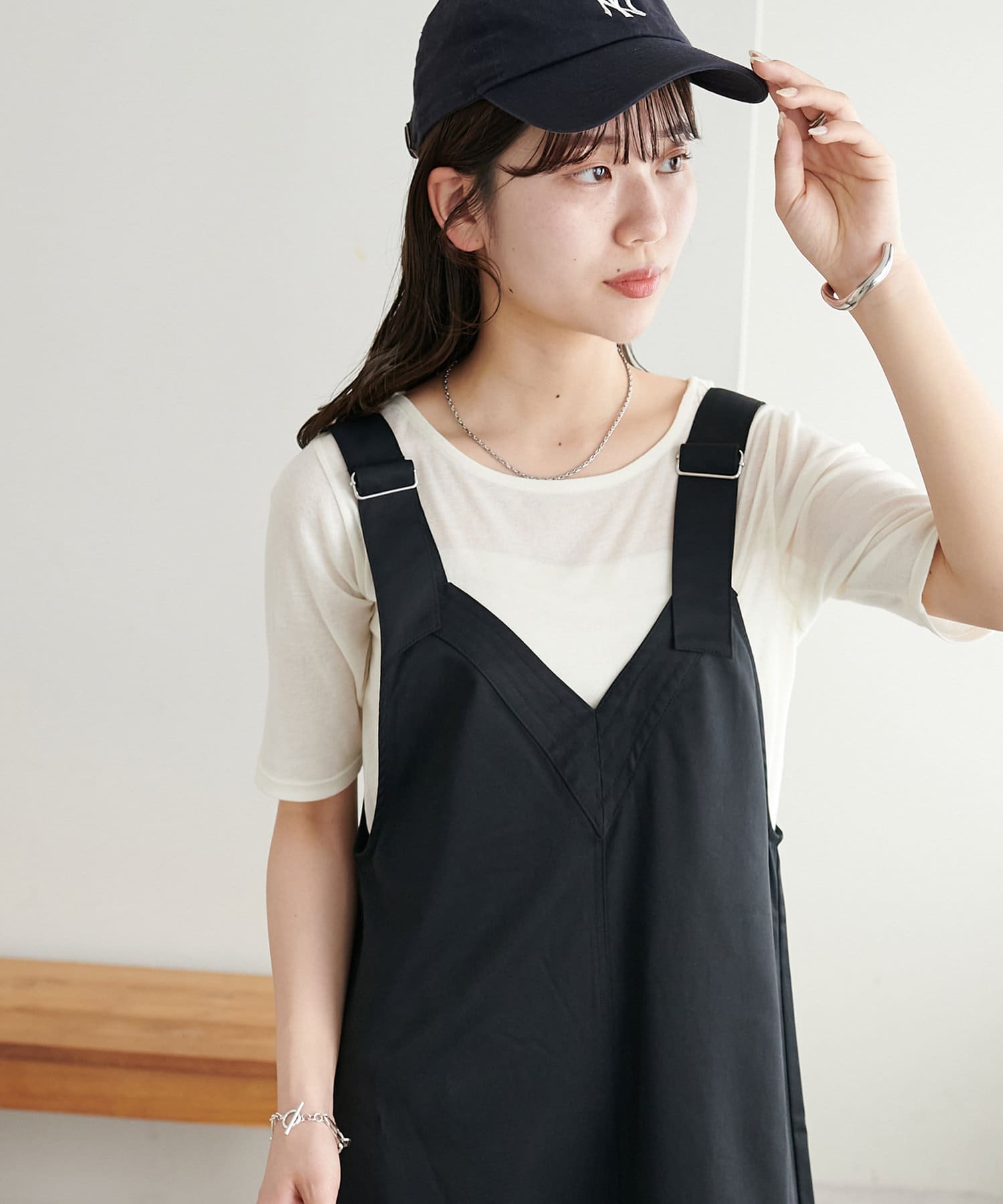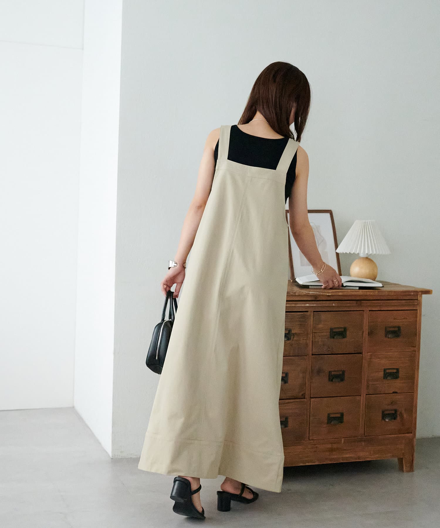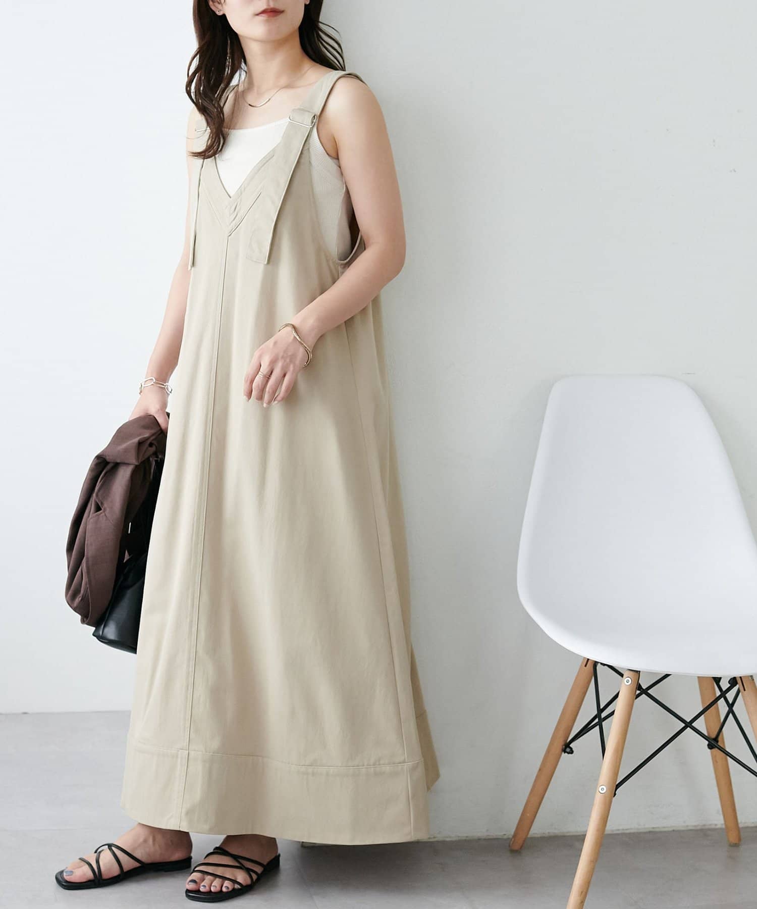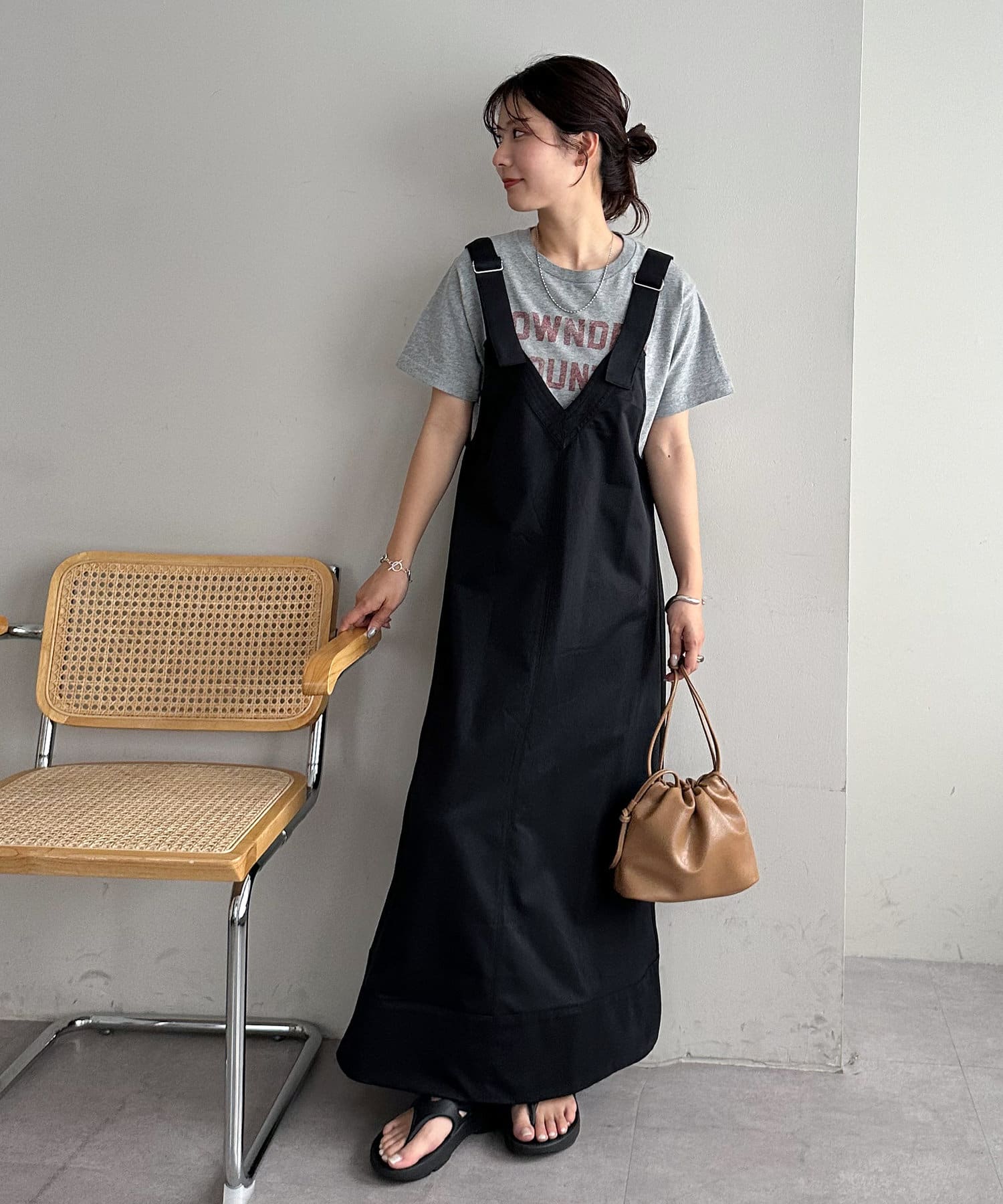 155cmスタッフ:肩紐のアジャスターで長さが調整できるので、小柄でもバランス良く着られました!裾が広がりすぎず、歩くとふわっと揺れる感じがかわいいです♡