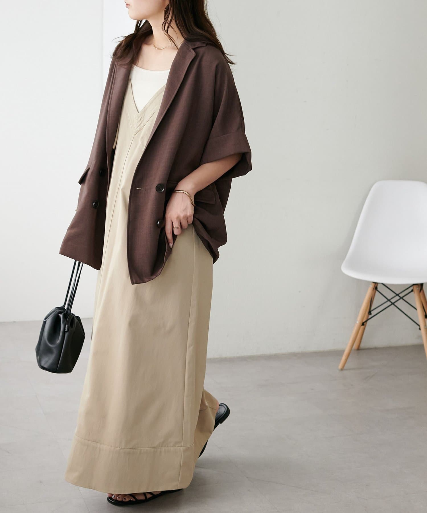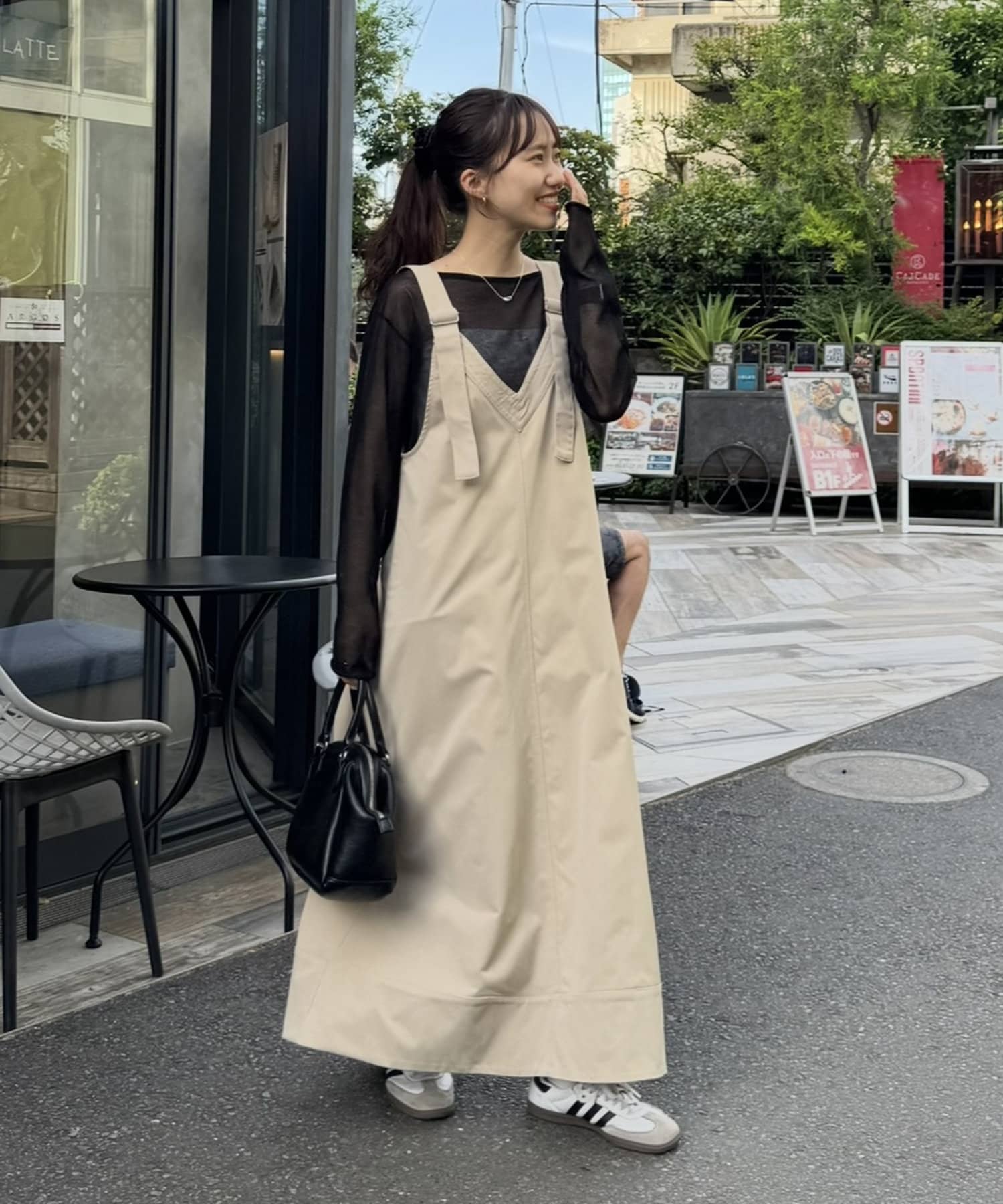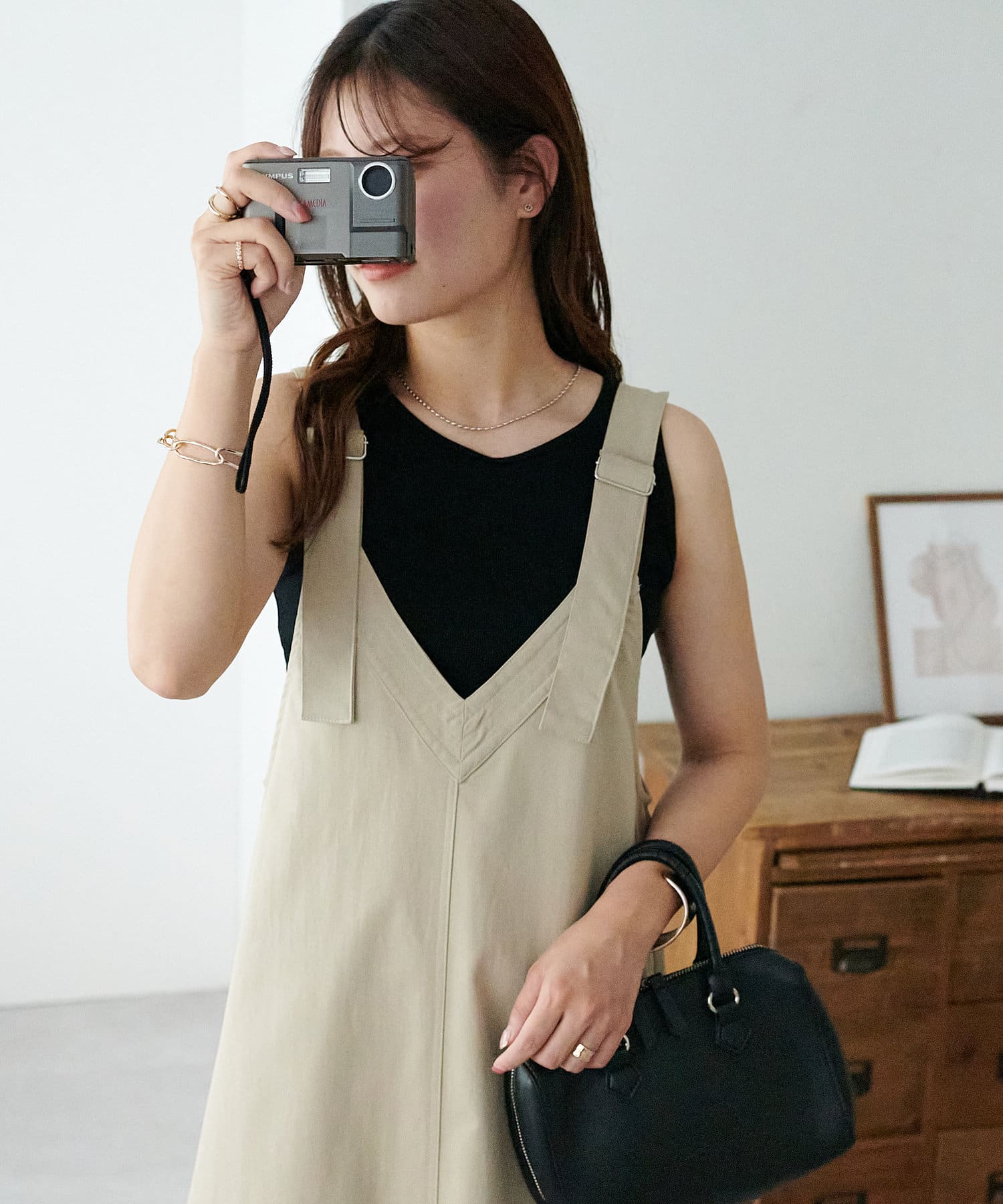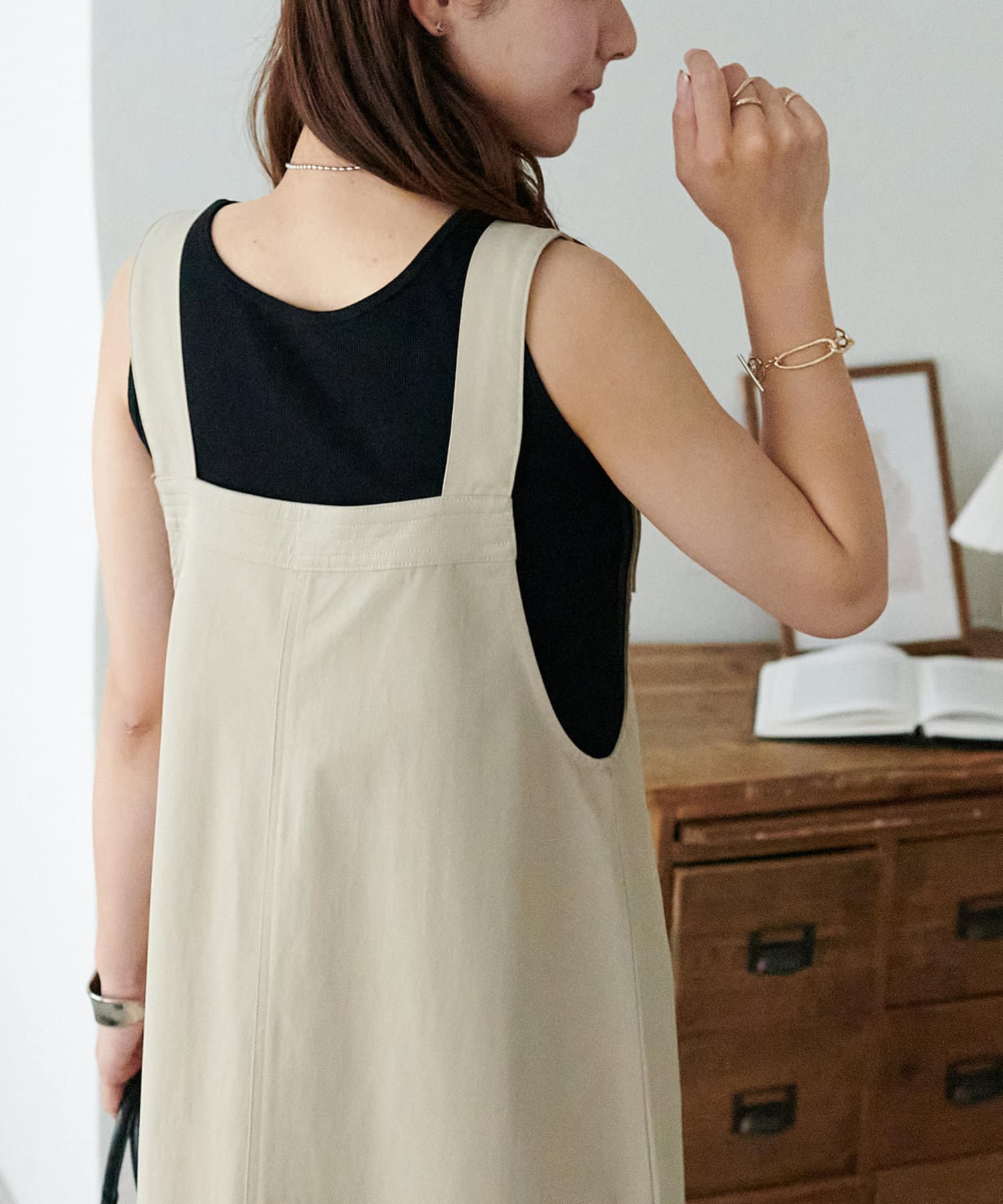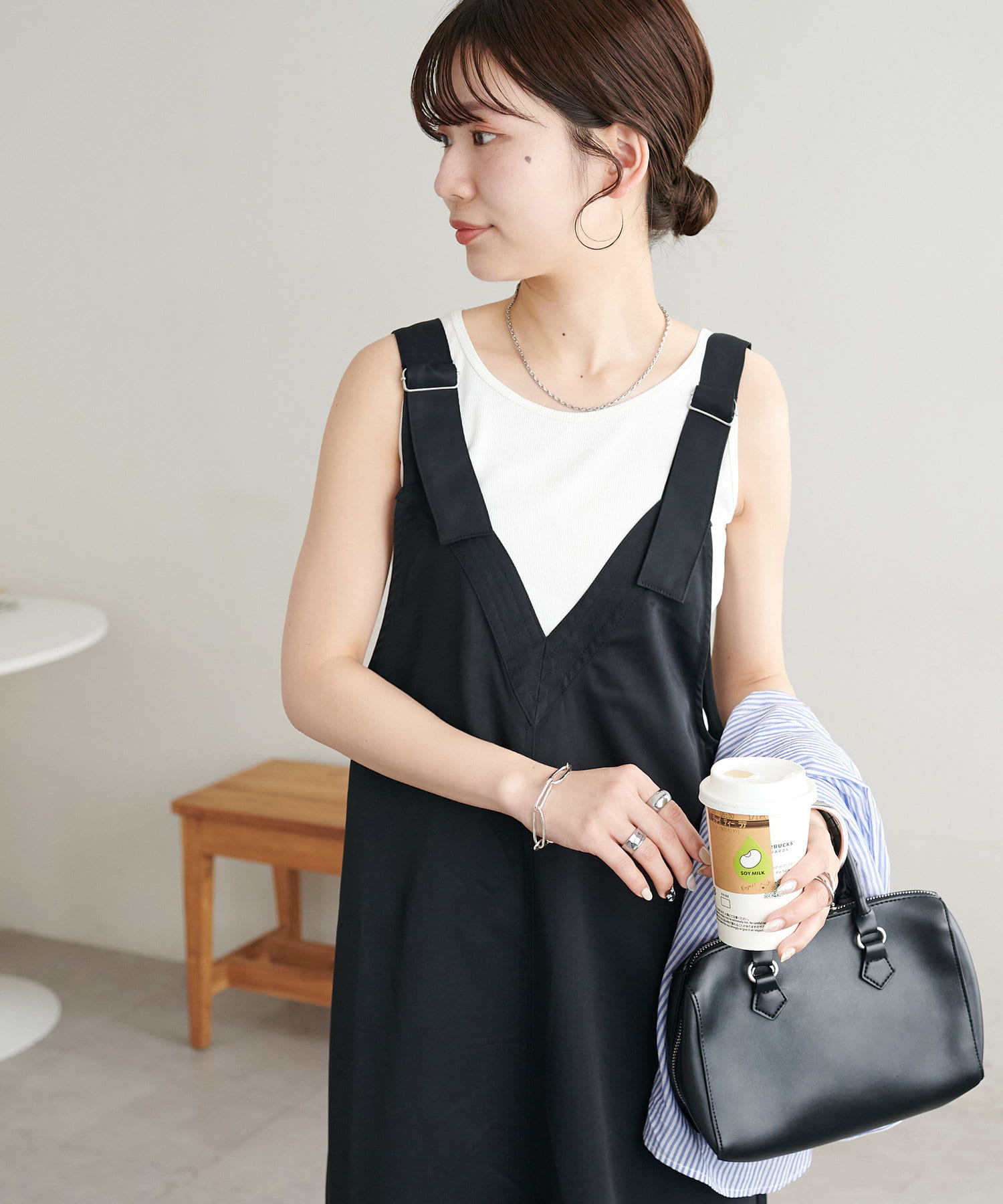 155cmスタッフ:肩紐のアジャスターで長さが調整できるので、小柄でもバランス良く着られました!裾が広がりすぎず、歩くとふわっと揺れる感じがかわいいです♡