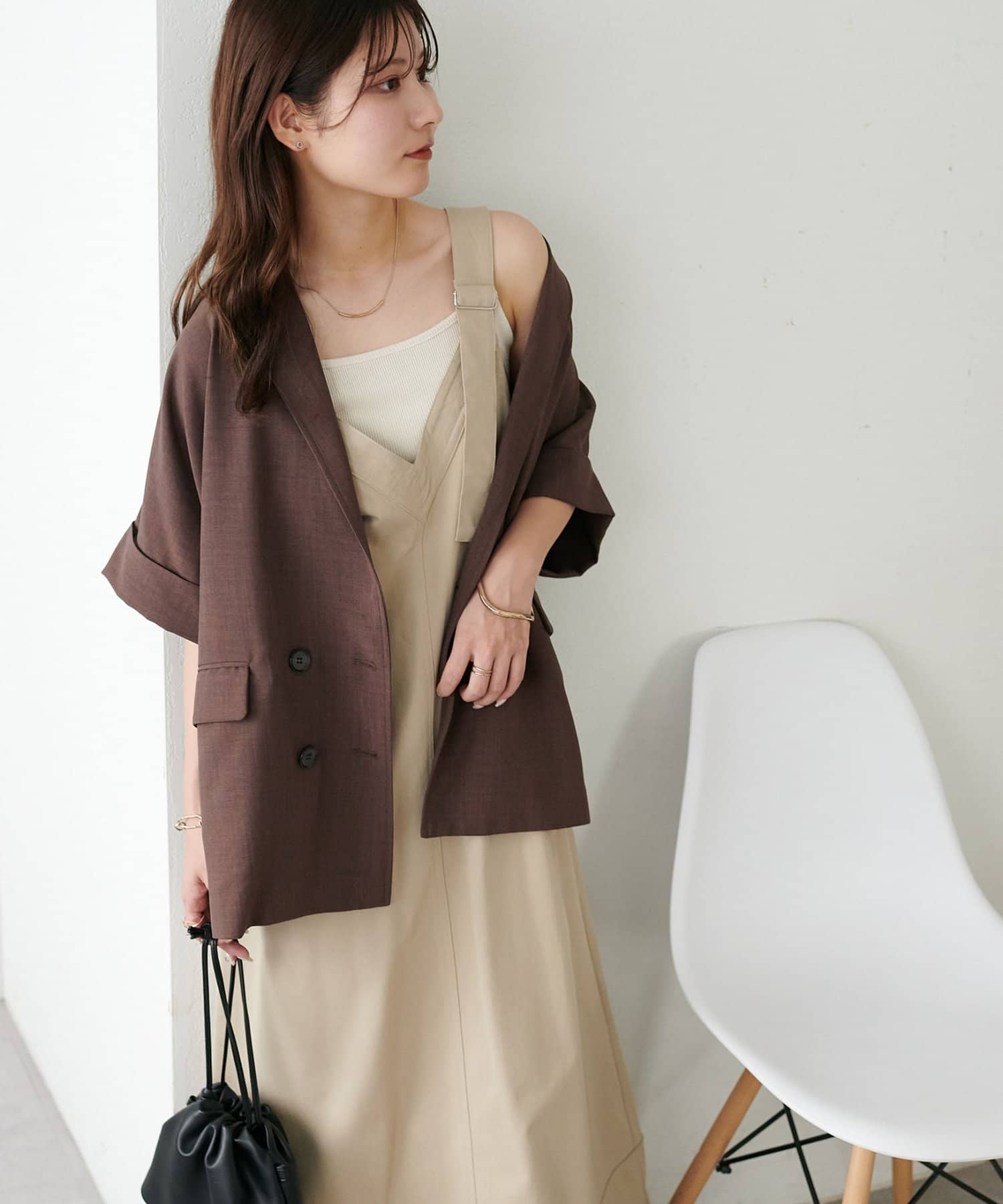 カットソーやタートル、シャツなど、どんなインナーとも合わせやすく、レイヤードスタイルに抜け感をプラスします。