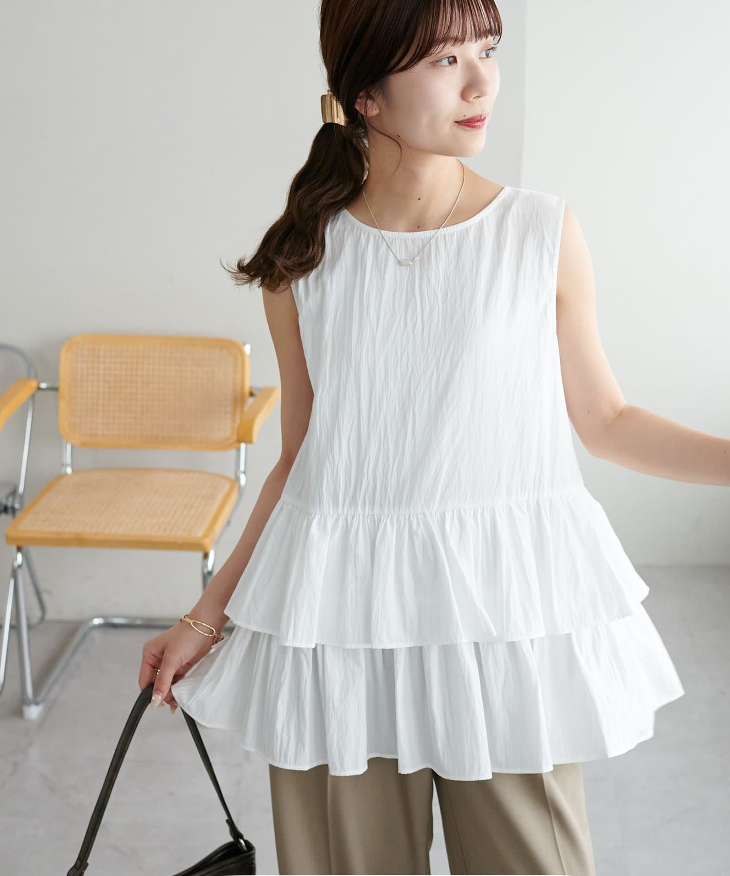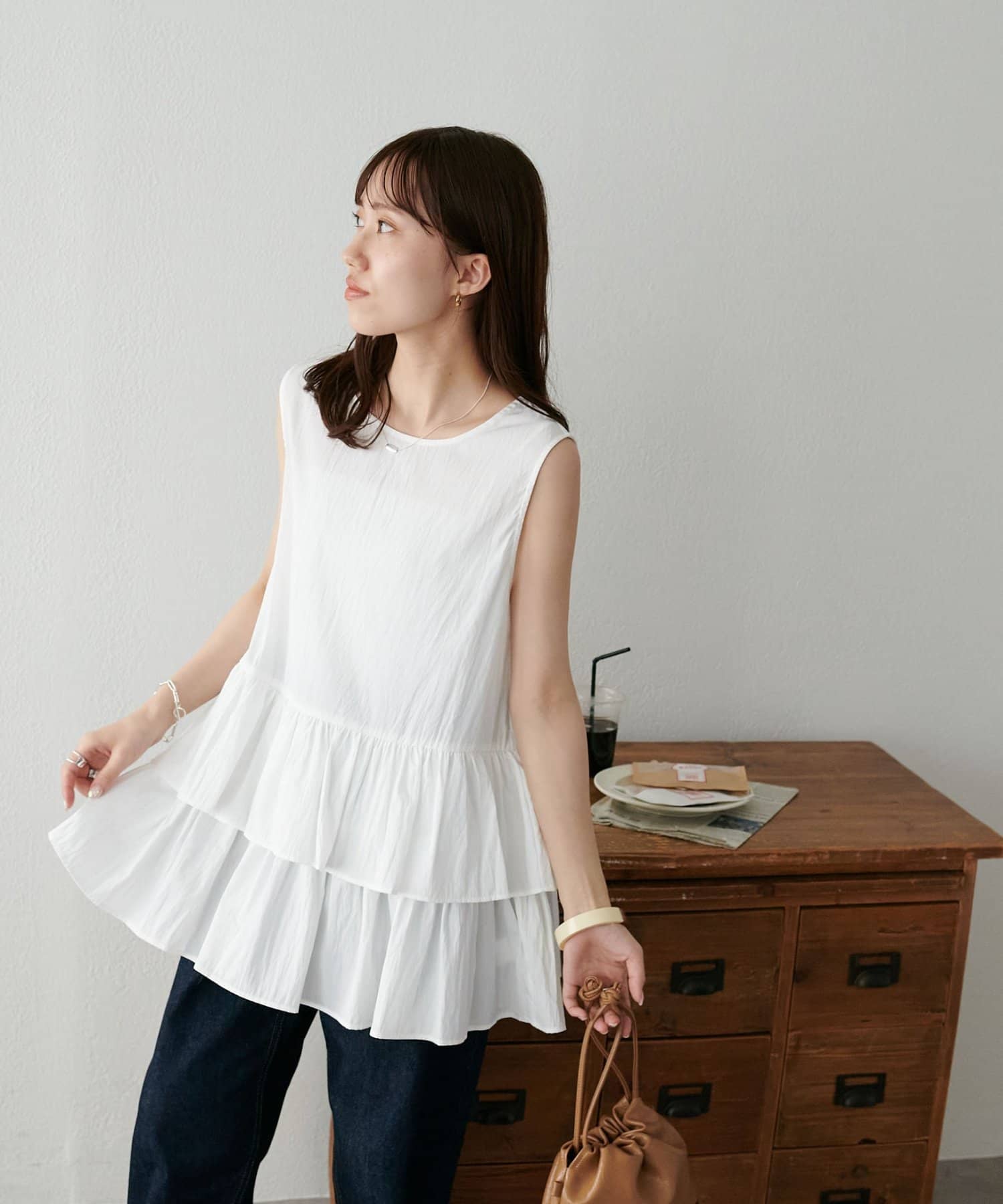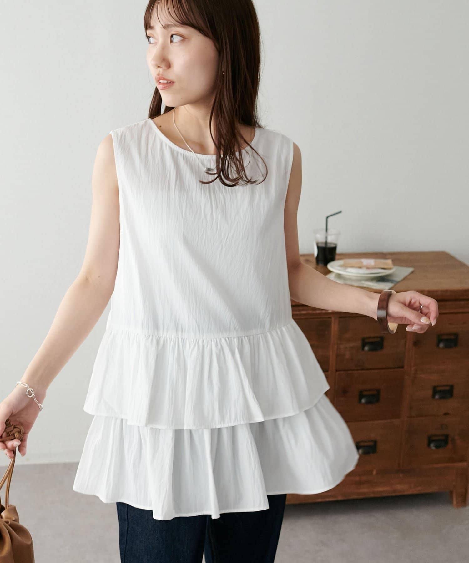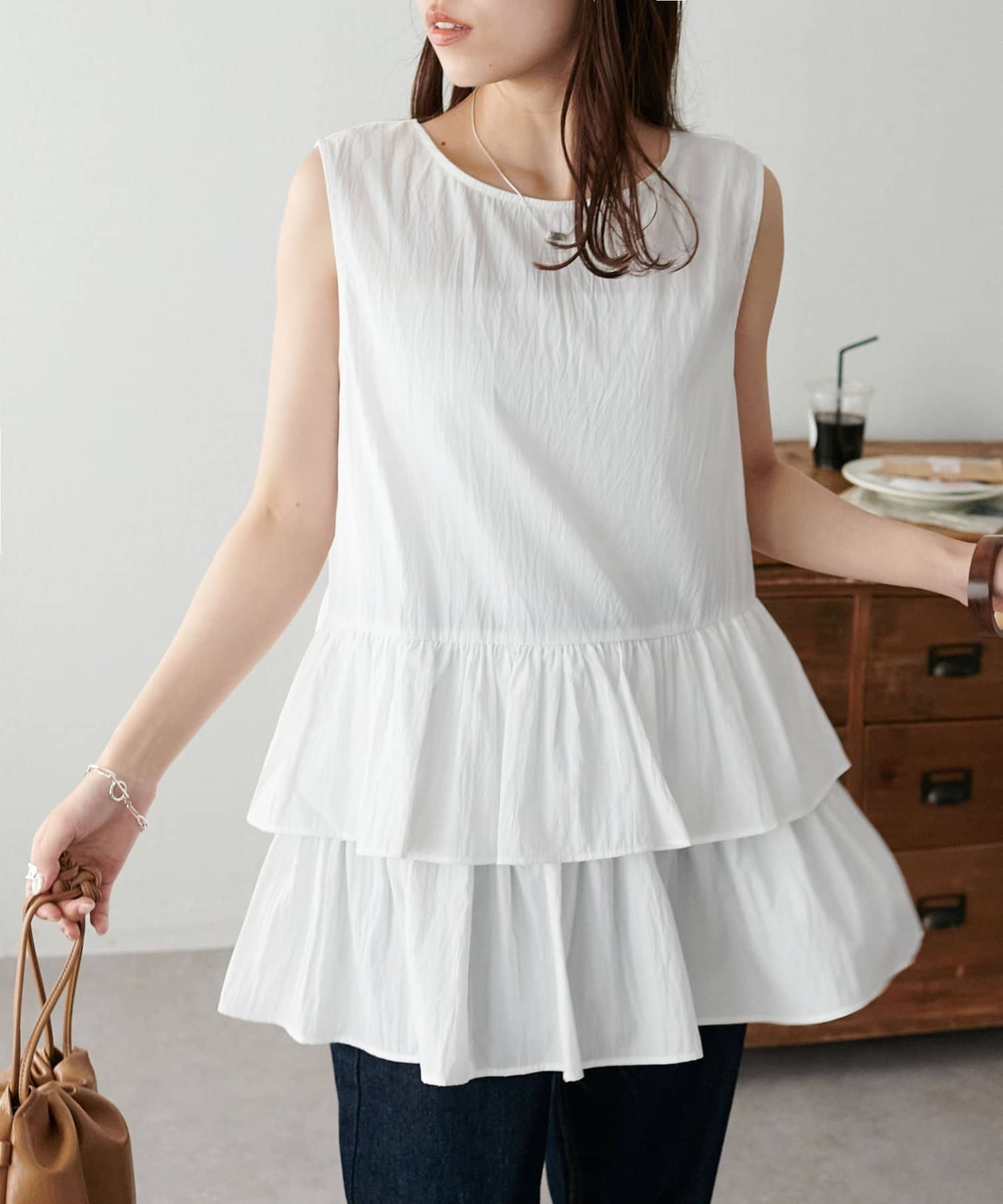 動きのあるティアードデザインが印象的な、ノースリブラウス。
