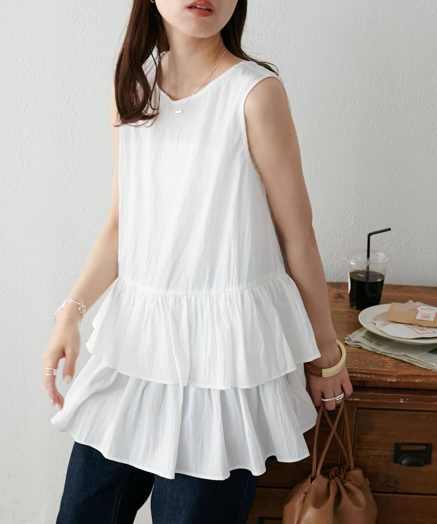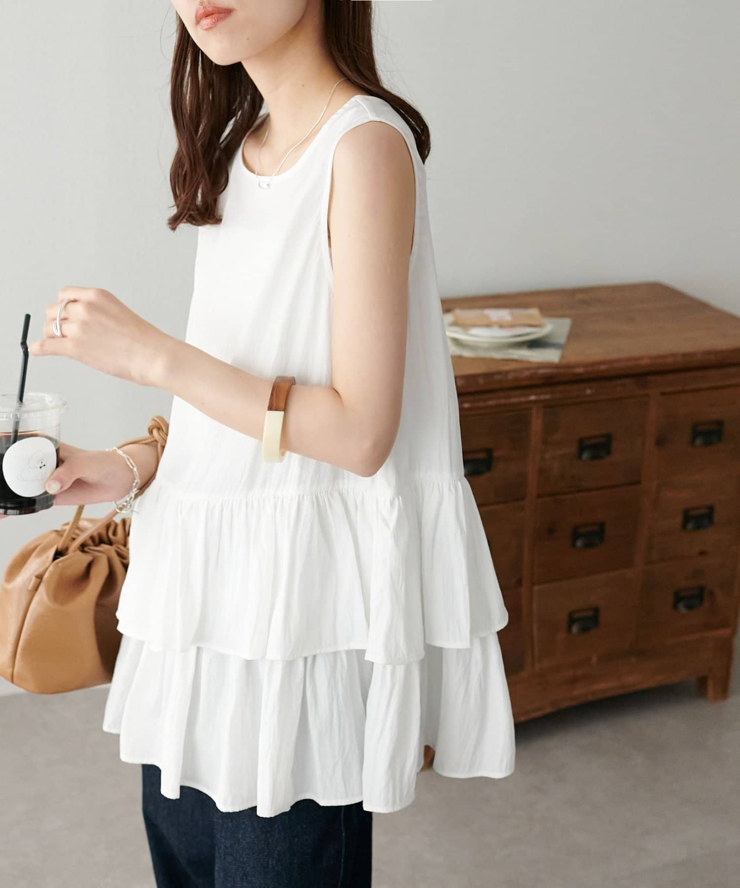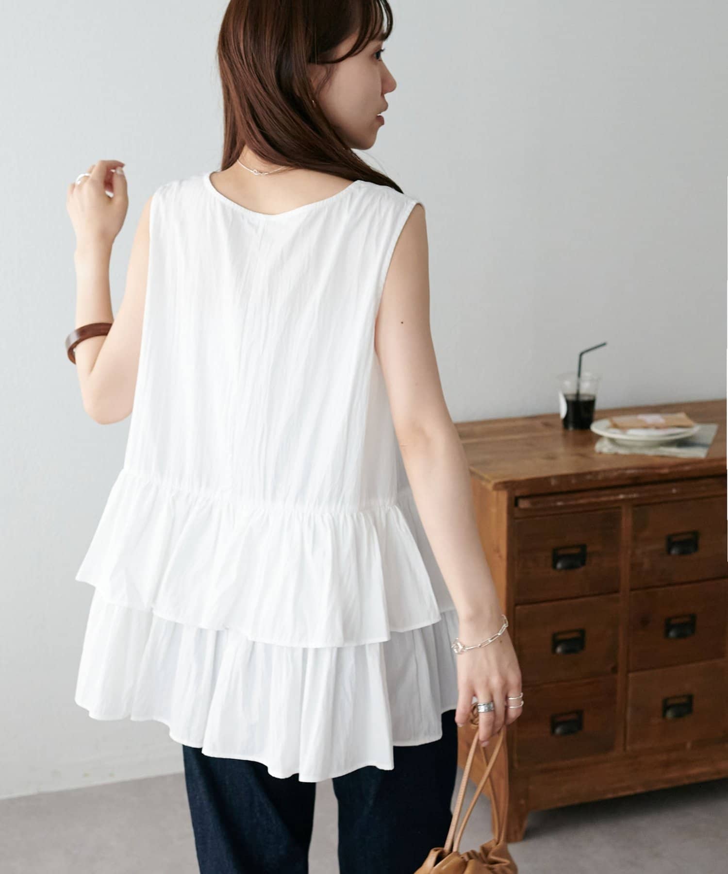 動きのあるティアードデザインが印象的な、ノースリブラウス。