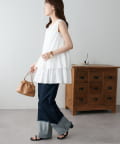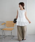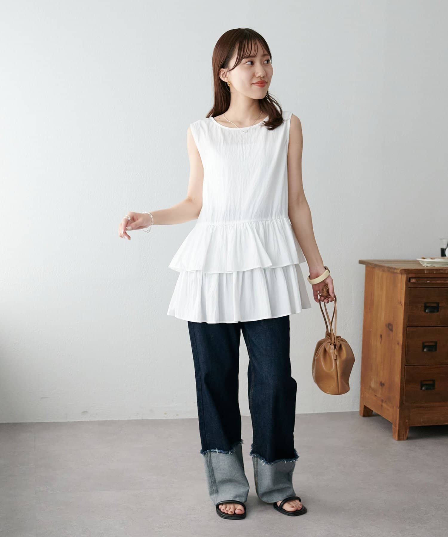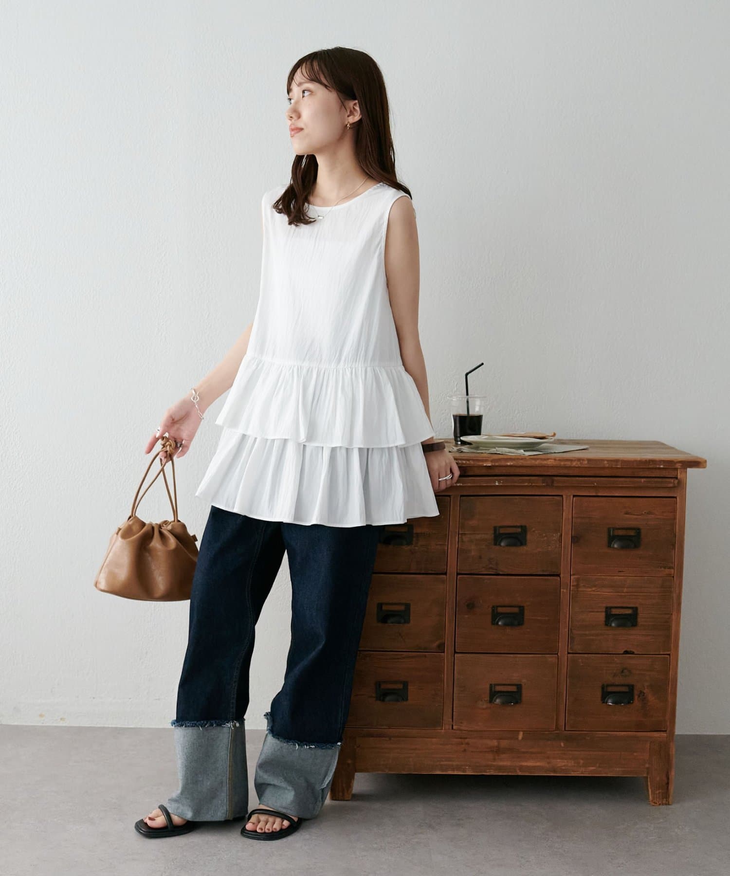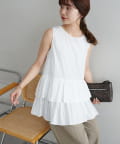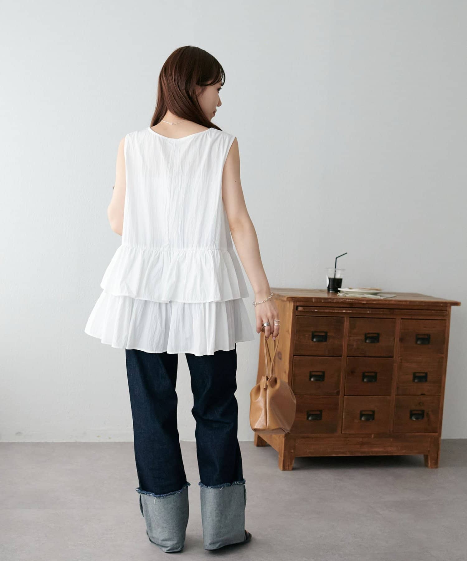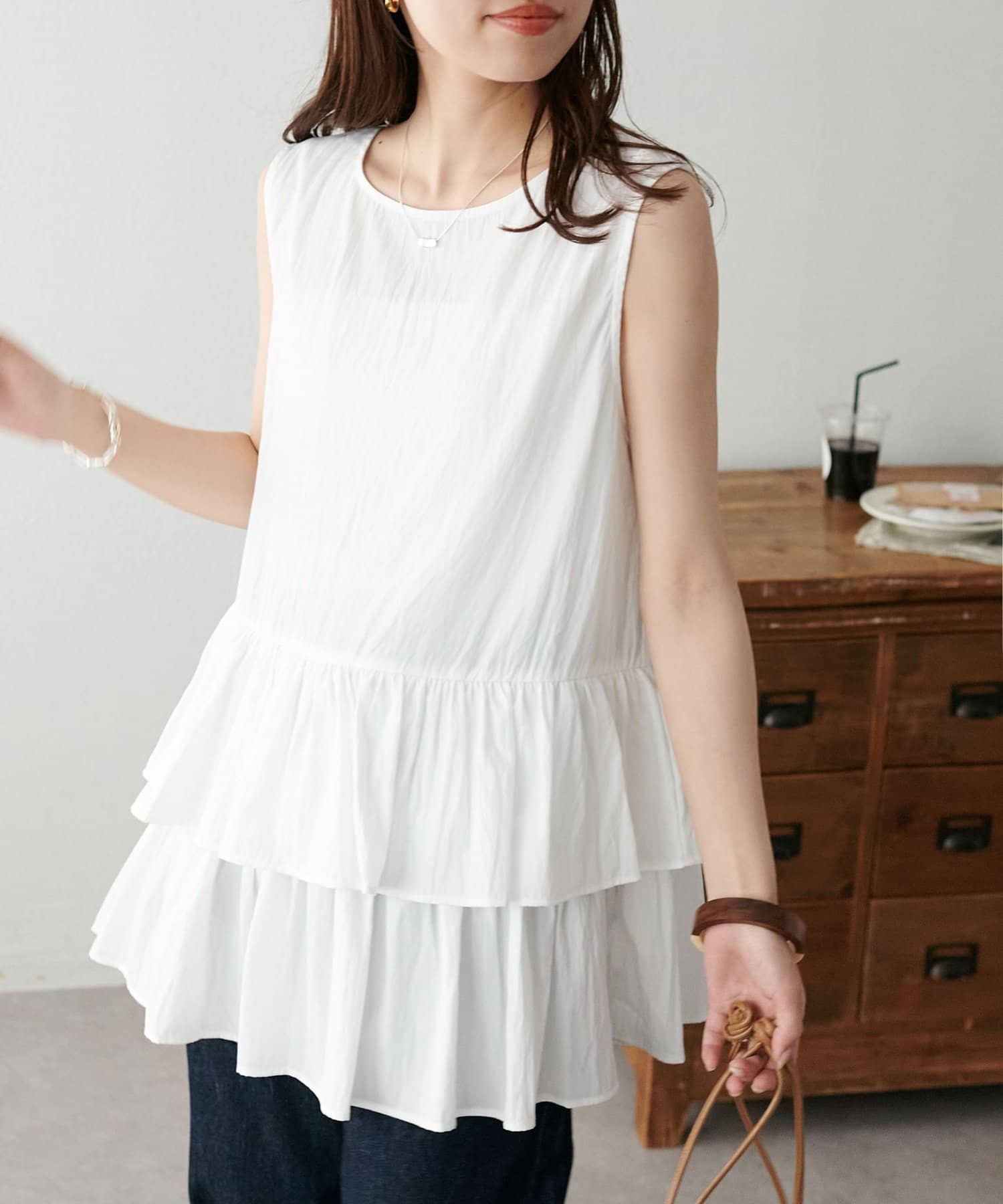 動きのあるティアードデザインが印象的な、ノースリブラウス。