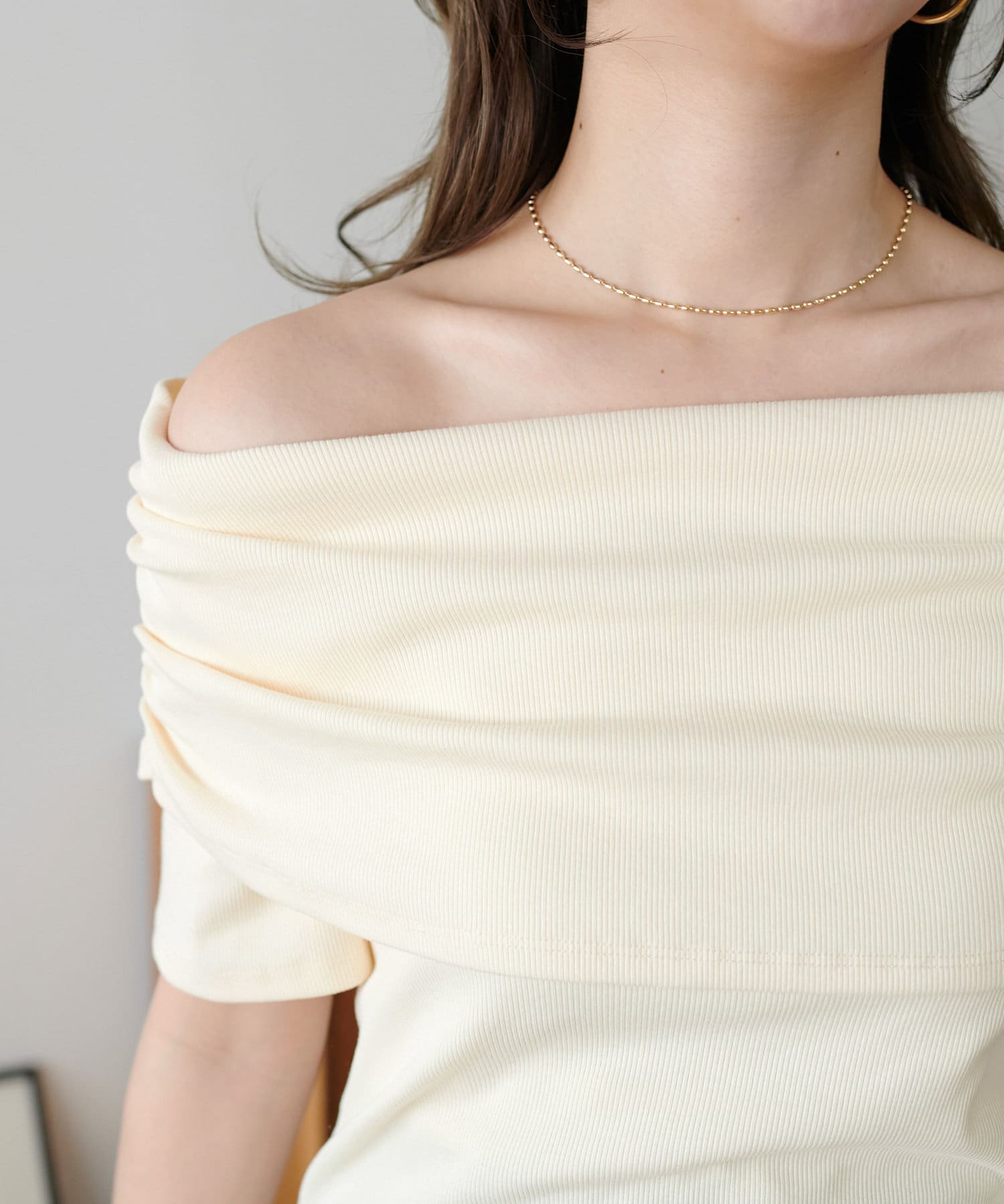 デコルテラインをきれいに見せてくれるワイドなオフショルデザインで、女性らしさを引き立てる1枚。
