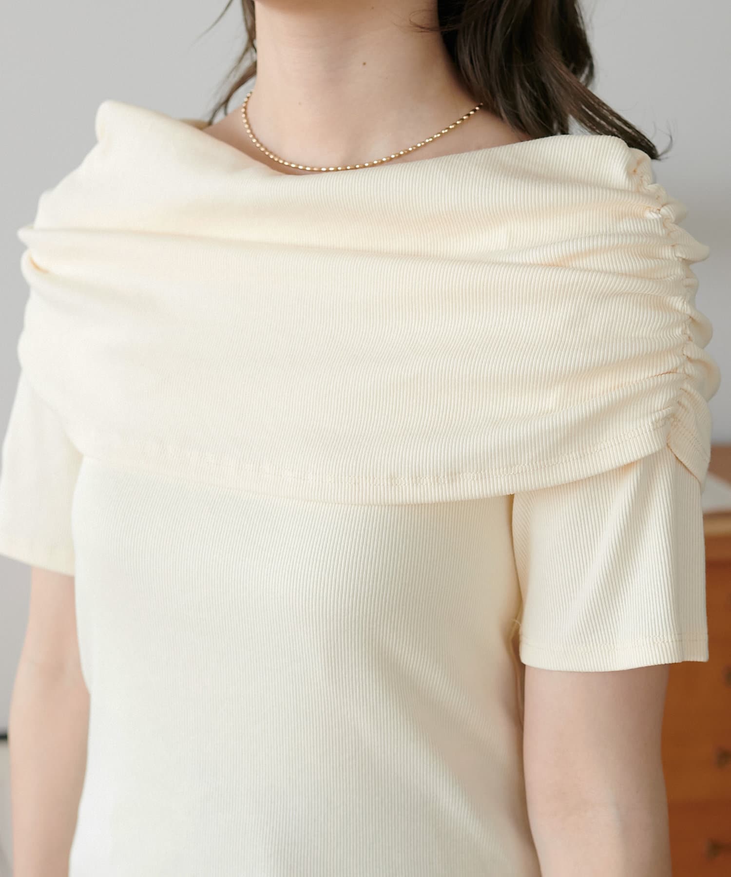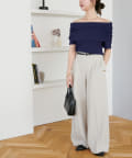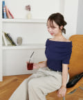 デコルテラインをきれいに見せてくれるワイドなオフショルデザインで、女性らしさを引き立てる1枚。