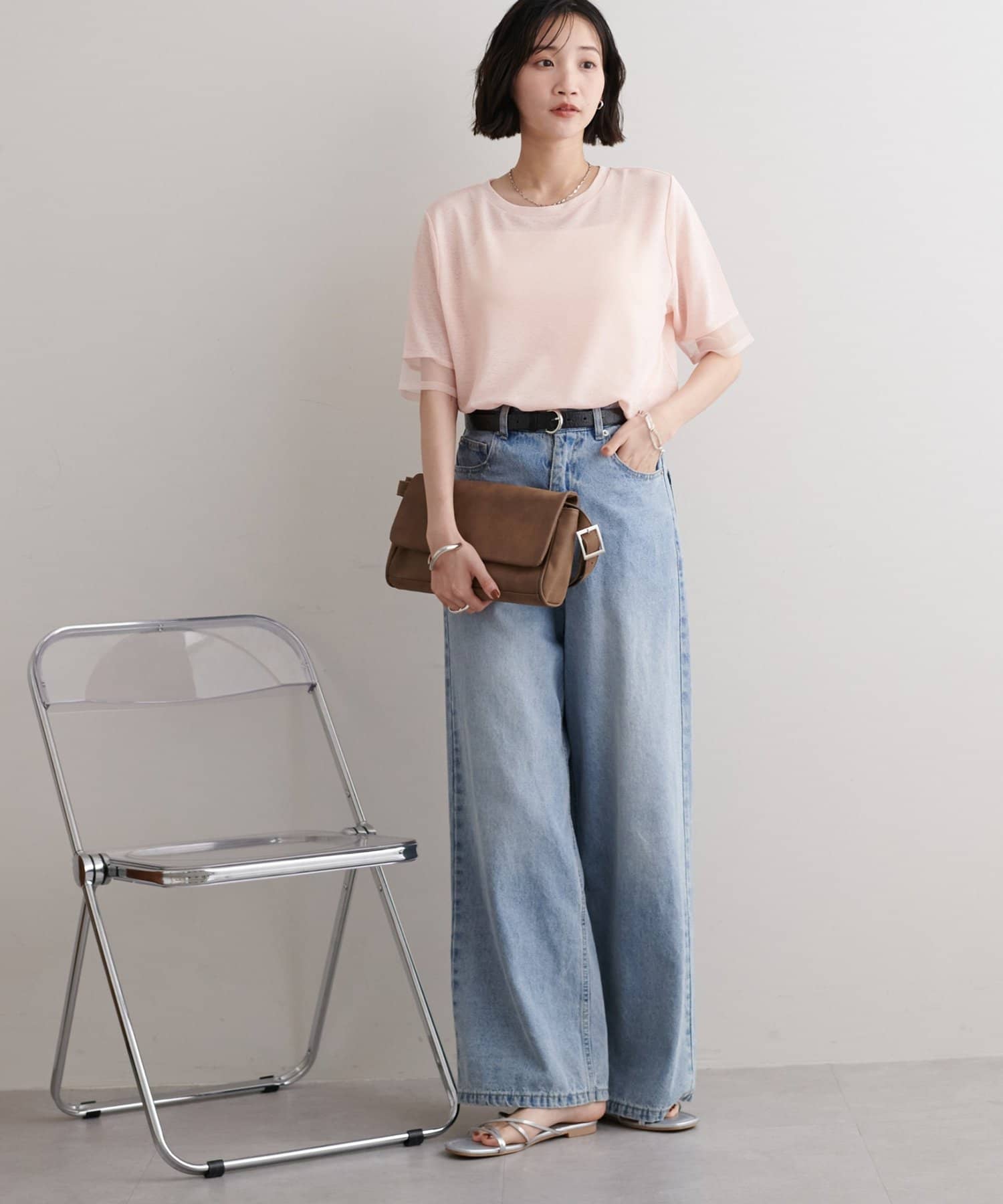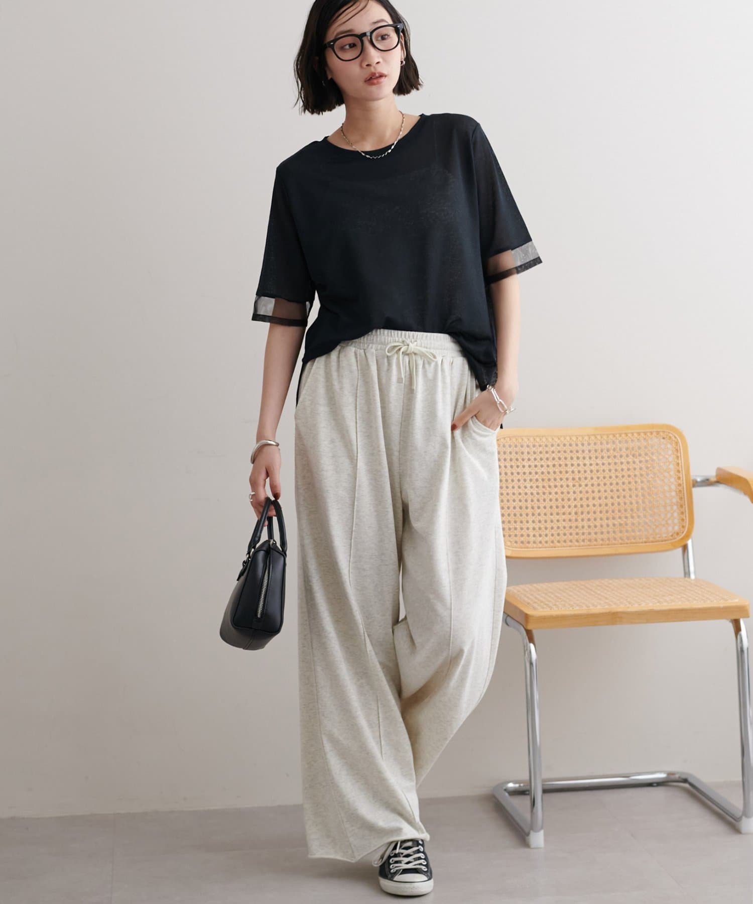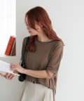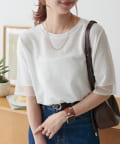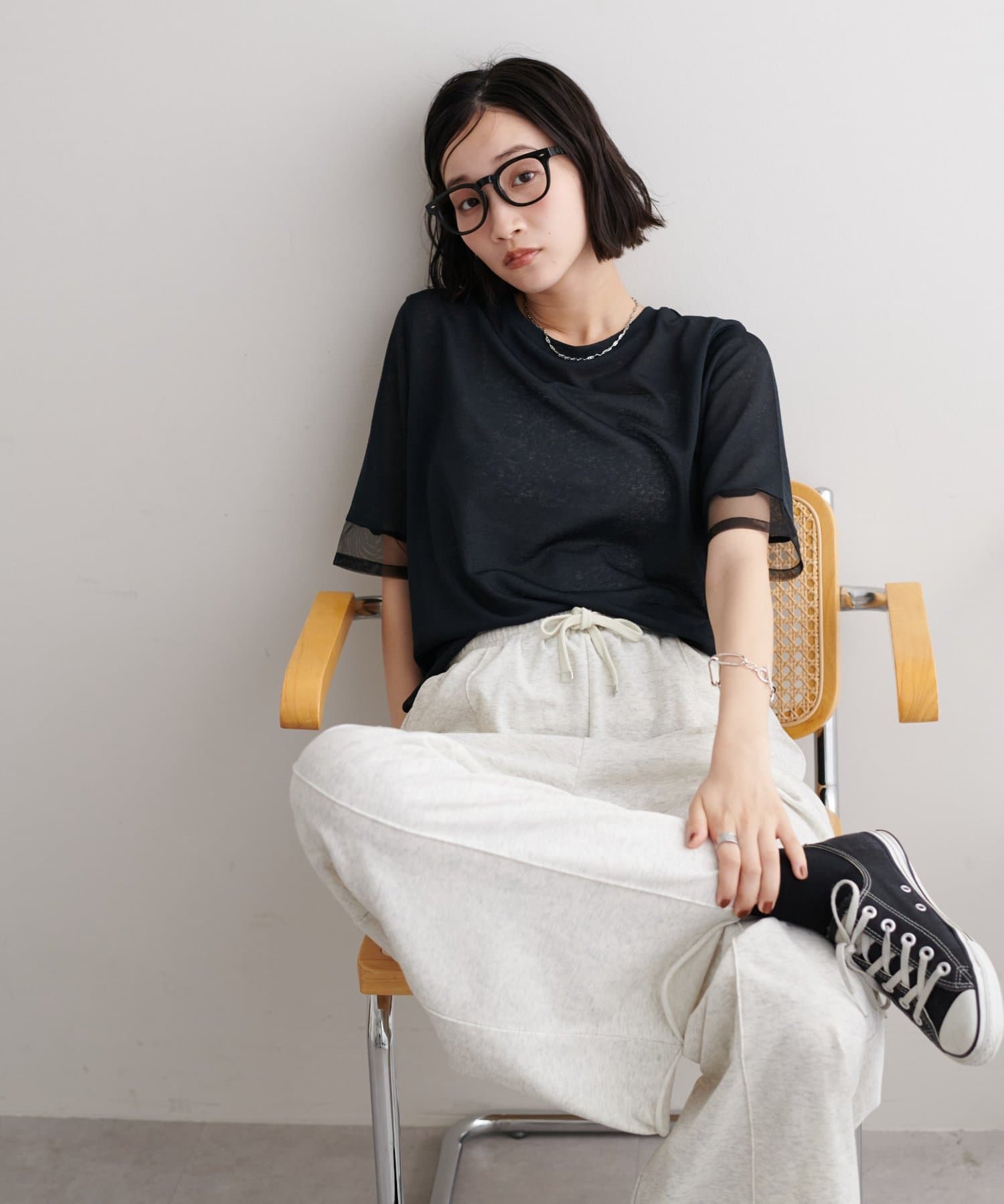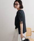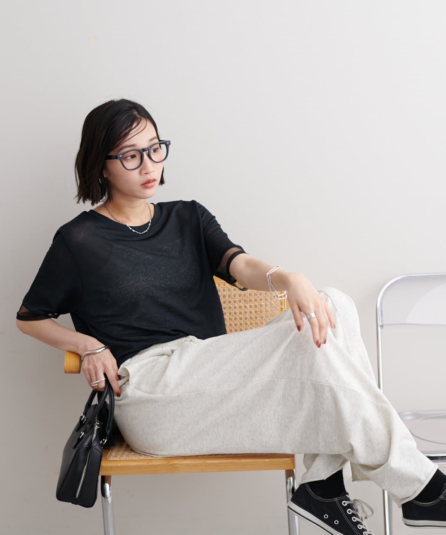 155cmスタッフ:シンプルだけど一枚でおしゃれに見える、袖の切替えデザインが魅力です。袖がシアーなので見た目も涼しく、春夏にぴったり!