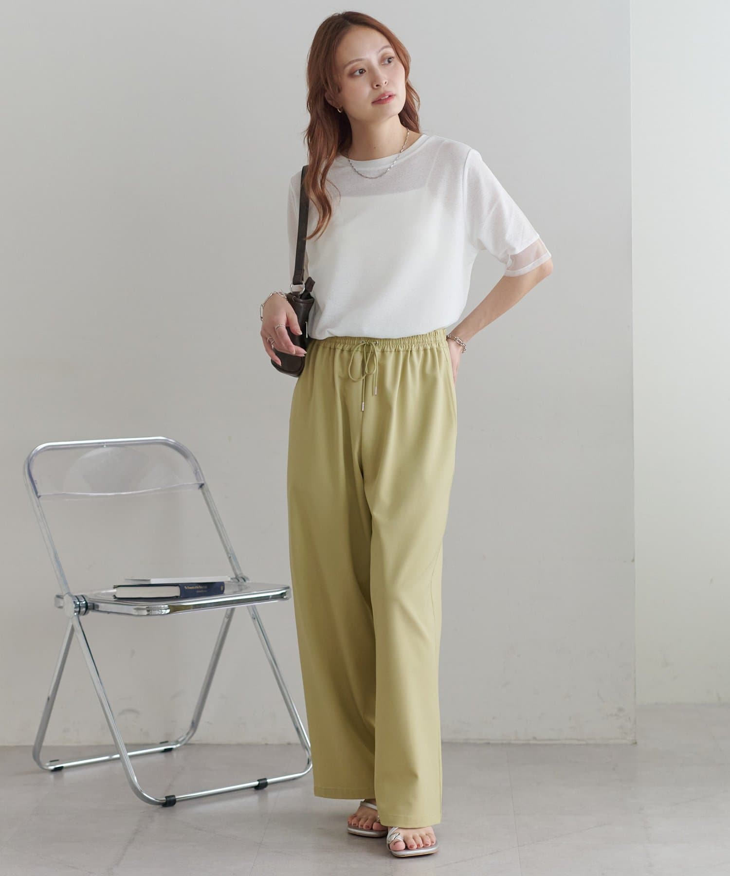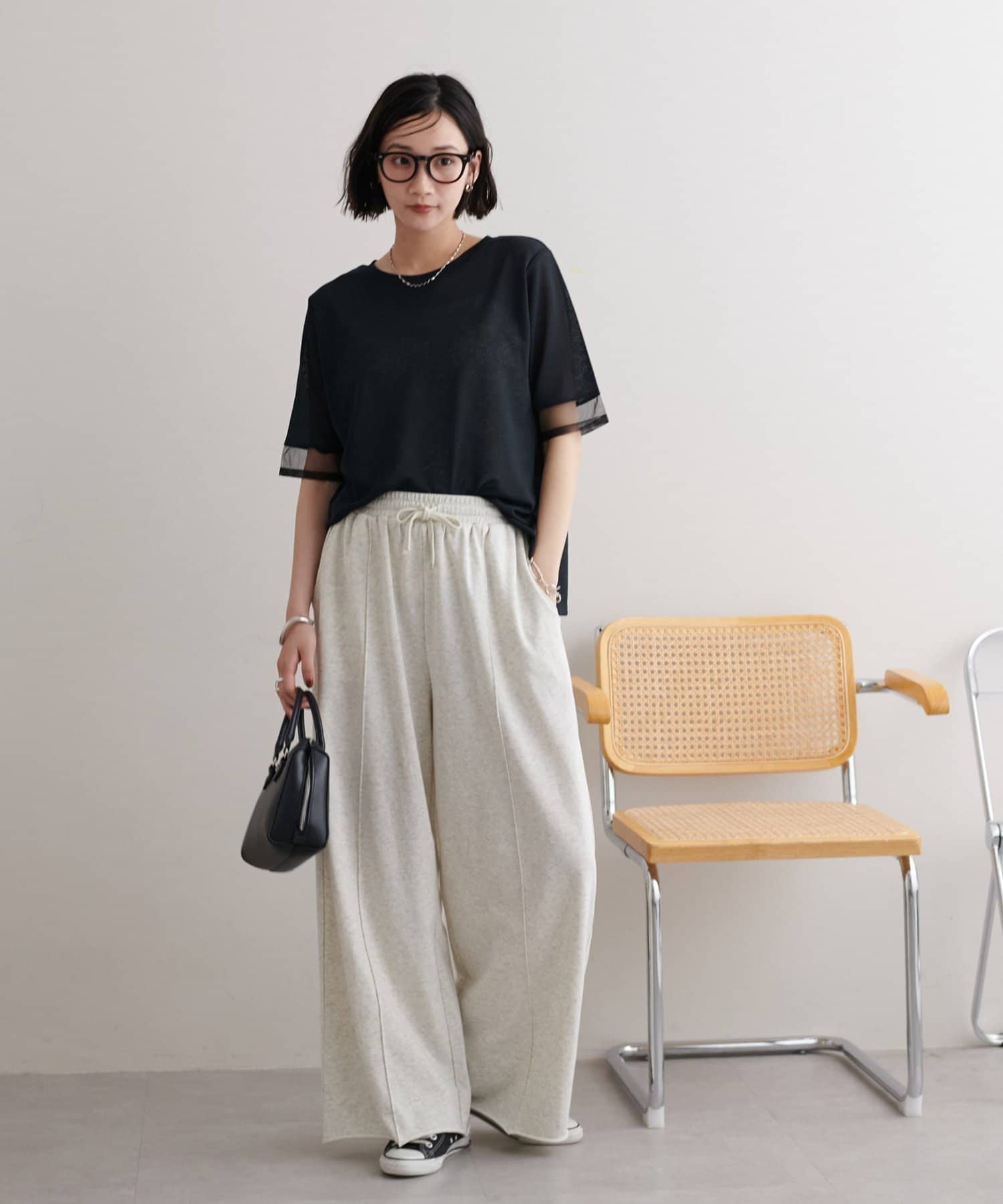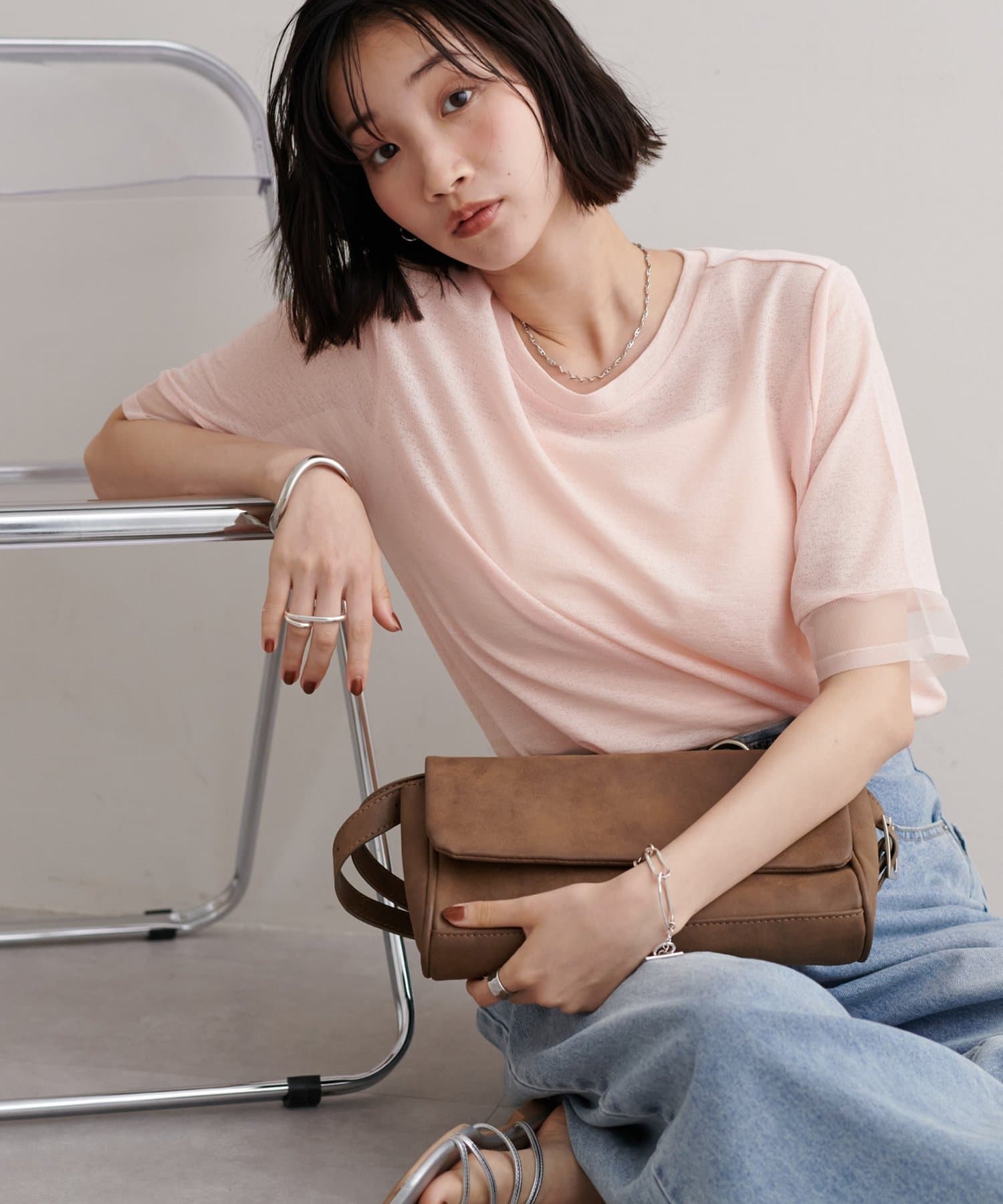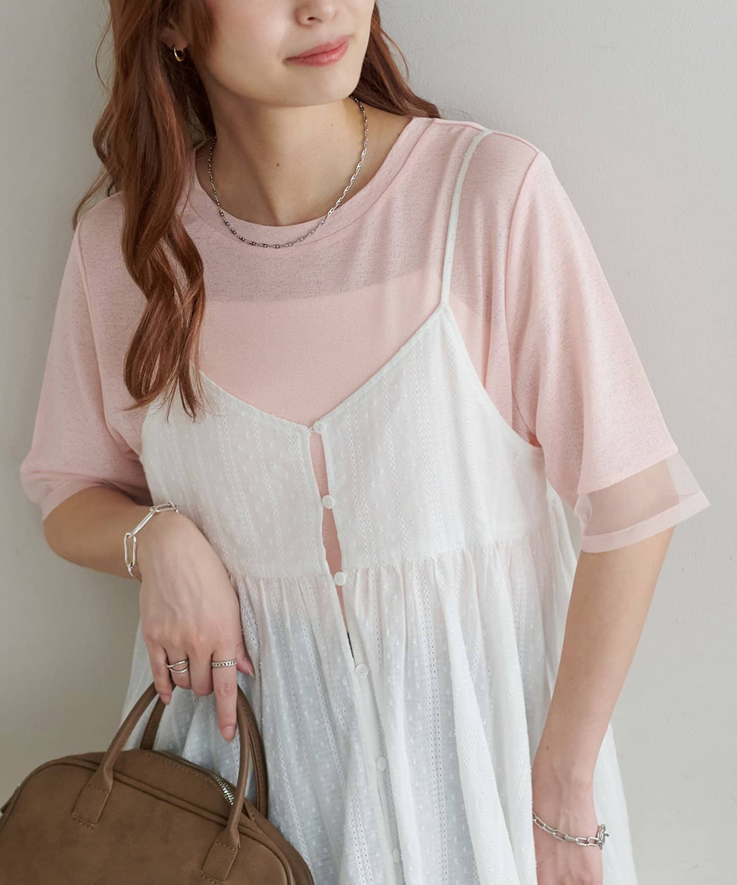 155cmスタッフ:シンプルだけど一枚でおしゃれに見える、袖の切替えデザインが魅力です。袖がシアーなので見た目も涼しく、春夏にぴったり!