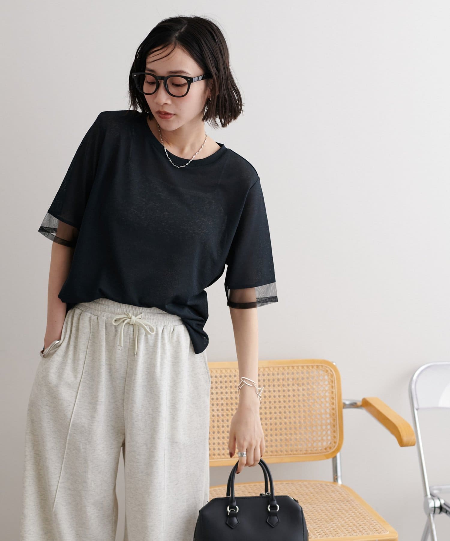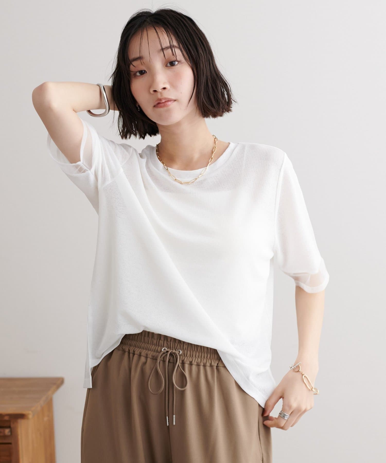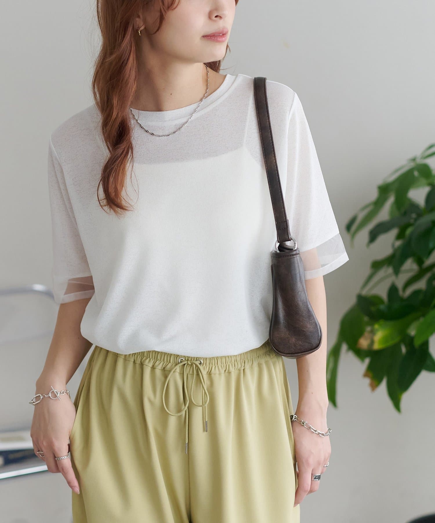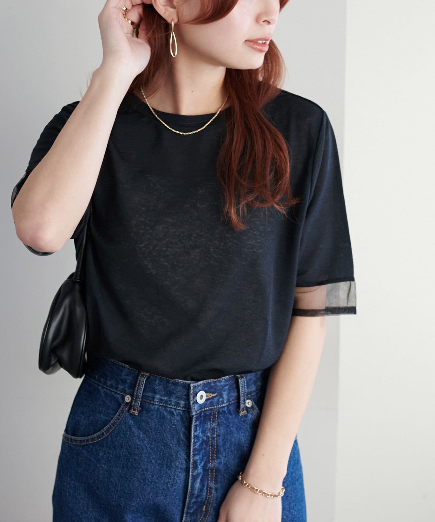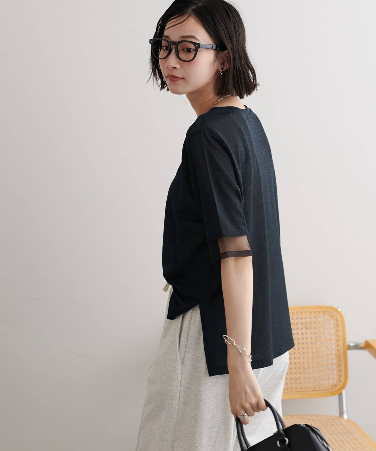 【万能トップス/毎年大人気】シアー袖切替5分袖Tシャツ