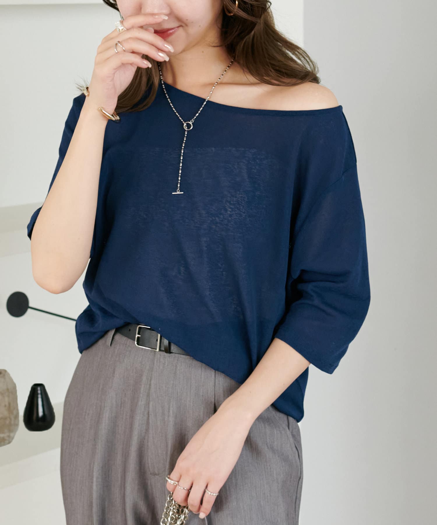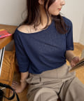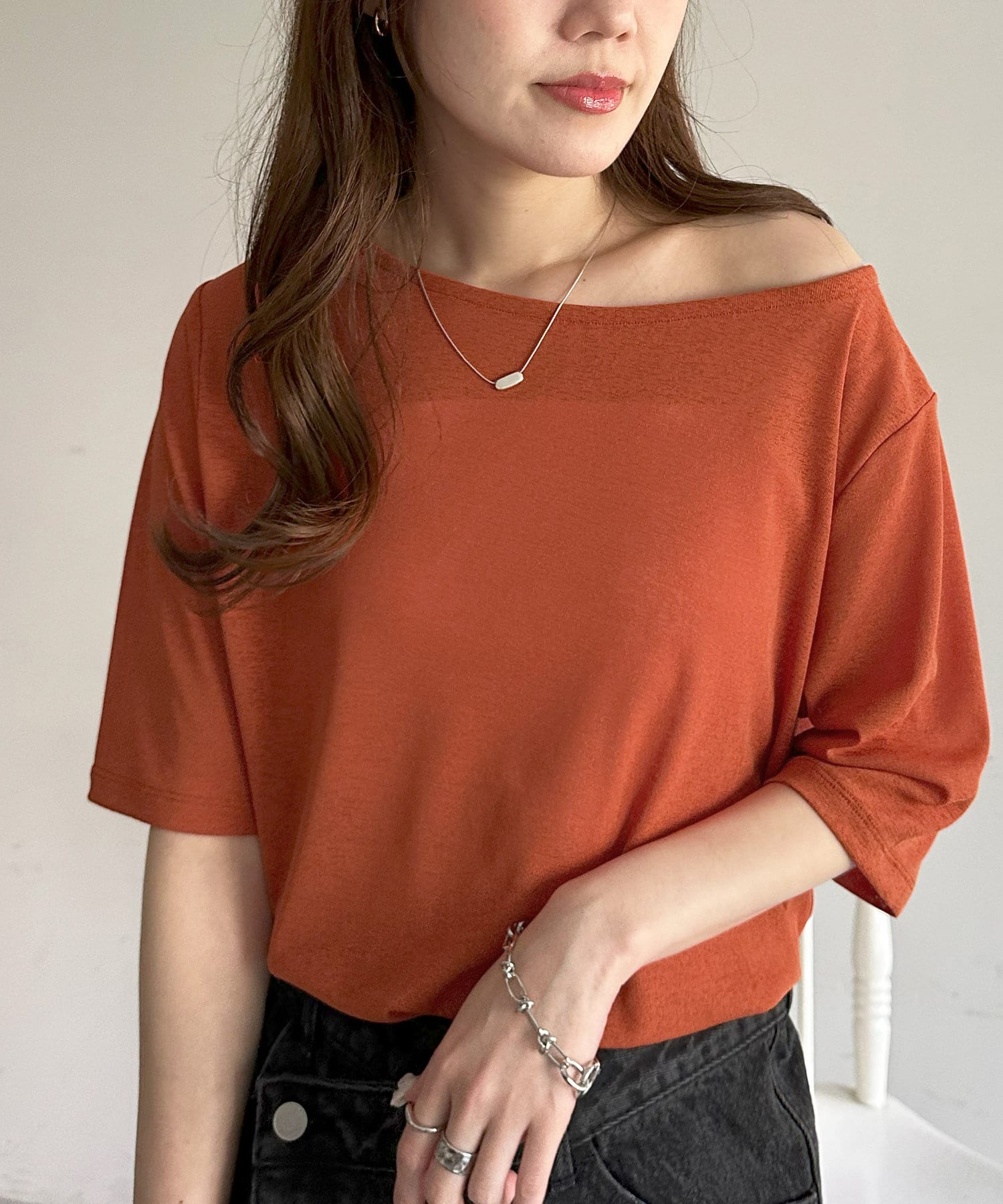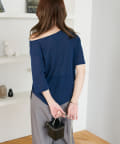 シンプルな中に女性らしい抜け感をプラスした、ワンショルダーのデザインが魅力の5分袖トップス。