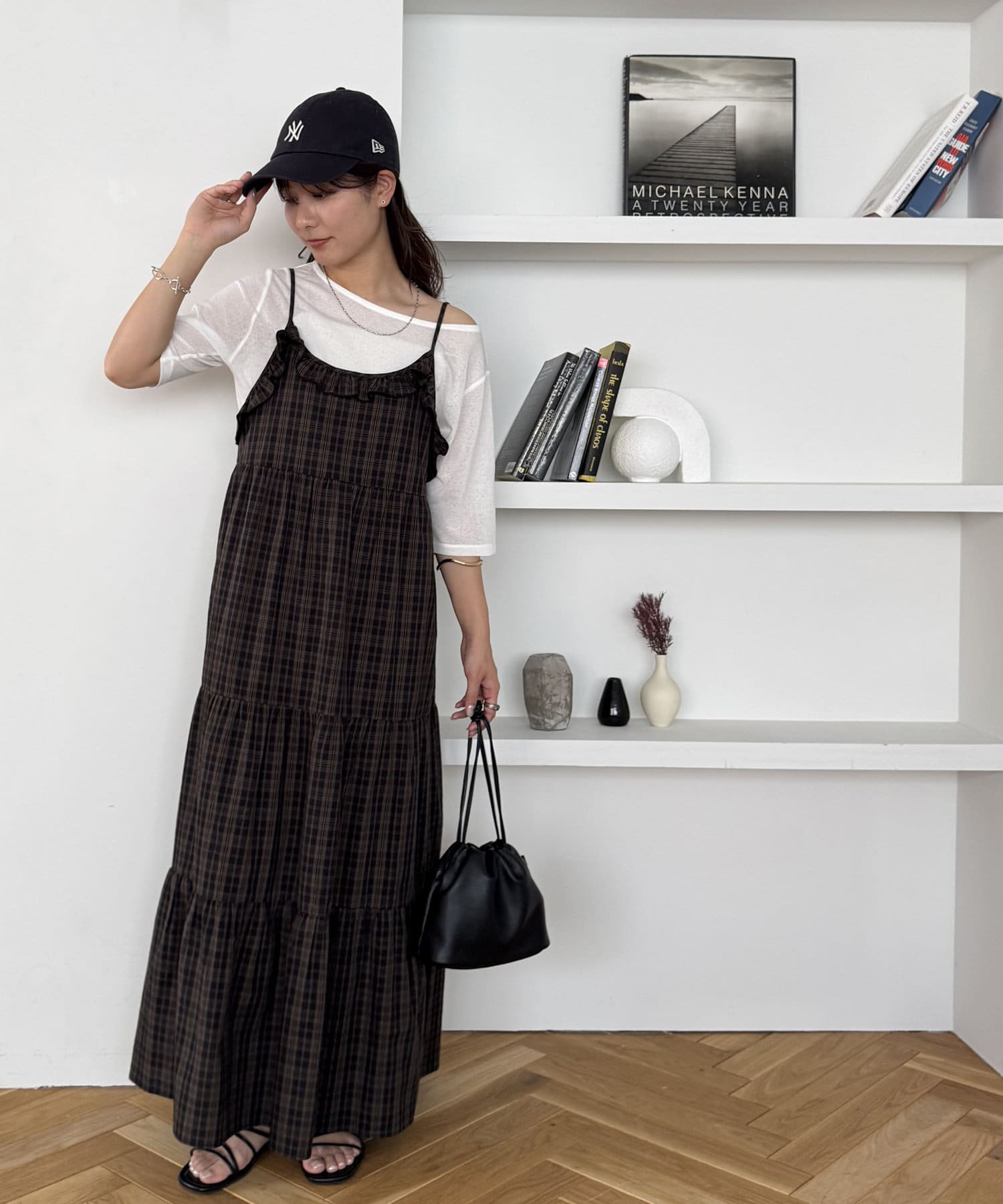 フレアスカートやキャミワンピースと合わせてフェミニンスタイルにも。