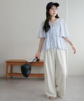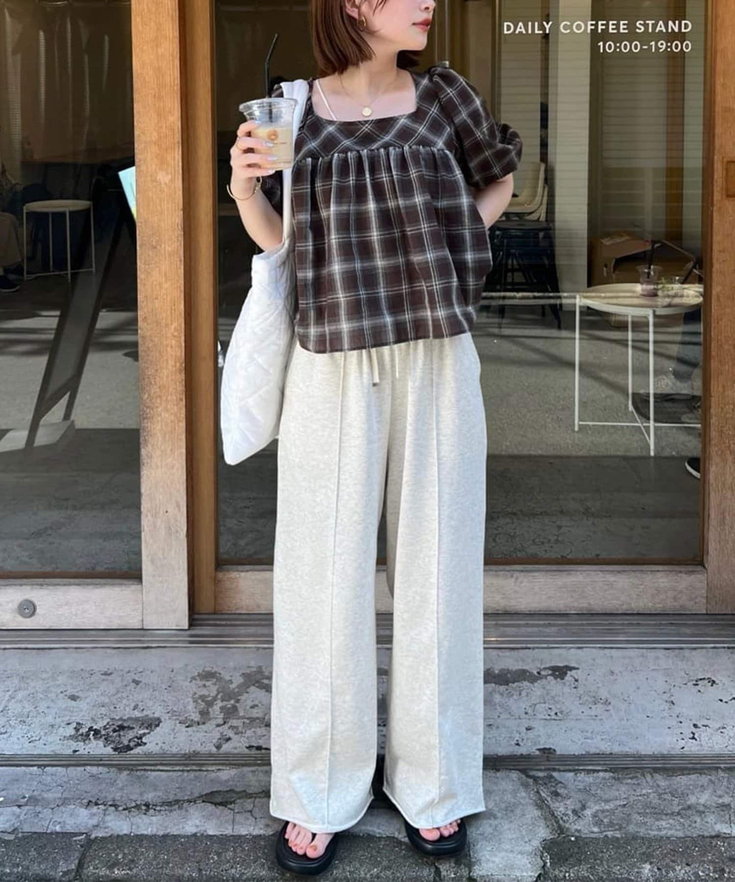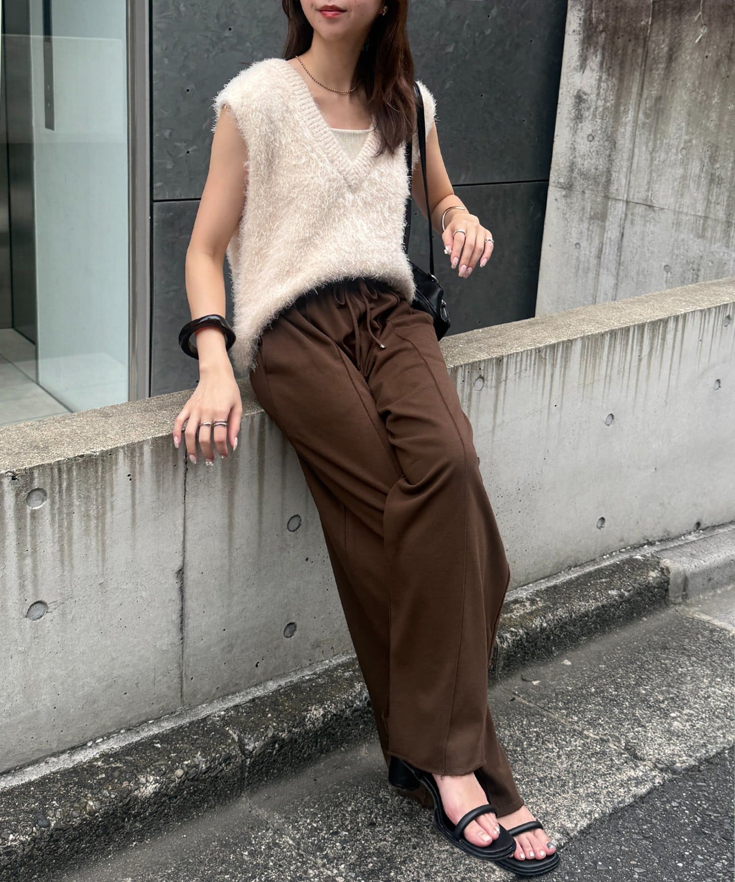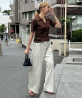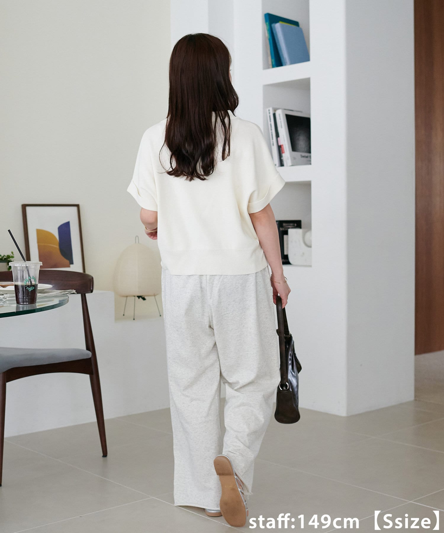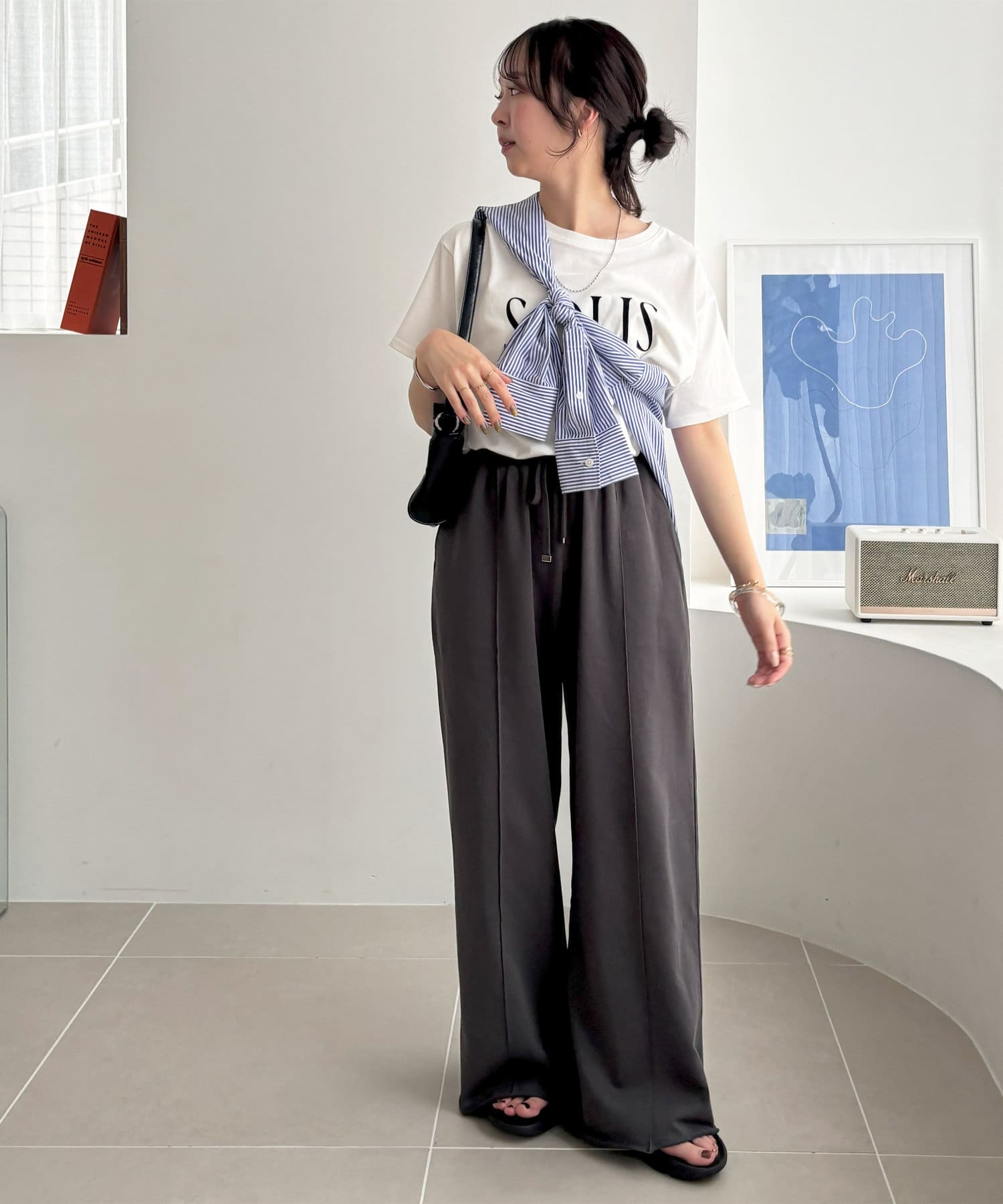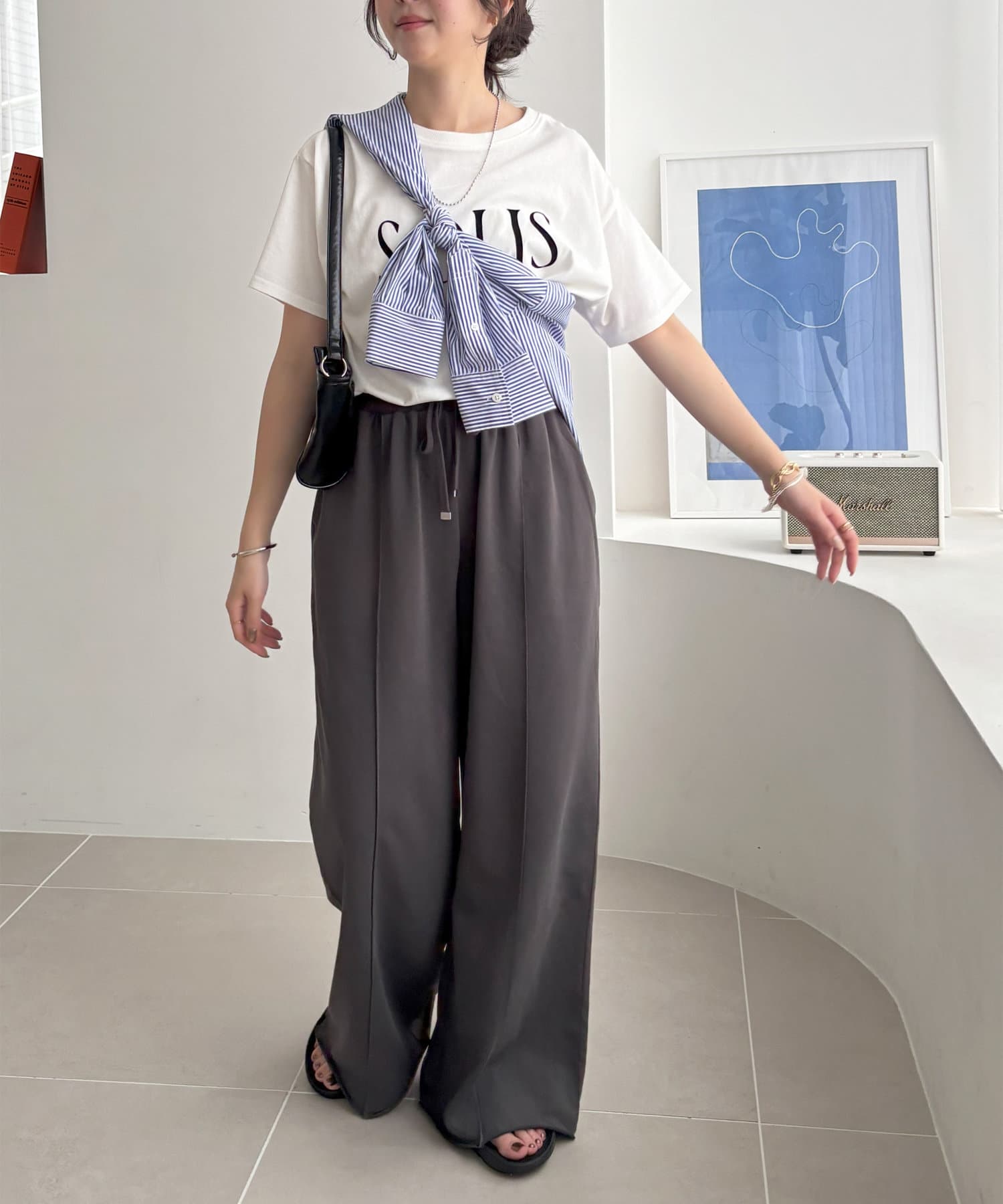158cmスタッフ(Mサイズ着用):センタープレスのおかげで脚長効果抜群!カジュアルすぎず、きちんと見えるのが嬉しいポイント◎旅行やデイリーにも使いやすいリラックス感です。