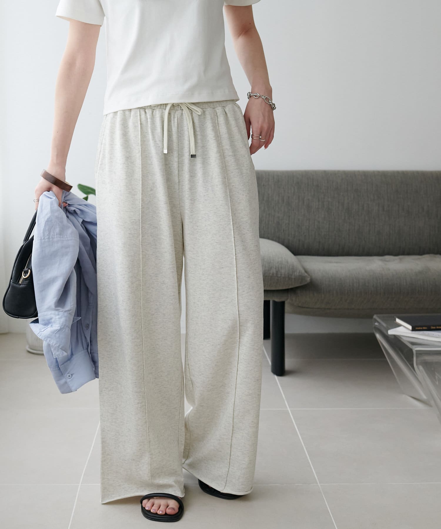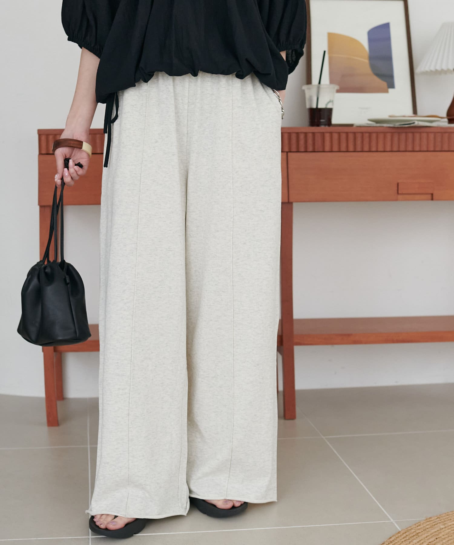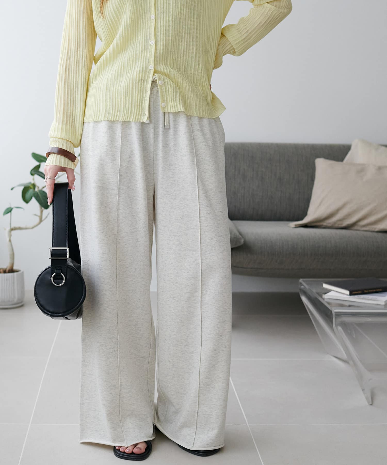 カジュアルな裏毛素材ながらも、センタープレス入りのきれいめデザインで、リラックス感と上品さを兼ね備えたワイドスウェットパンツ。