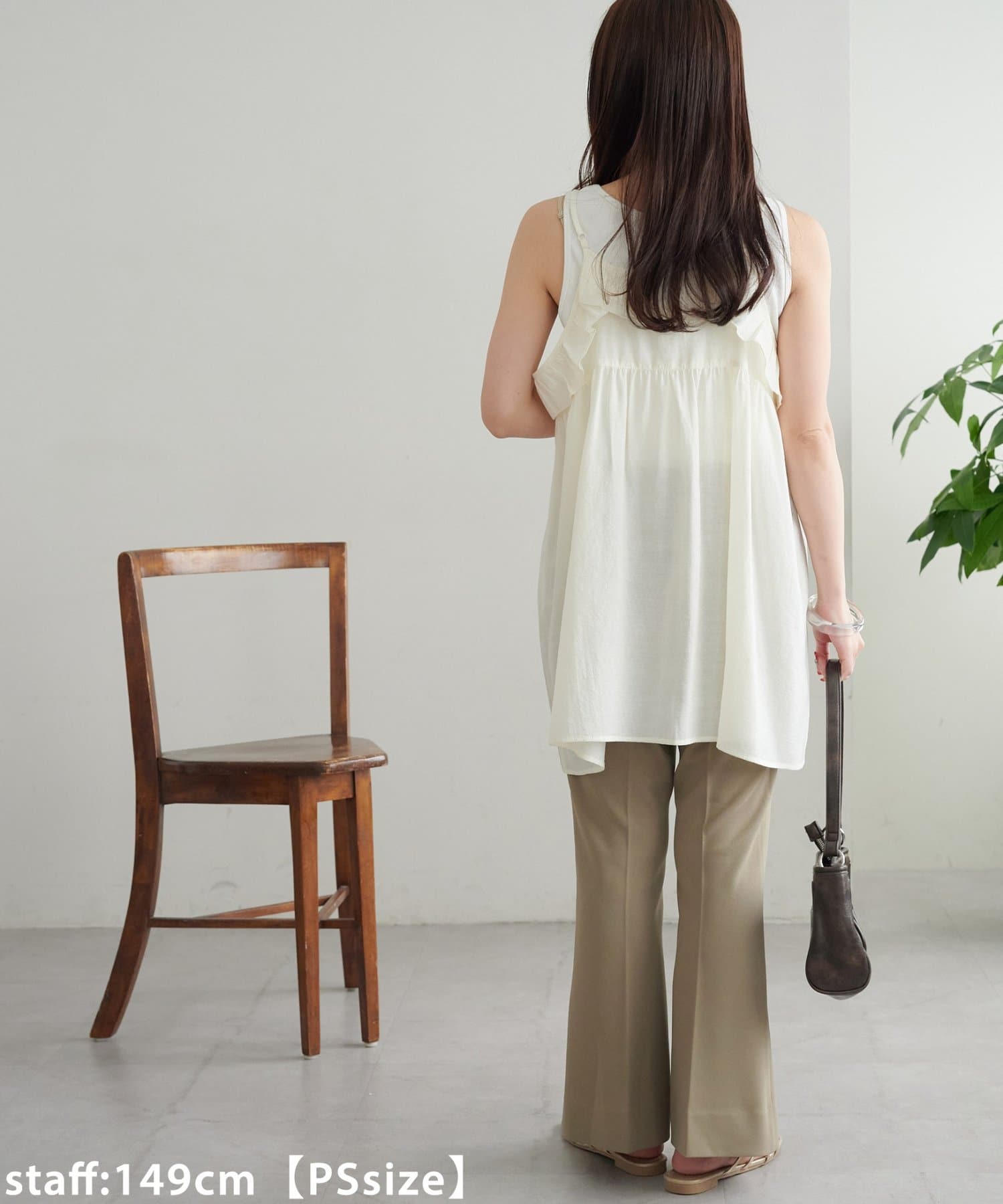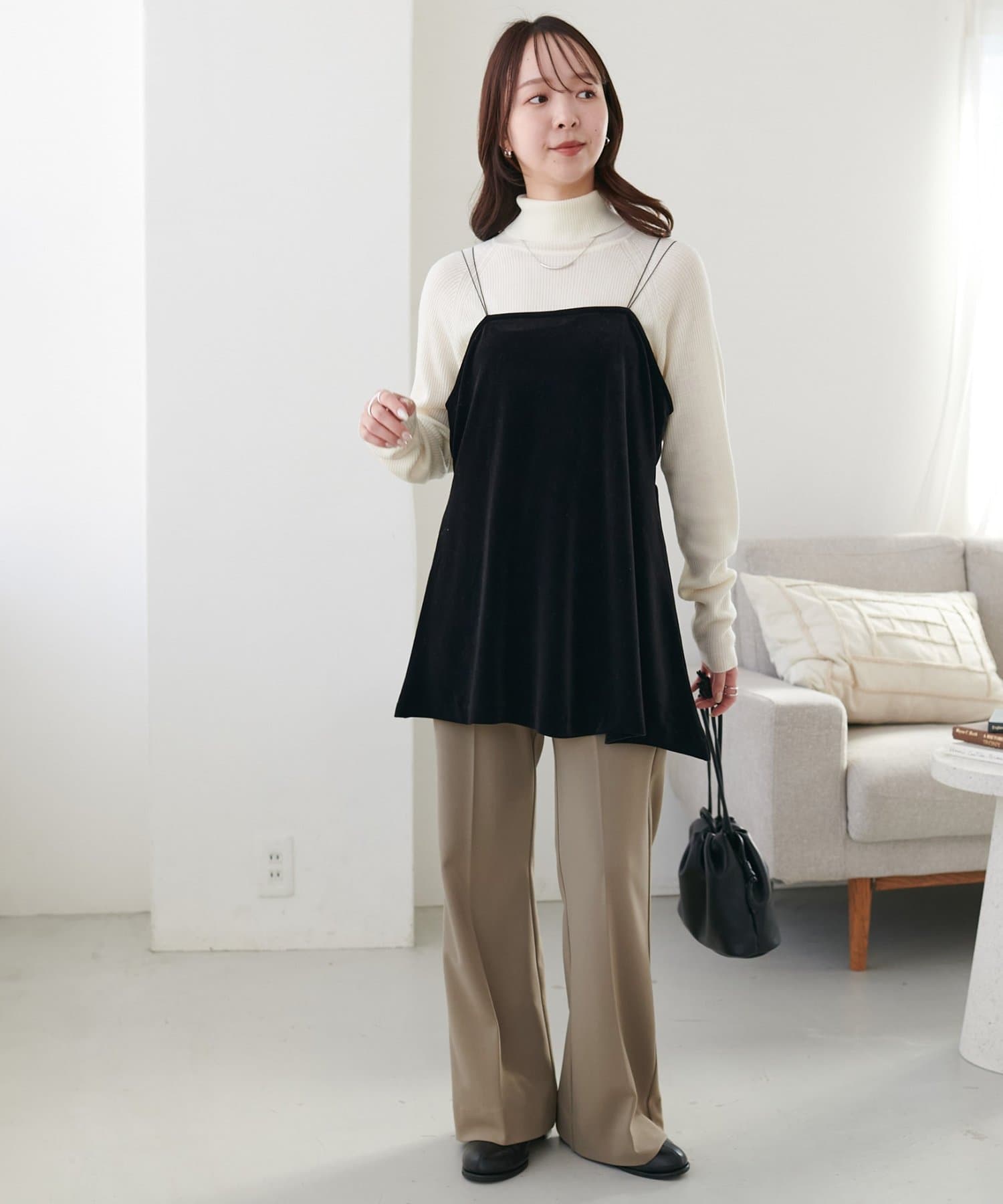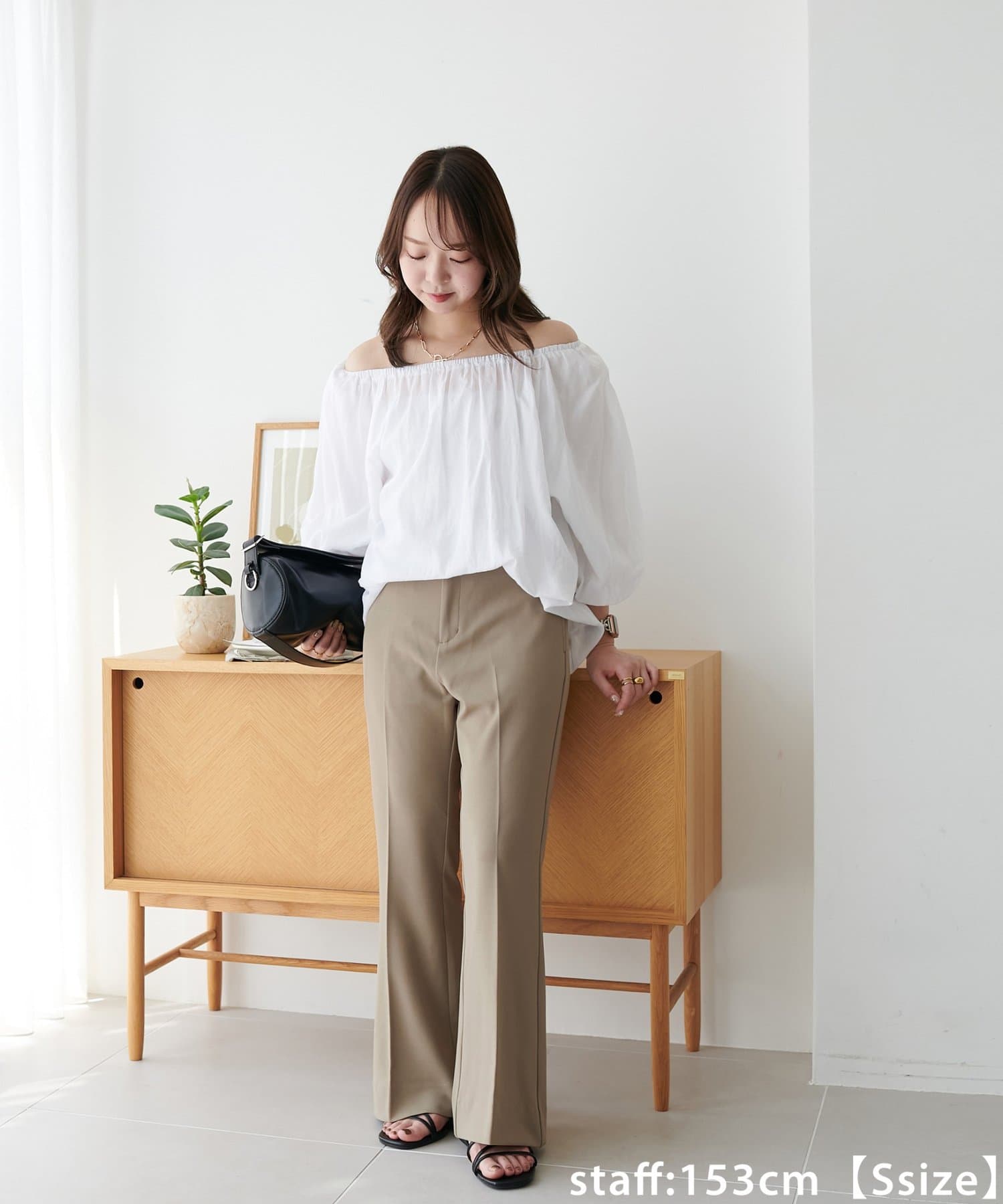 149cmスタッフ(PSサイズ着用):センタープレスが施されていることでよりきれいなラインがでて足長効果抜群◎フラットシューズでも裾を引きずらず履ける丈感でした!