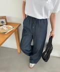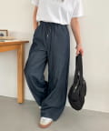 158cmスタッフ(Mサイズ着用):ウエストは総ゴム仕様で窮屈感なくノンストレス!ボディラインを拾わないゆったりとしたワイドシルエットで、体型カバーも◎