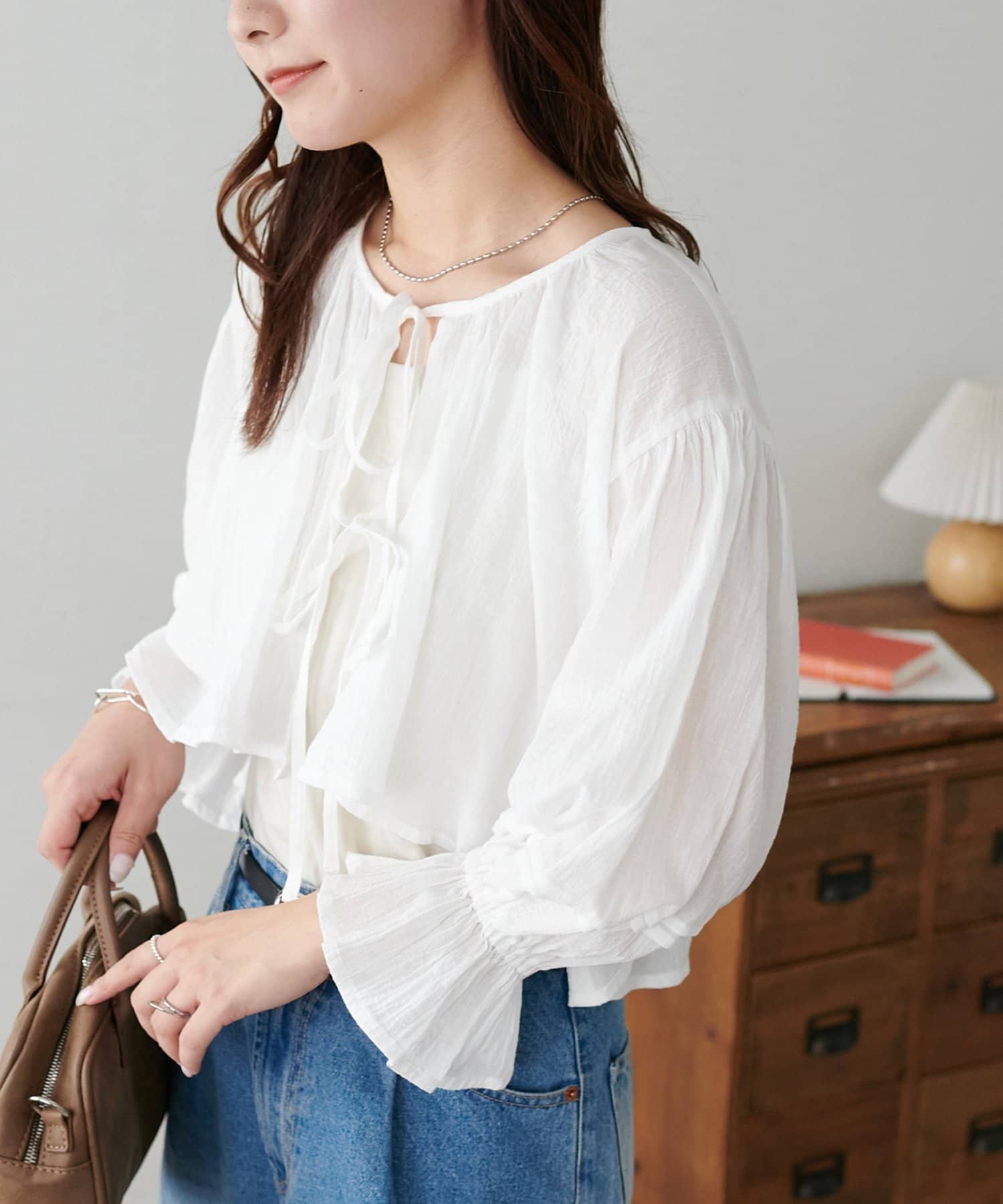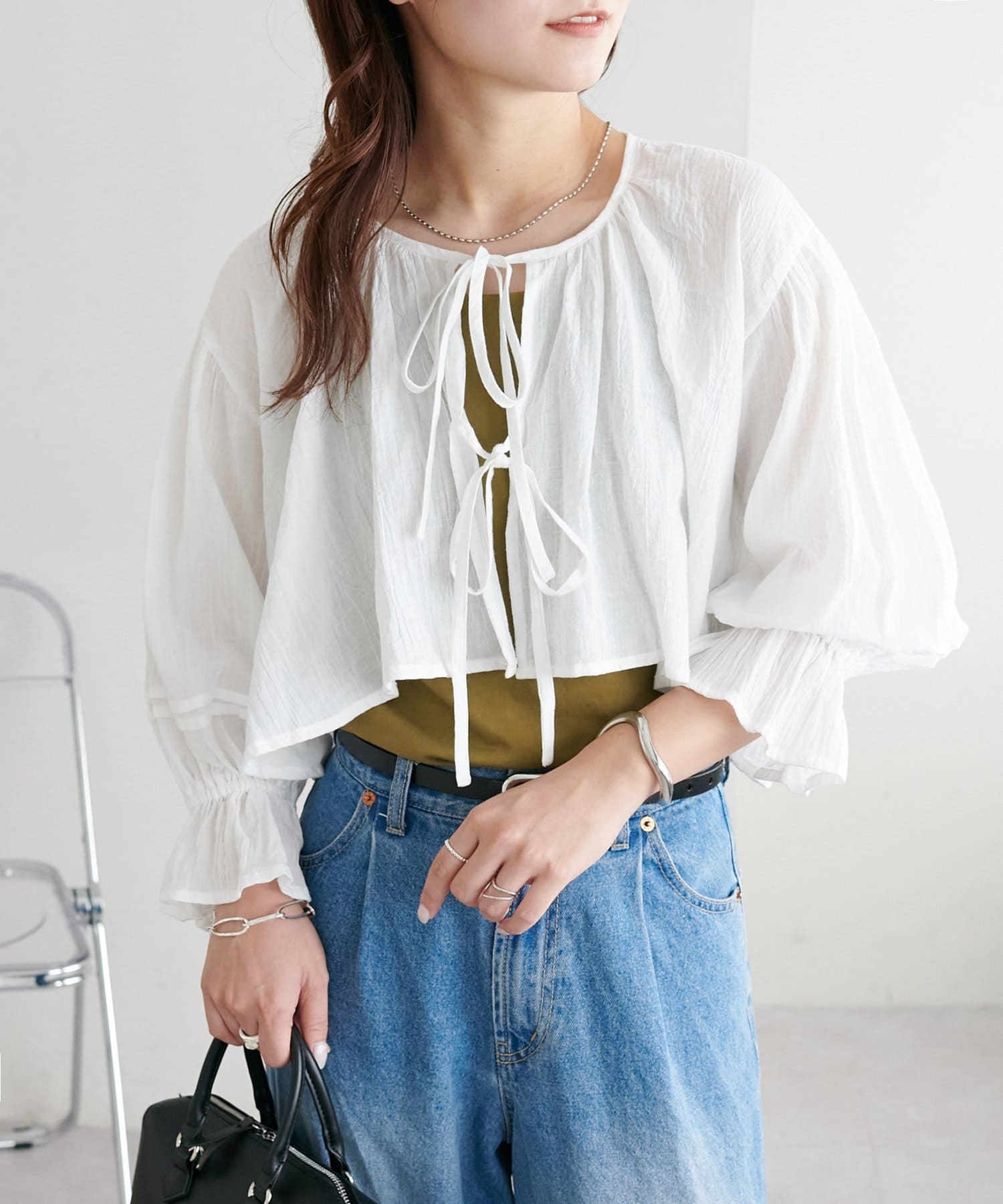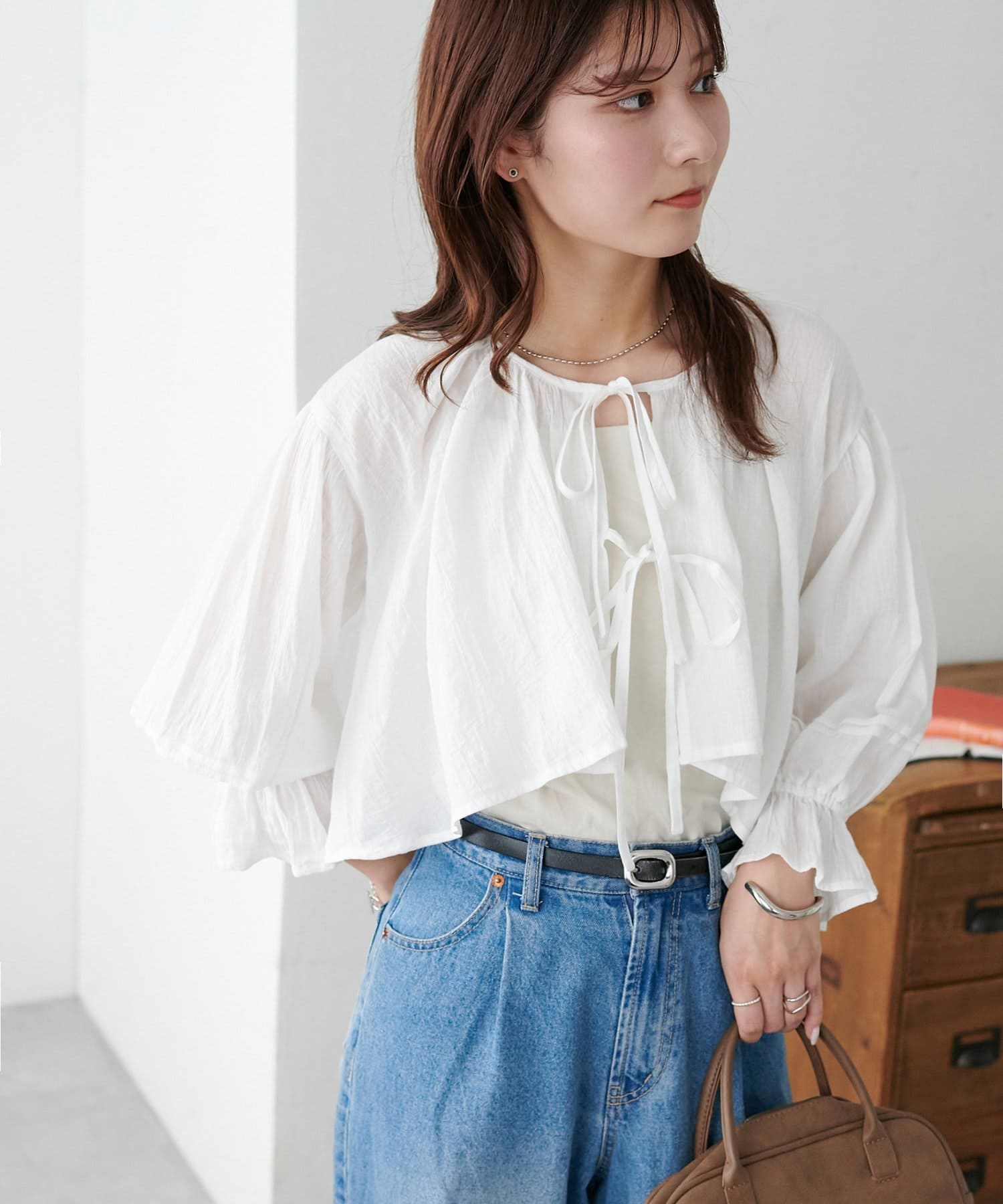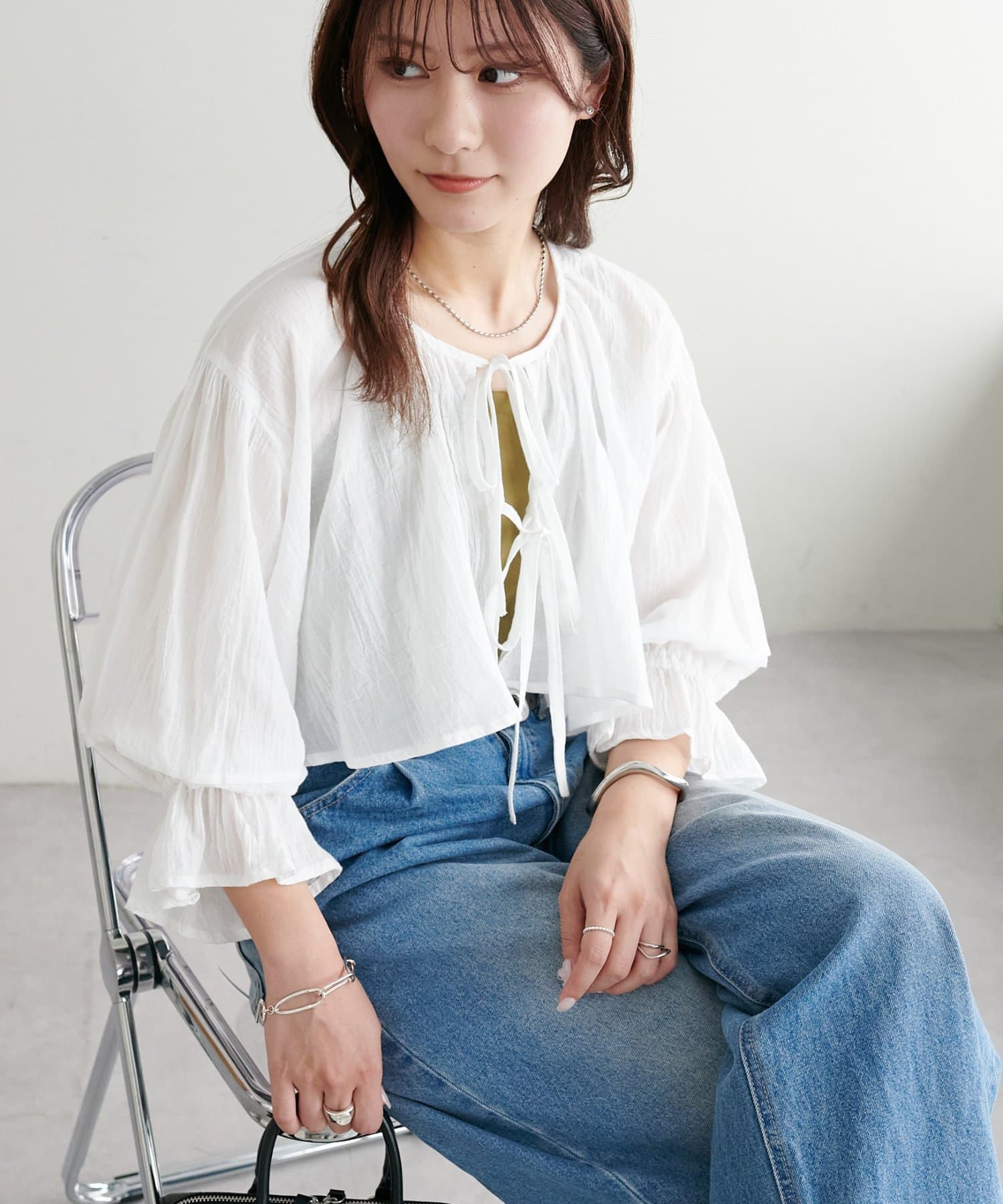 160cmスタッフ:リボンを全部結んで甘めに、前を開けてラフにと着こなしを変えられるのが嬉しい!やや透け感があり涼しげで夏にぴったりのアイテムです。