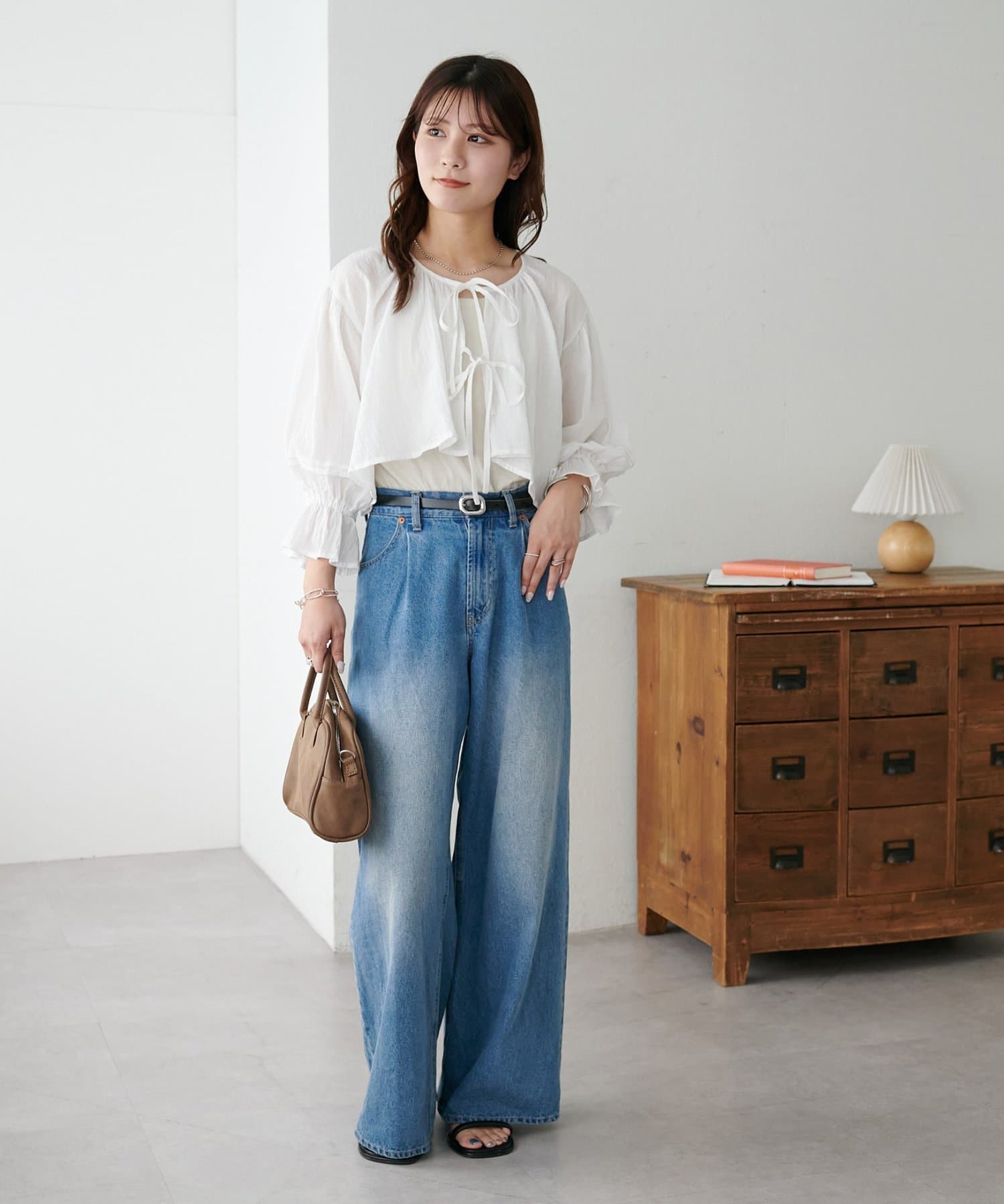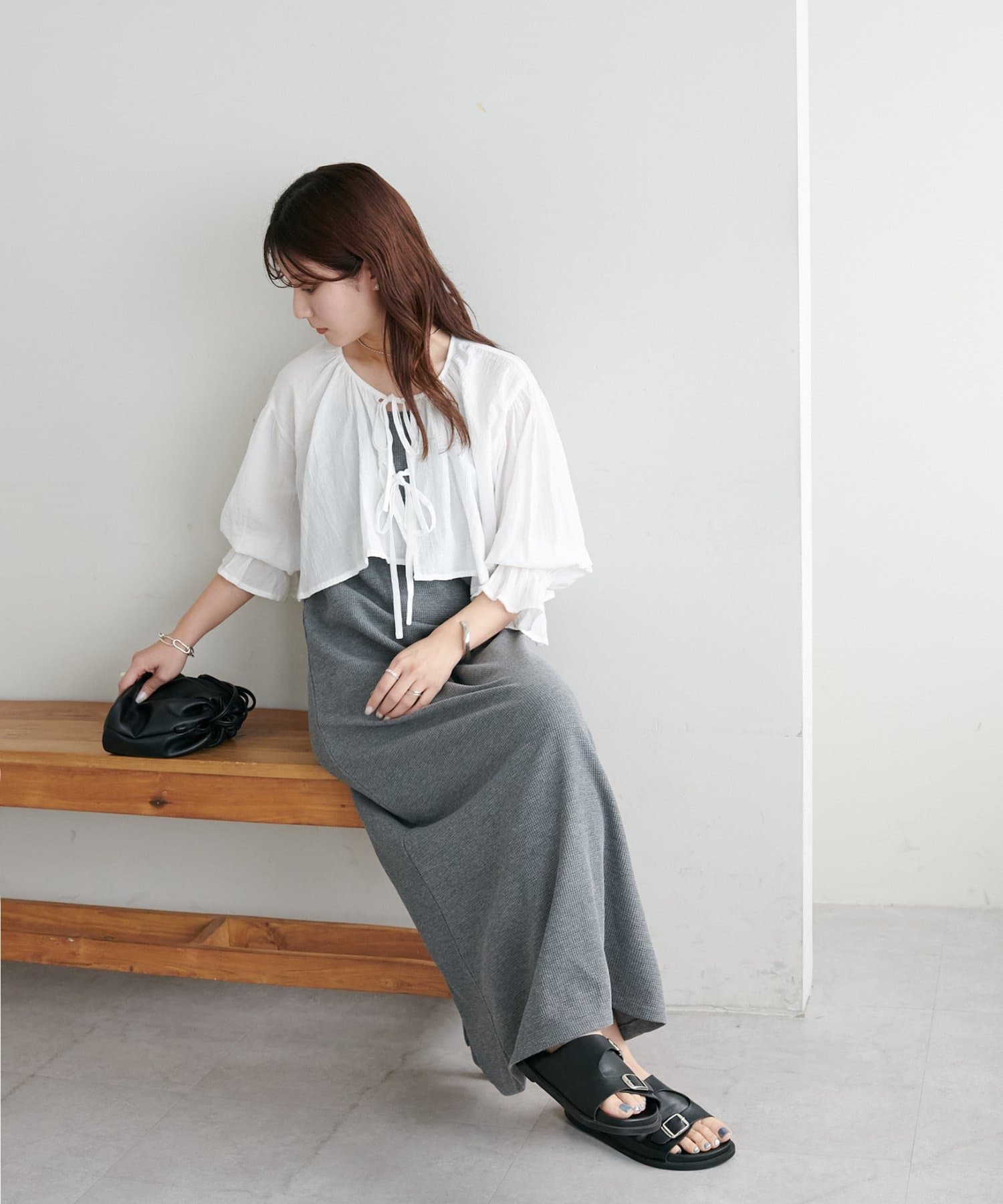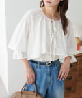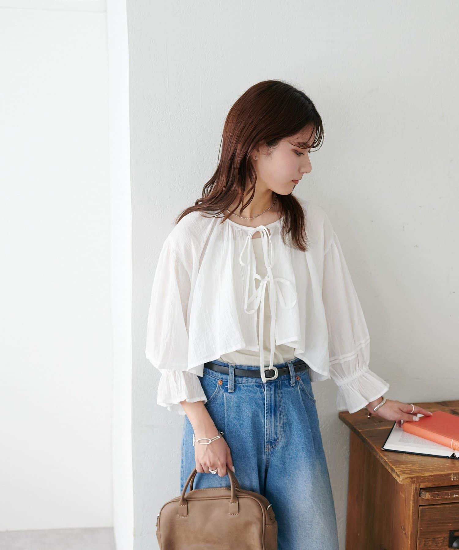 160cmスタッフ:リボンを全部結んで甘めに、前を開けてラフにと着こなしを変えられるのが嬉しい!やや透け感があり涼しげで夏にぴったりのアイテムです。