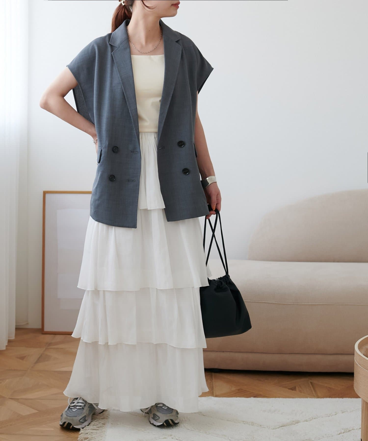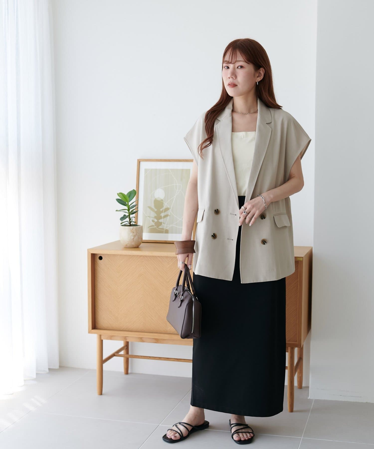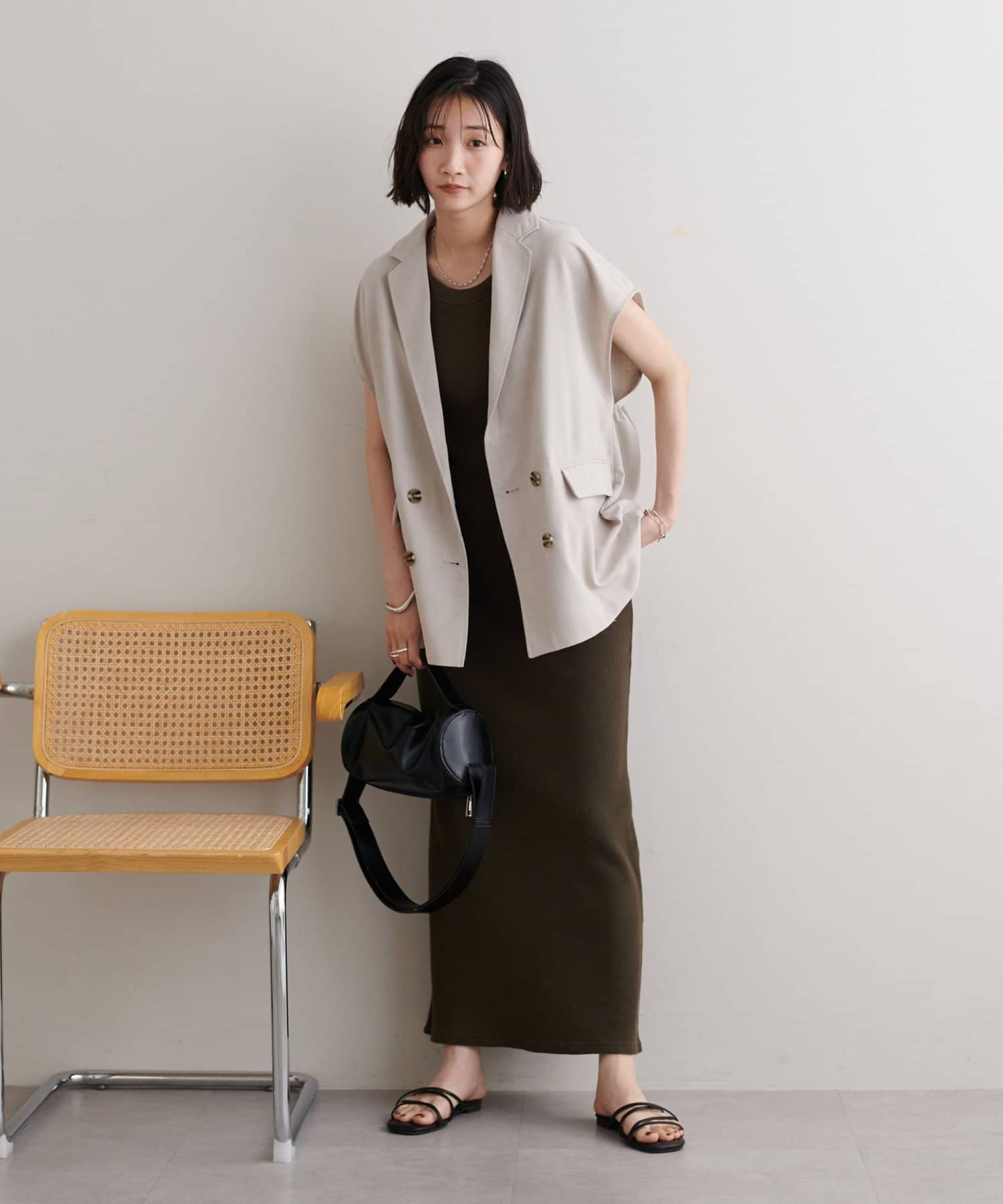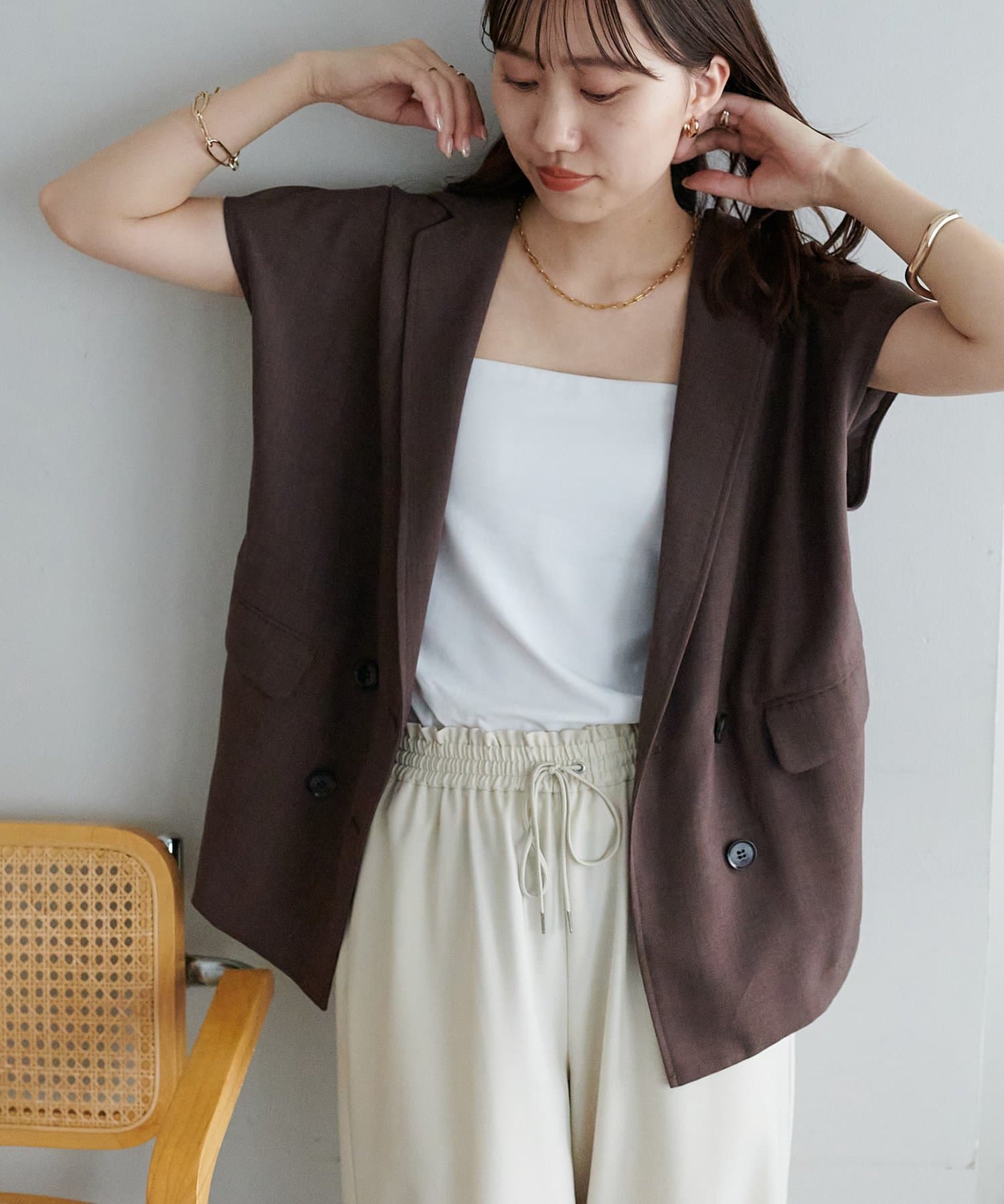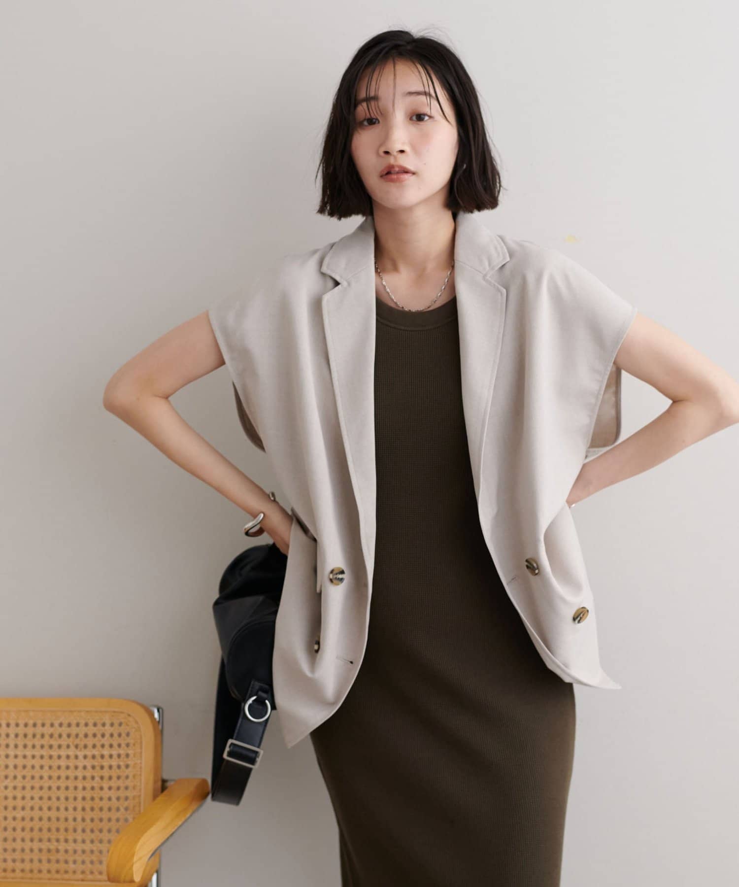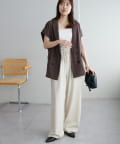 フレンチスリーブなのでキャミやタンク合わせがおすすめ。露出を控えたい方は、シアーの長袖などを合わせると◎パンツ、スカートどちらも相性抜群。ワンピースの上から羽織るとよりこなれ感のあるコーデになります。