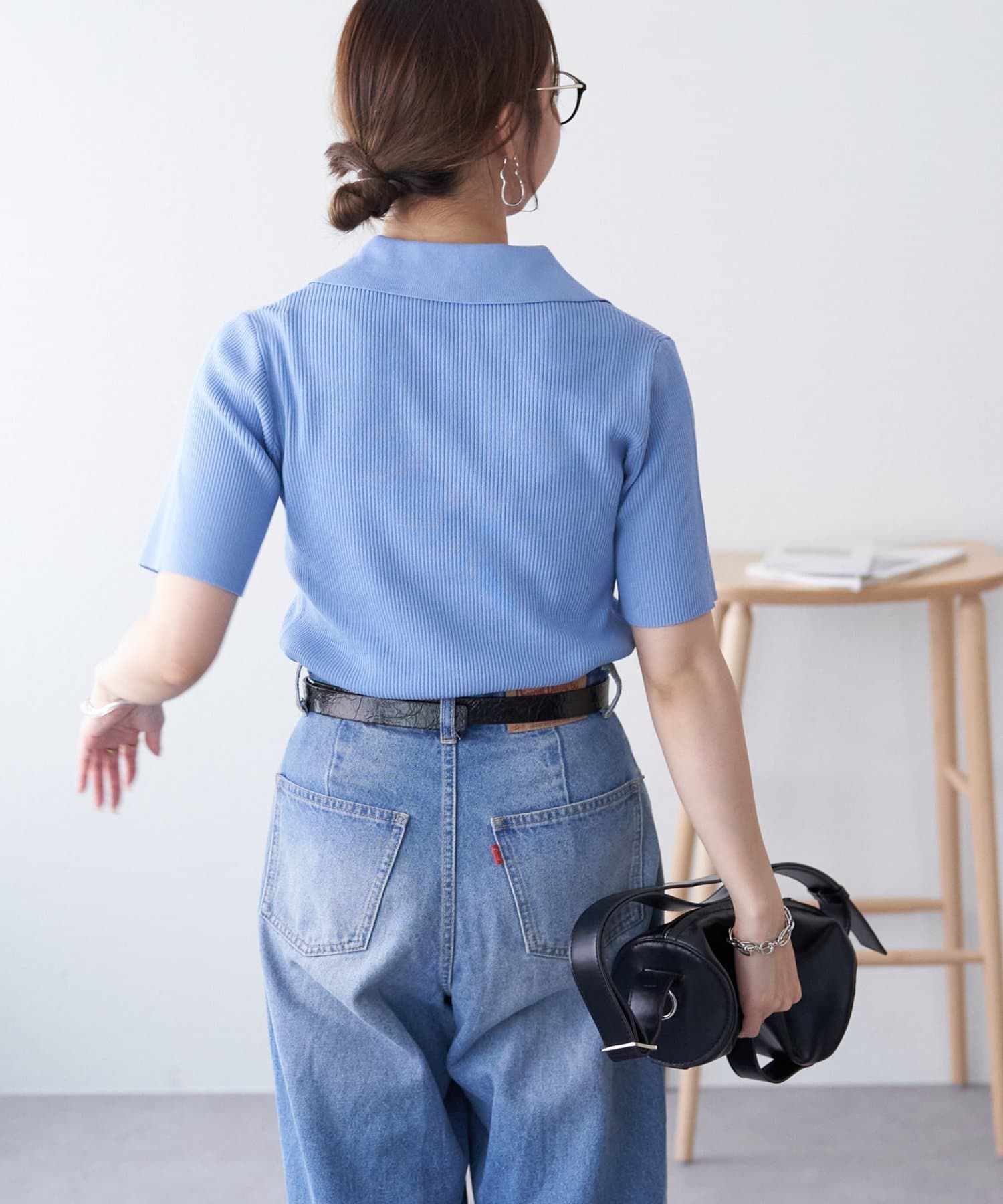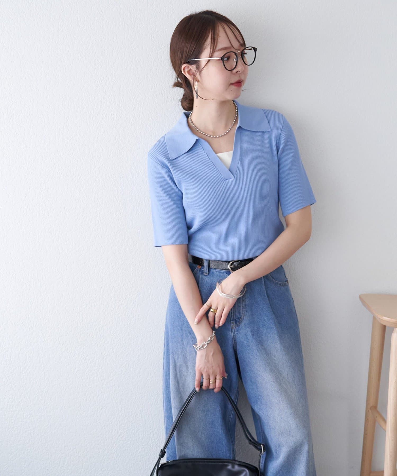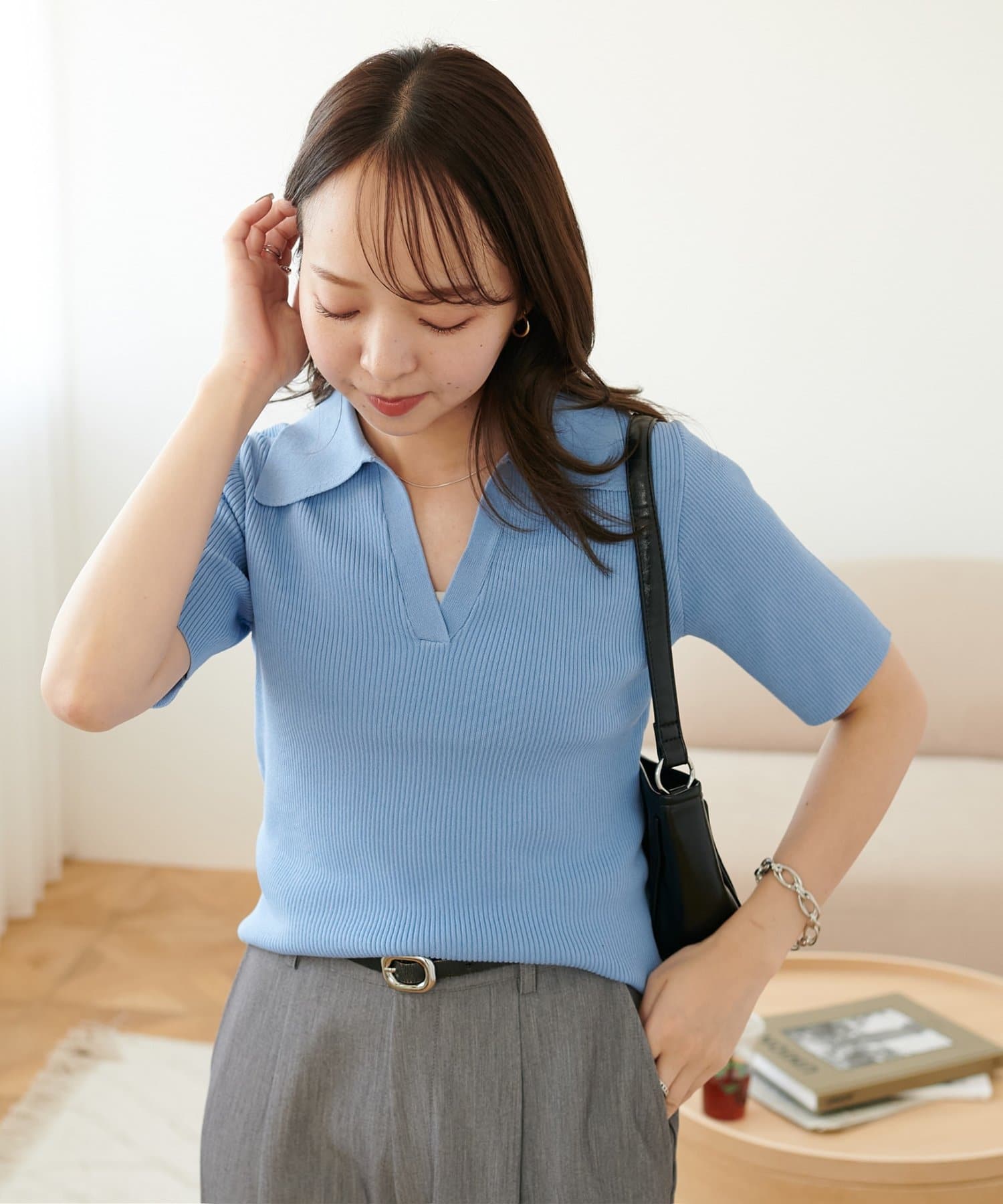 ベーシックなリブトップスにトレンド感のあるスキッパーデザインをプラス。