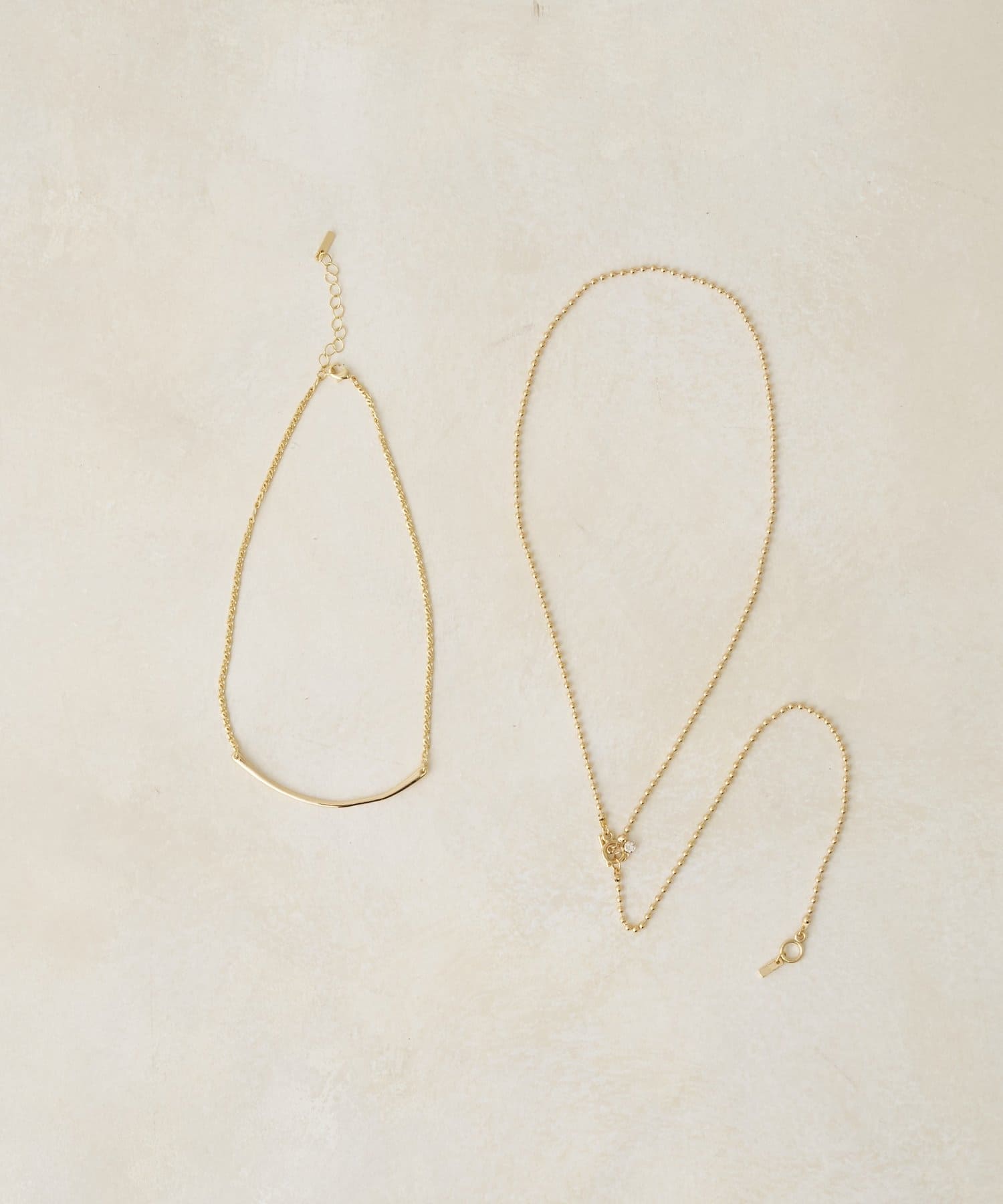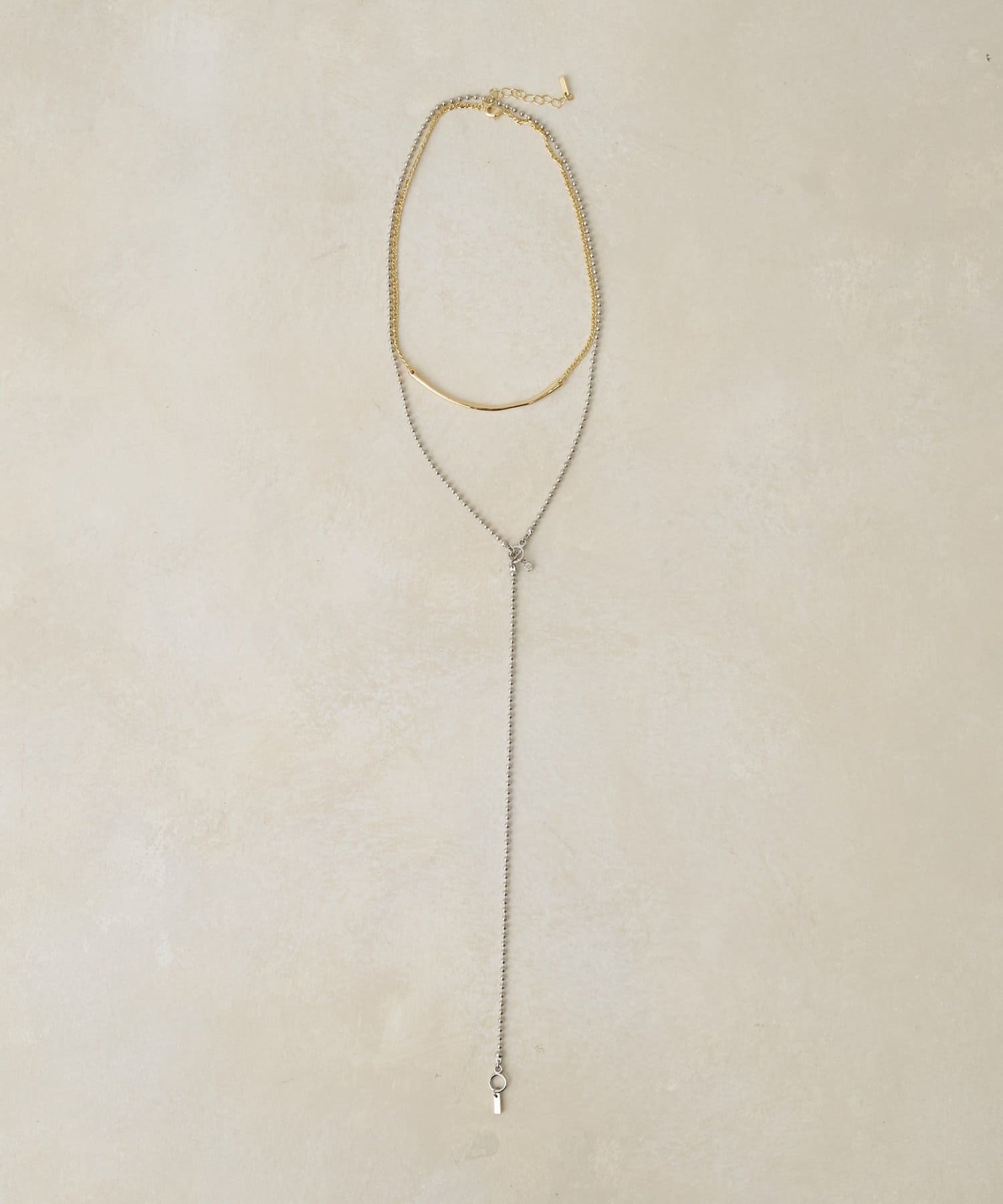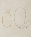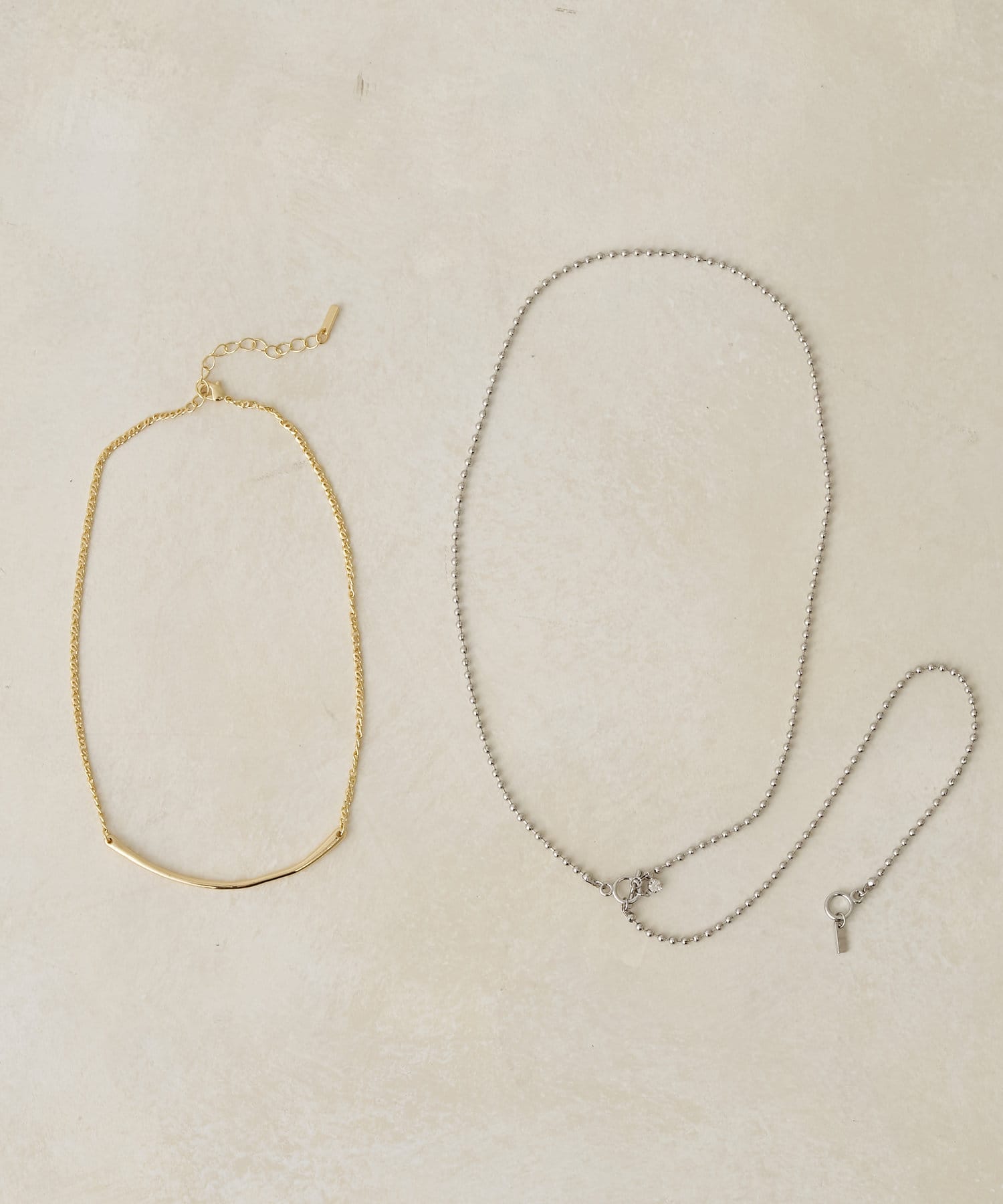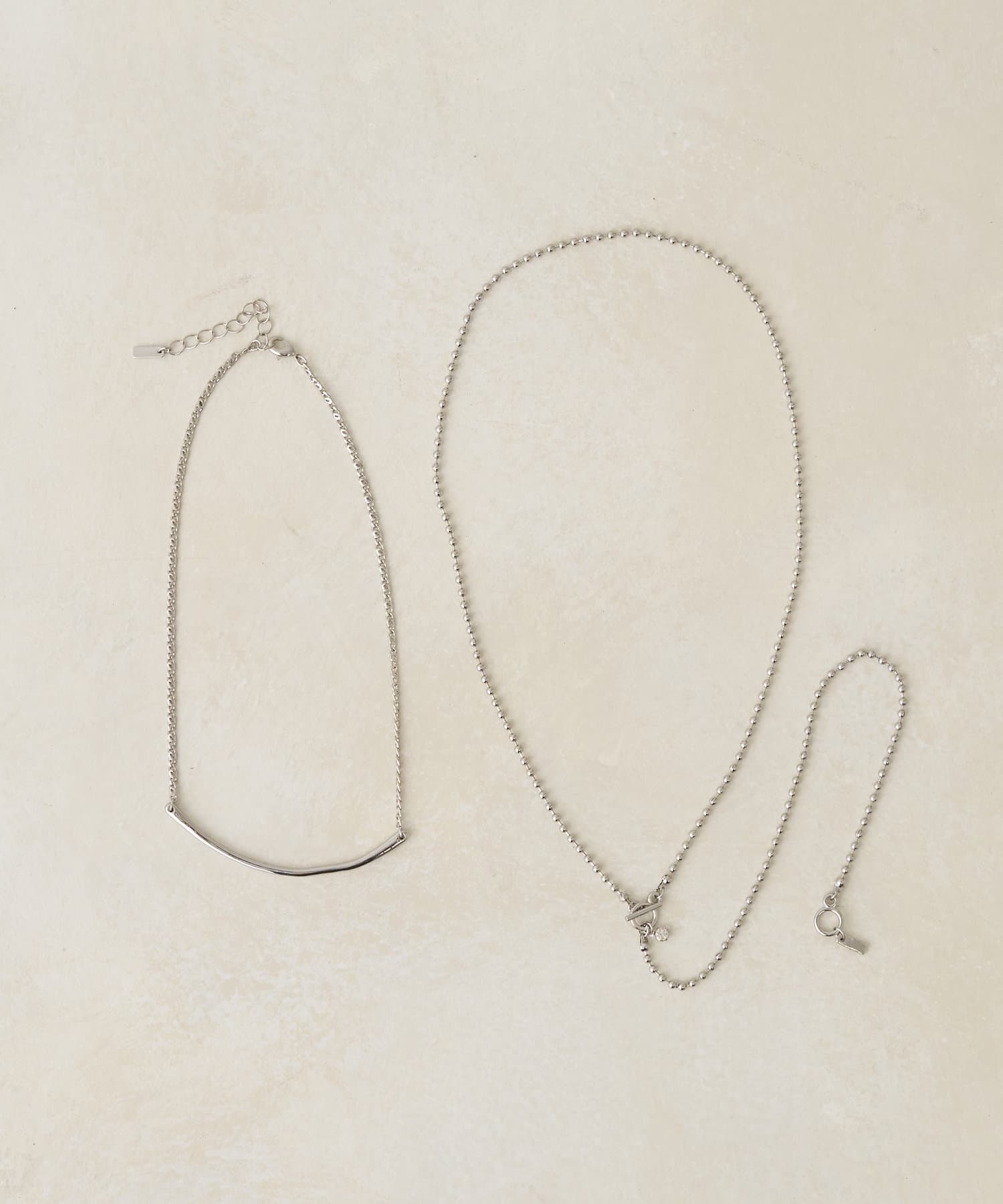 程よい長さのバー付きネックレスと、マンテル留め具がアクセントのロングネックレスのセット。シンプルながら存在感のあるデザインで、1つでも重ね付けでもスタイリッシュに決まります◎異なる長さが首元に動きをプラスし、洗練されたレイヤードスタイルを叶えてくれるアイテムです。カジュアルからきれいめまで幅広く活躍する、デイリー使いにぴったりのネックレスです。