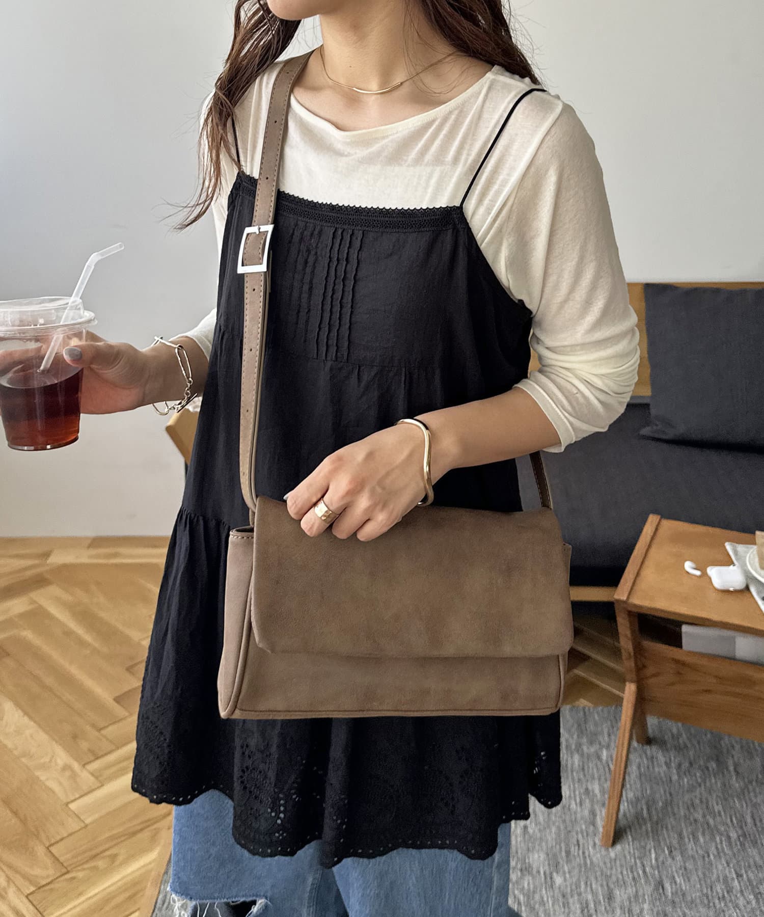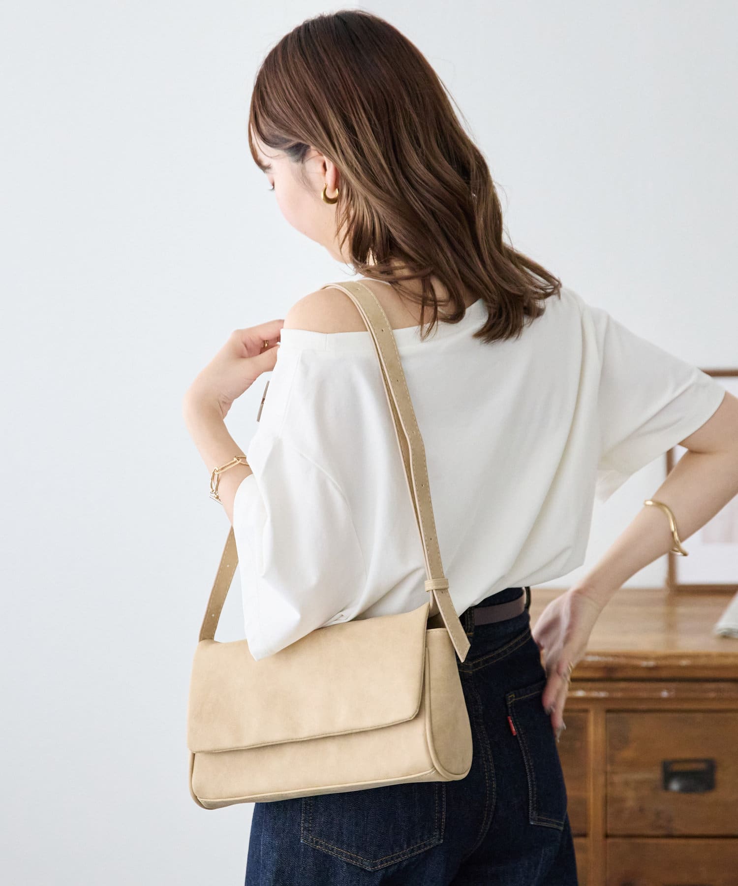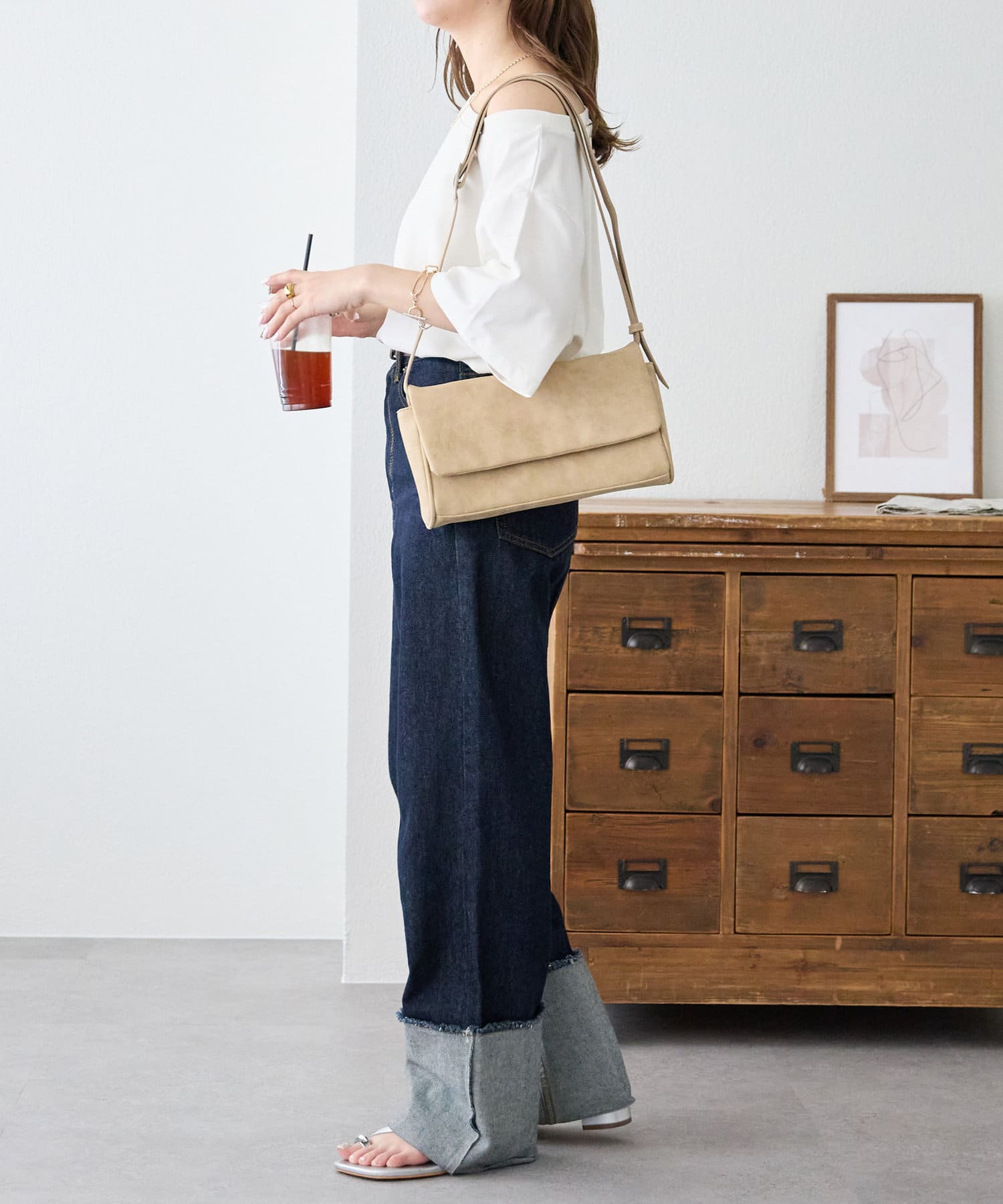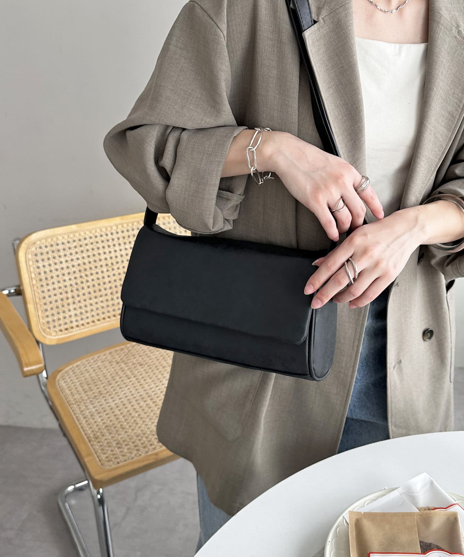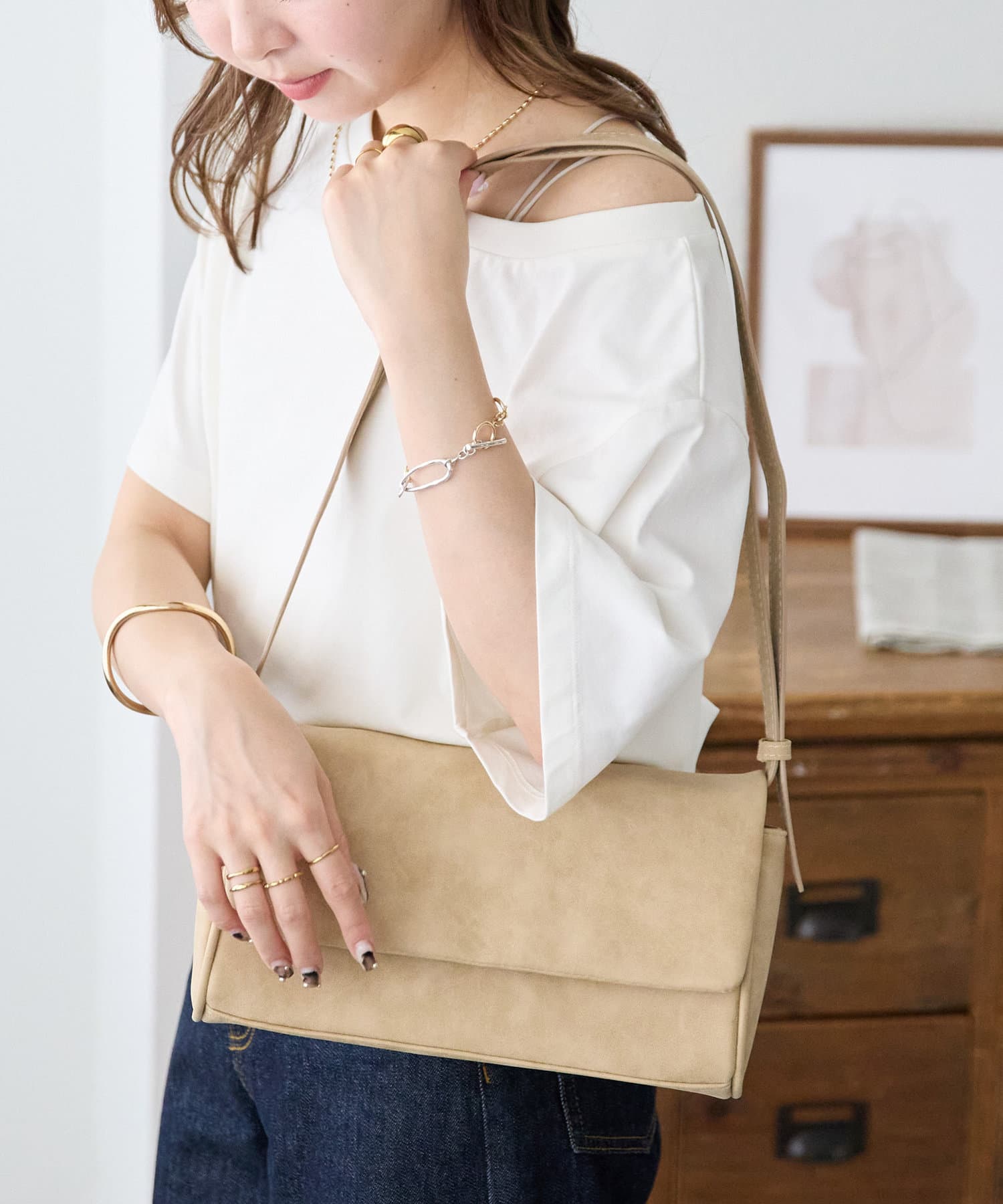トレンドの横長フォルムとスウェード素材で、カジュアルからきれいめなコーデまで相性抜群のショルダーバッグ。フラップ部分にはマグネットボタンが付いているので開閉が楽ちん◎長さの調節と取り外しが可能なショルダー紐なのでその日の気分や服装に合わせて持ち方を変えられます。また、ショルダー紐のバックルがコーデのアクセントに♪