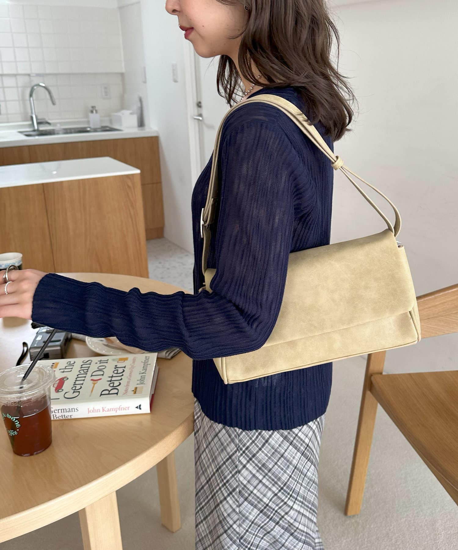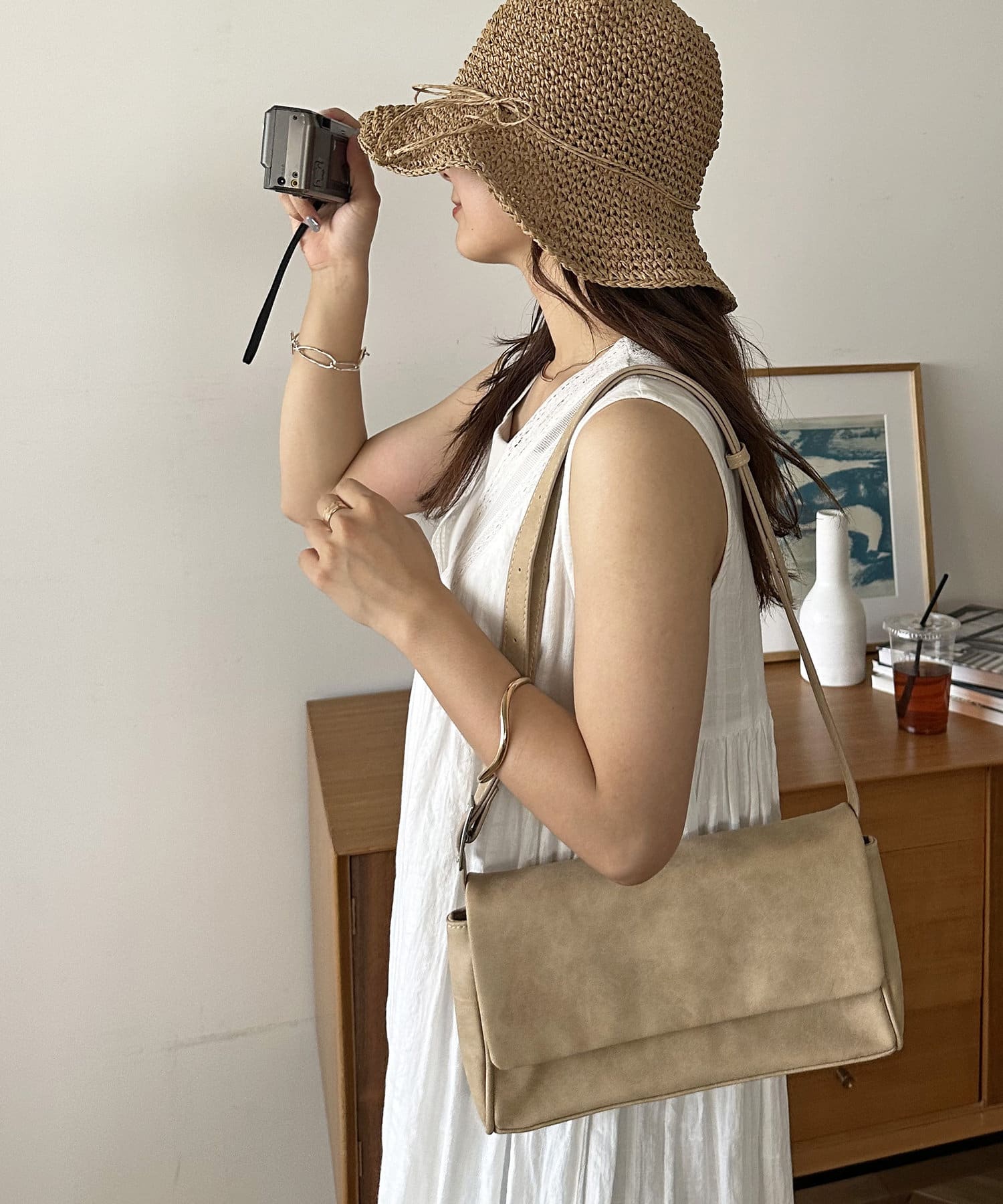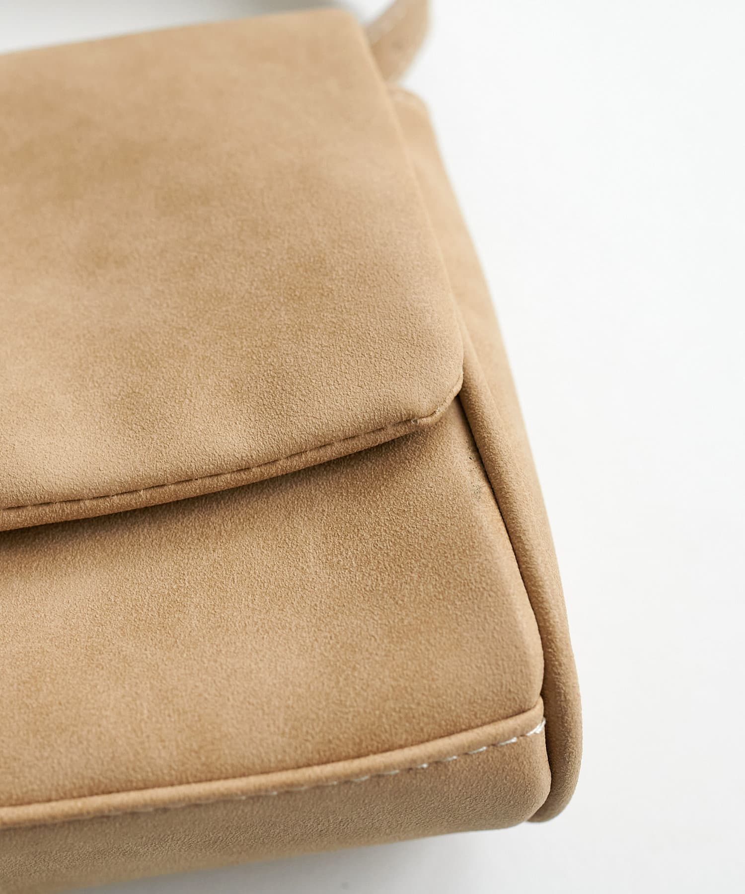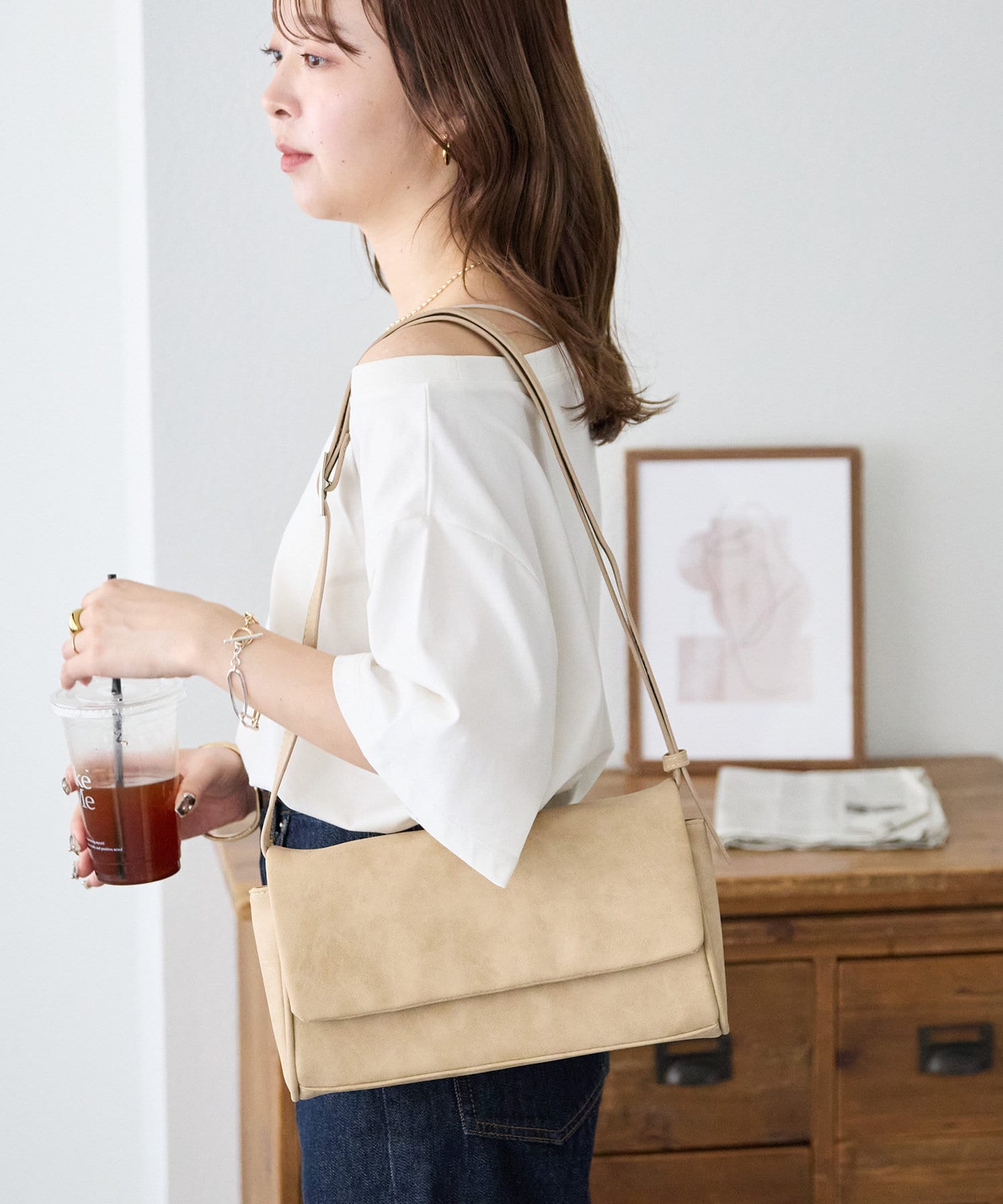 トレンドの横長フォルムとスウェード素材で、カジュアルからきれいめなコーデまで相性抜群のショルダーバッグ。フラップ部分にはマグネットボタンが付いているので開閉が楽ちん◎長さの調節と取り外しが可能なショルダー紐なのでその日の気分や服装に合わせて持ち方を変えられます。また、ショルダー紐のバックルがコーデのアクセントに♪