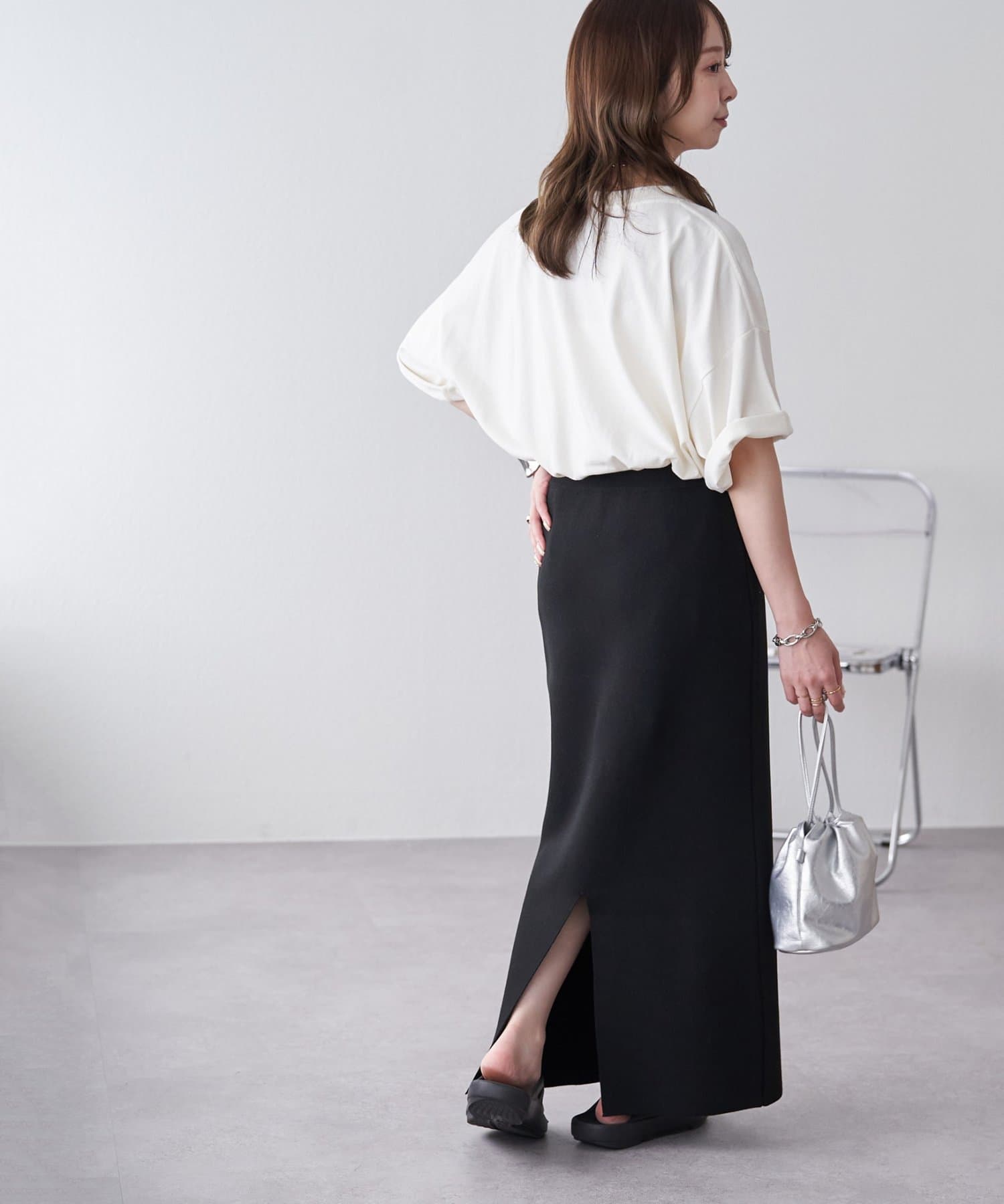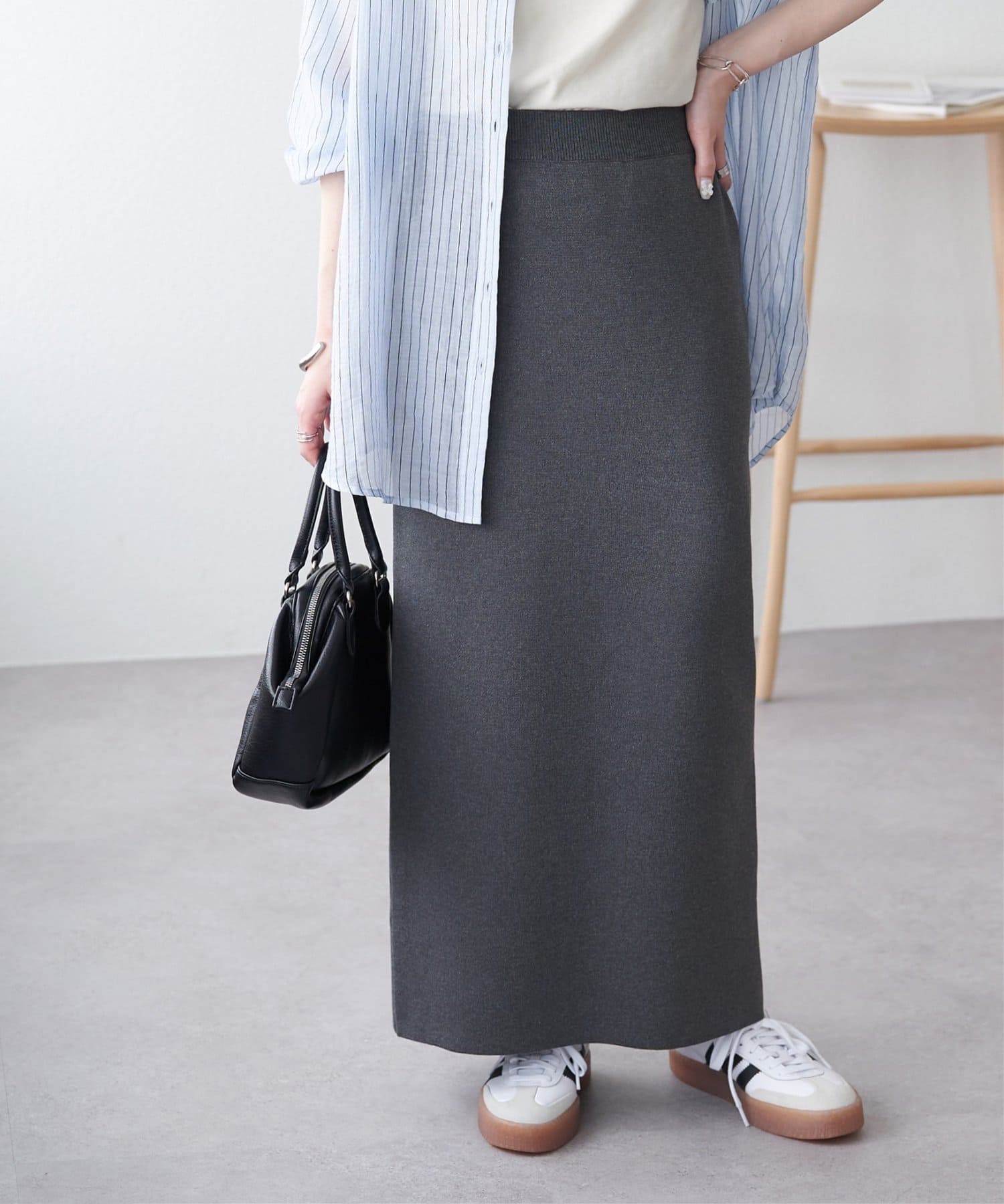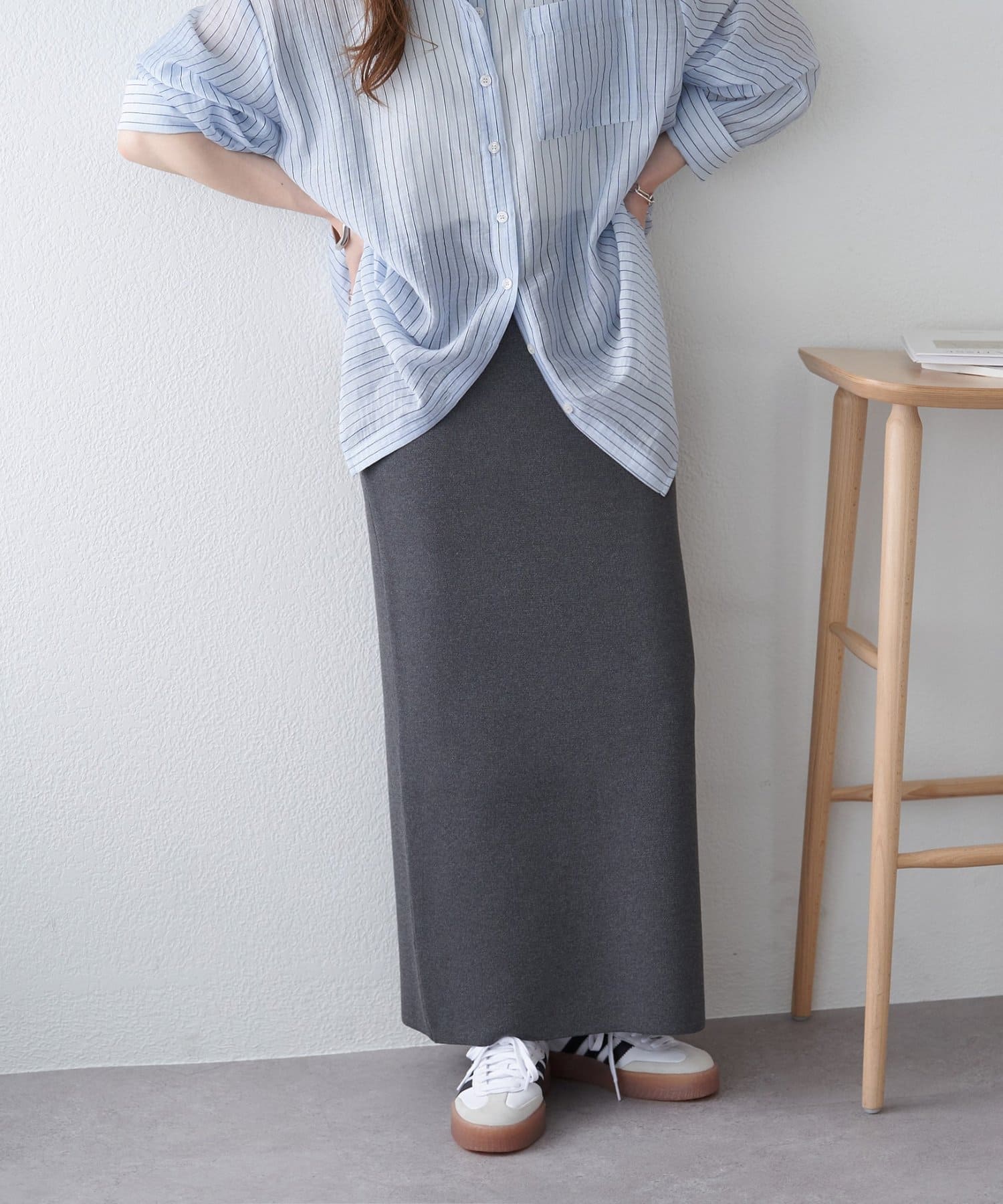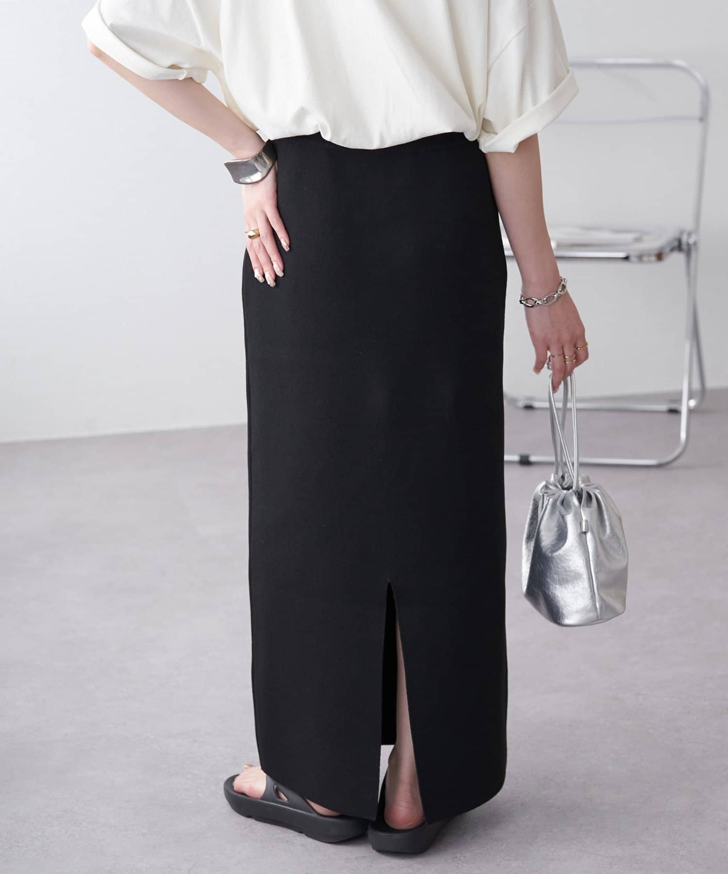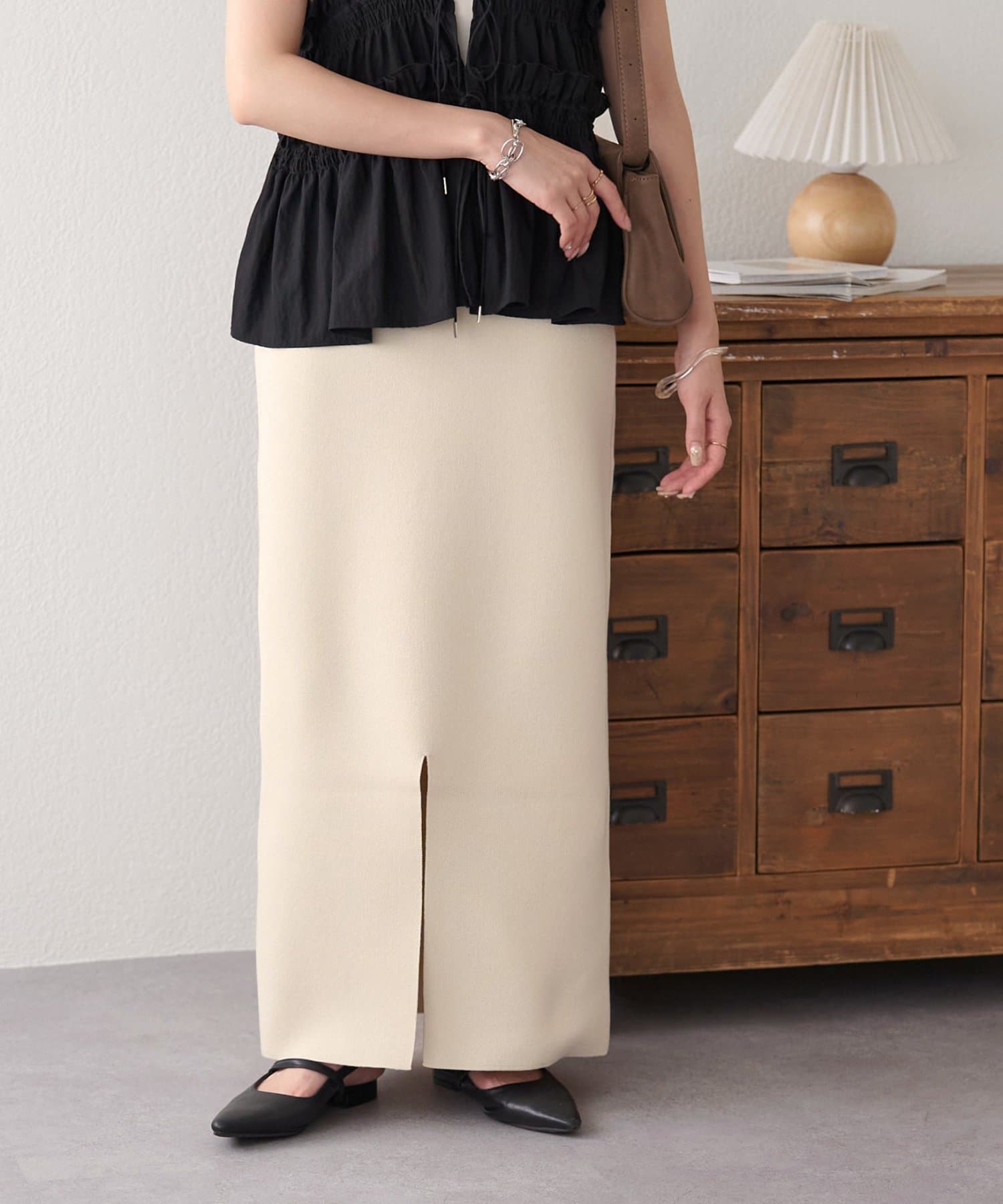 153cmスタッフ:形が綺麗なニットナロースカート。ロング丈ですが、裾にスリットが入っているので、低身長でも動きやすいデザインです!