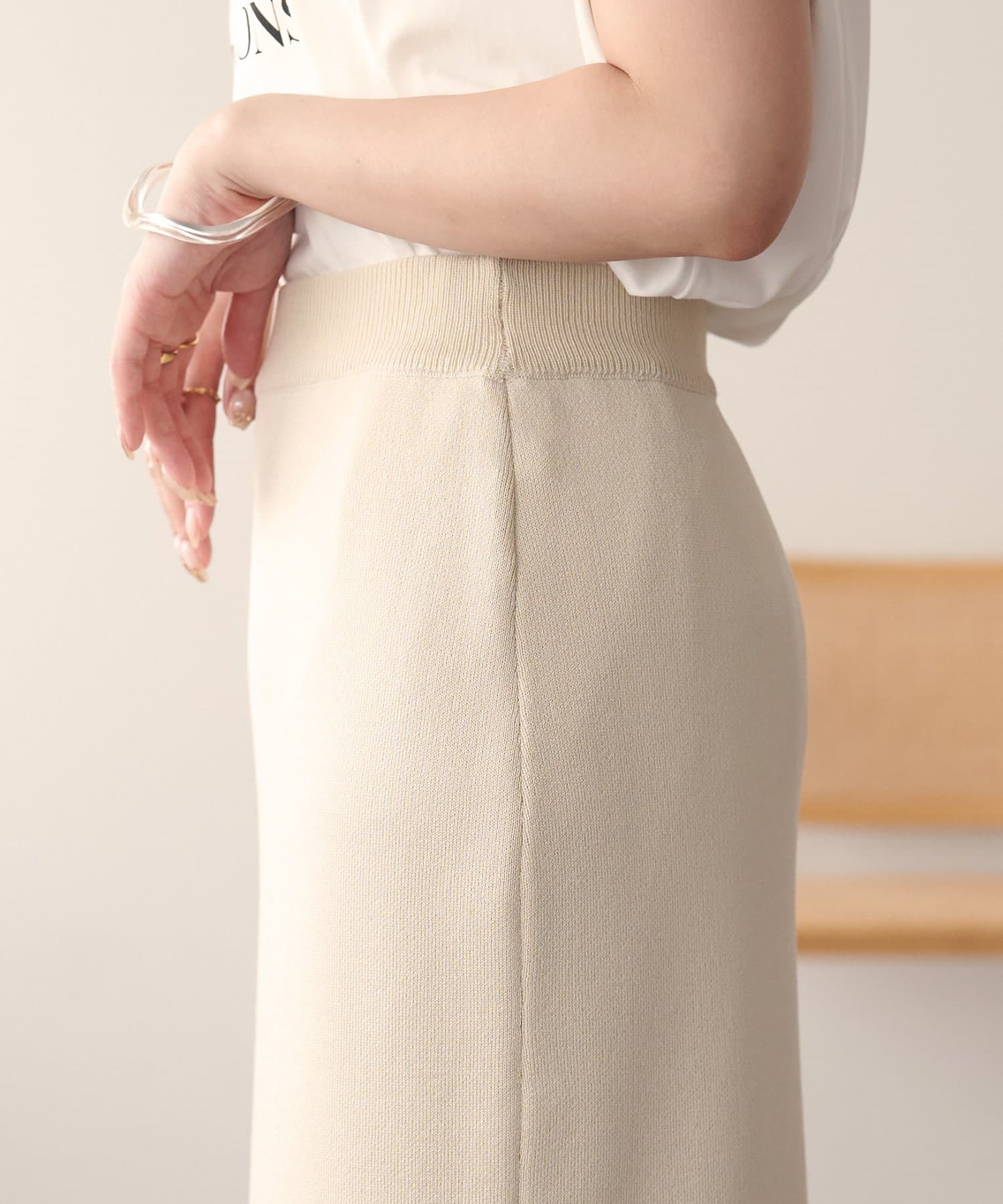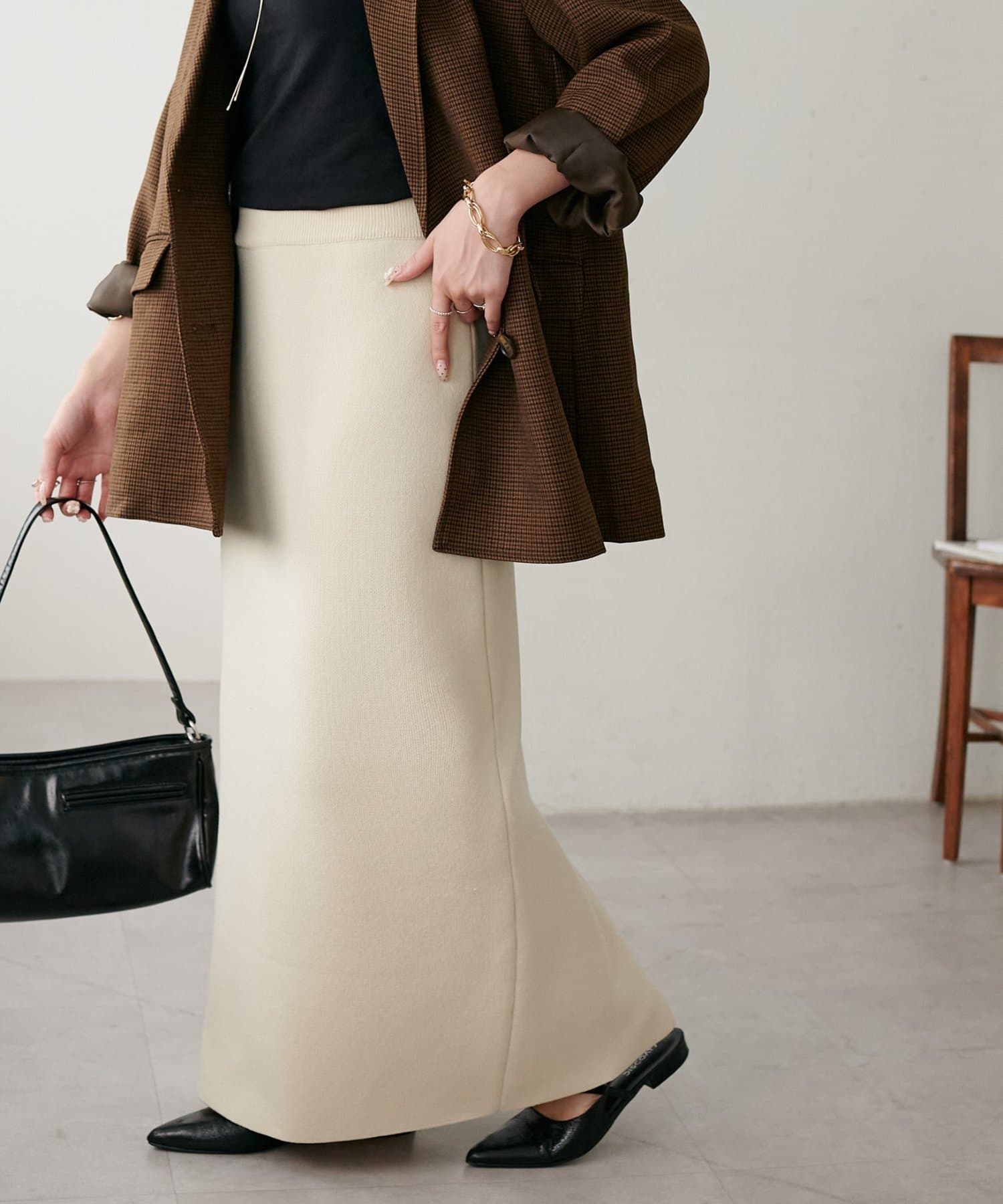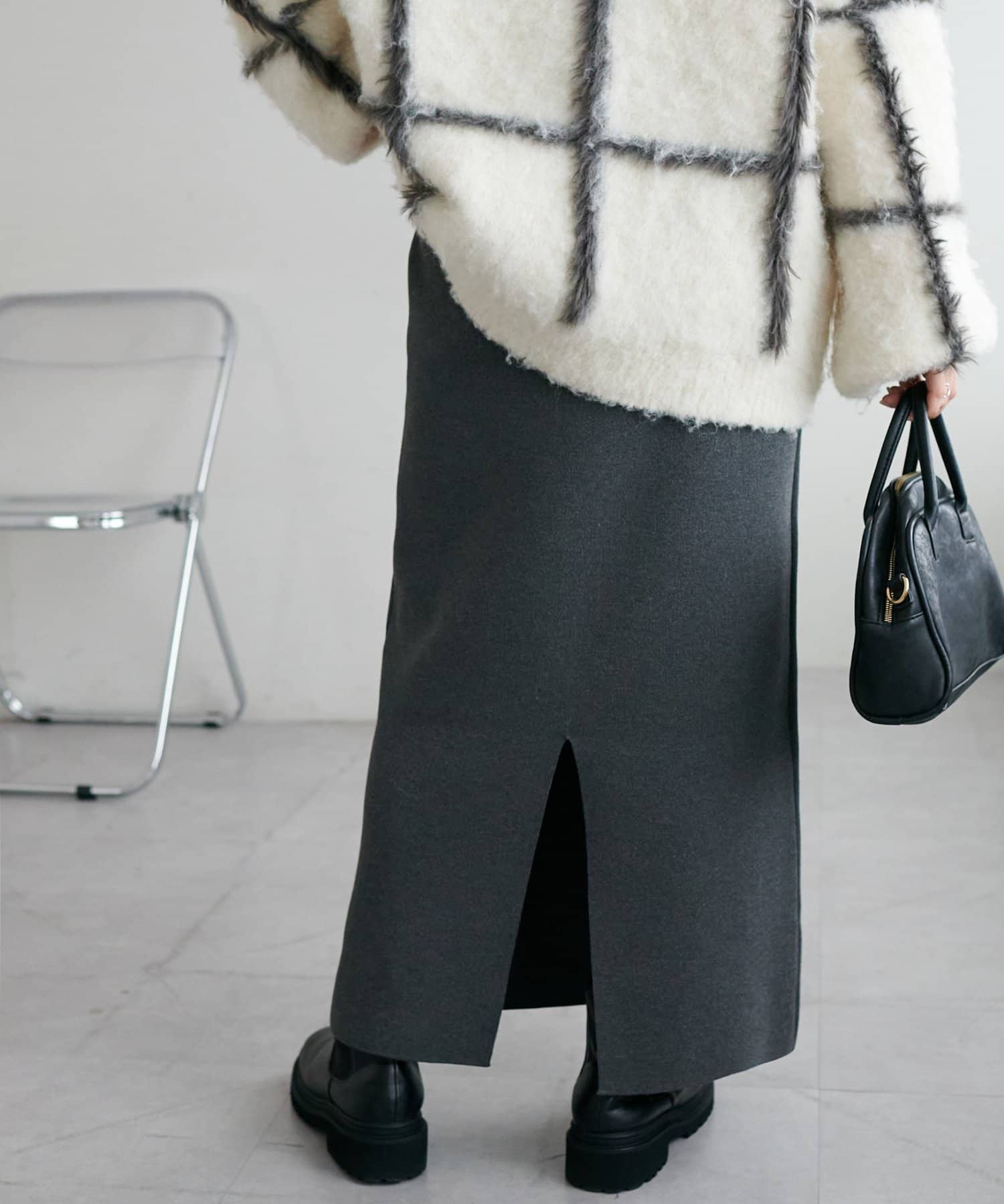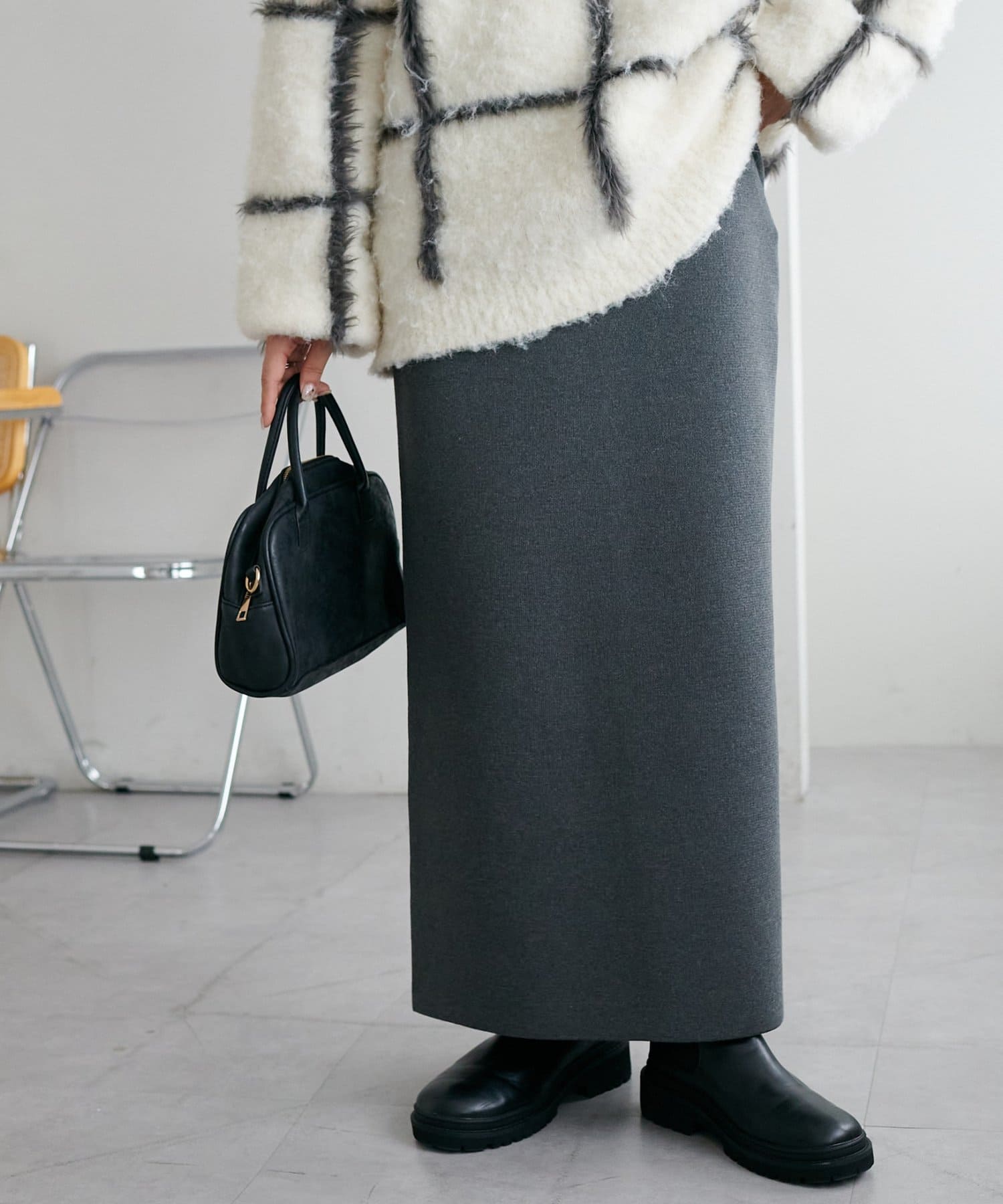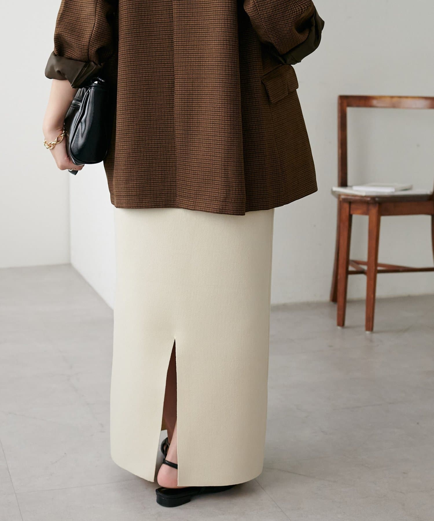 153cmスタッフ:形が綺麗なニットナロースカート。ロング丈ですが、裾にスリットが入っているので、低身長でも動きやすいデザインです!