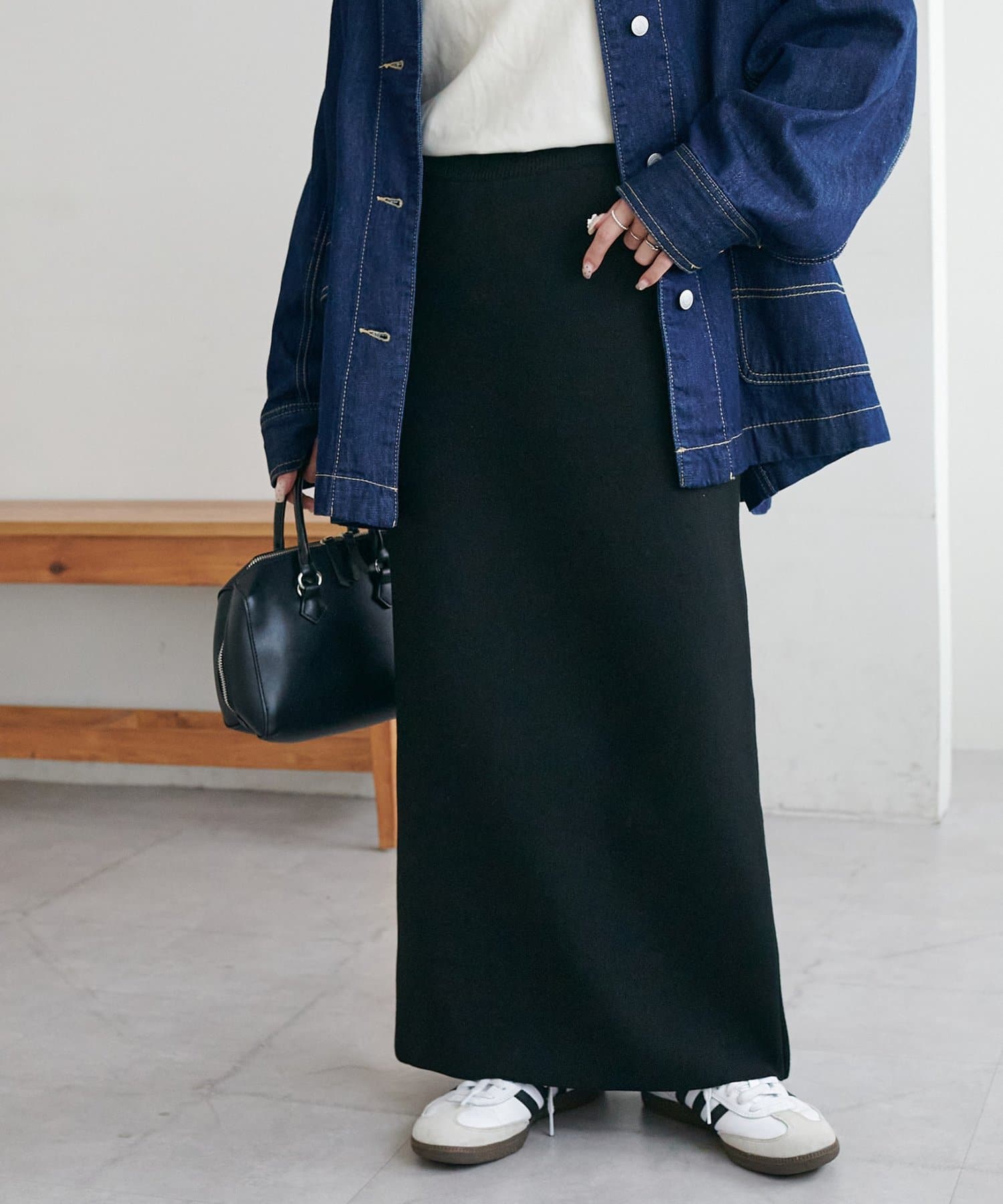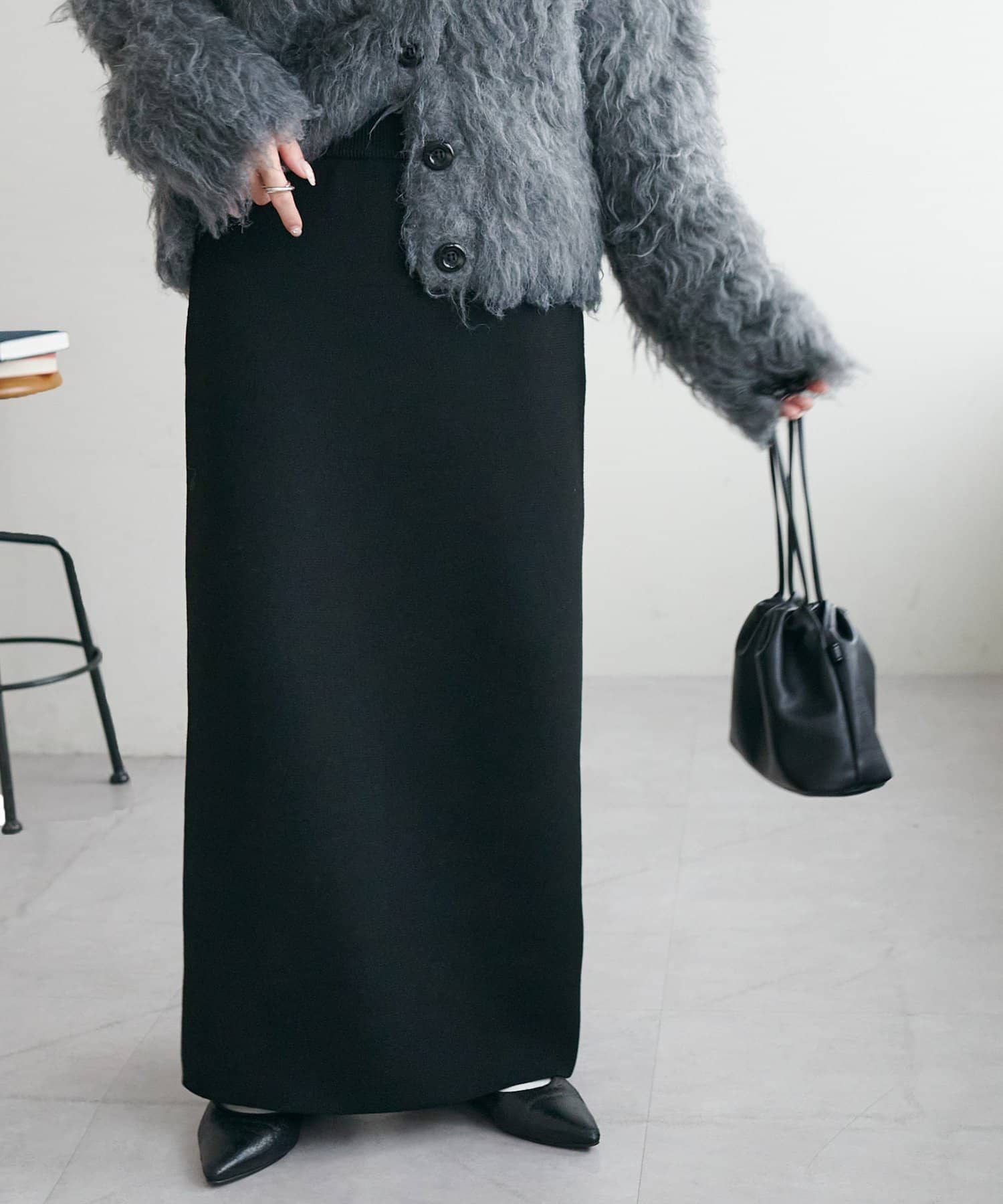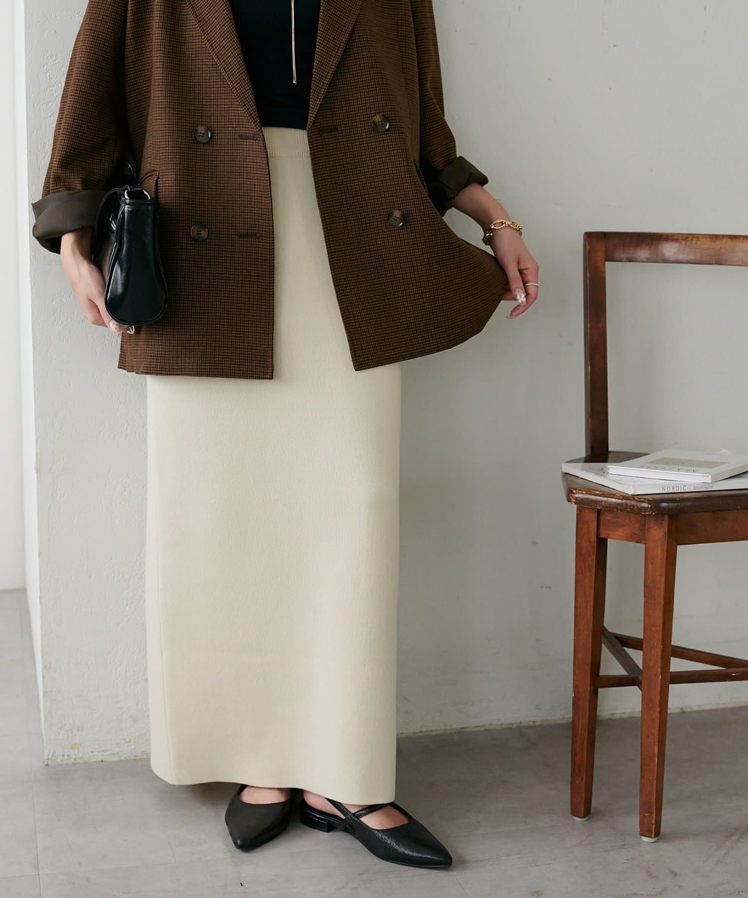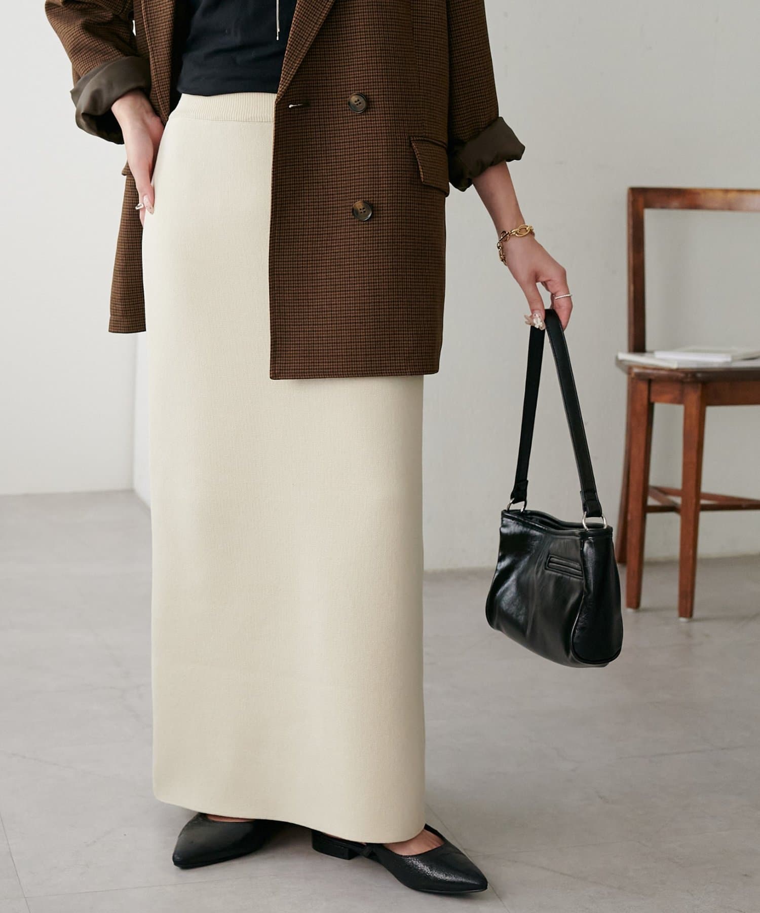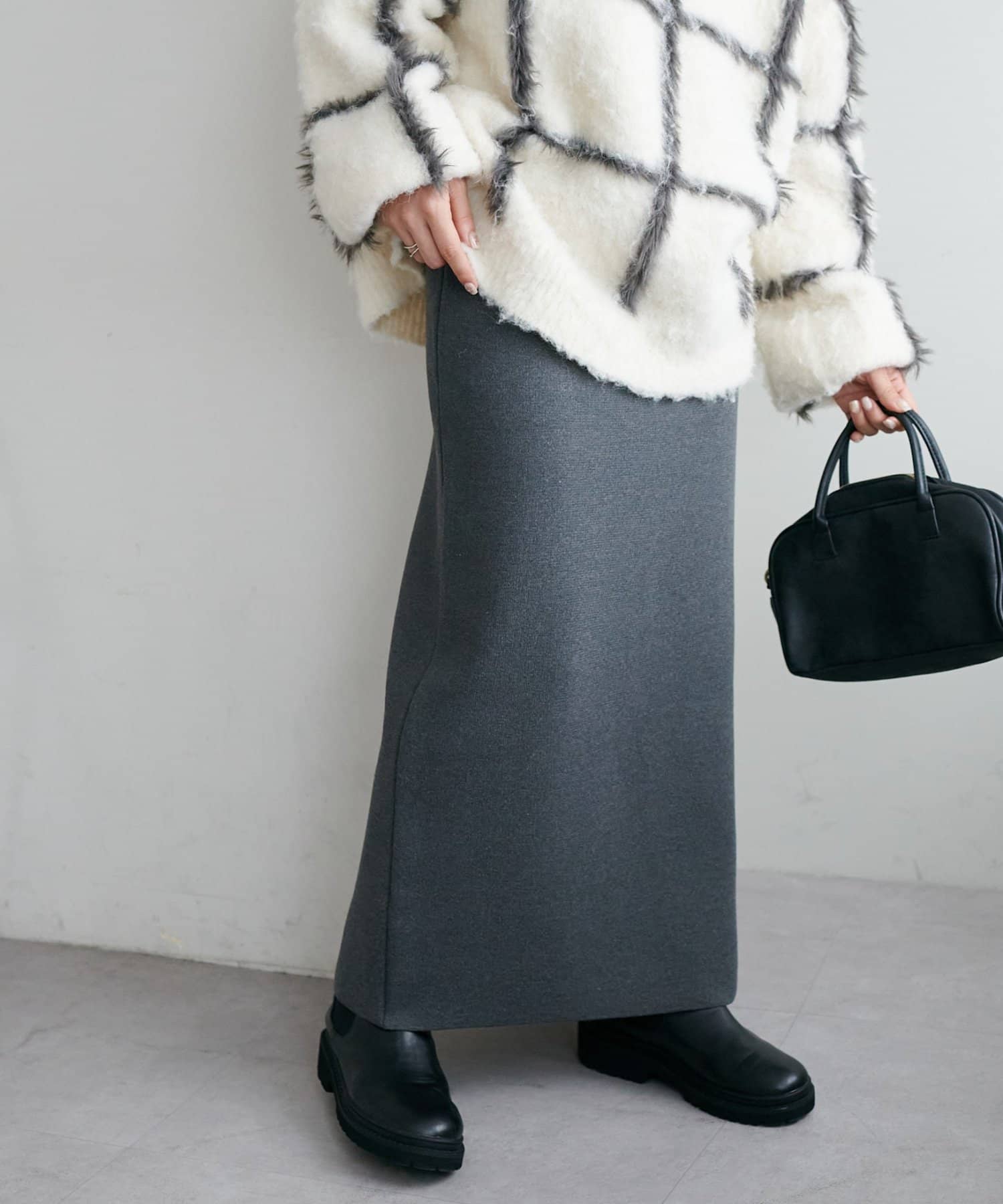 153cmスタッフ:形が綺麗なニットナロースカート。ロング丈ですが、裾にスリットが入っているので、低身長でも動きやすいデザインです!