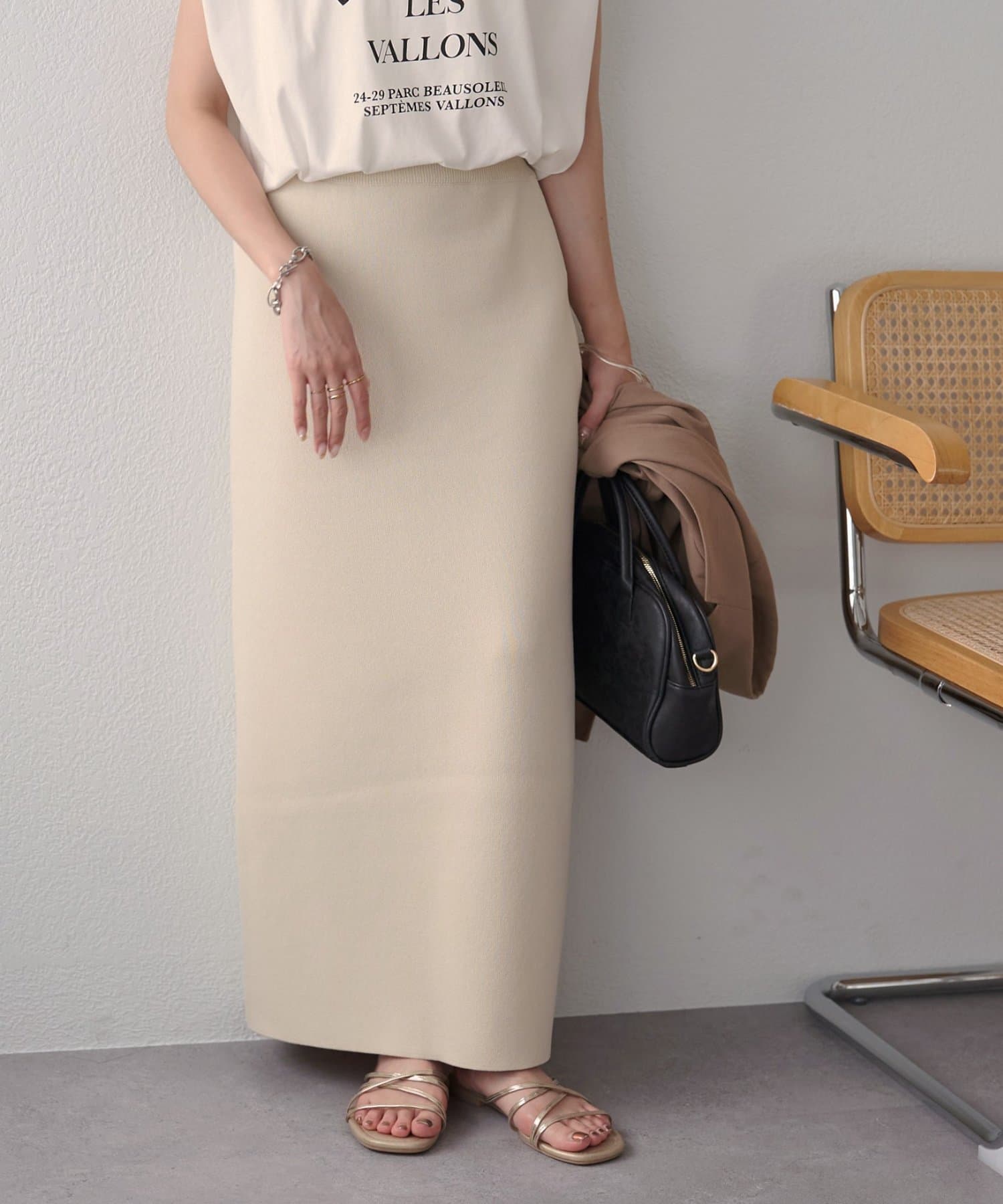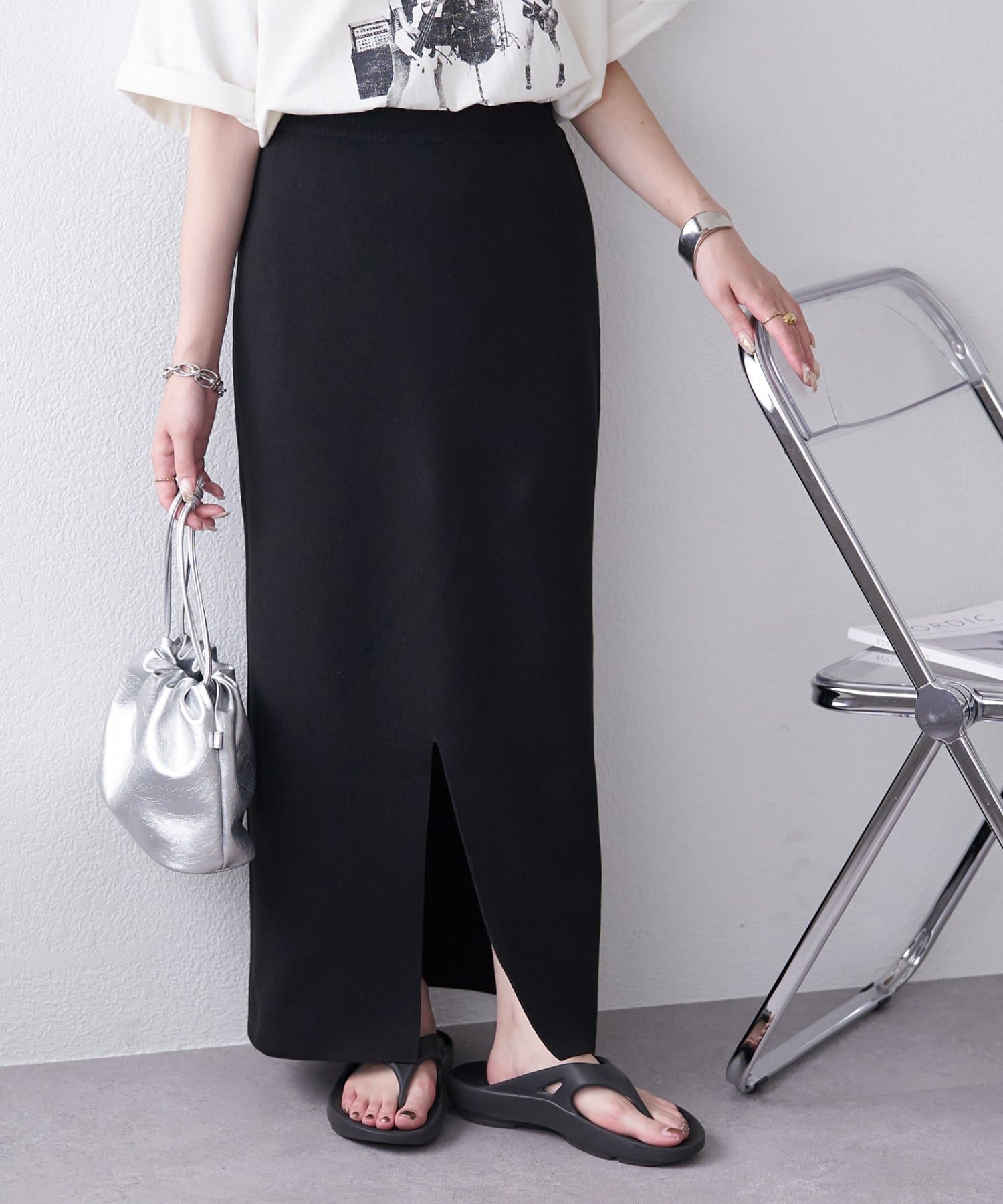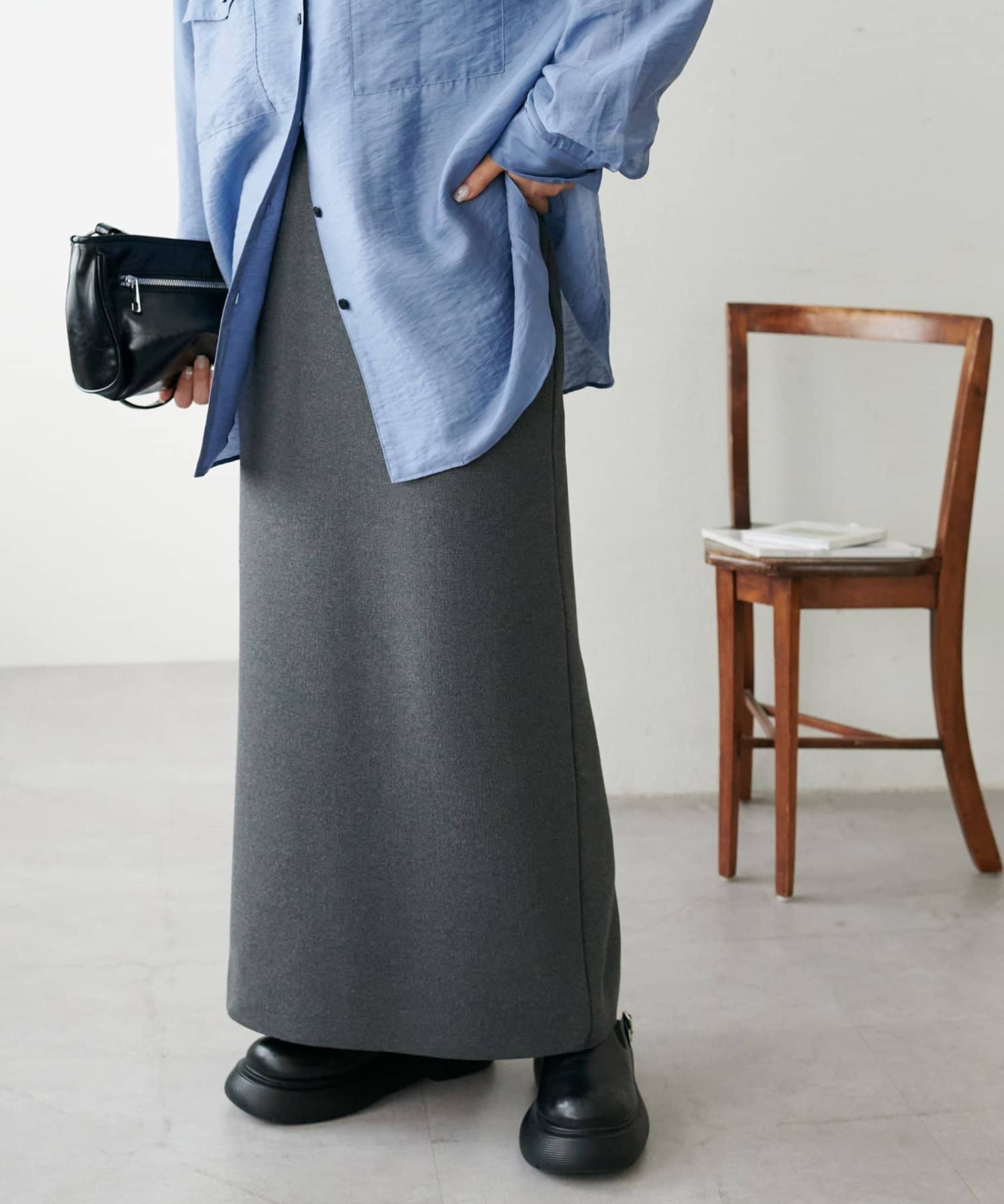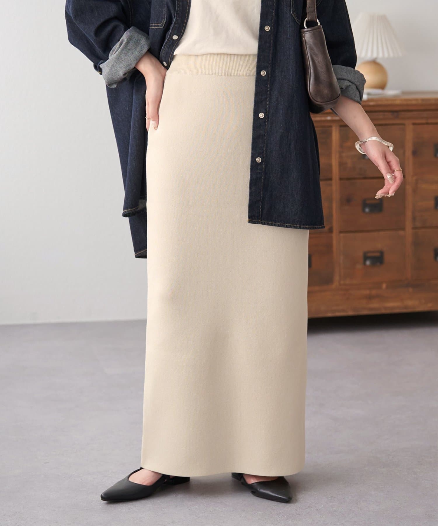 153cmスタッフ:形が綺麗なニットナロースカート。ロング丈ですが、裾にスリットが入っているので、低身長でも動きやすいデザインです!