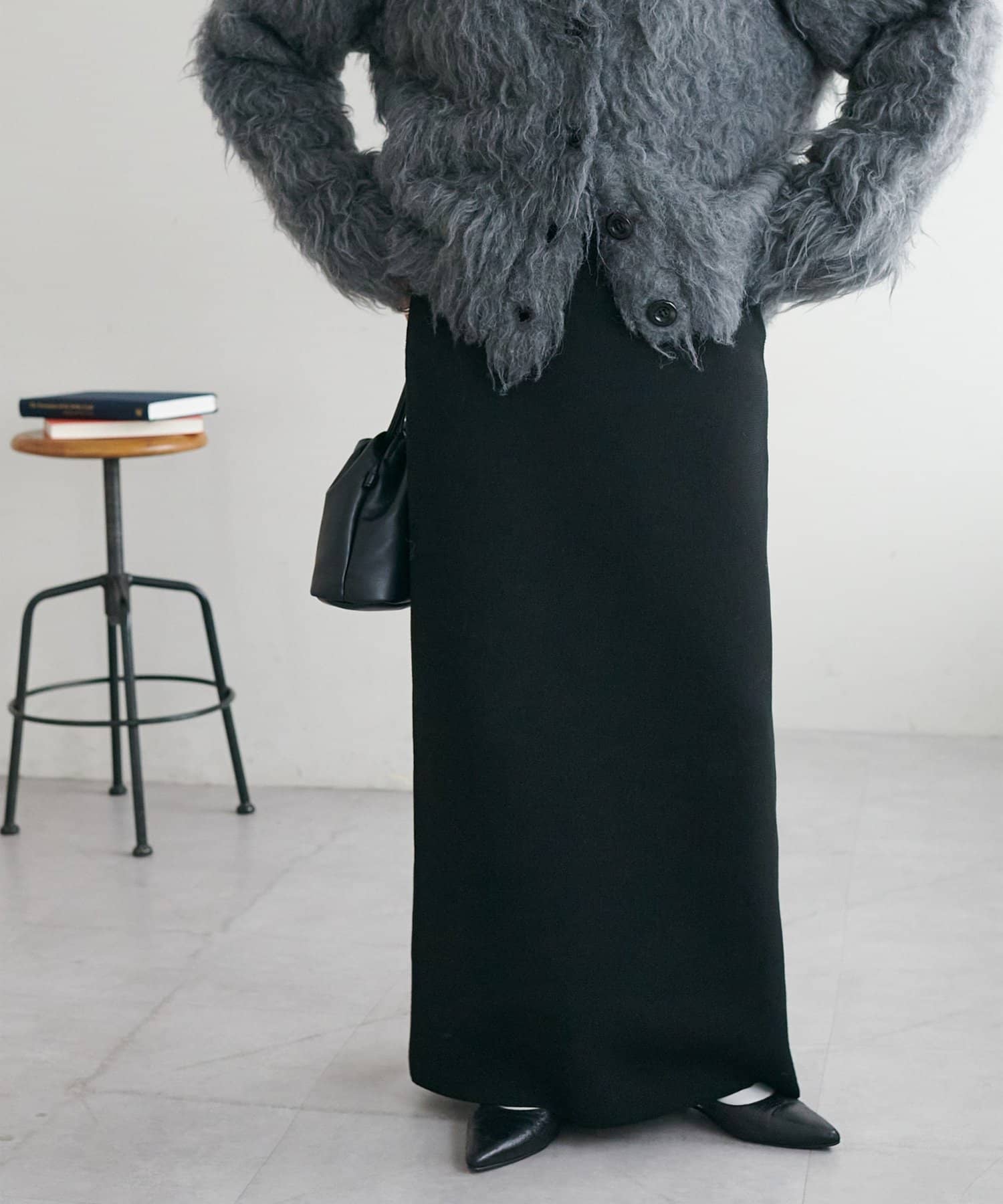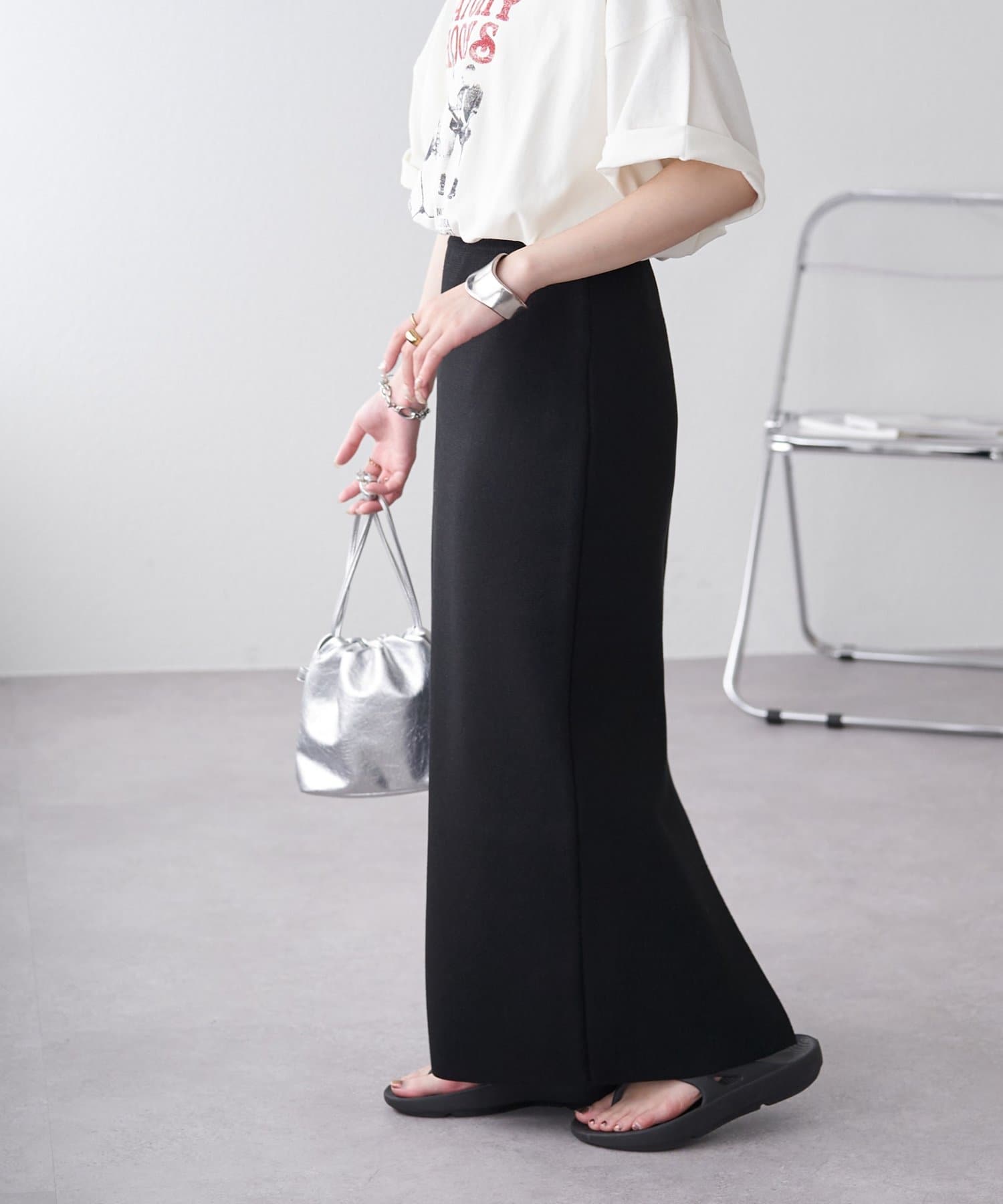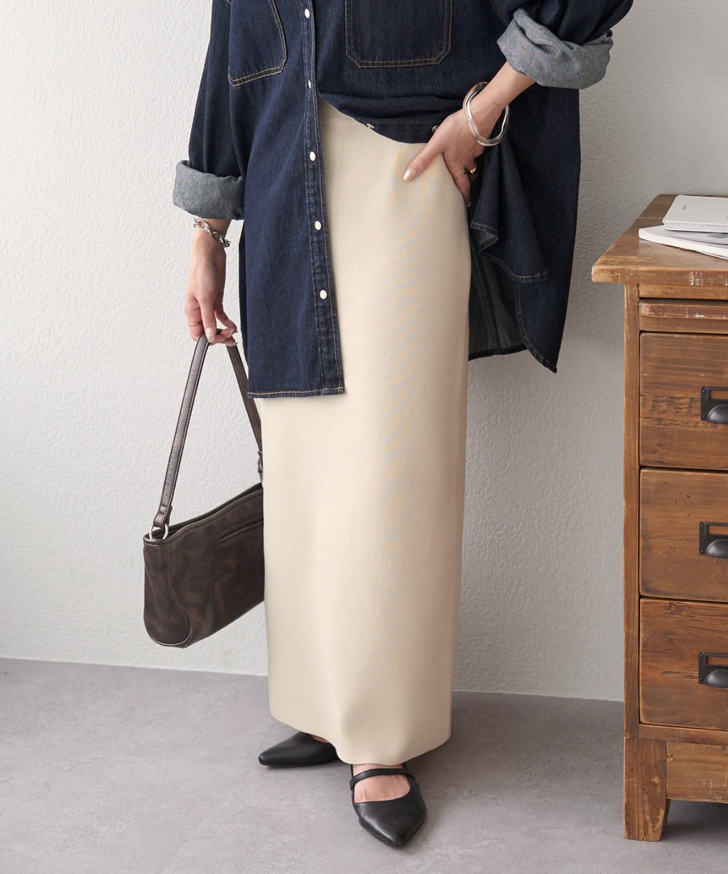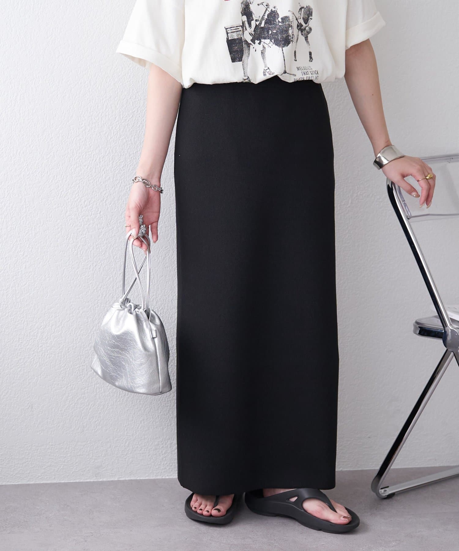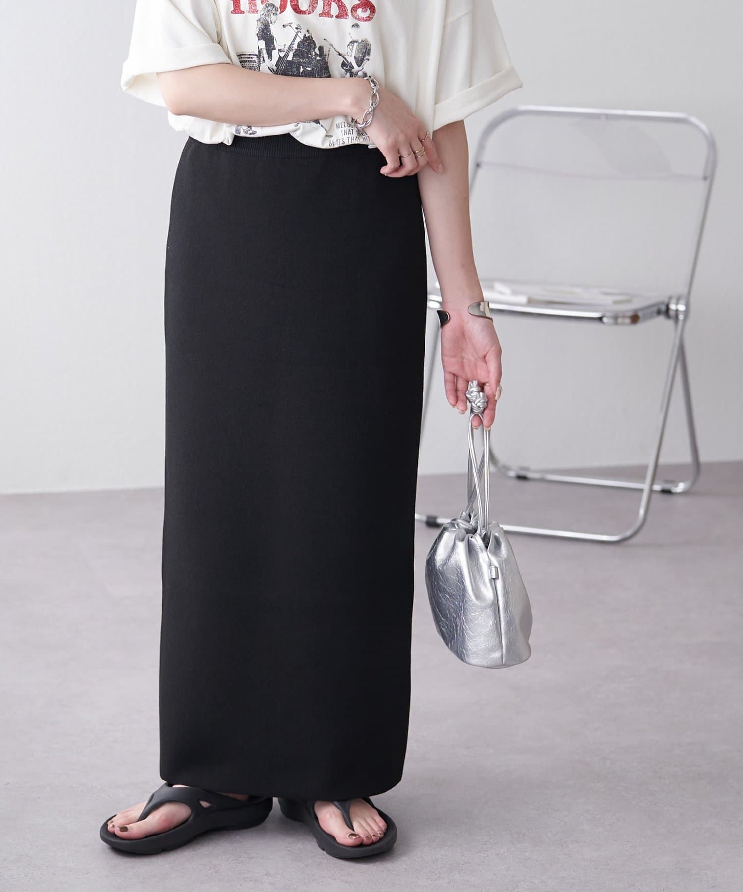 153cmスタッフ:形が綺麗なニットナロースカート。ロング丈ですが、裾にスリットが入っているので、低身長でも動きやすいデザインです!