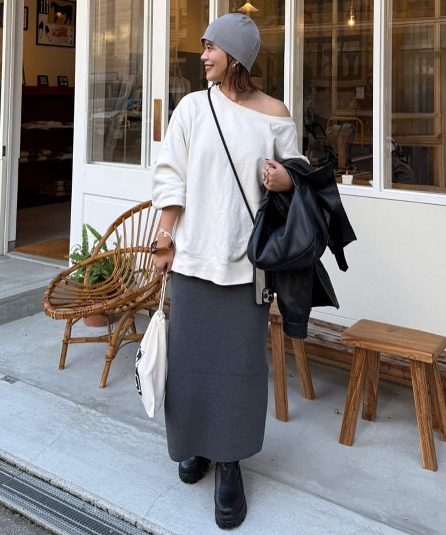 ナロースカートなので、ゆったりとしたスウェットやニットとの合わせがおすすめ〇
