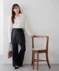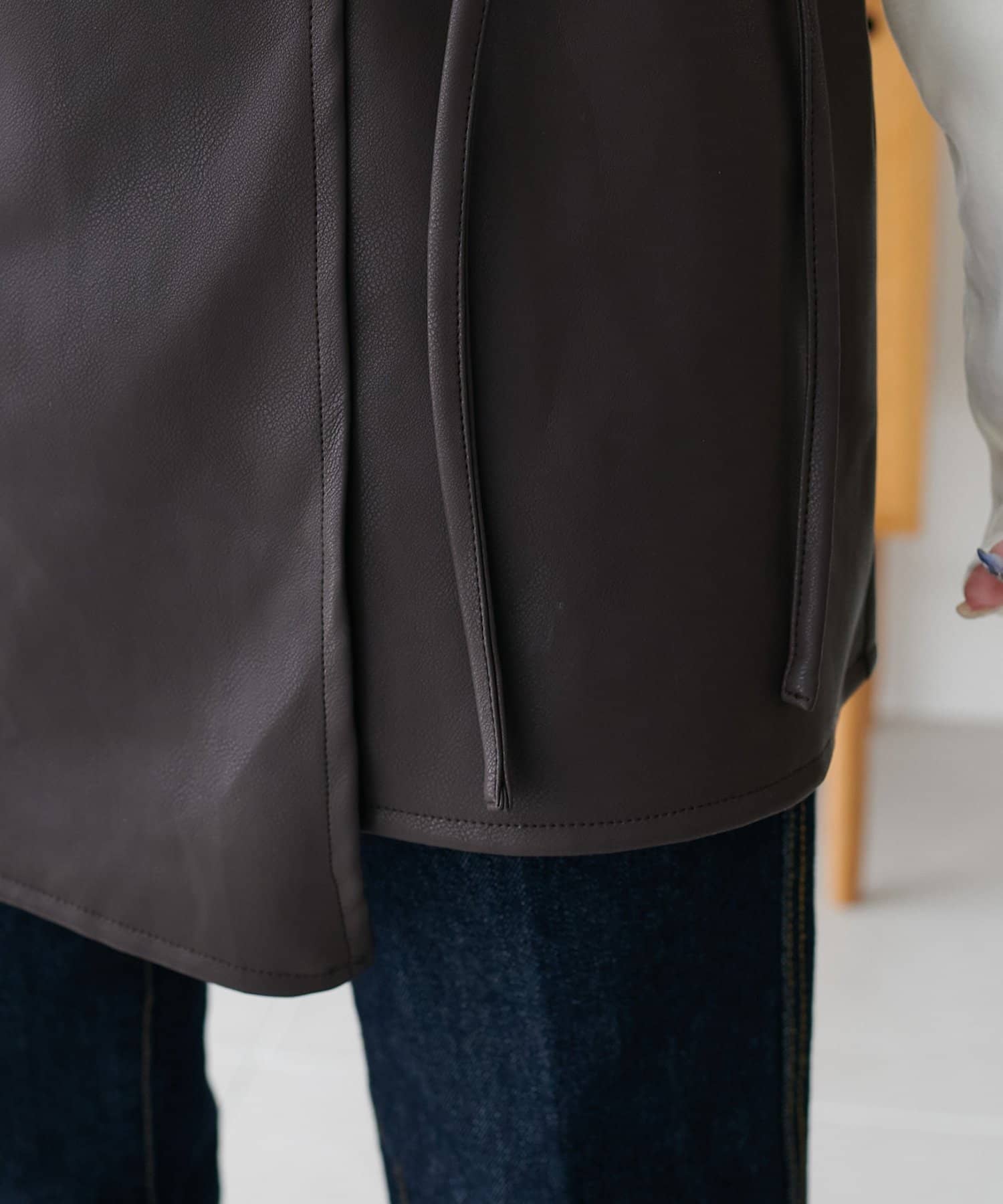 160cmスタッフ:生地は柔らかめのフェイクレザーで快適な着心地です。スウェットやゆるニットと合わせてレイヤードするだけで、今っぽい雰囲気になります!