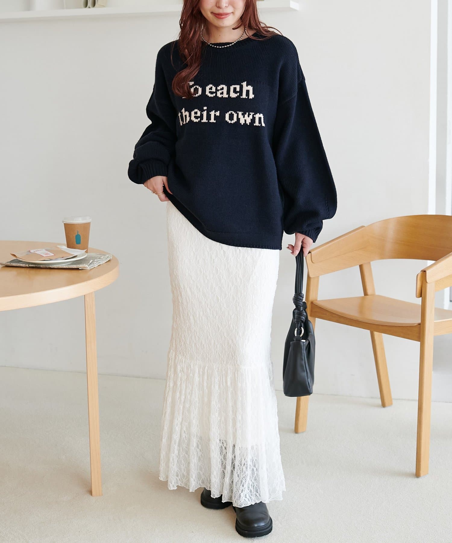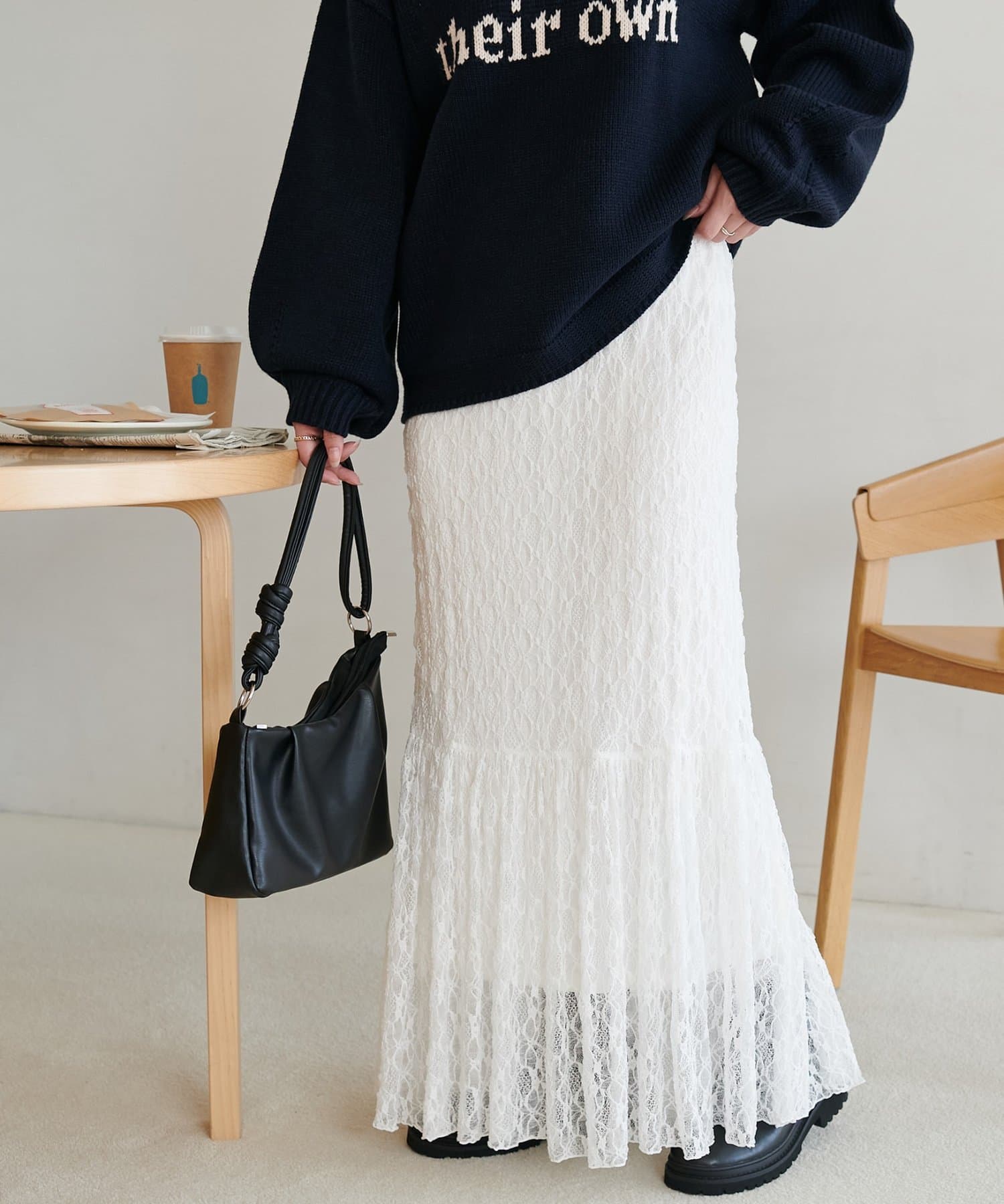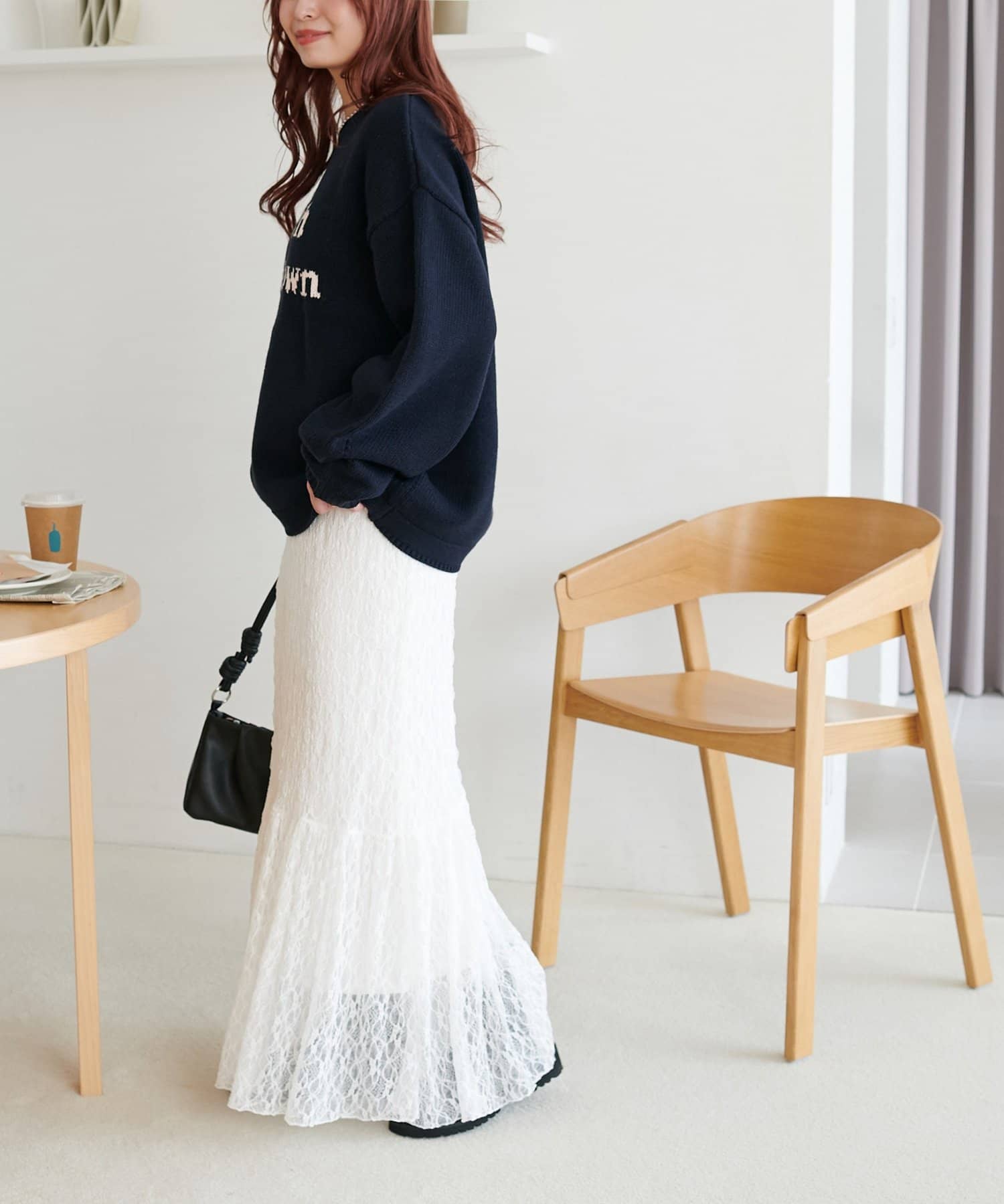 オーバーサイズのスウェットやざっくりニットと合わせれば、レースの甘さを程よく抑えた大人のカジュアルスタイルに。
