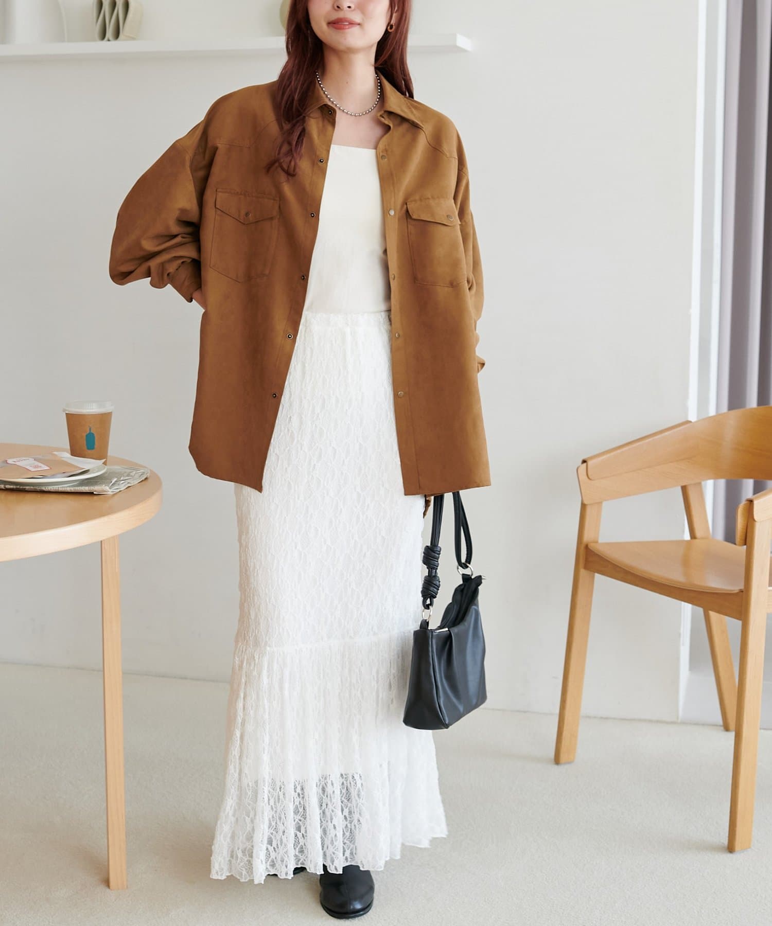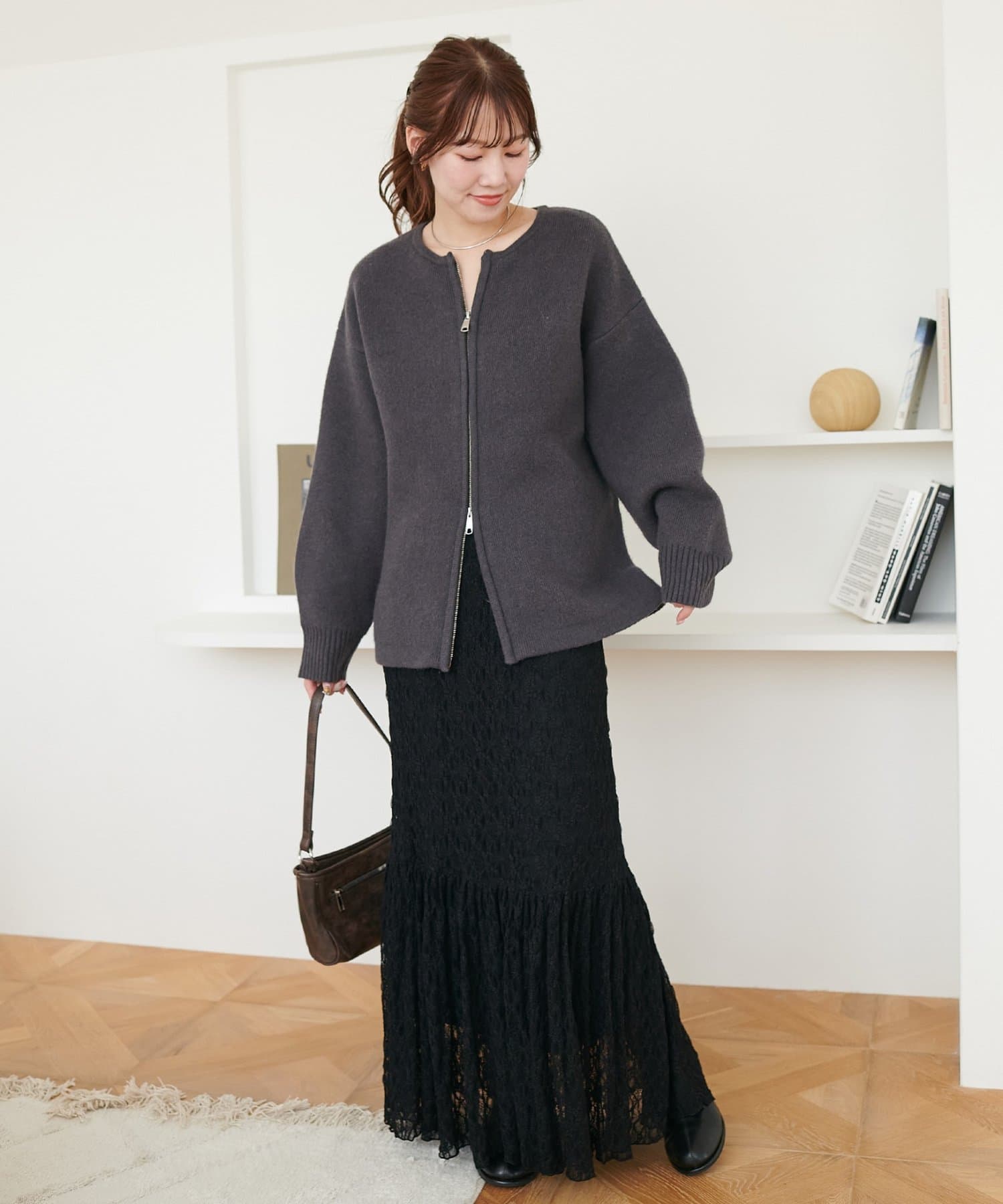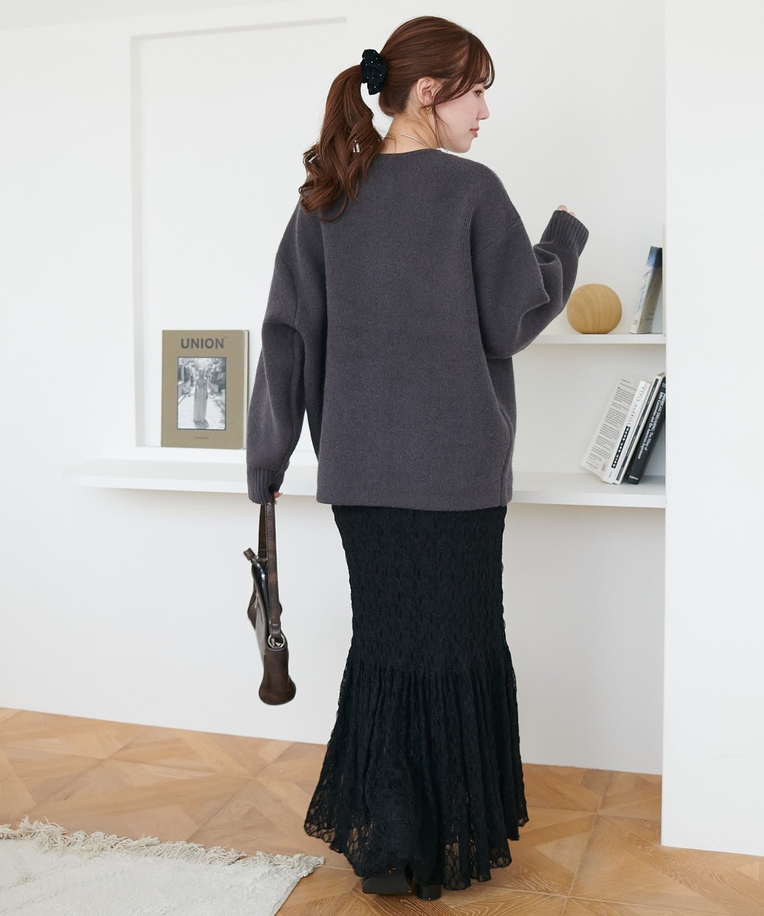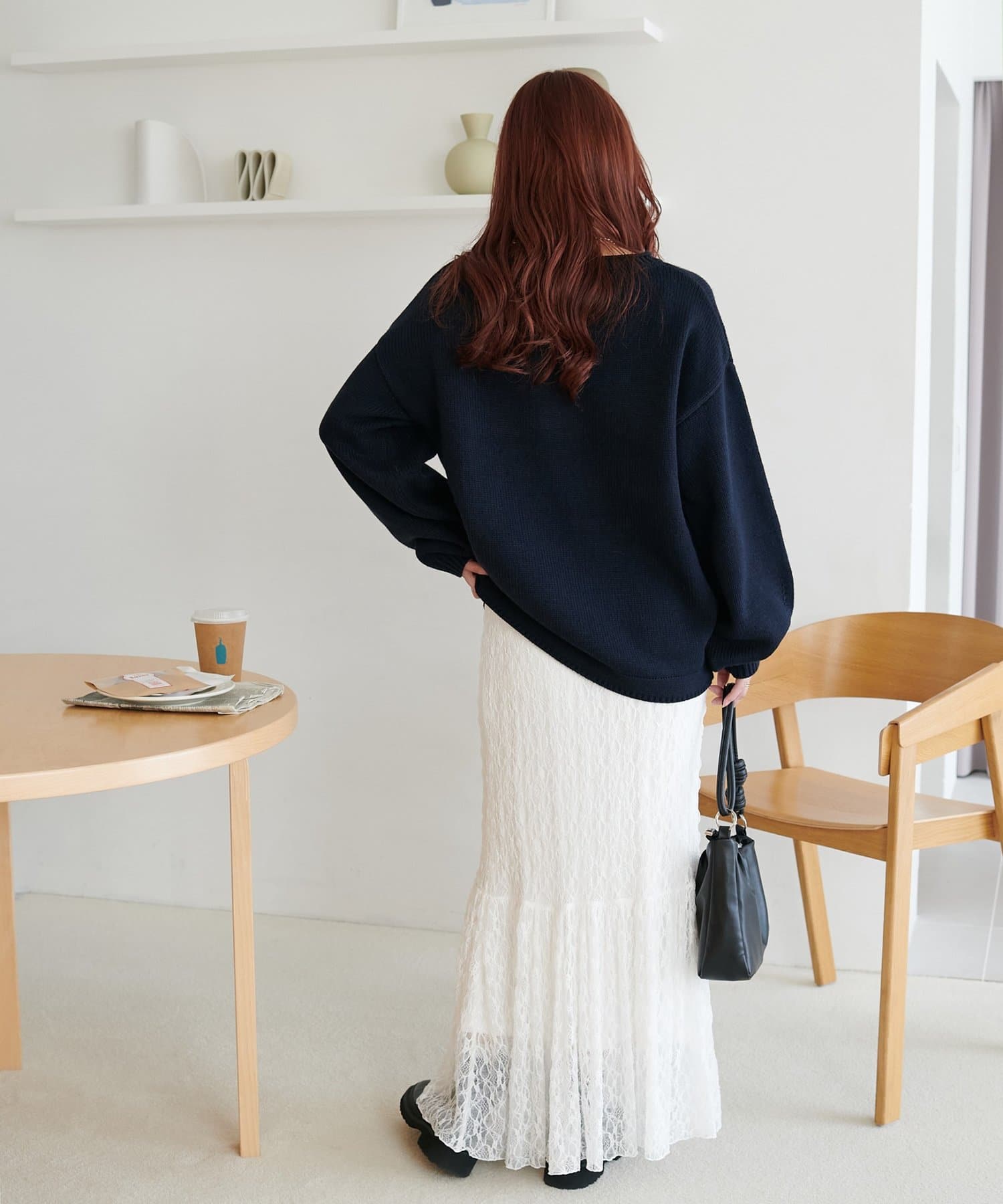 オーバーサイズのスウェットやざっくりニットと合わせれば、レースの甘さを程よく抑えた大人のカジュアルスタイルに。