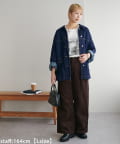 157cmスタッフ(Mサイズ着用):裾にかけてまっすぐ落ちるストレートラインが、脚のラインを拾わず体型をさりげなくカバーしてくれるのも嬉しいポイントです。