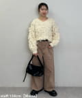 153cmスタッフ(Mサイズ着用):足元に向かって広がるワイドパンツなので、ウエストラインを魅せると腰の位置が高く見えすらっとした印象になりなります。