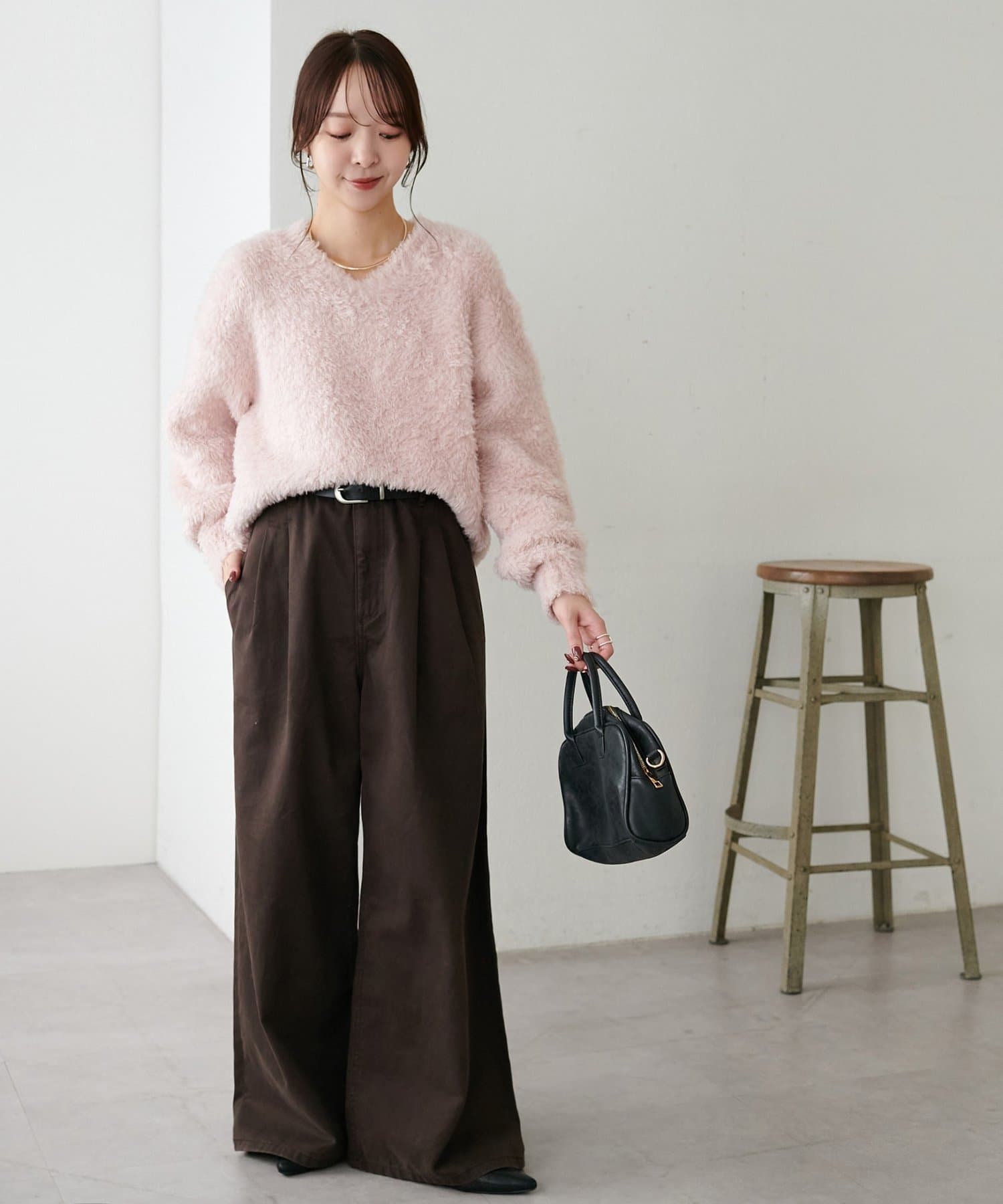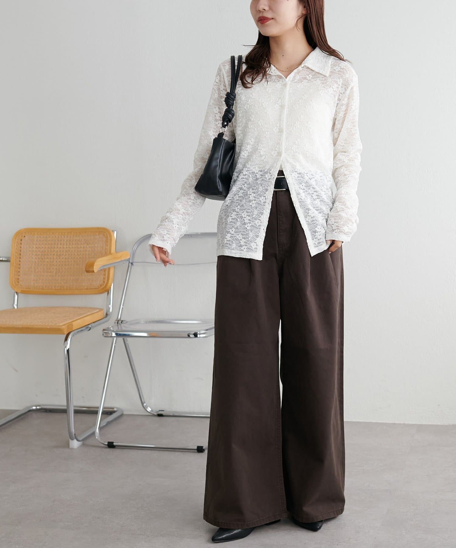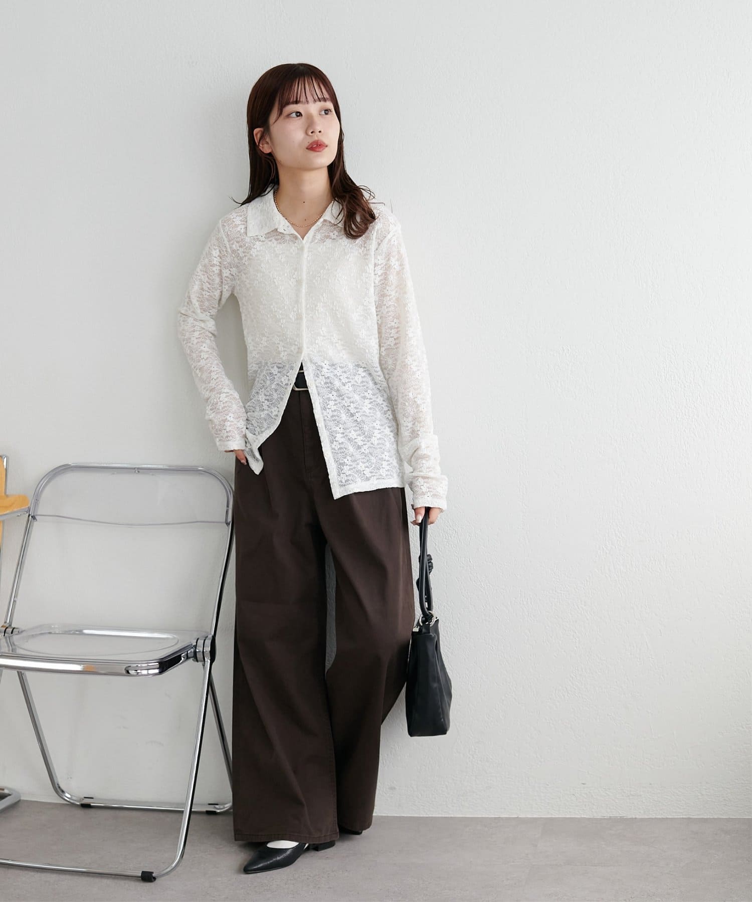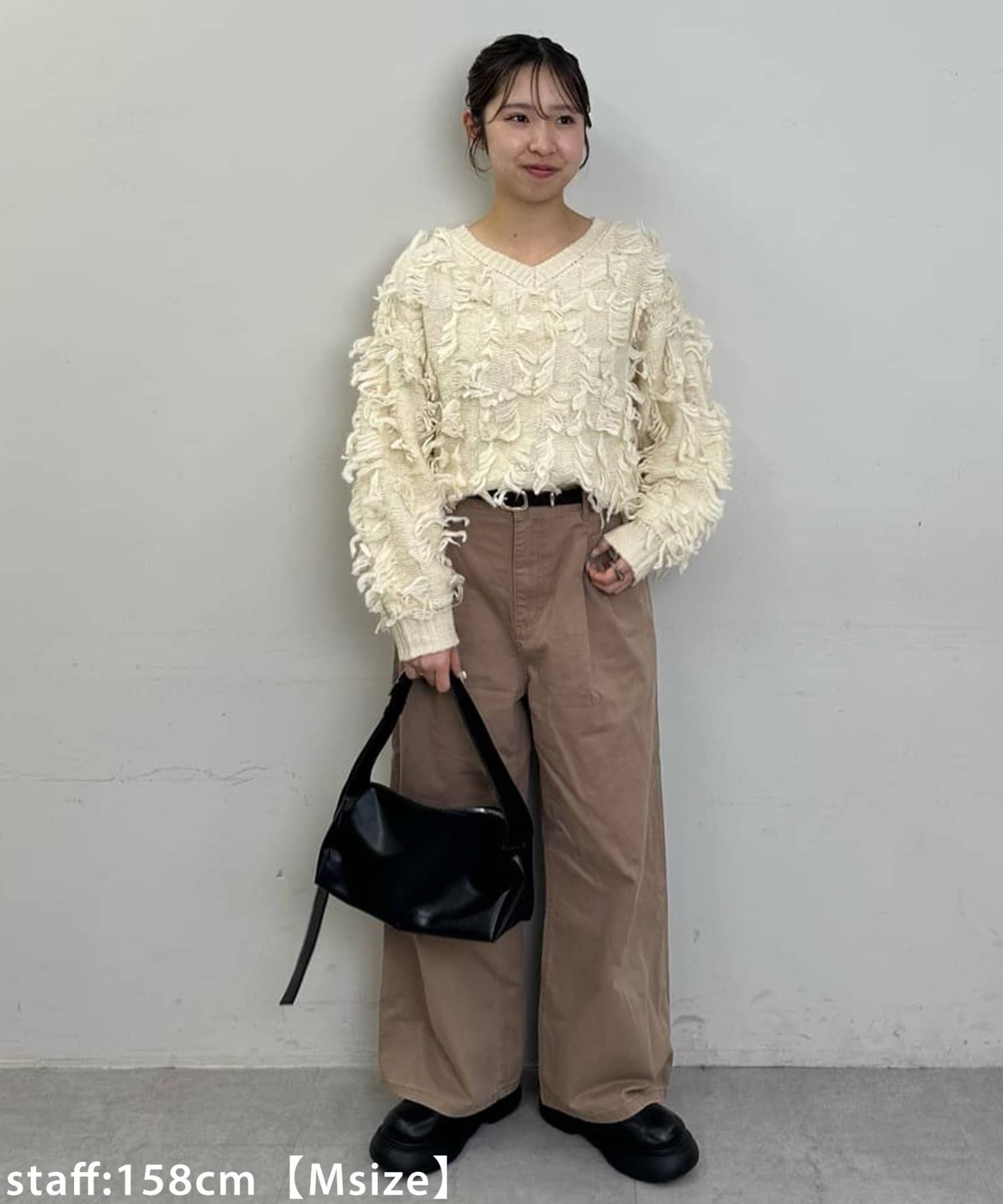 157cmスタッフ(Mサイズ着用):ゆったりとしたワイドパンツでカジュアルにもキレイメにも着回しができます。