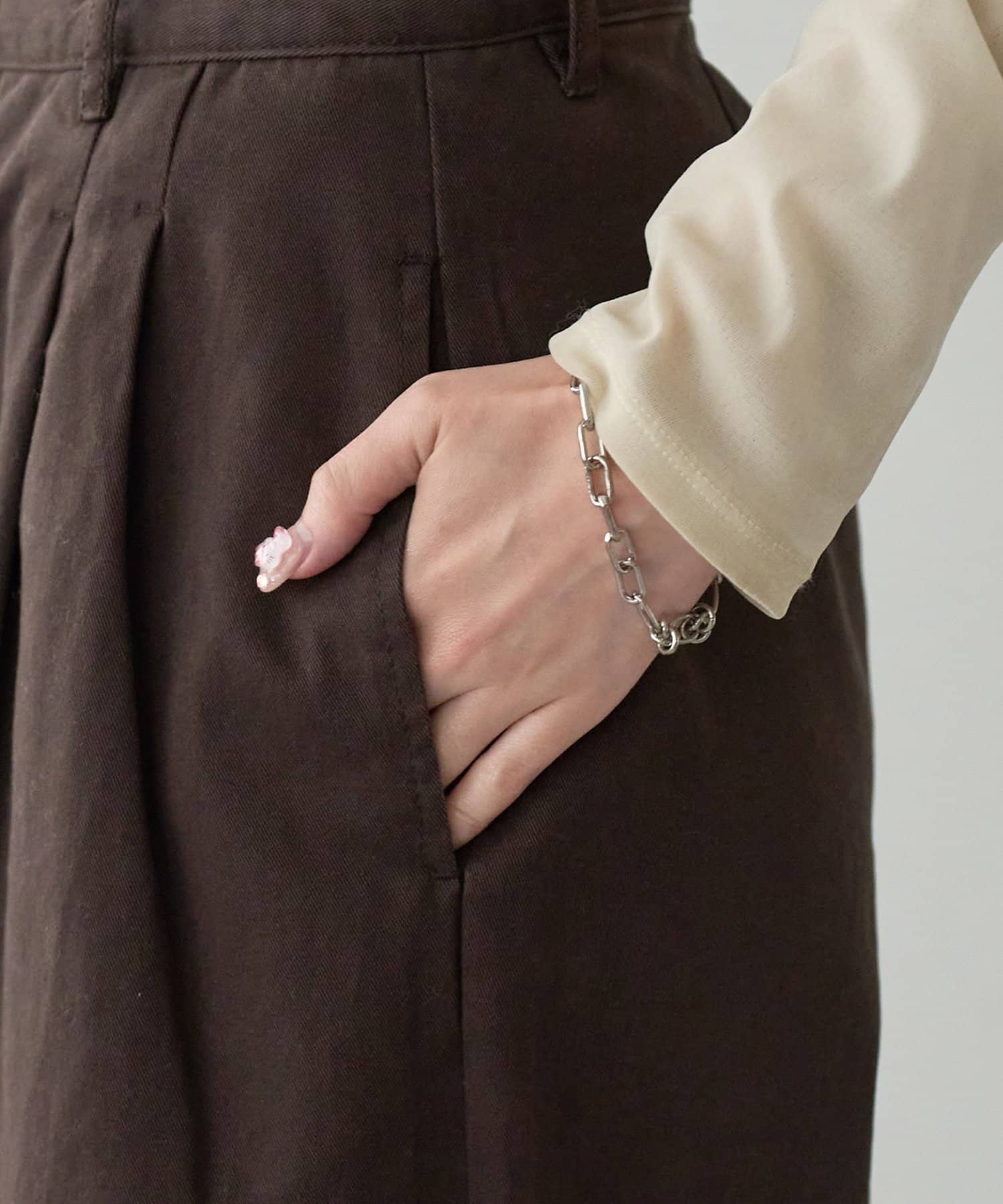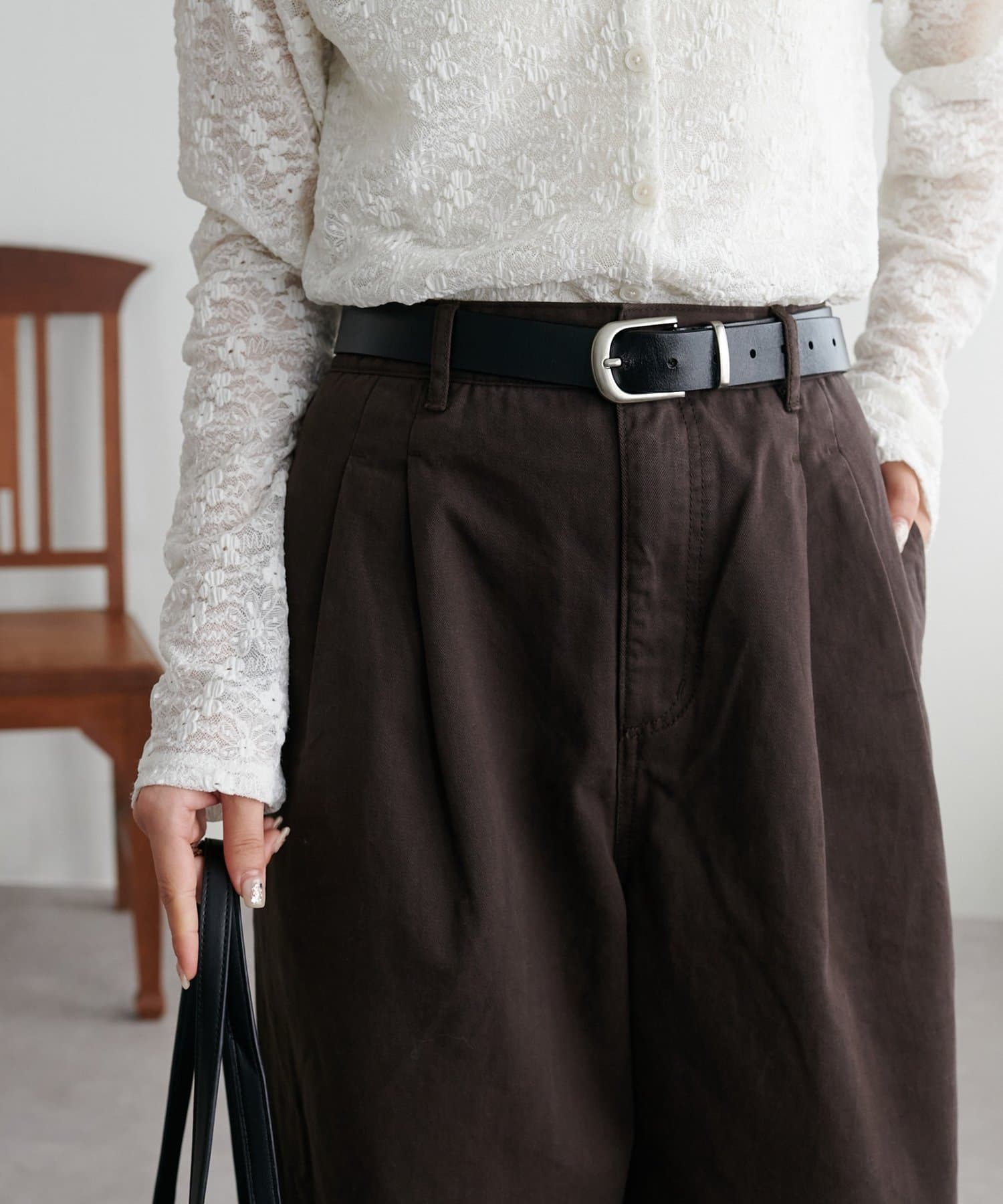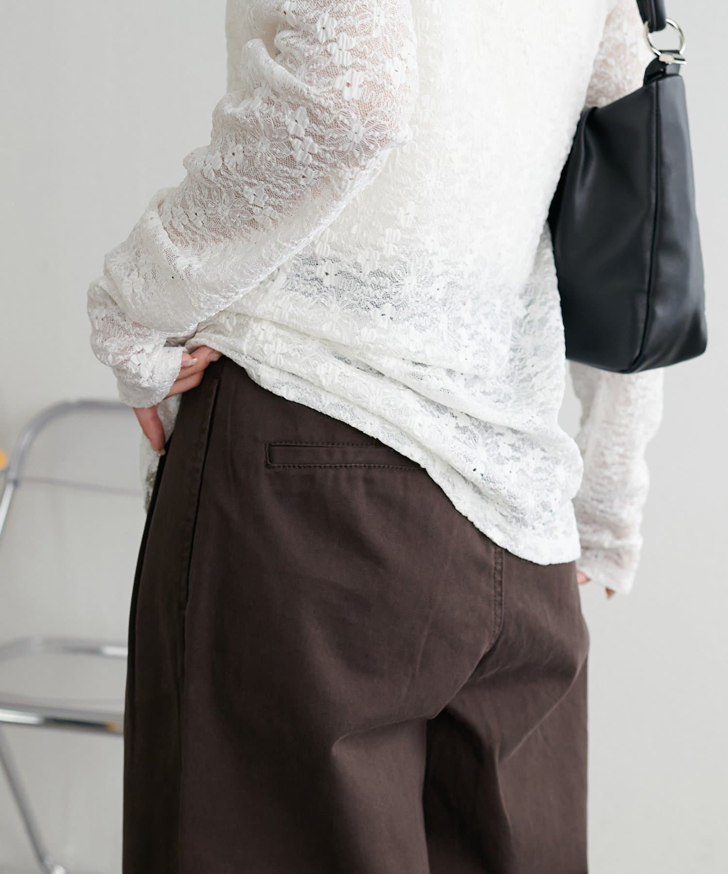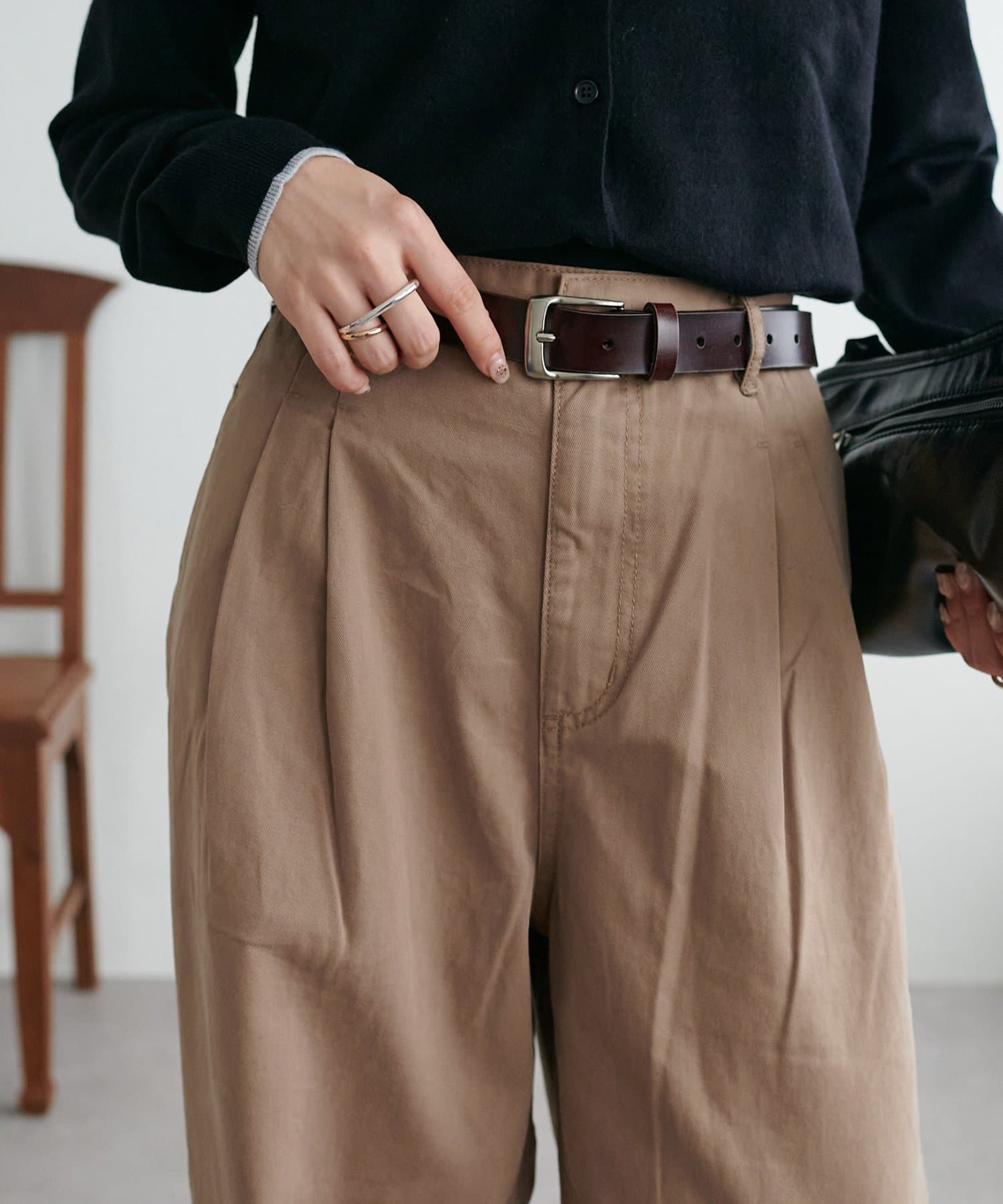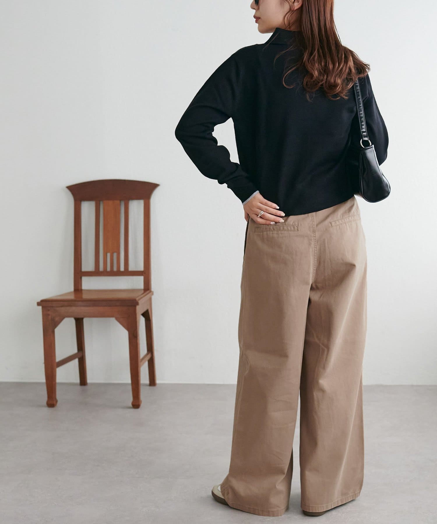 腰回りにタックが施されていて余裕があることによって、ニットなどもインしやすいです!