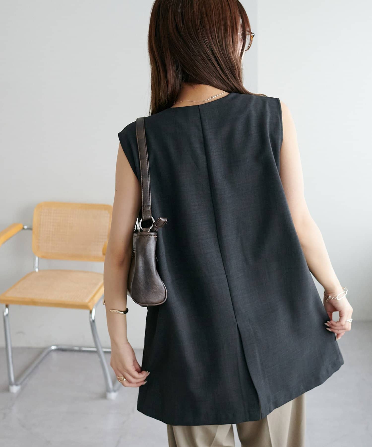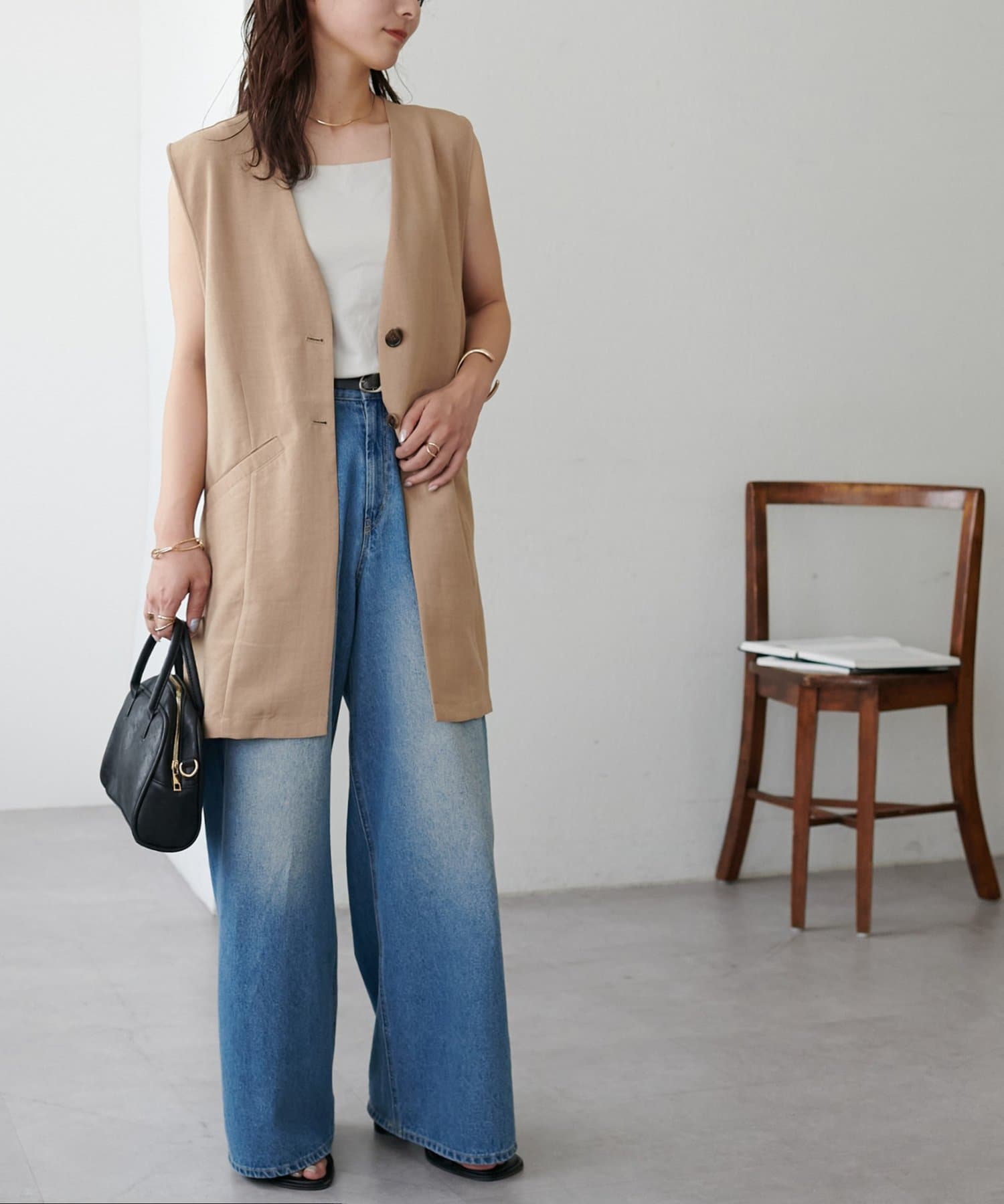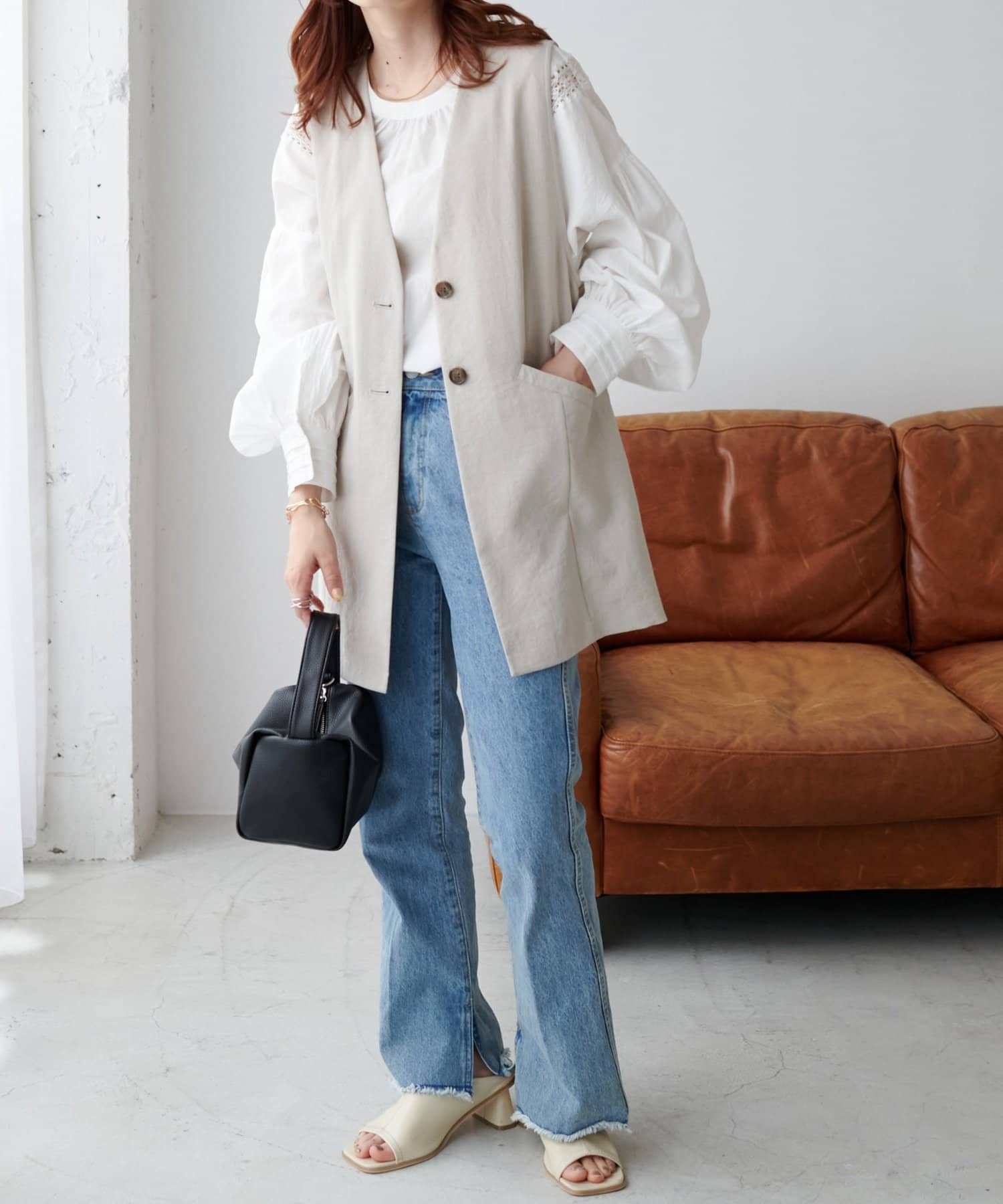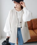ノーカラーに、ヒップが隠れる着丈で様々なボトムスとバランスの良い仕上がりに◎