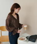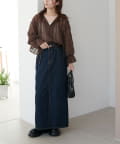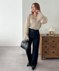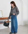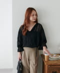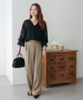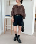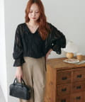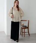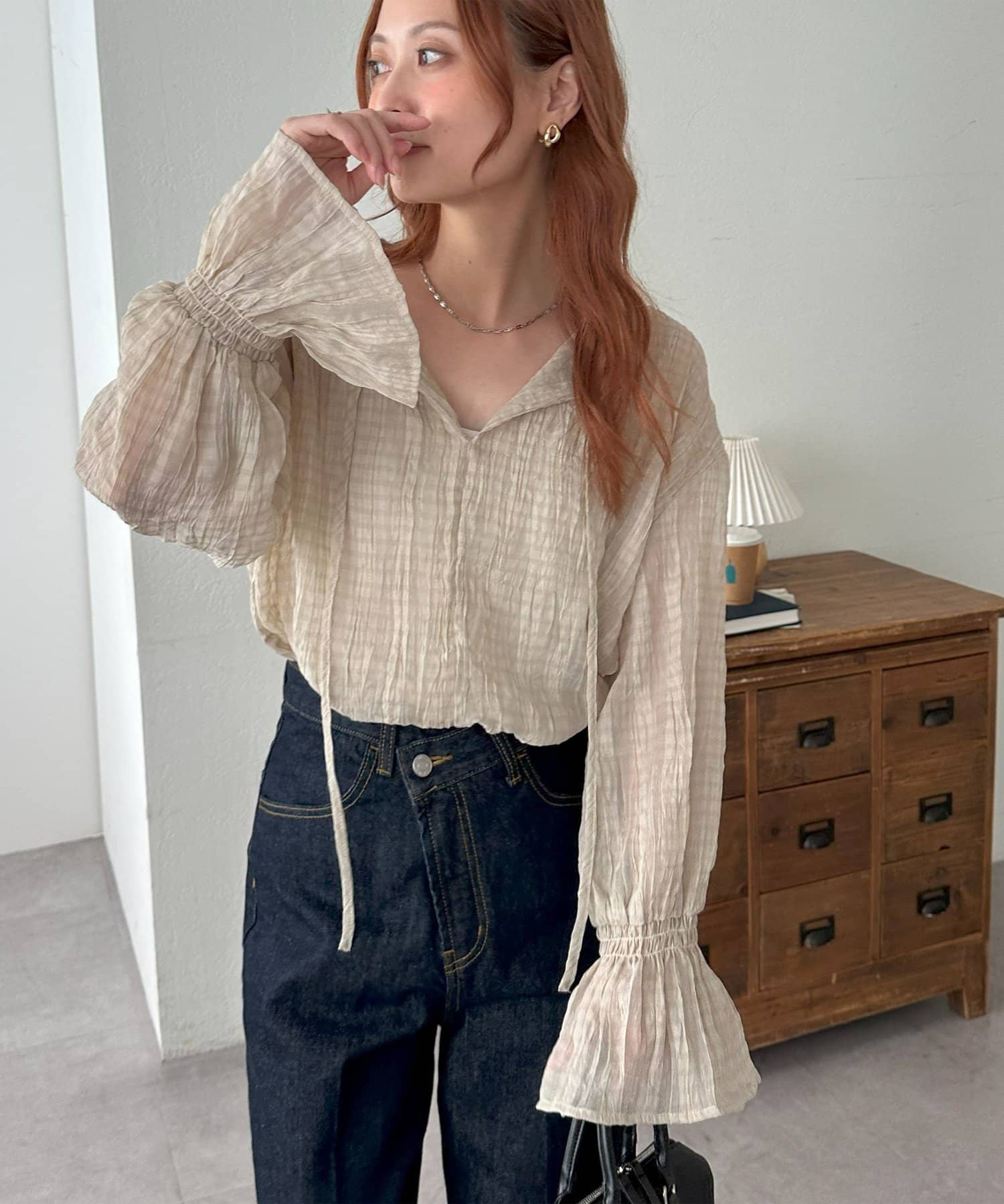 首元はすっきりとしたスキッパーデザインで抜け感を演出し、ボリューム袖とのバランスがこなれた印象に。