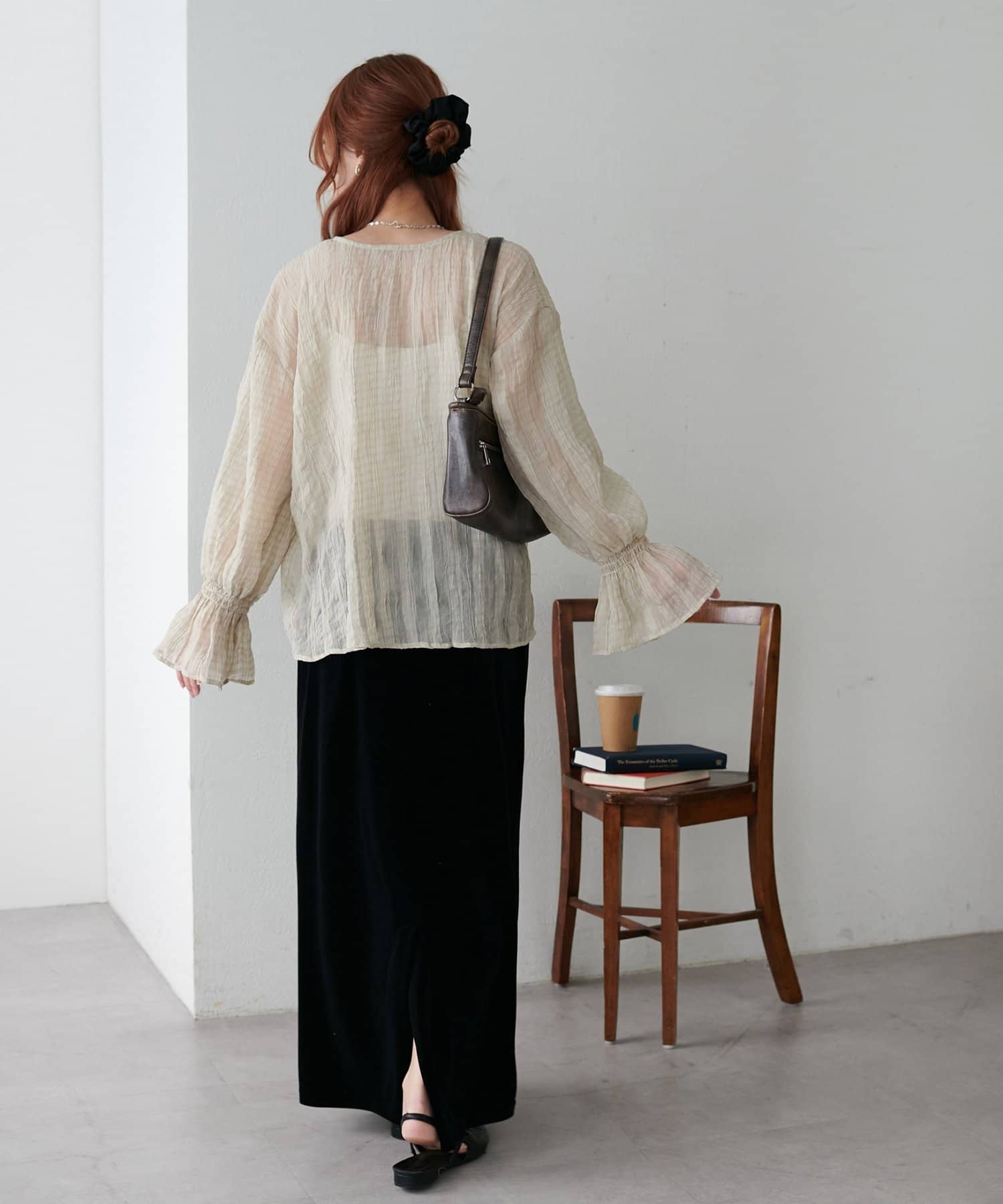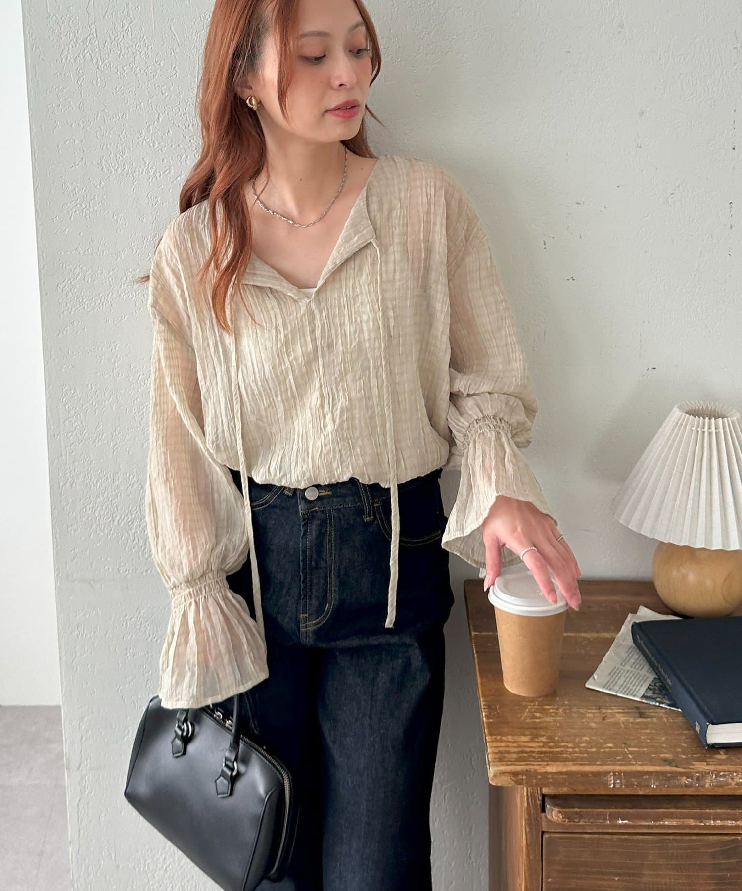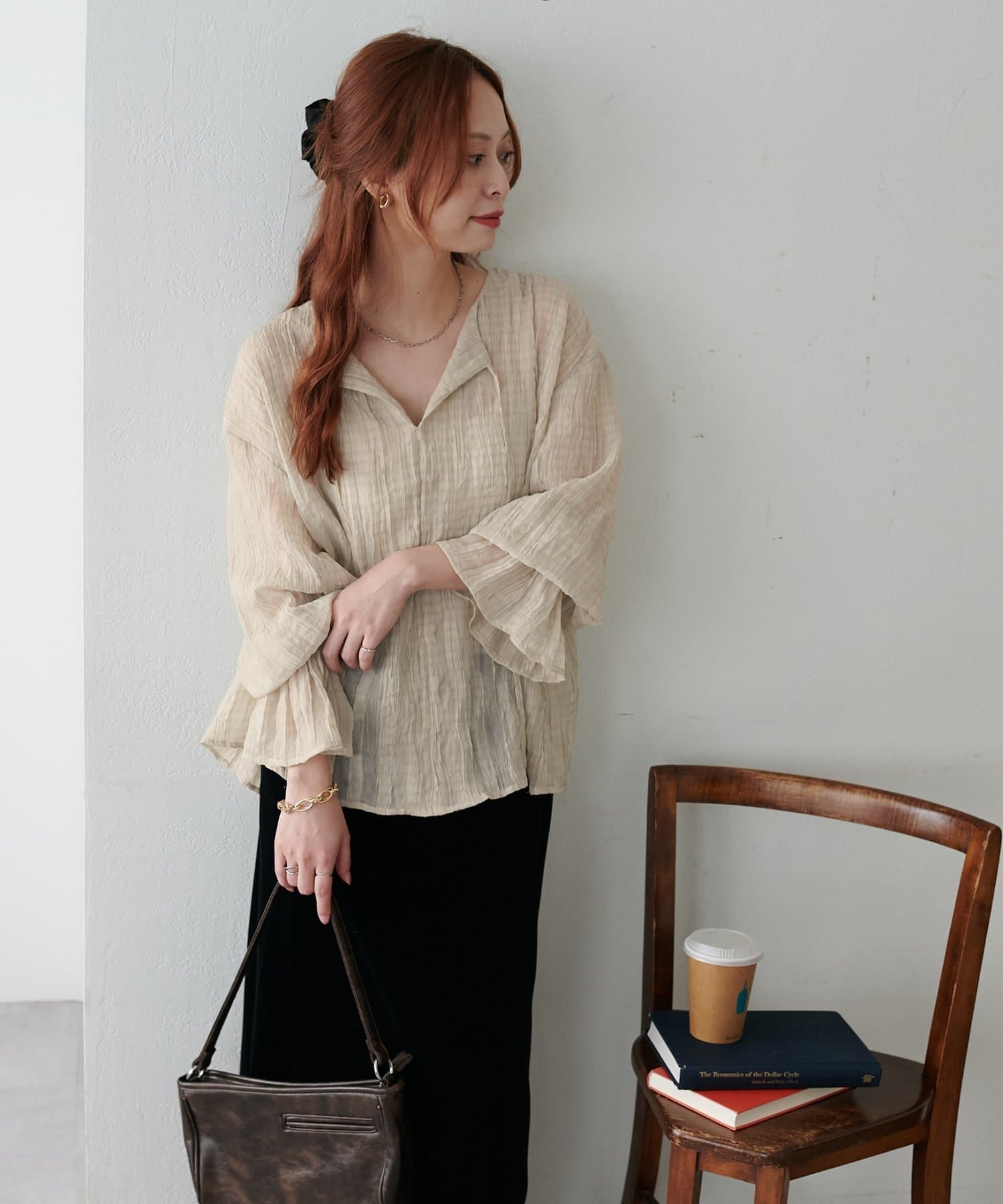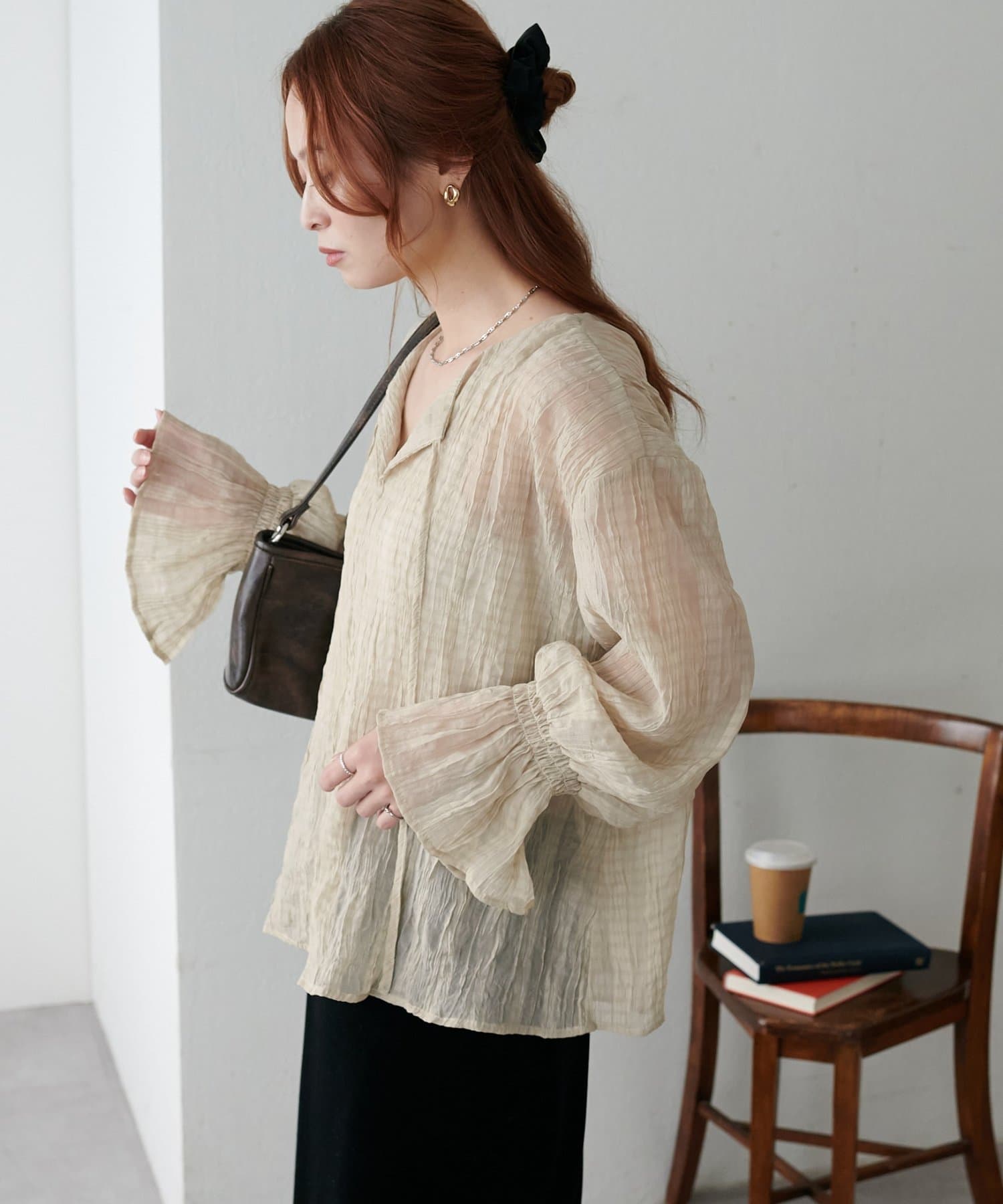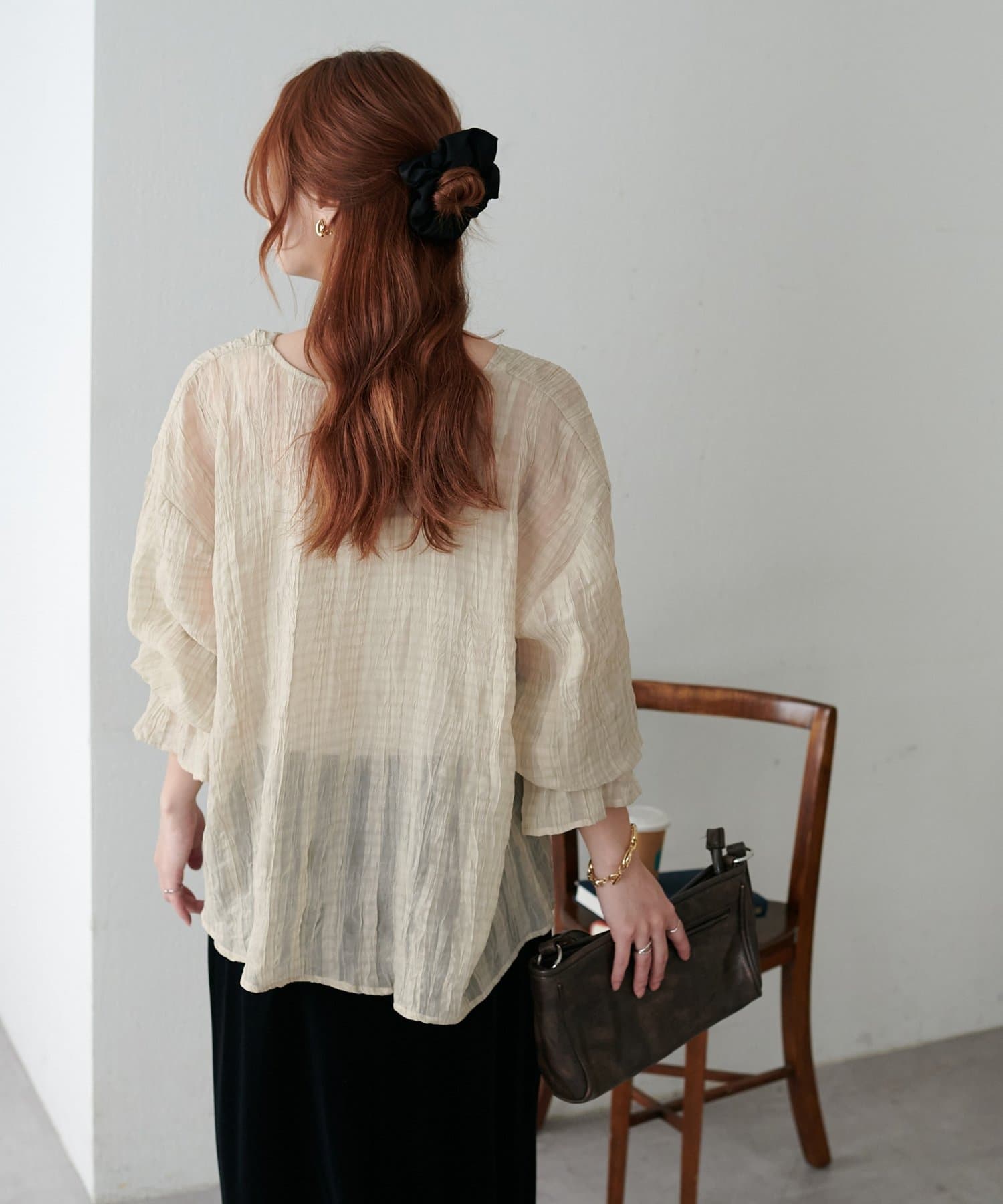 160cmスタッフ:袖口のシャーリングで袖をたくし上げやすく、こなれ感のある抜け感も簡単に演出できます。透け感が上品で、大人カジュアルにちょうどいい一枚です!