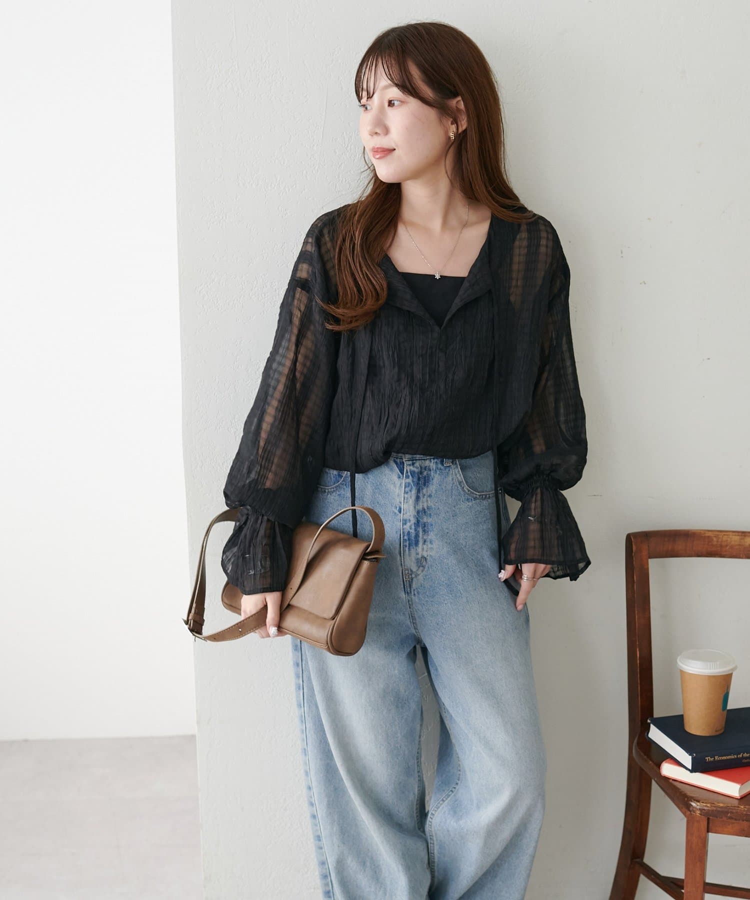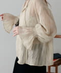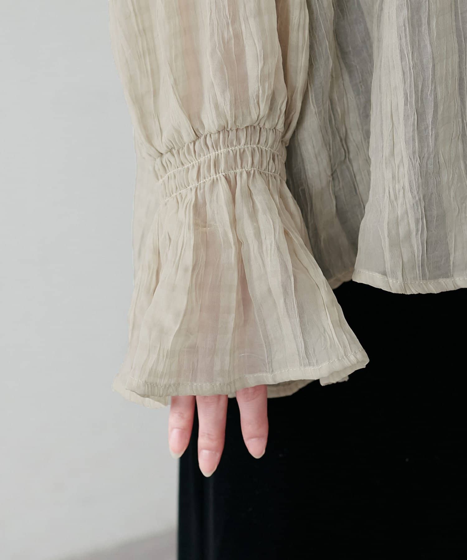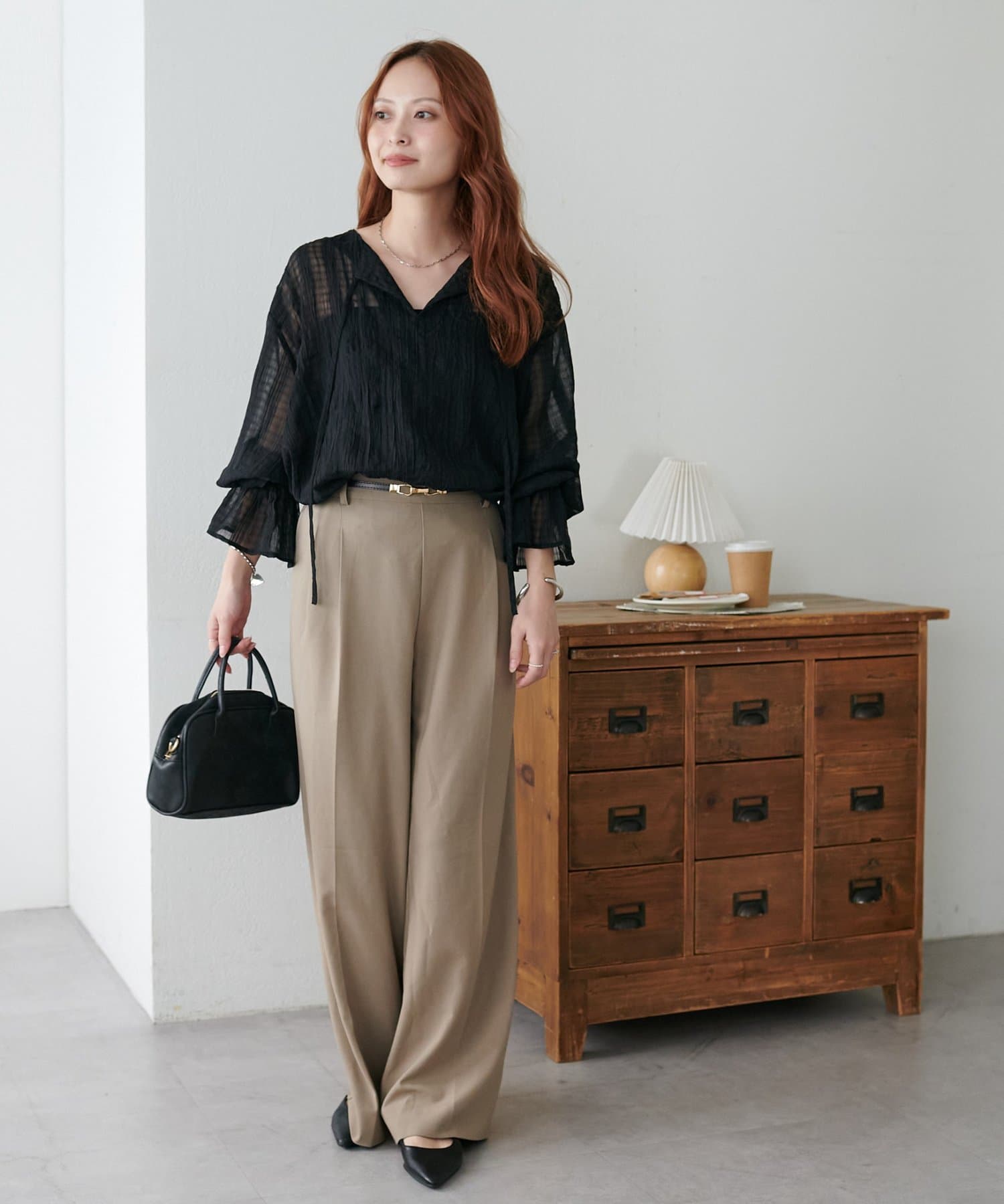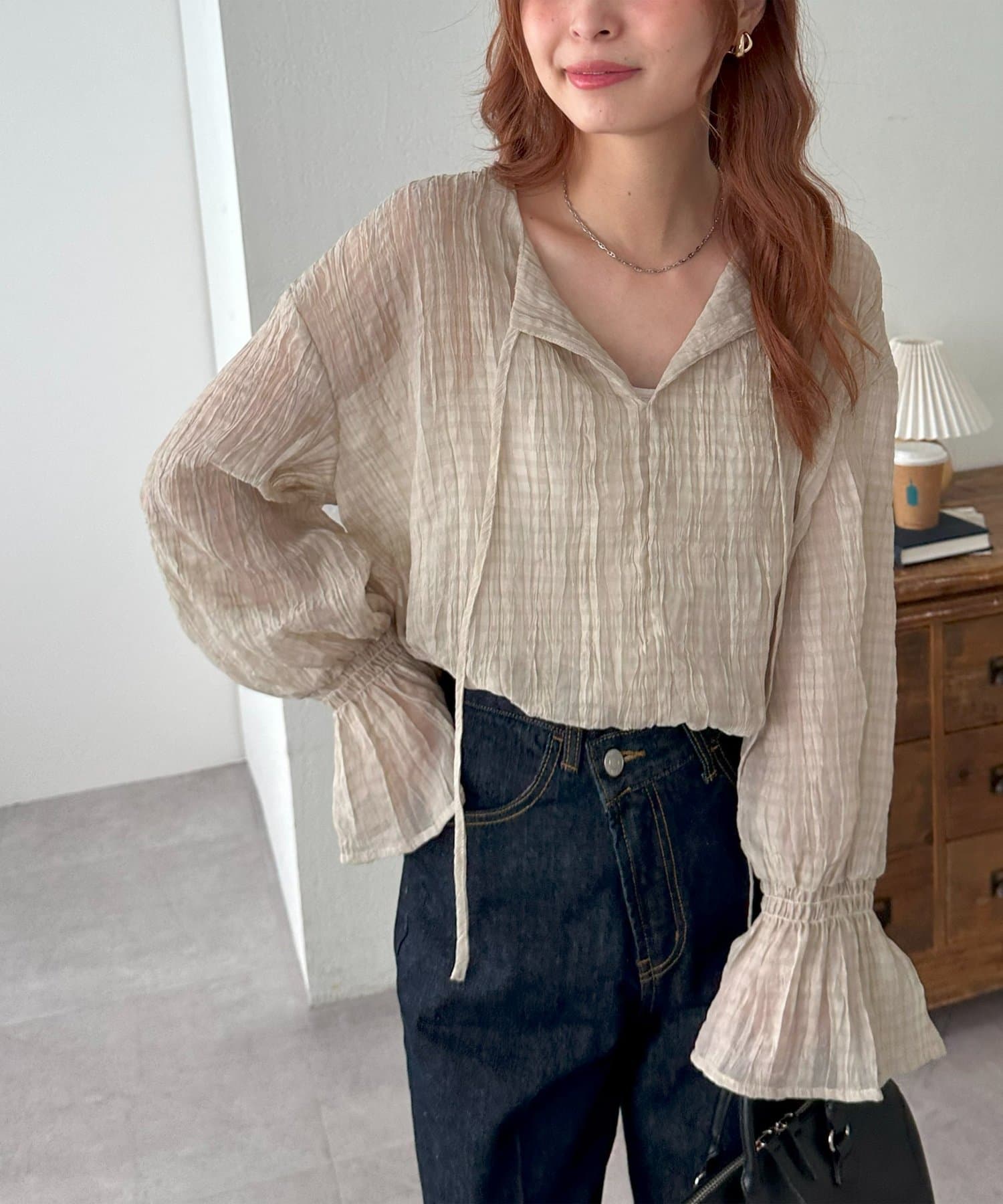 160cmスタッフ:袖口のシャーリングで袖をたくし上げやすく、こなれ感のある抜け感も簡単に演出できます。透け感が上品で、大人カジュアルにちょうどいい一枚です!